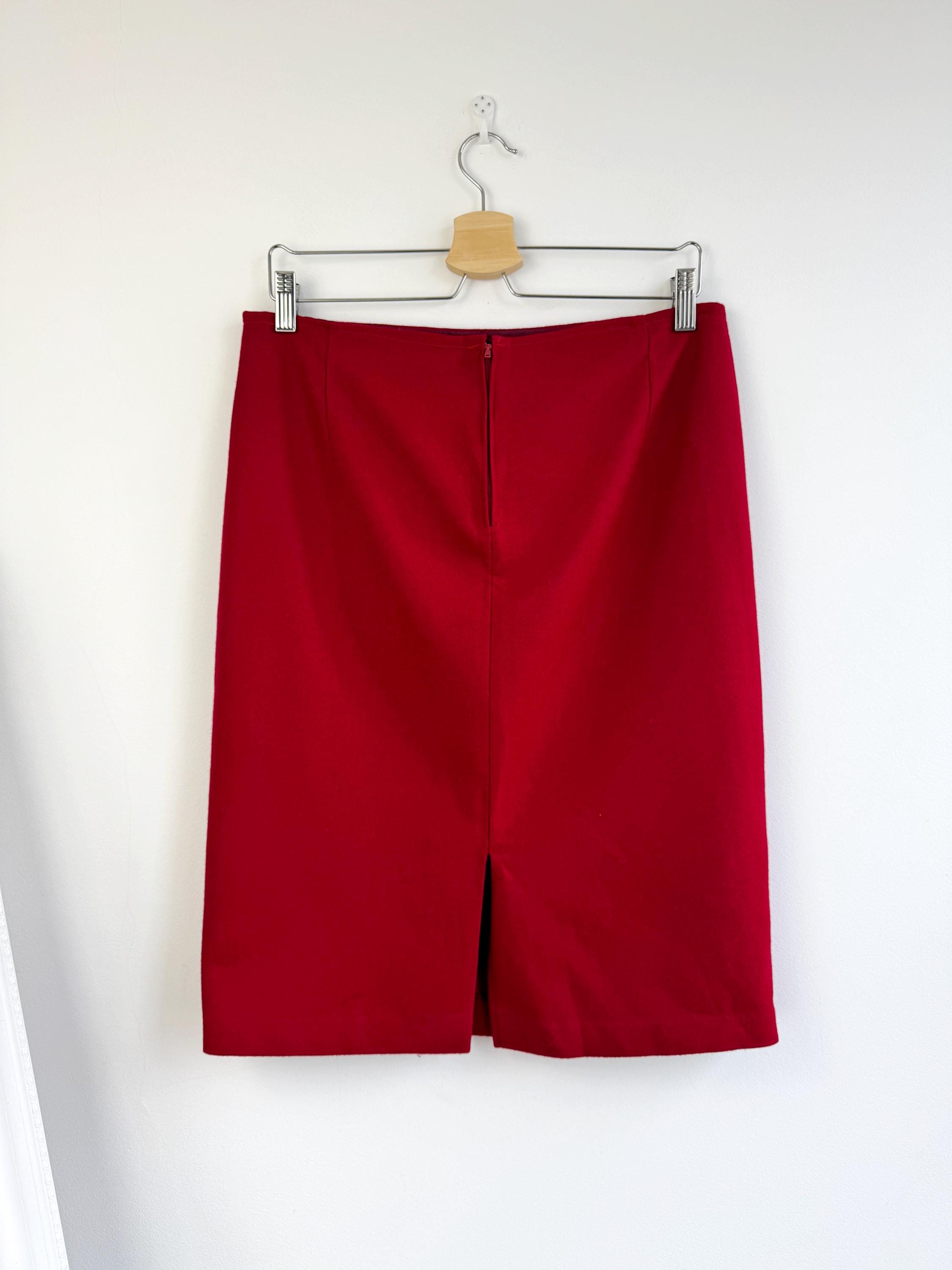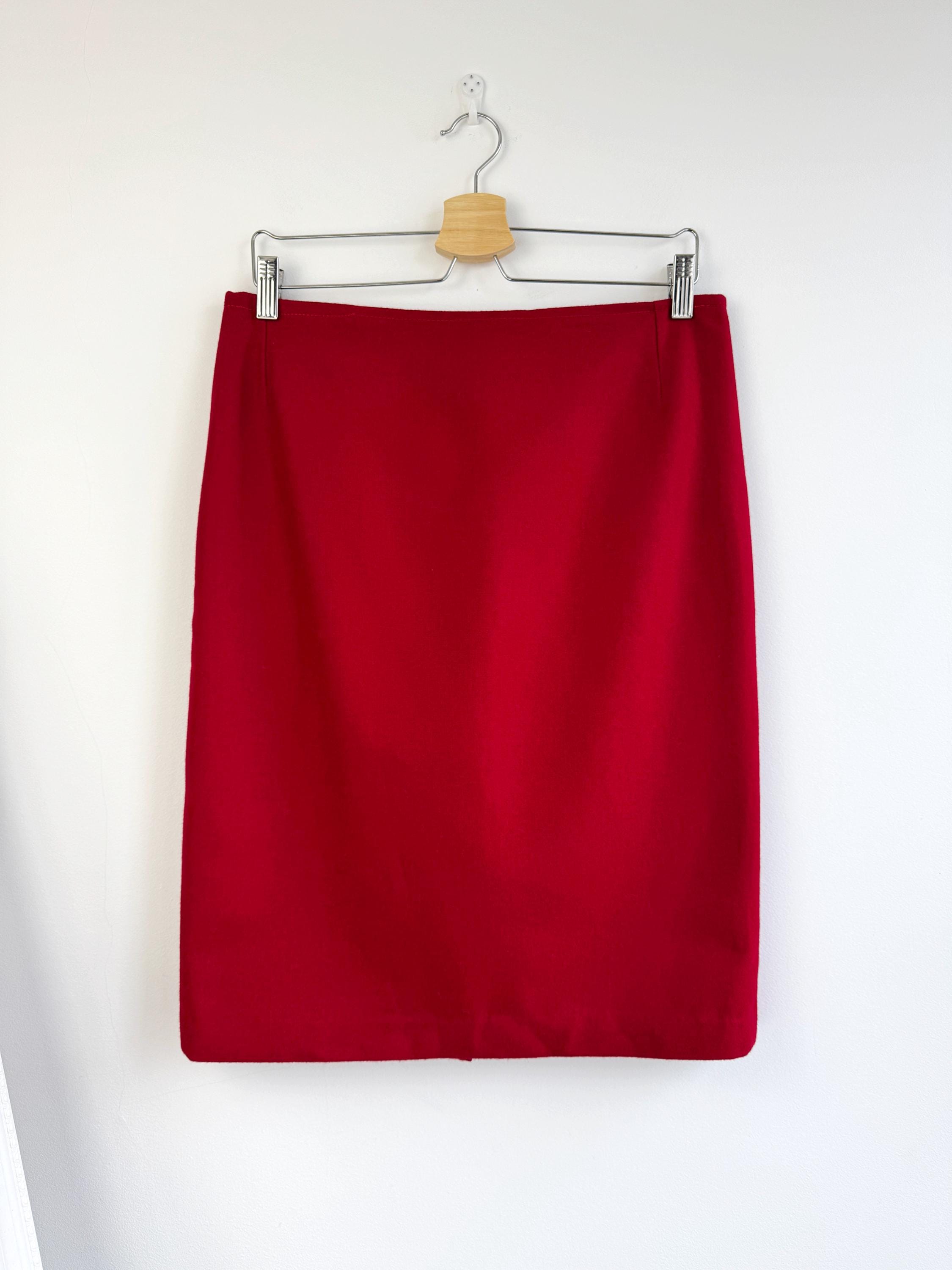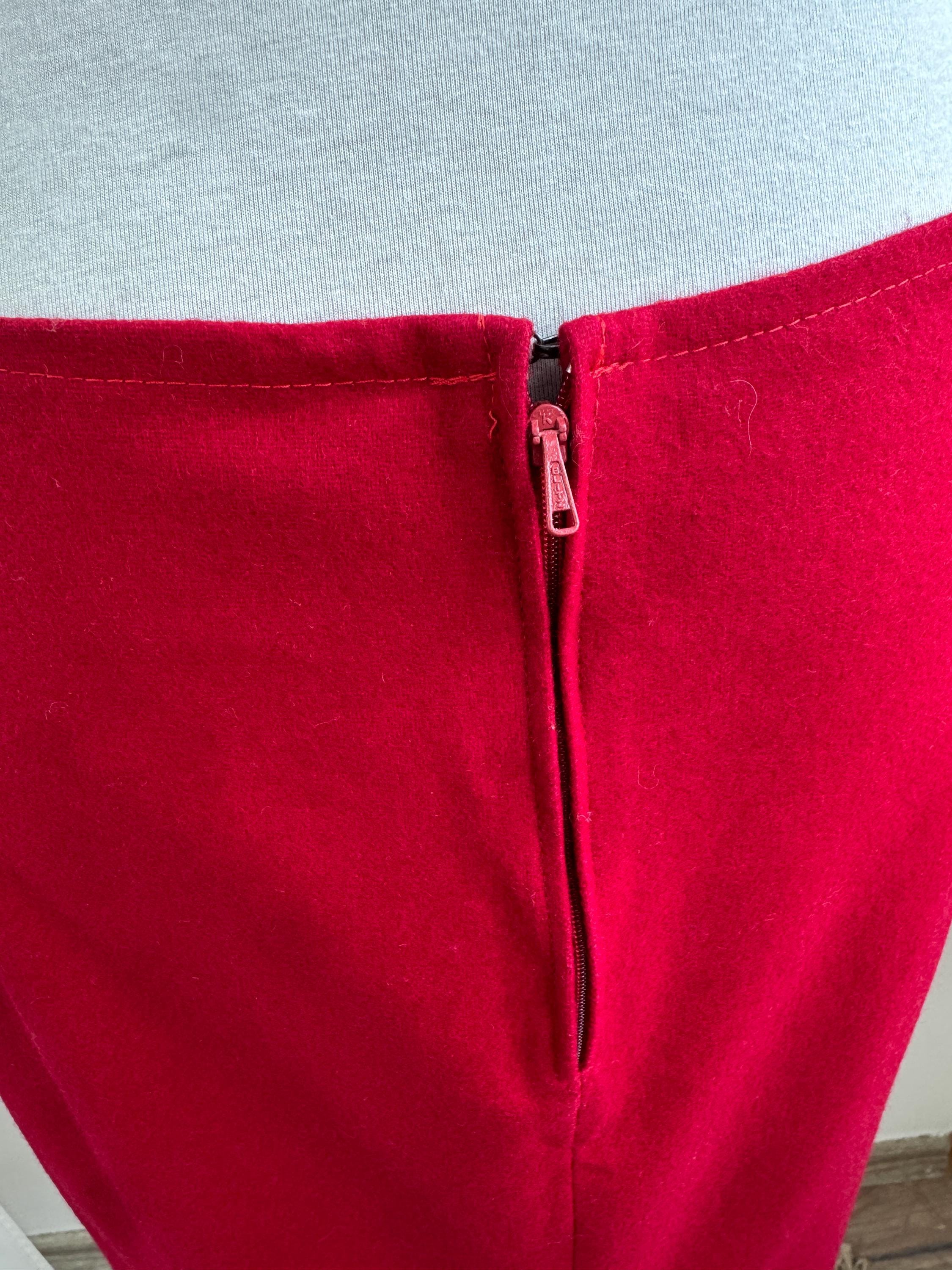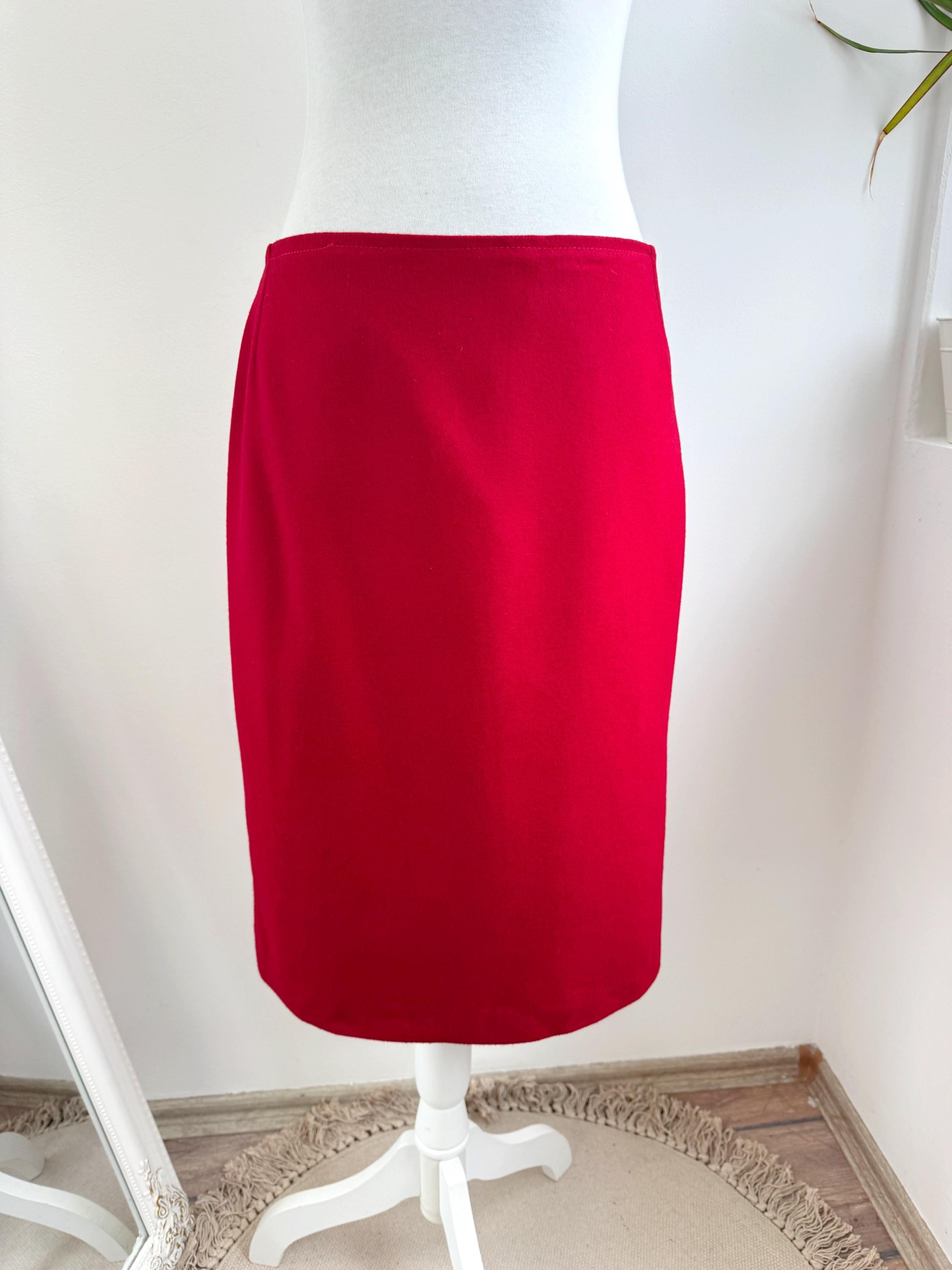 Elevate your wardrobe with this stunning vintage fine wool red pencil skirt in size M. Crafted with a clean, minimalist silhouette, this wool midi skirt features a mid waist, knee length fit that beautifully accentuates the figure. The vibrant cherry red hue is timeless, making it an easy match for crisp white shirts or cozy neutral knits. It features a sleek back zipper closure and a subtle kick pleat at the back for ease of movement and added sophistication. This red wool skirt is designed with front and back darts for a structured, tailored fit. The mid-weight fabric holds its shape perfectly, ensuring a polished look all day long.