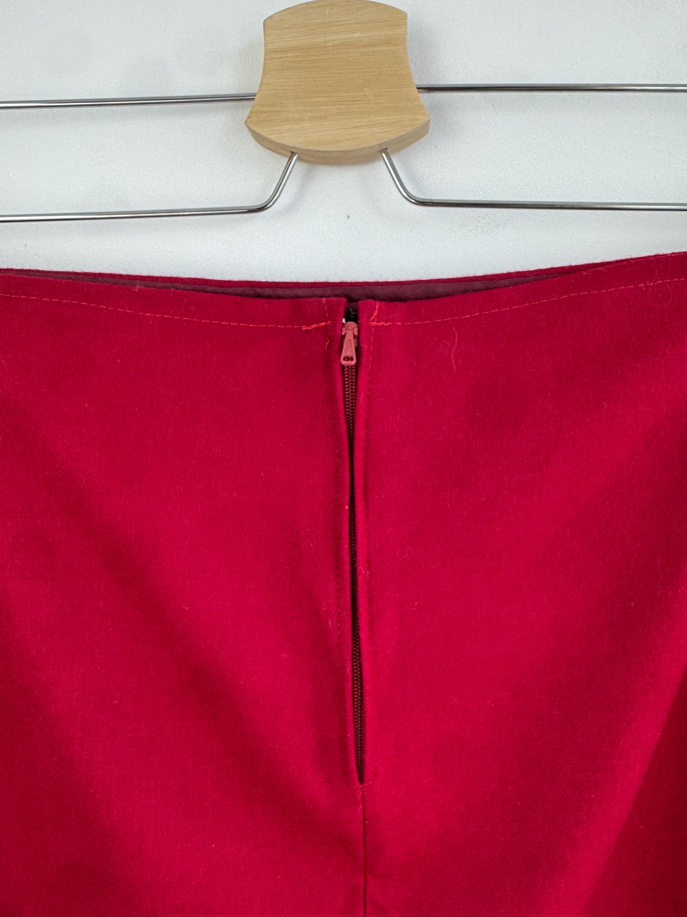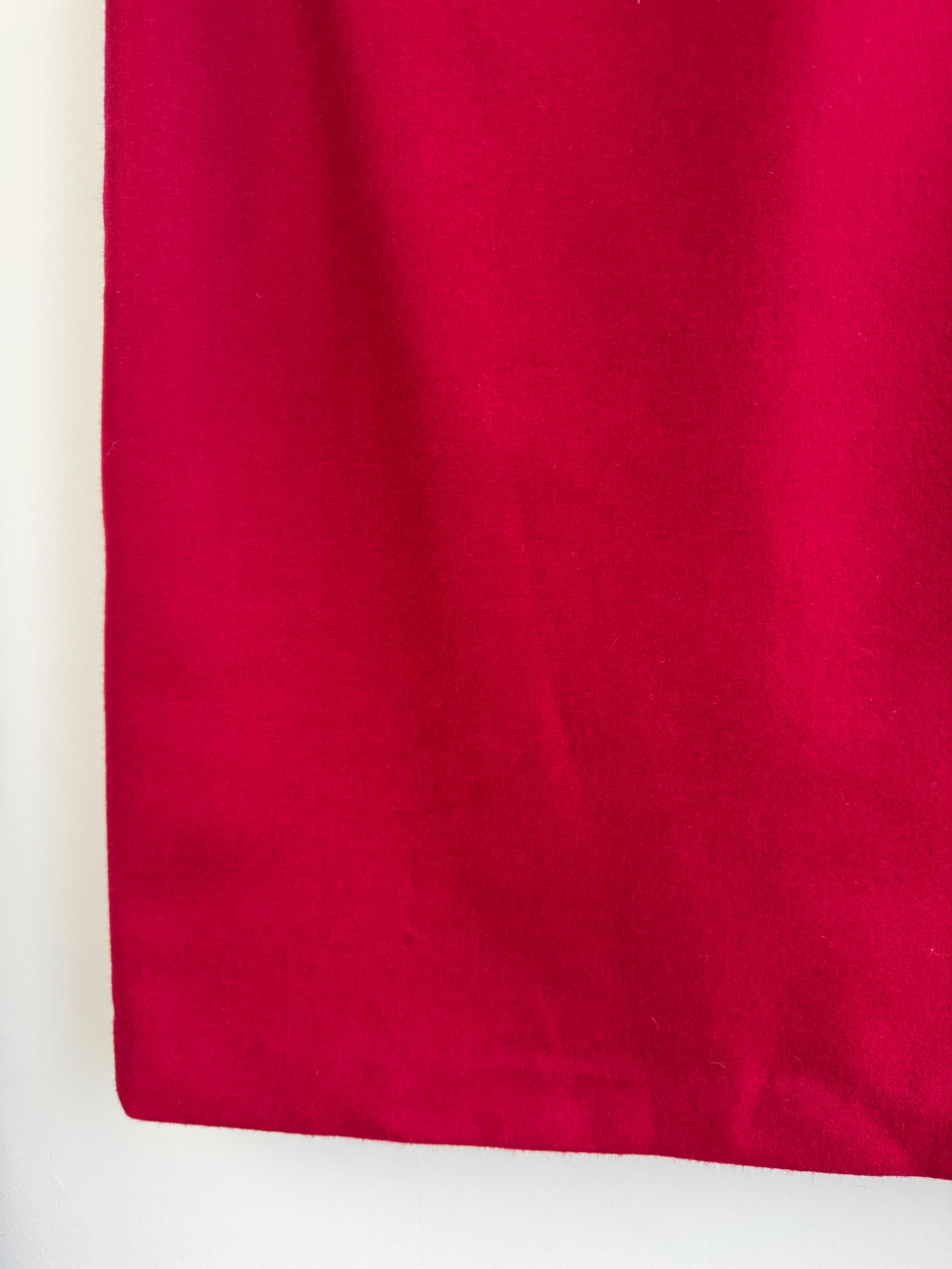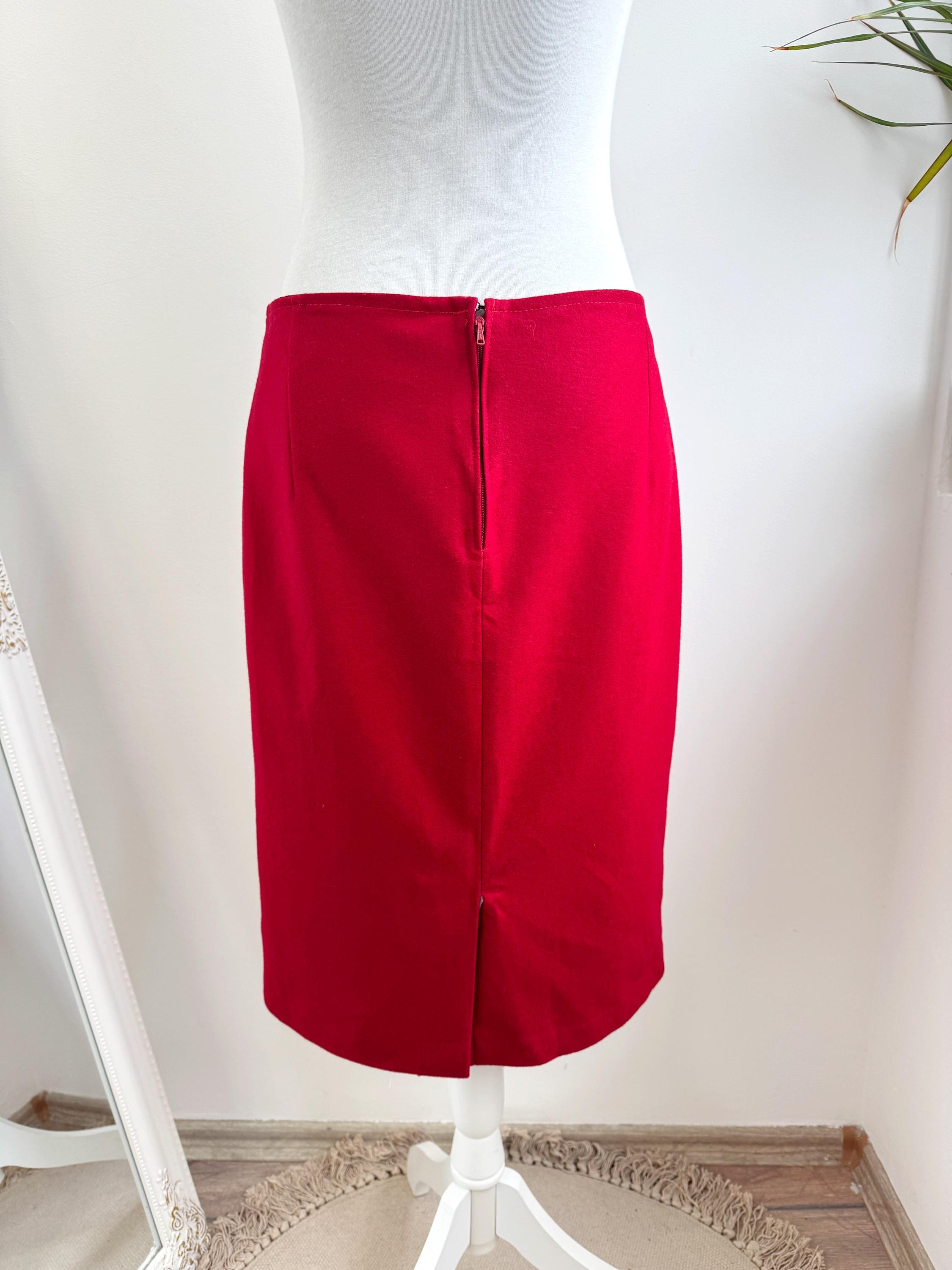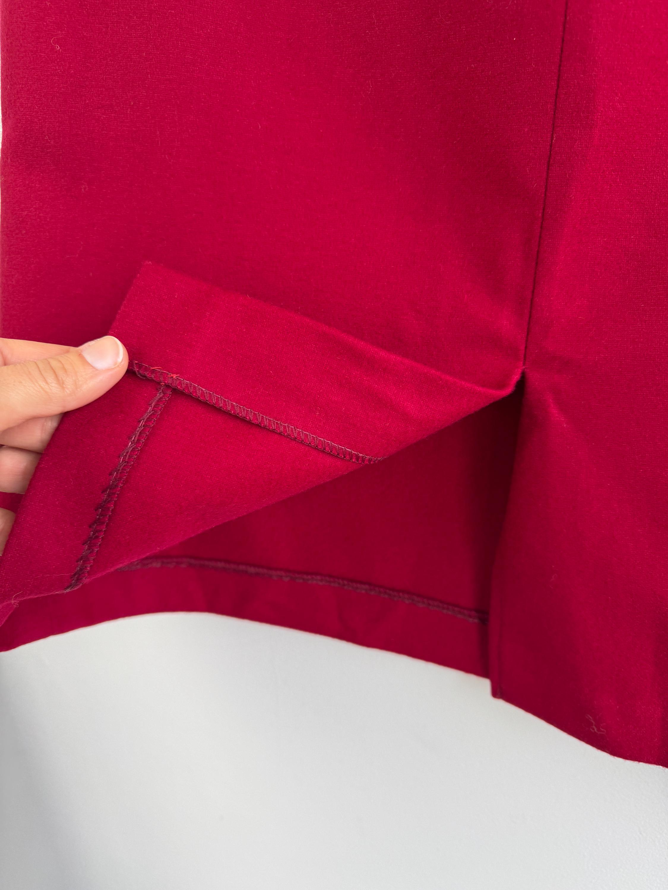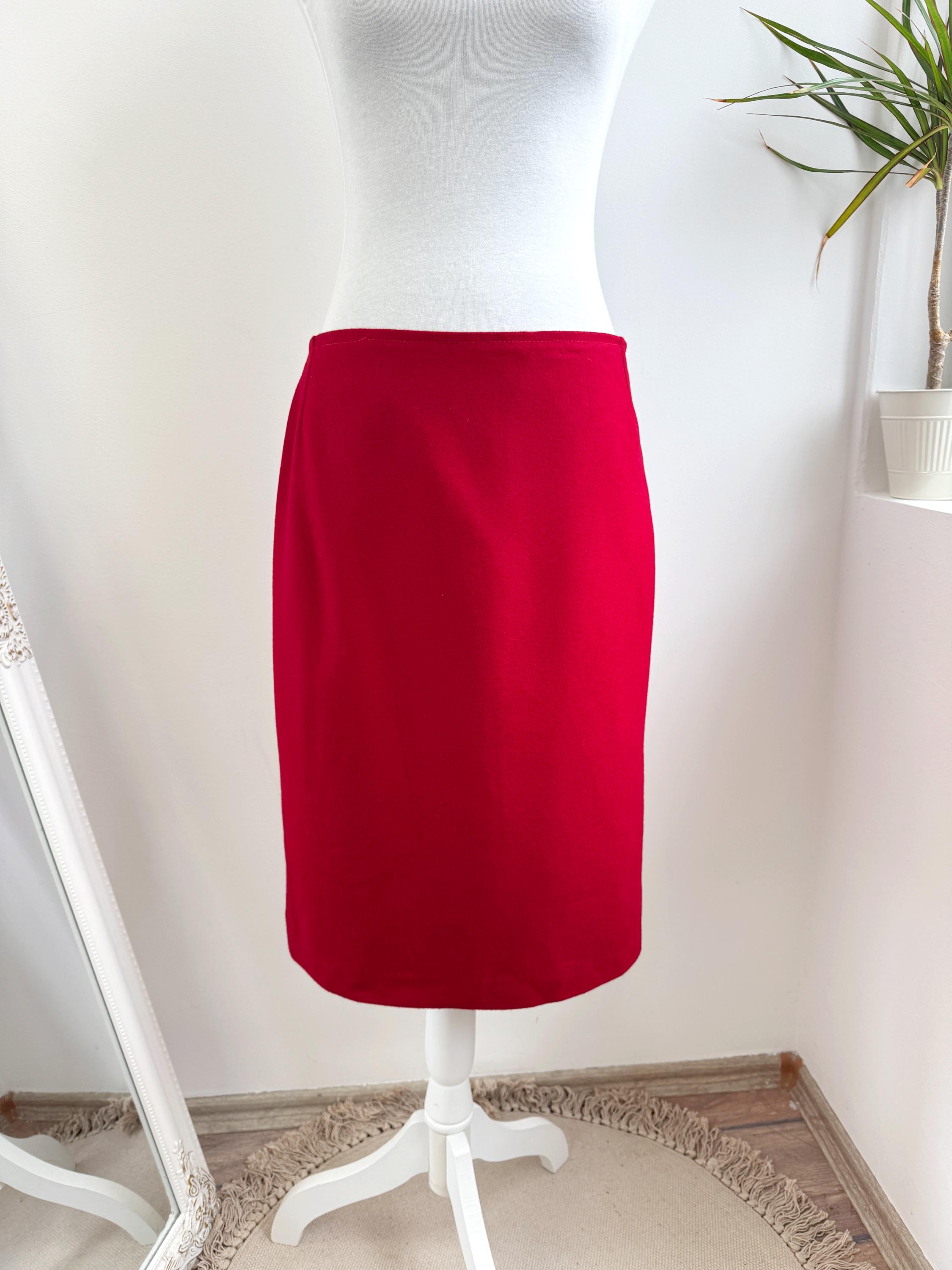 Elevate your wardrobe with this stunning vintage fine wool red pencil skirt in size M. Crafted with a clean, minimalist silhouette, this wool midi skirt features a mid waist, knee length fit that beautifully accentuates the figure. The vibrant cherry red hue is timeless, making it an easy match for crisp white shirts or cozy neutral knits. It features a sleek back zipper closure and a subtle kick pleat at the back for ease of movement and added sophistication. This red wool skirt is designed with front and back darts for a structured, tailored fit. The mid-weight fabric holds its shape perfectly, ensuring a polished look all day long.