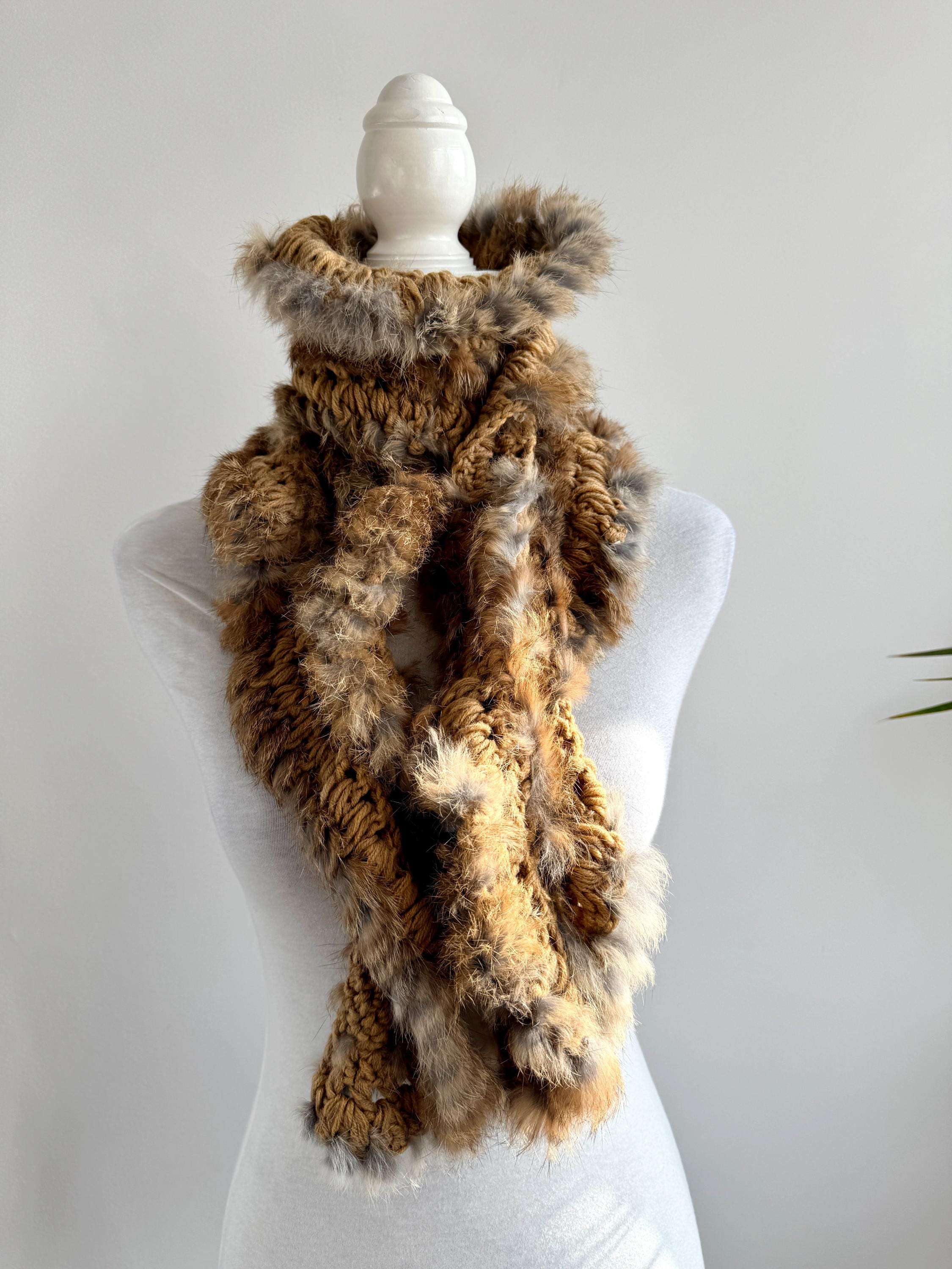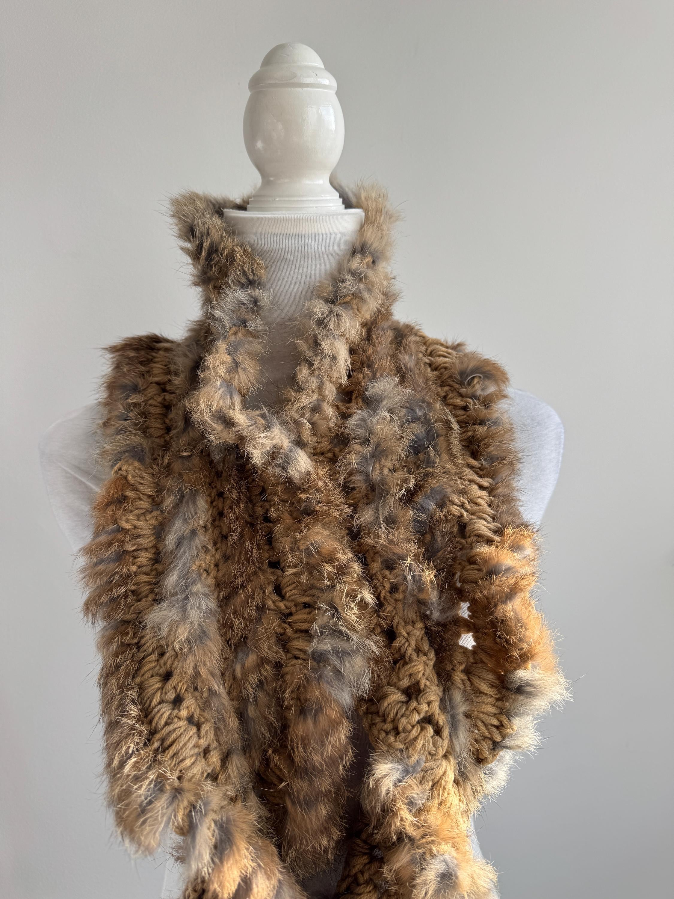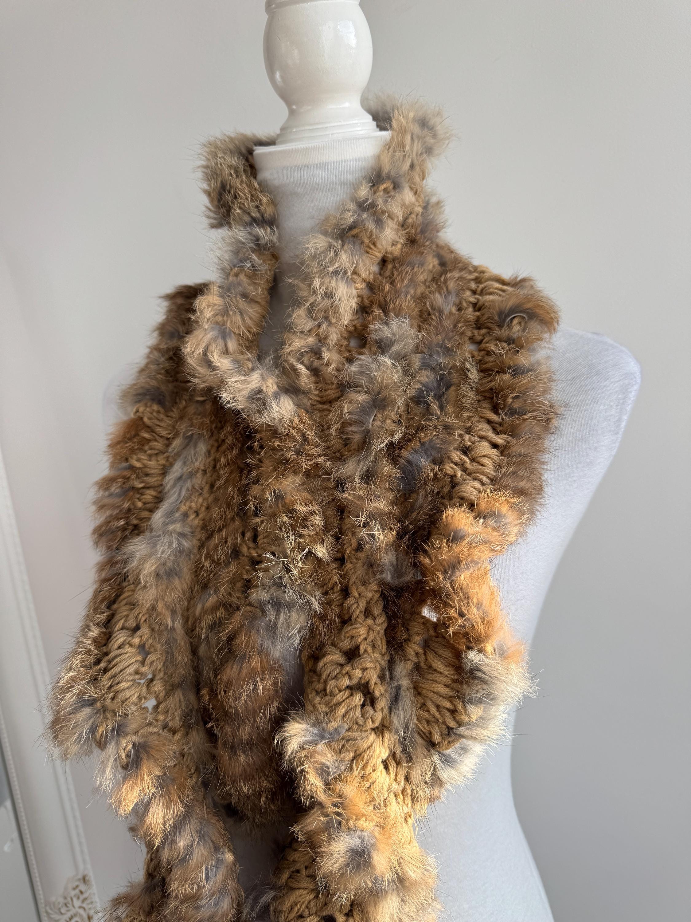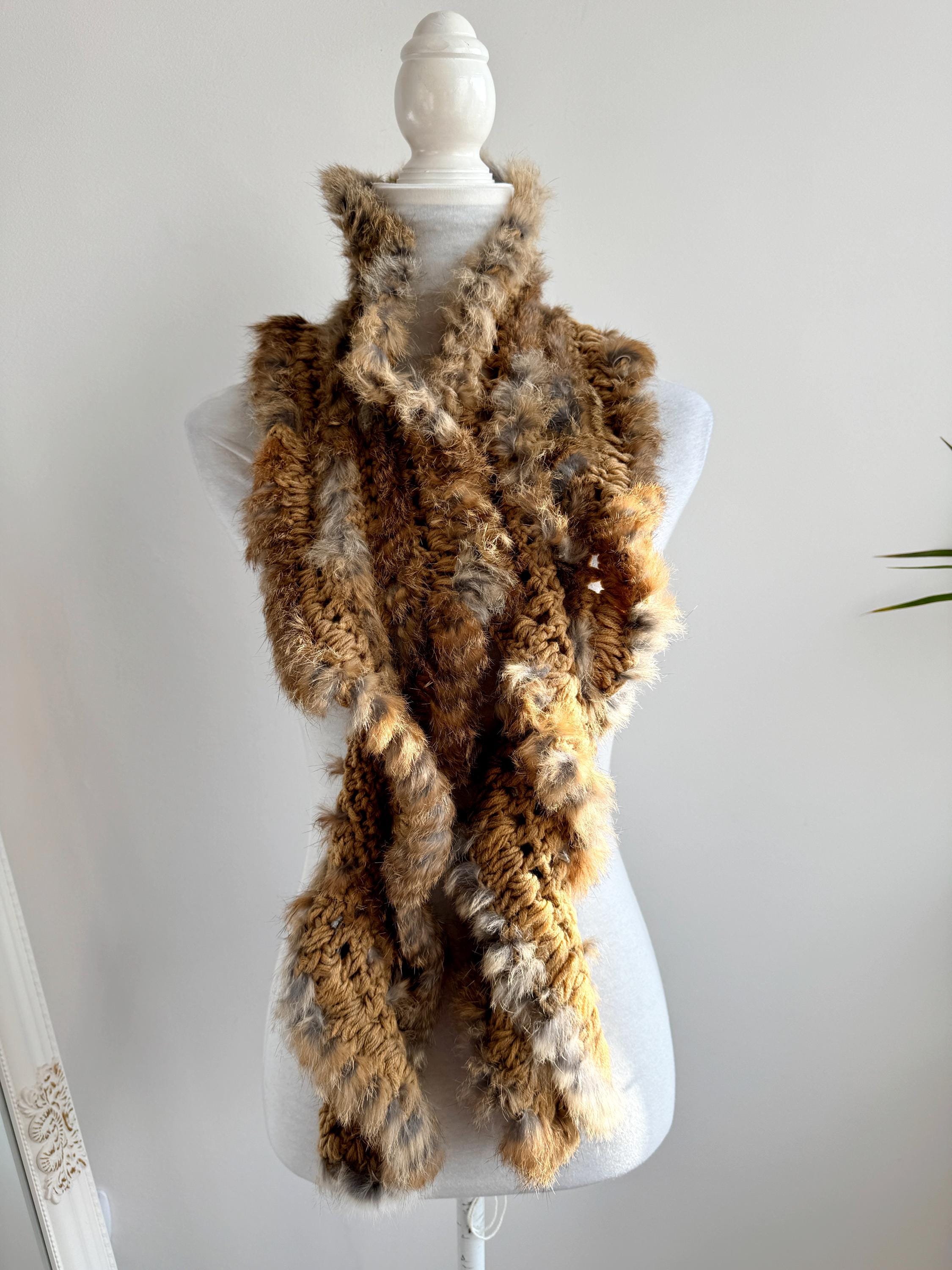 This vintage real rabbit fur scarf will help you wrap yourself in effortless luxury. This honey brown fur scarf features a beautiful combination of craftsmanship and textures, showcasing a chunky crochet base (made of 100% acrylic) meticulously interwoven with soft, genuine rabbit fur. The honey-brown and caramel tones are accented with natural grey highlights, creating a rich, dimensional look that adds instant warmth and sophistication to any winter outfit.