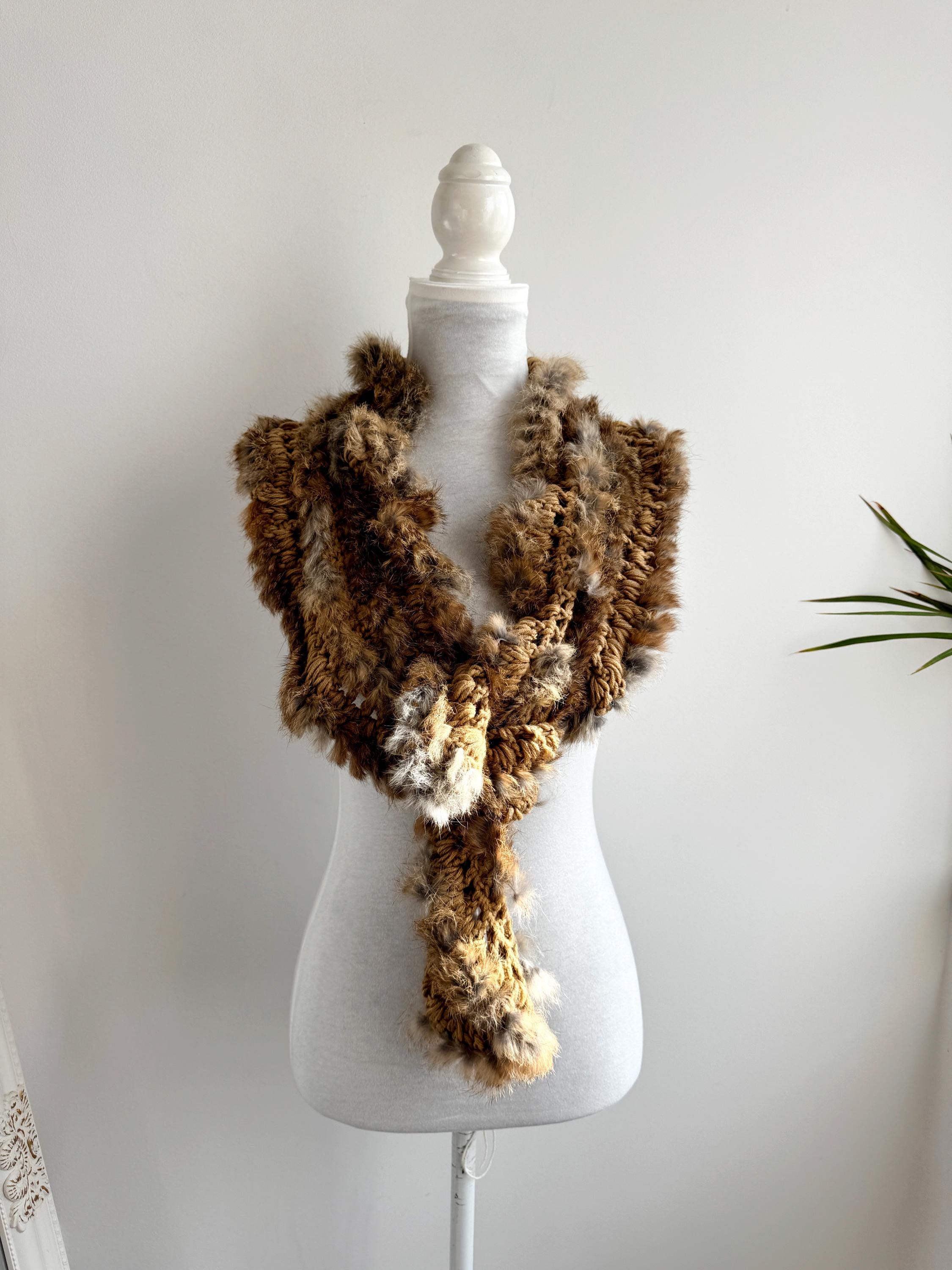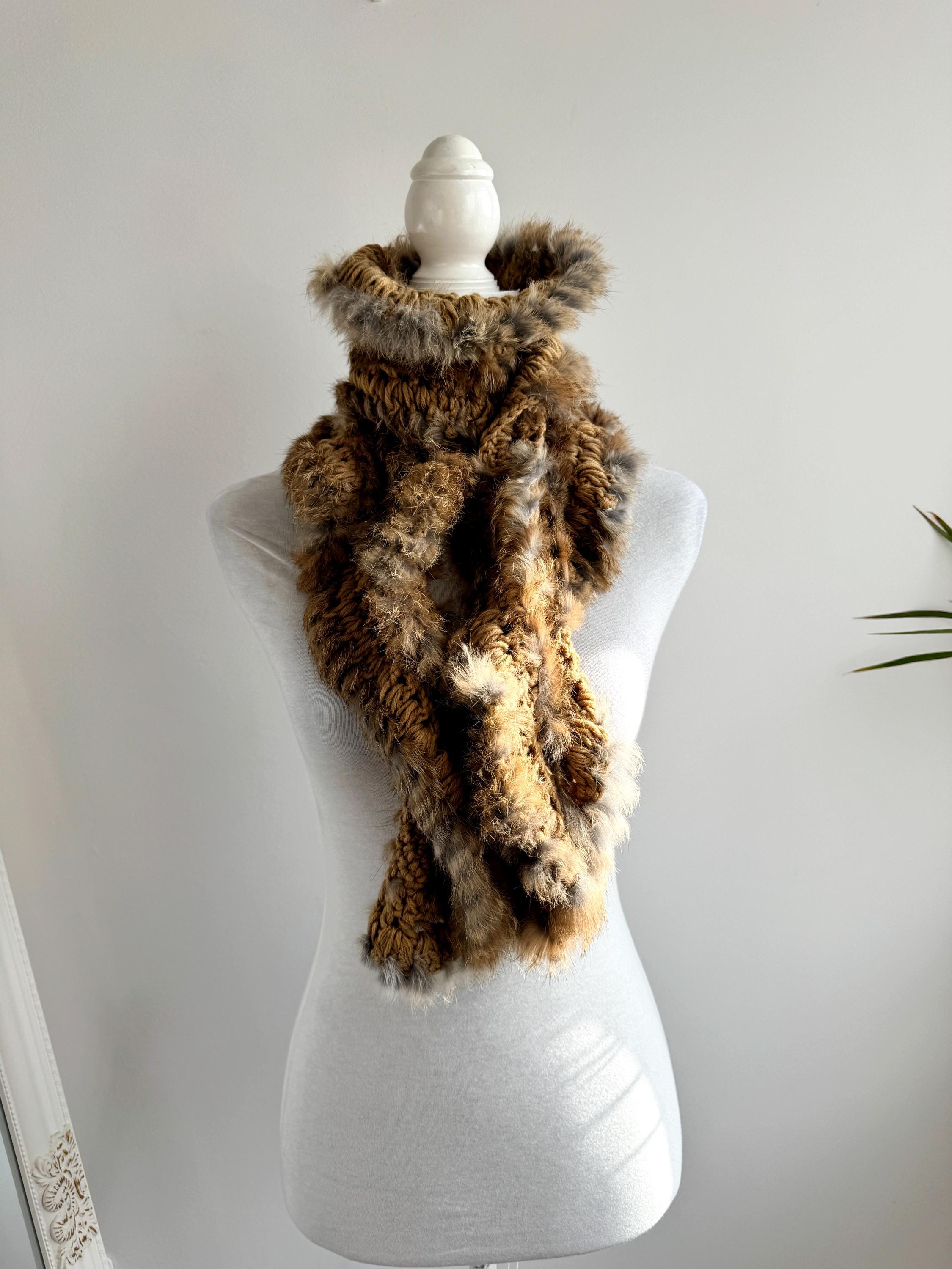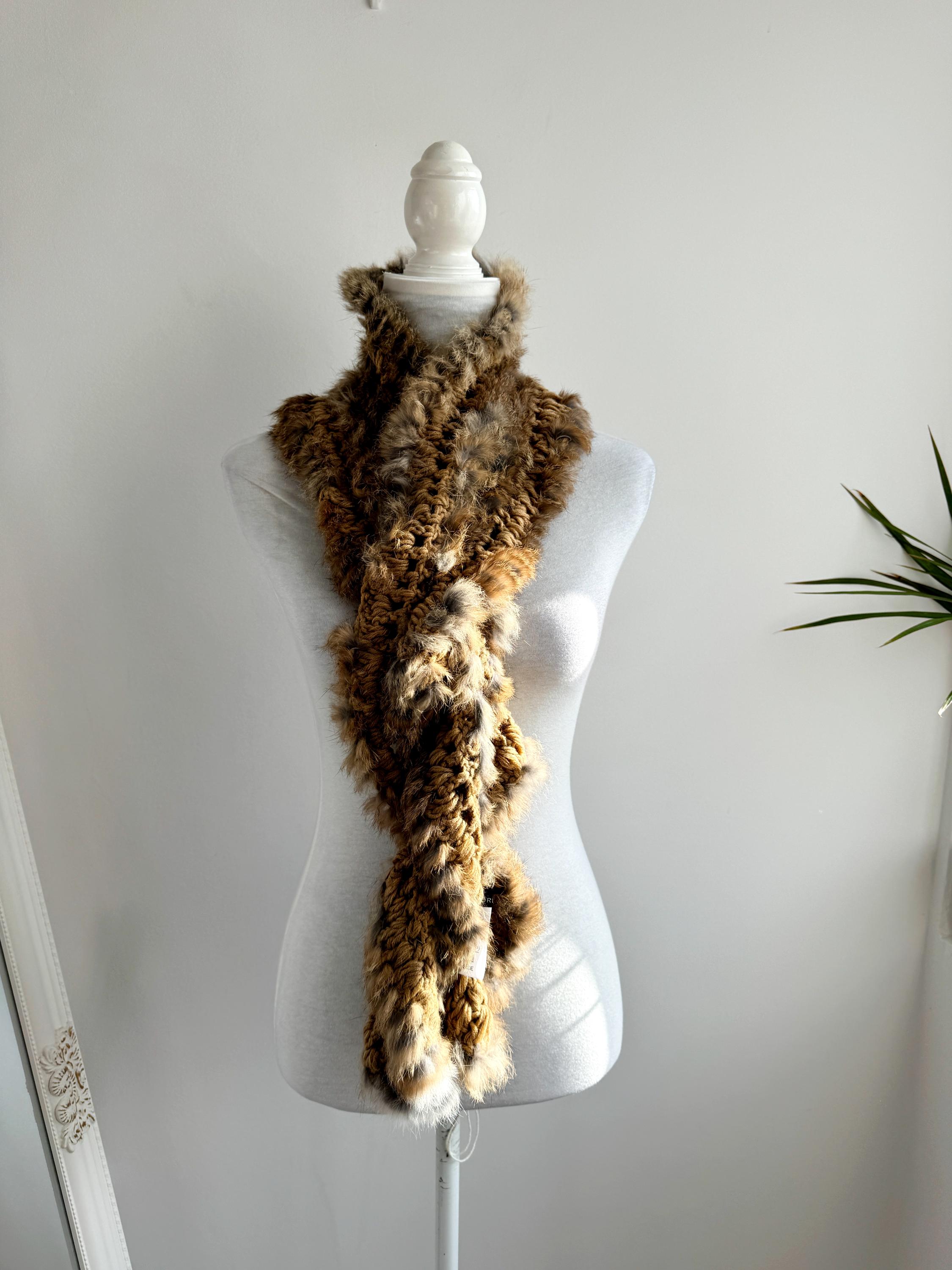 This vintage real rabbit fur scarf will help you wrap yourself in effortless luxury. This honey brown fur scarf features a beautiful combination of craftsmanship and textures, showcasing a chunky crochet base (made of 100% acrylic) meticulously interwoven with soft, genuine rabbit fur. The honey-brown and caramel tones are accented with natural grey highlights, creating a rich, dimensional look that adds instant warmth and sophistication to any winter outfit.