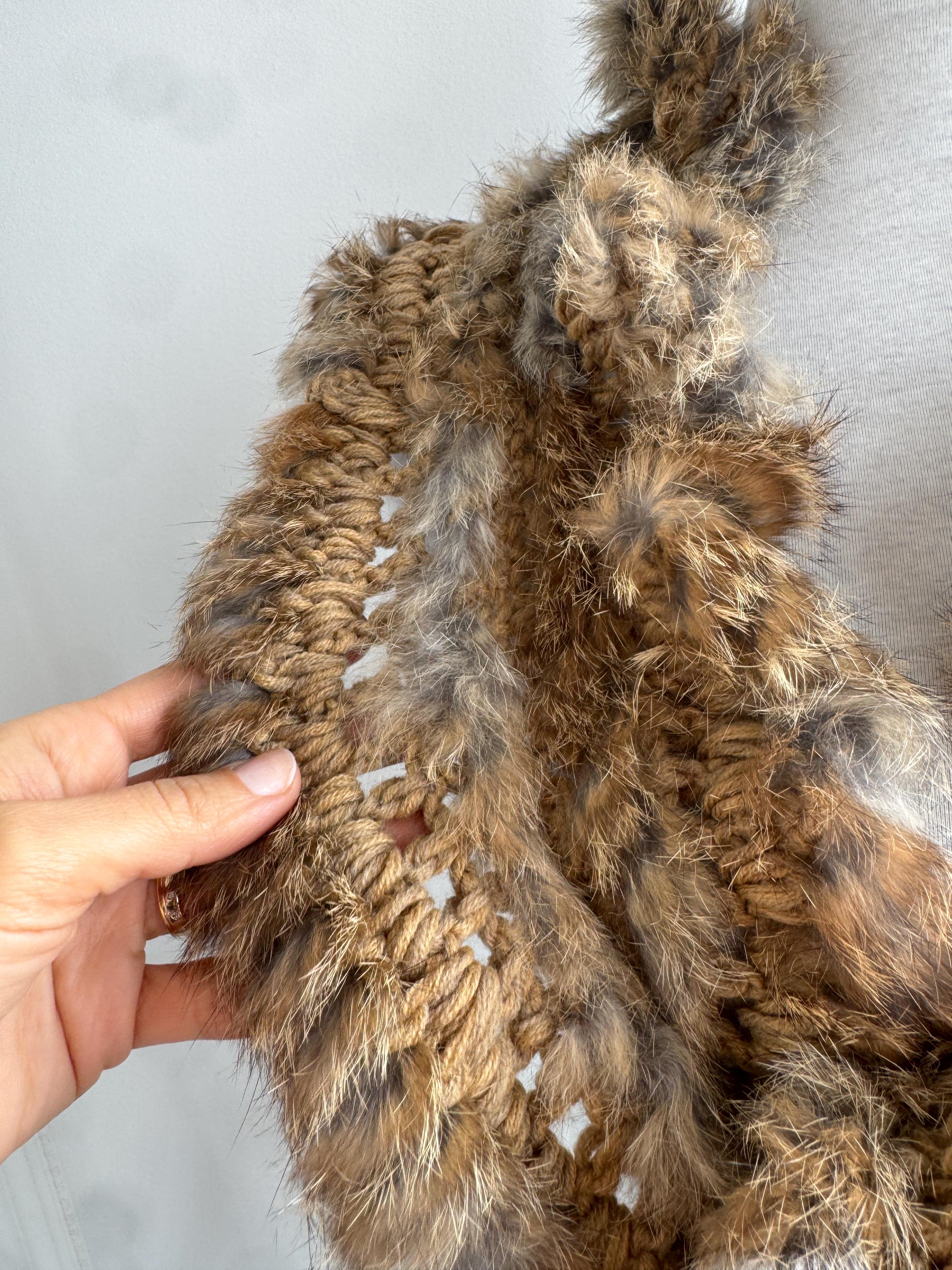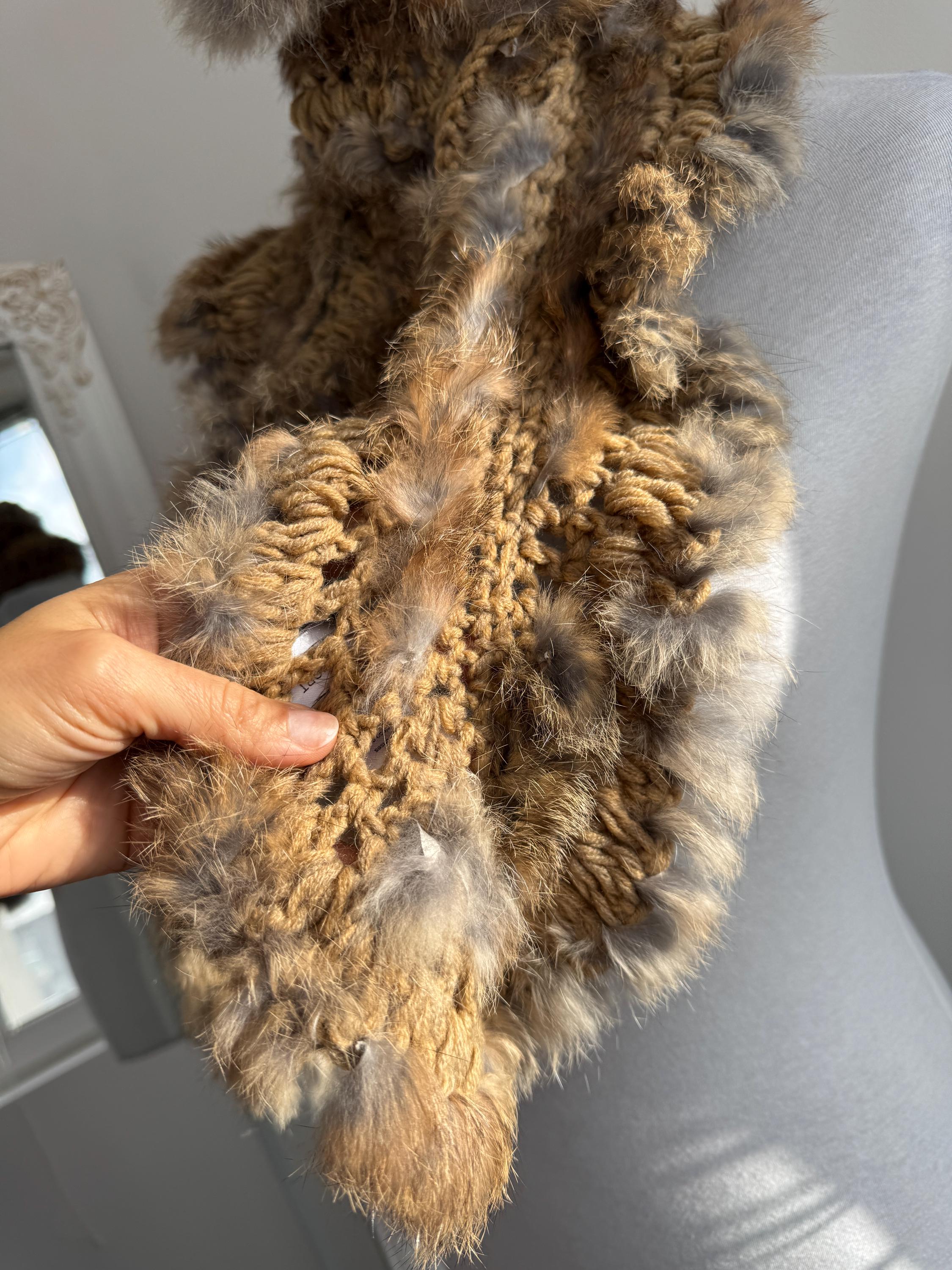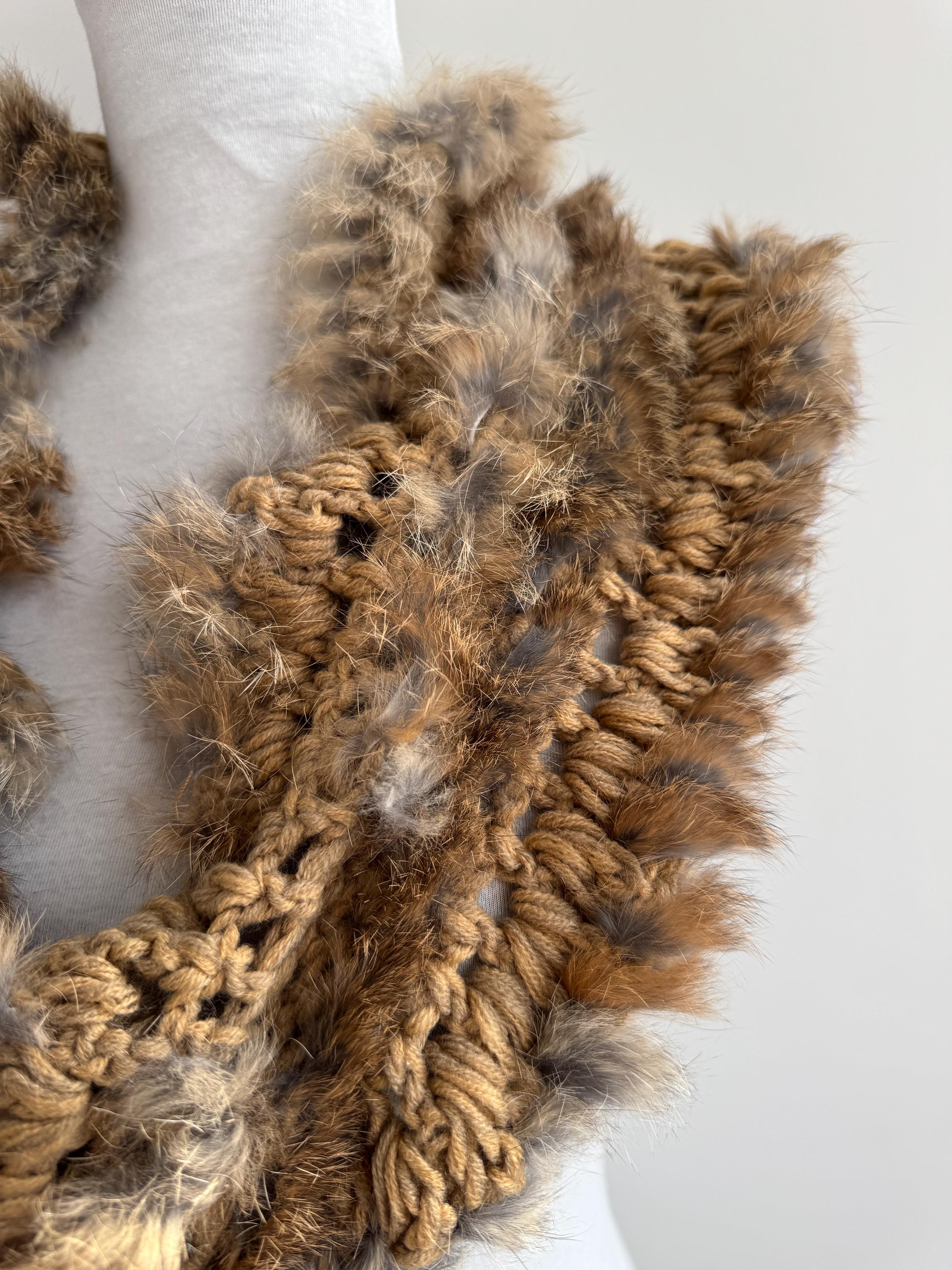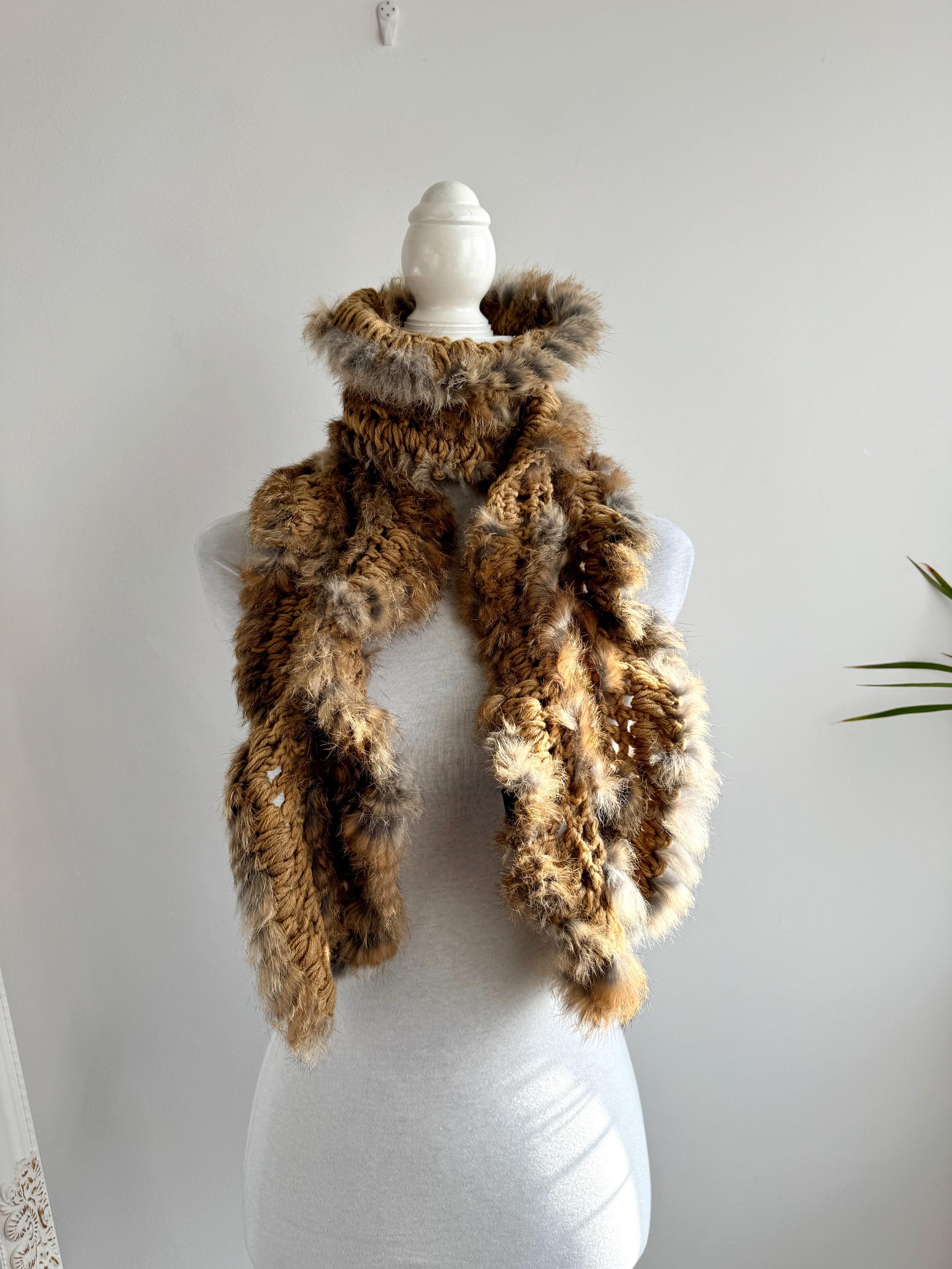 This vintage real rabbit fur scarf will help you wrap yourself in effortless luxury. This honey brown fur scarf features a beautiful combination of craftsmanship and textures, showcasing a chunky crochet base (made of 100% acrylic) meticulously interwoven with soft, genuine rabbit fur. The honey-brown and caramel tones are accented with natural grey highlights, creating a rich, dimensional look that adds instant warmth and sophistication to any winter outfit.
