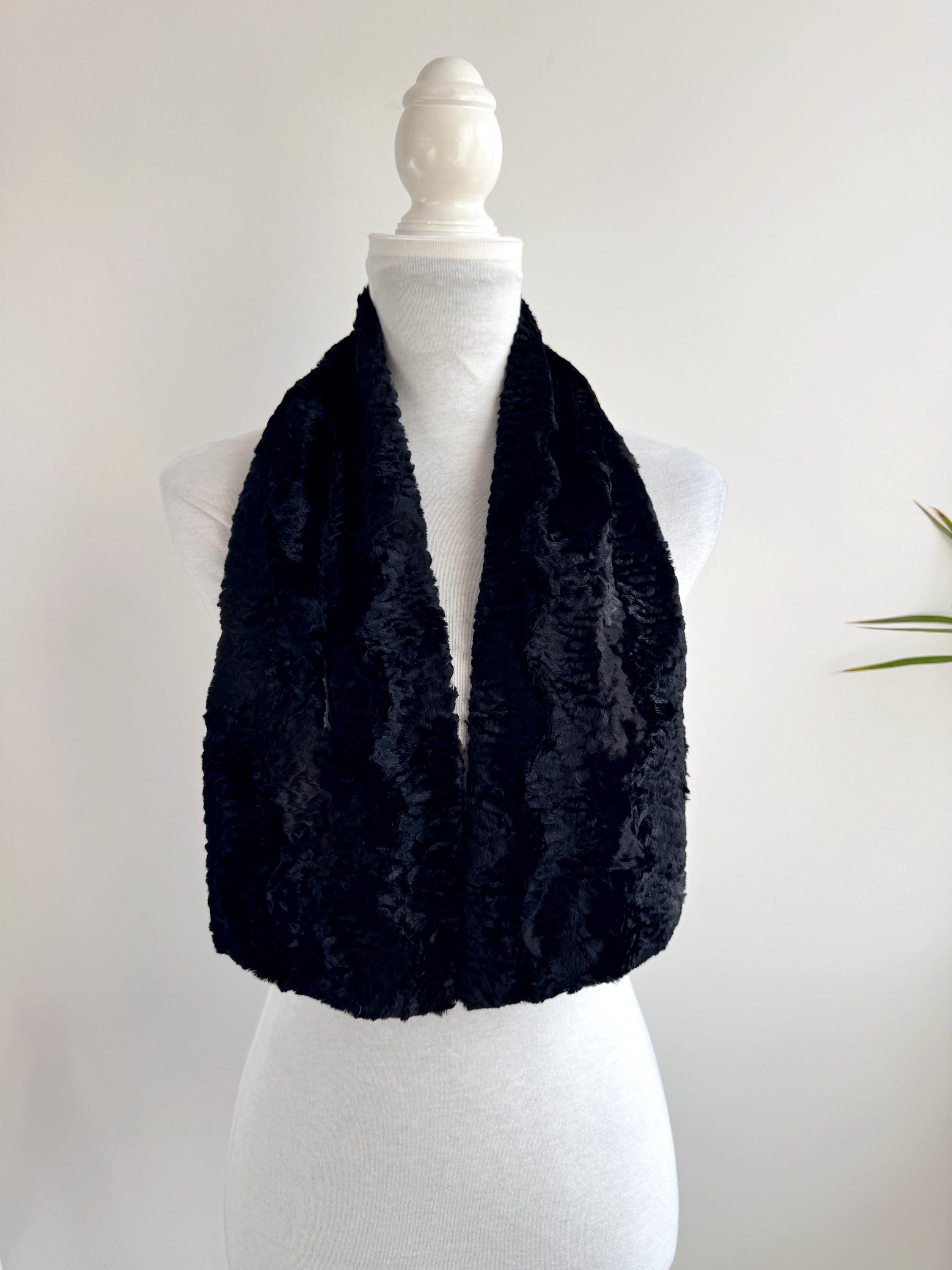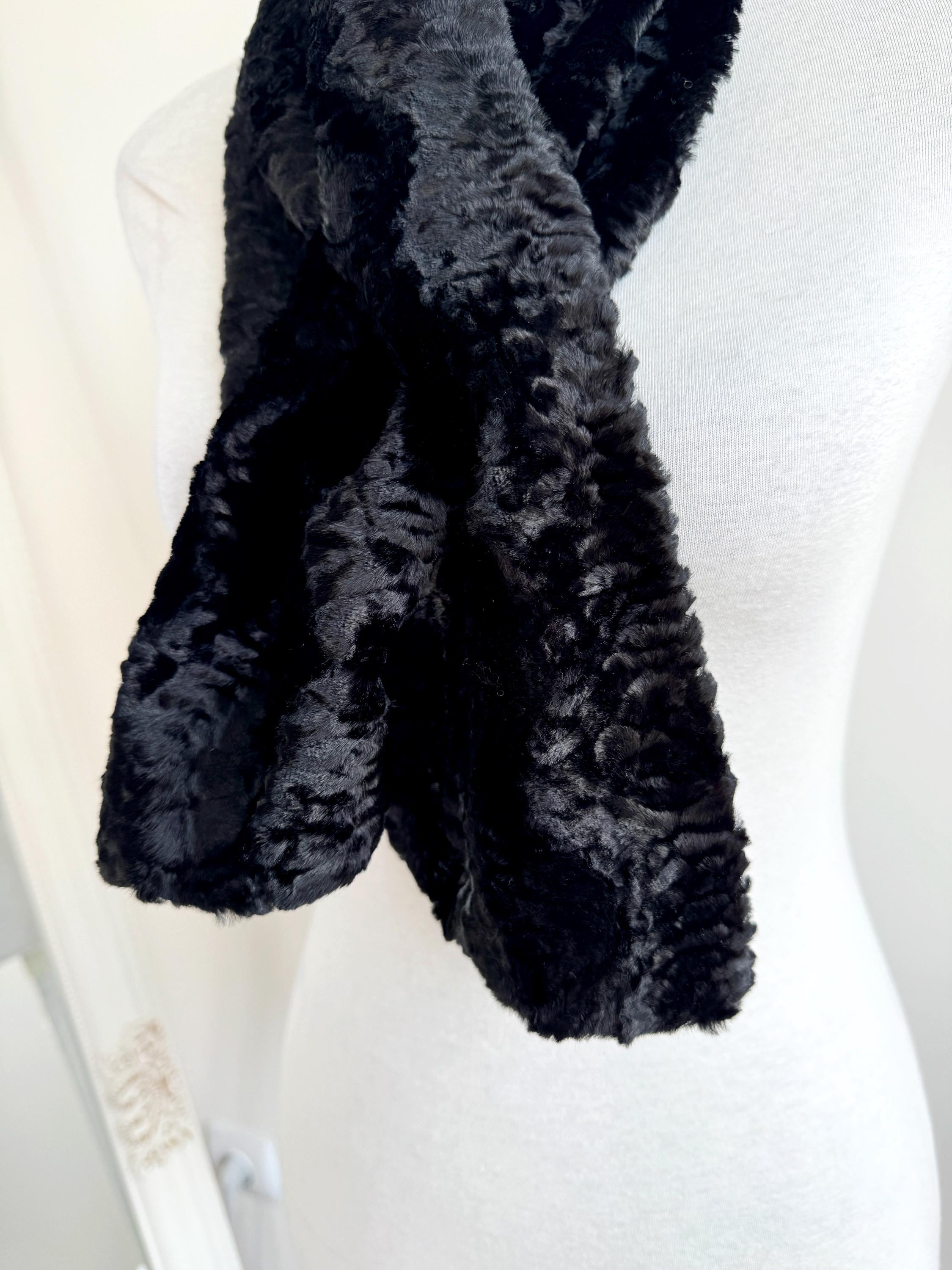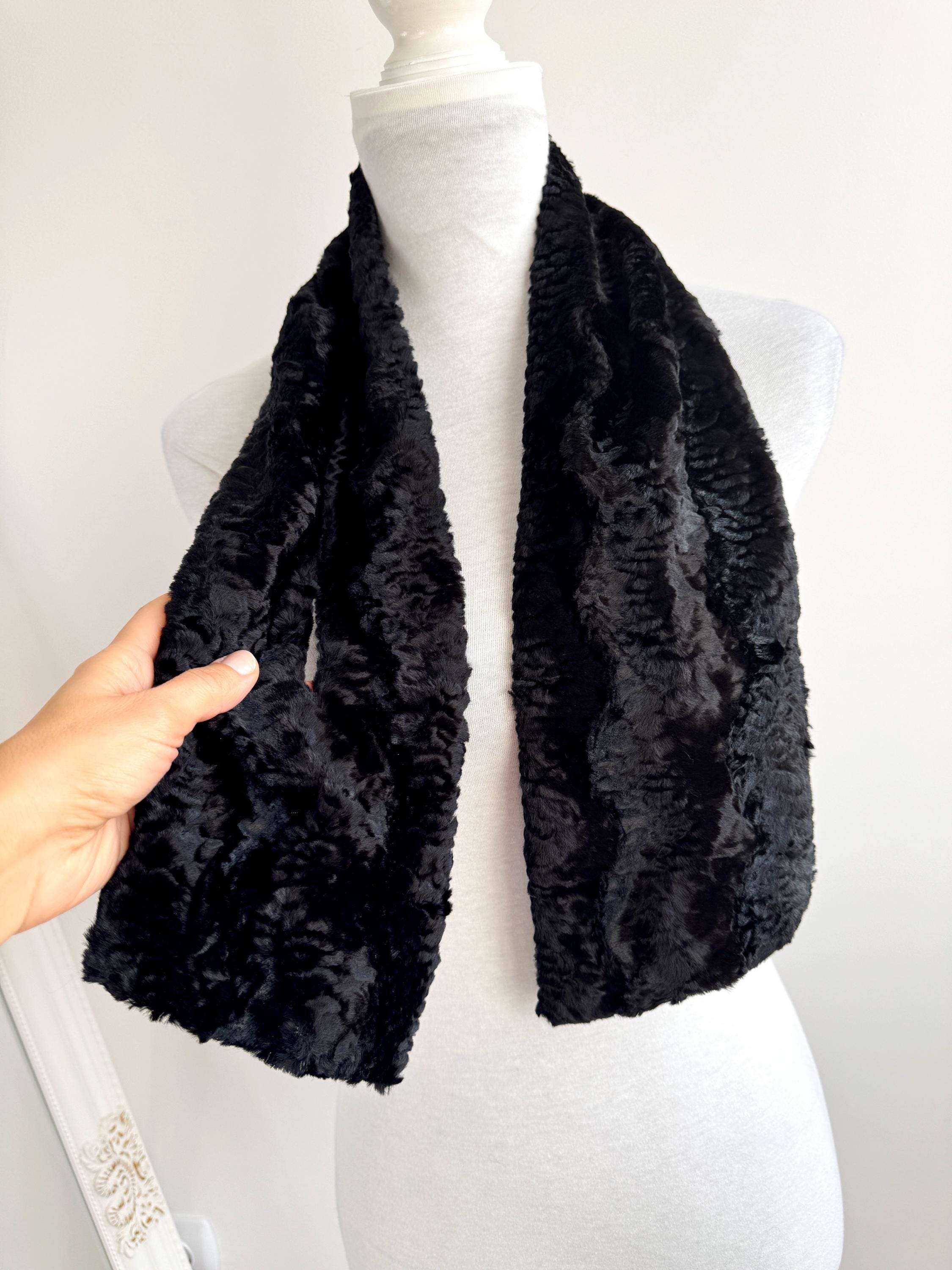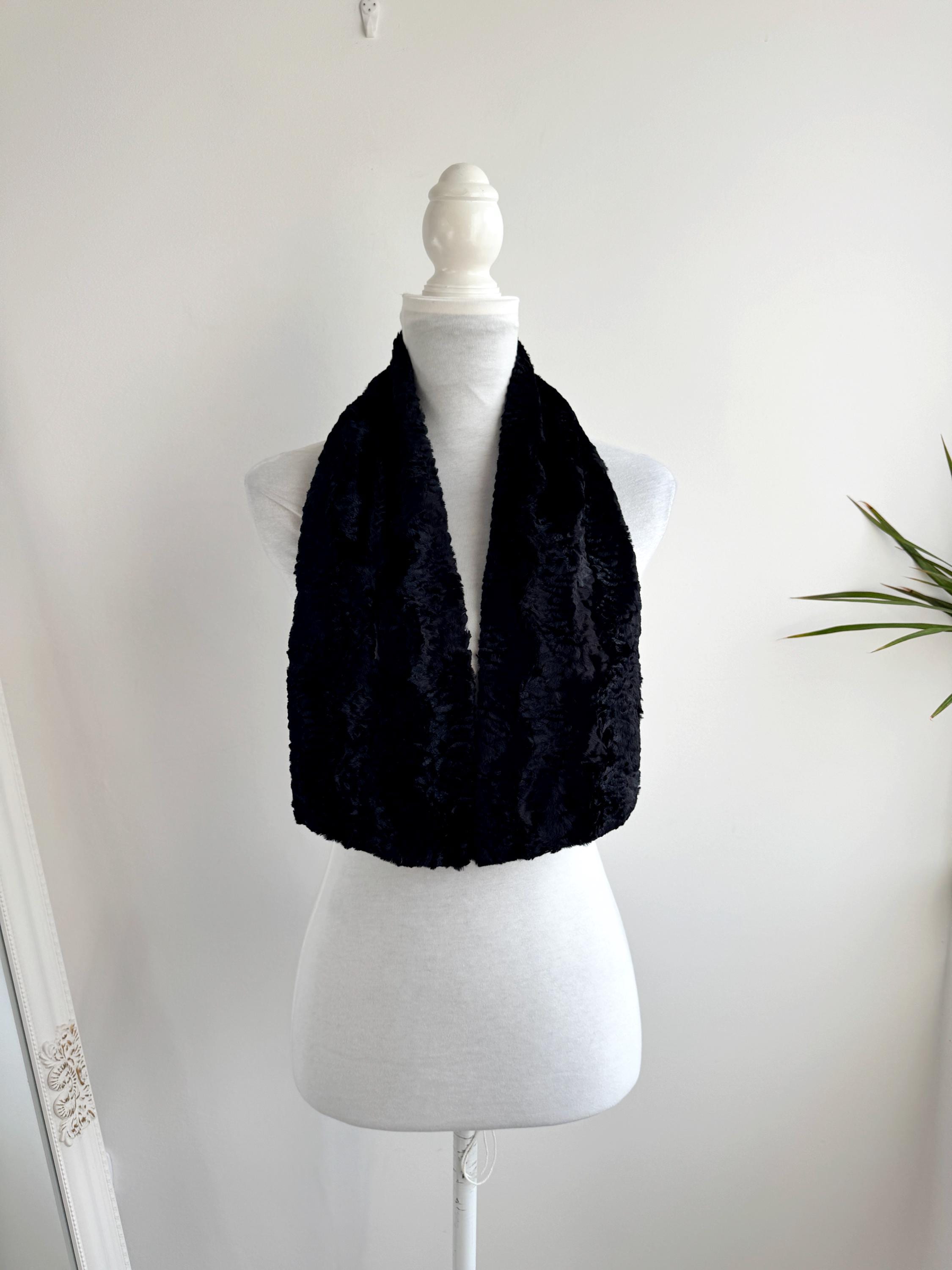 This elegant vintage black pull-through scarf is the perfect blend of sophisticated style and cozy warmth. Featuring a beautiful crushed velvet texture that mimics the look of high-end faux fur, it offers a plush, luxurious feel without the bulk. The clever "keyhole" or pull-through design ensures it stays perfectly in place, framing your neck beautifully whether you're wearing it with a tailored wool coat or an evening dress.