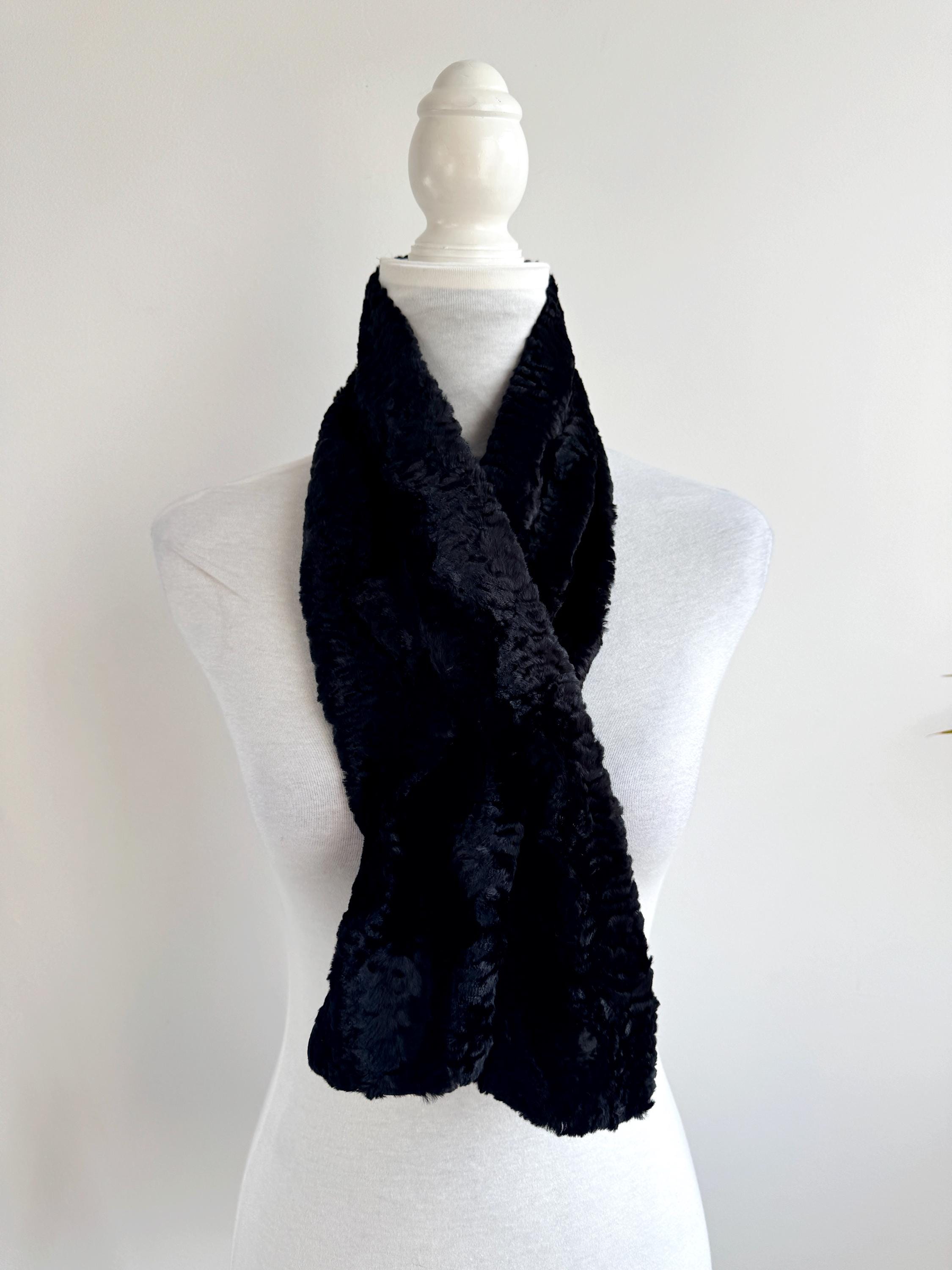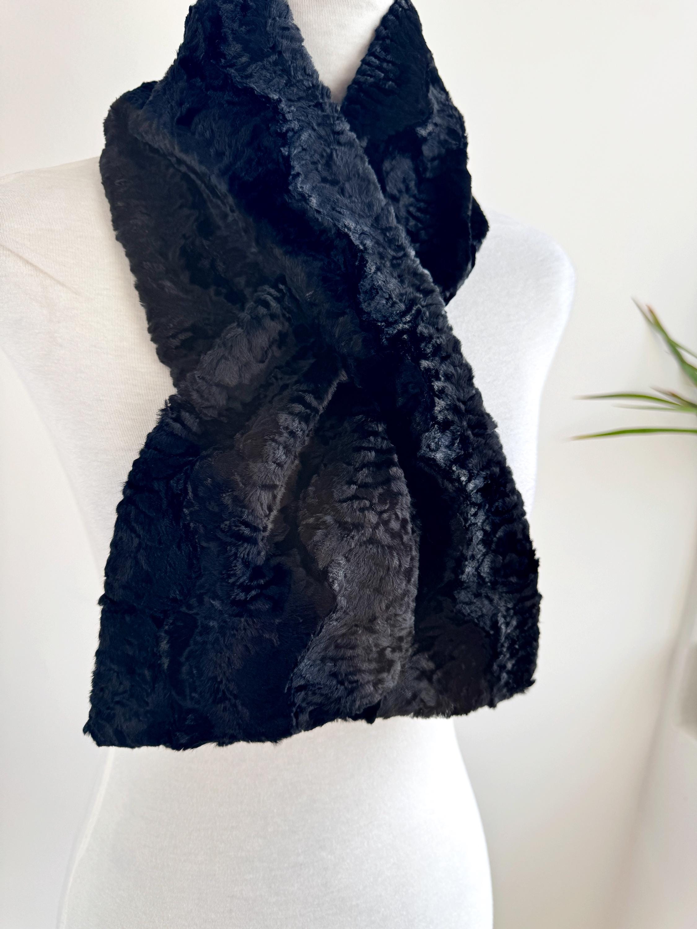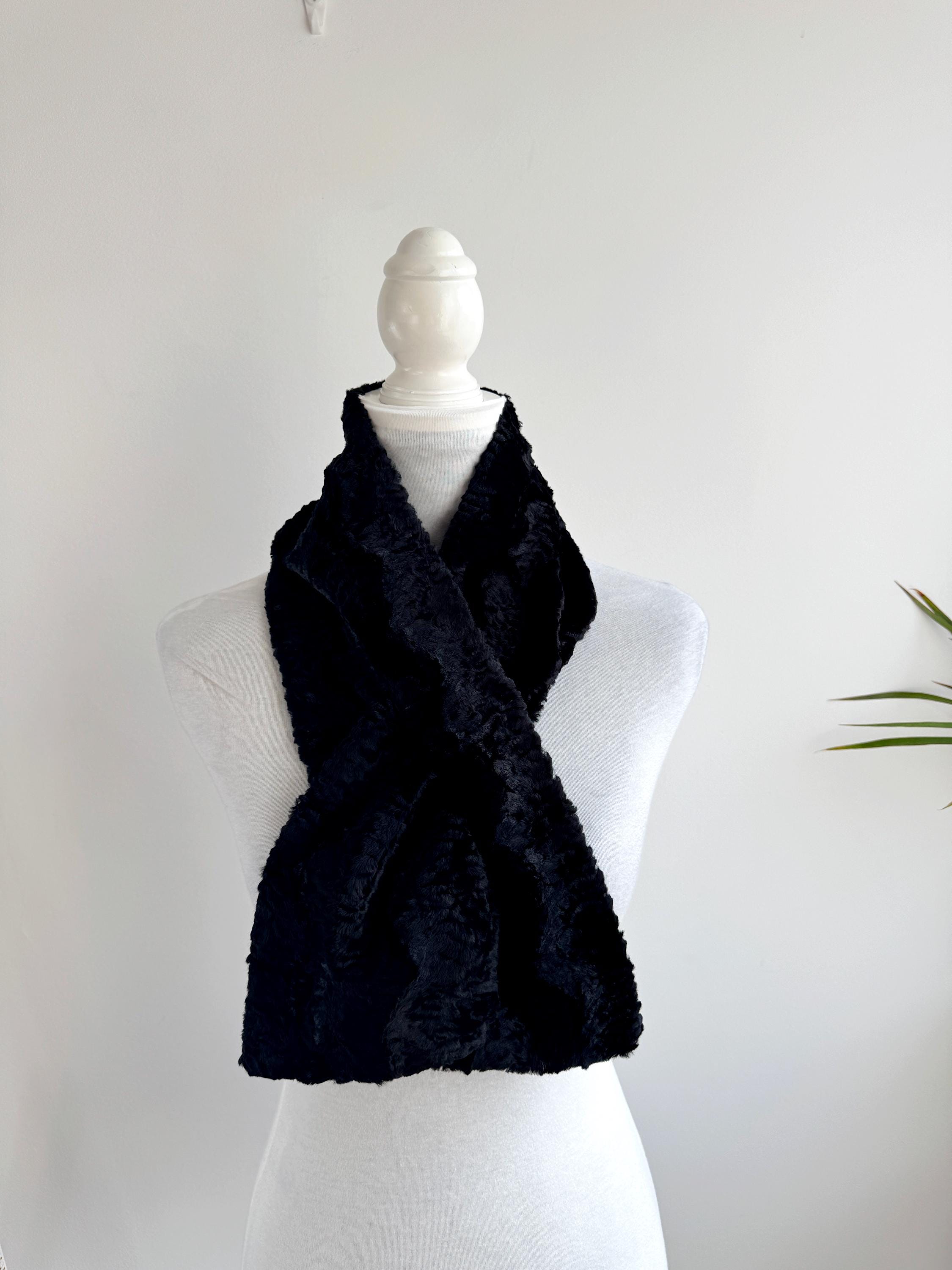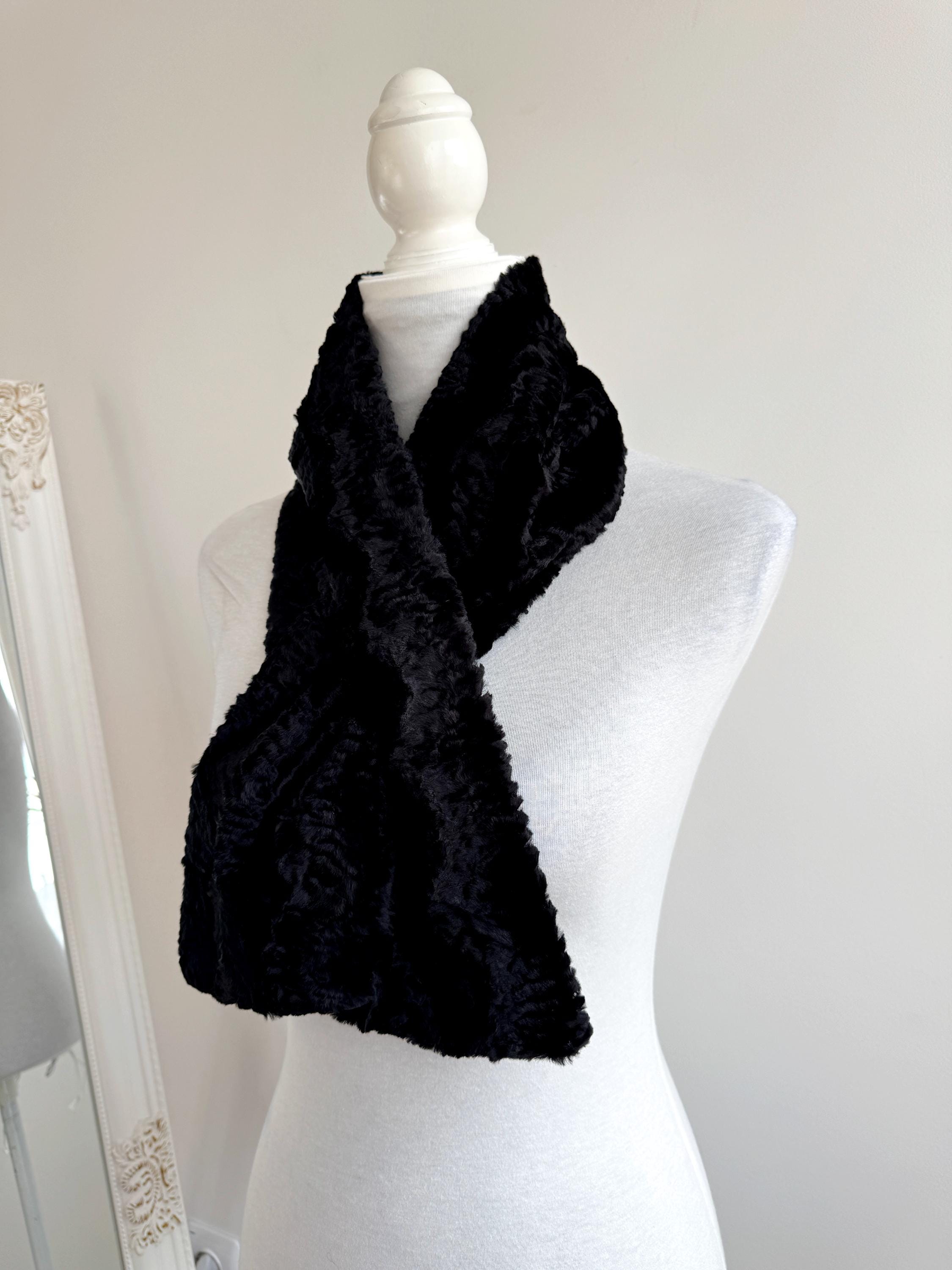 This elegant vintage black pull-through scarf is the perfect blend of sophisticated style and cozy warmth. Featuring a beautiful crushed velvet texture that mimics the look of high-end faux fur, it offers a plush, luxurious feel without the bulk. The clever "keyhole" or pull-through design ensures it stays perfectly in place, framing your neck beautifully whether you're wearing it with a tailored wool coat or an evening dress.