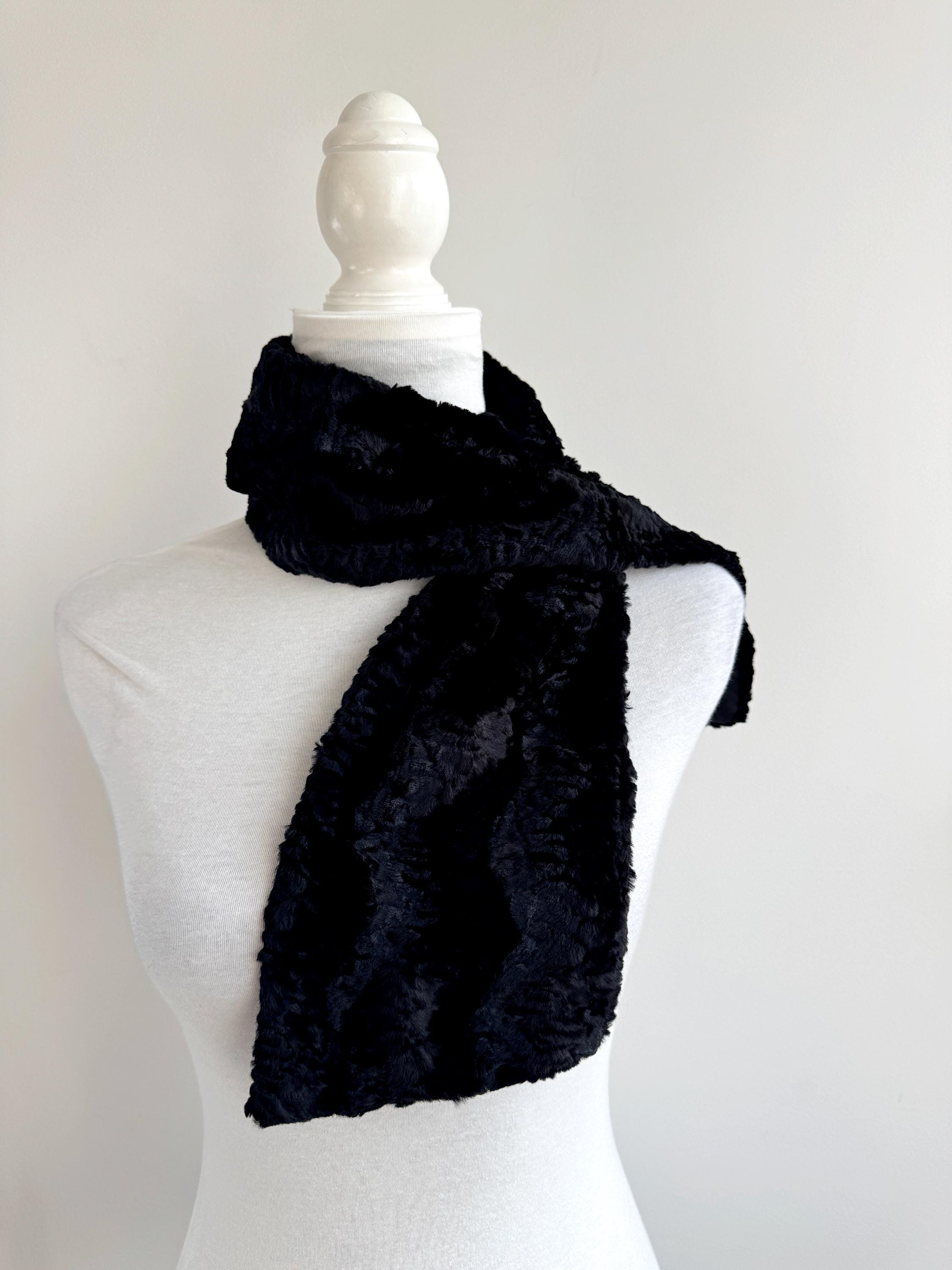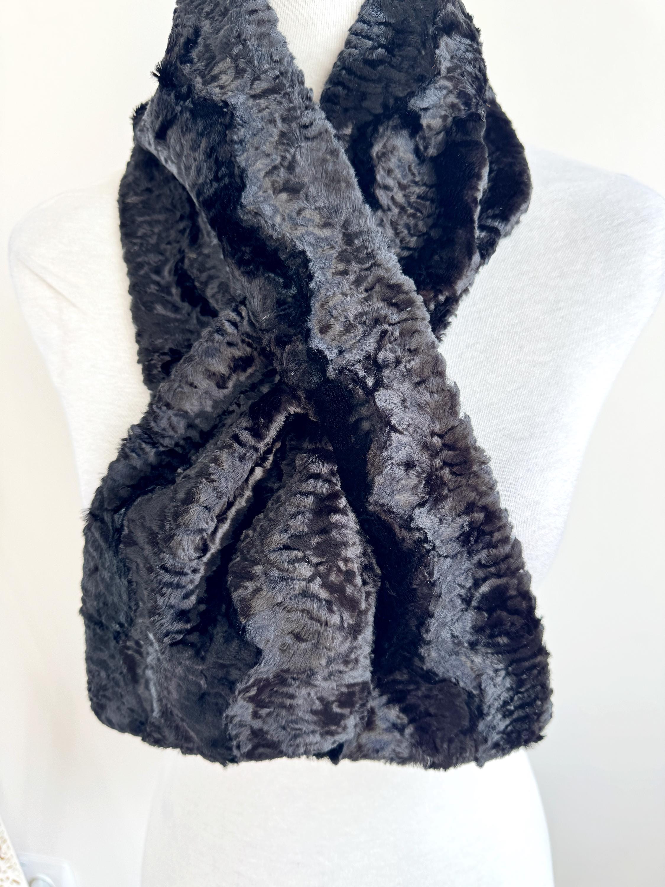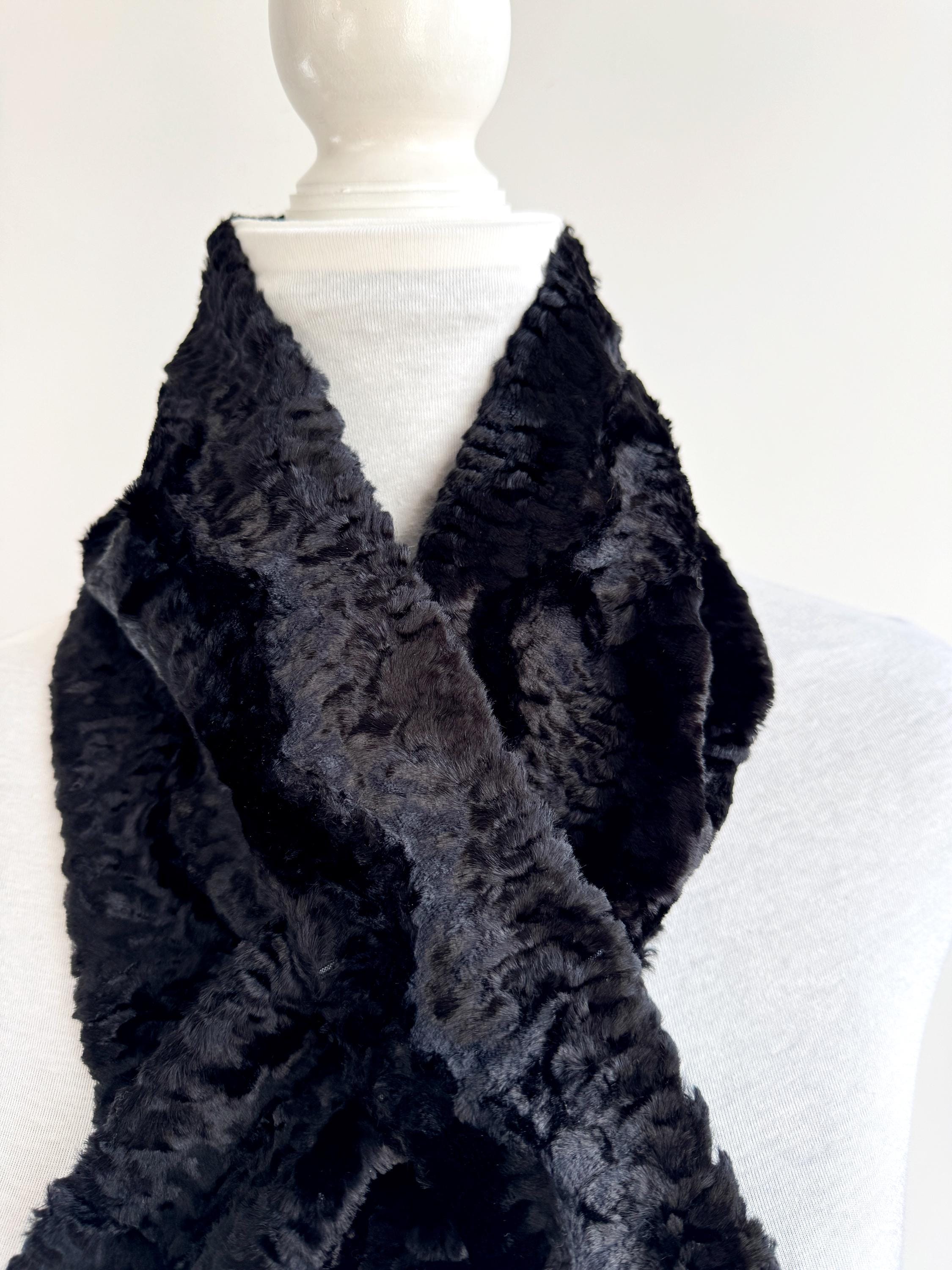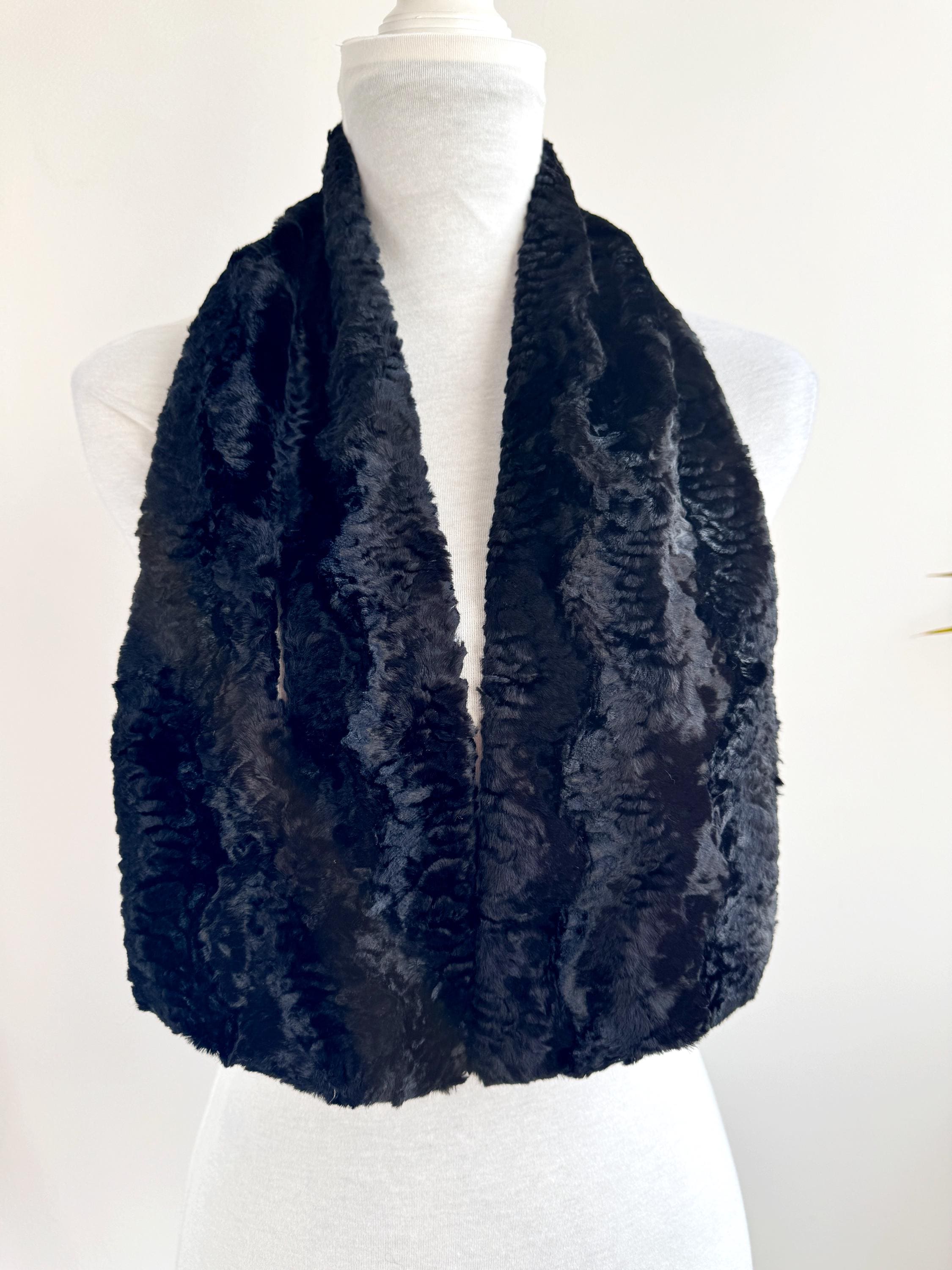 This elegant vintage black pull-through scarf is the perfect blend of sophisticated style and cozy warmth. Featuring a beautiful crushed velvet texture that mimics the look of high-end faux fur, it offers a plush, luxurious feel without the bulk. The clever "keyhole" or pull-through design ensures it stays perfectly in place, framing your neck beautifully whether you're wearing it with a tailored wool coat or an evening dress.