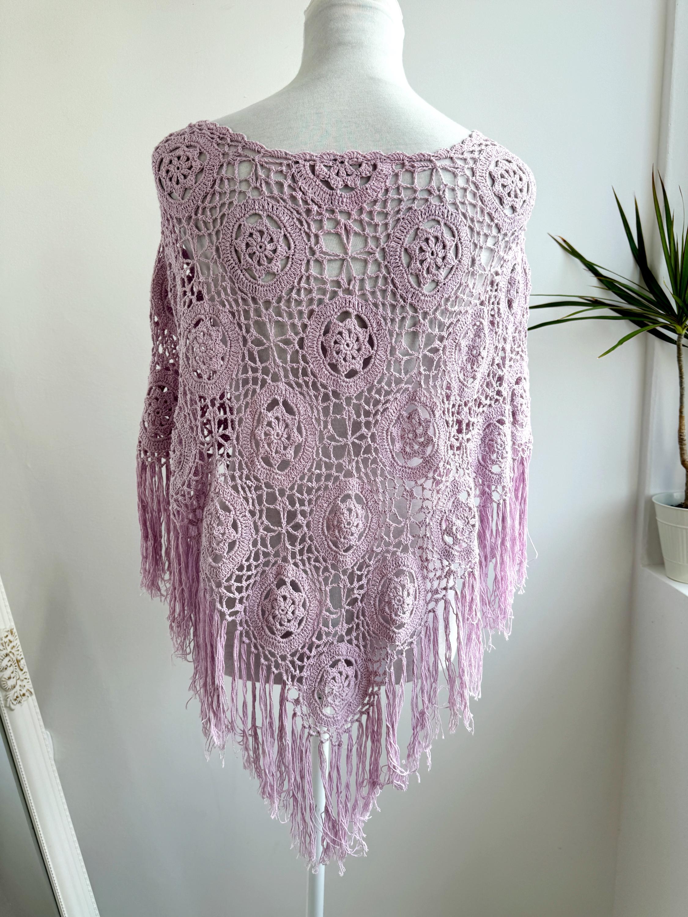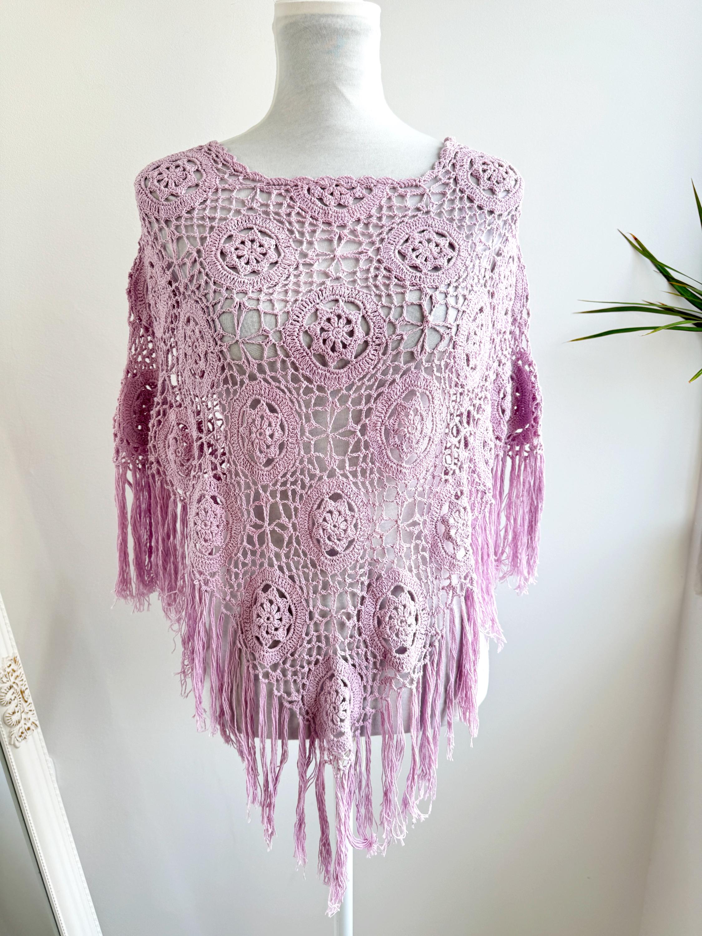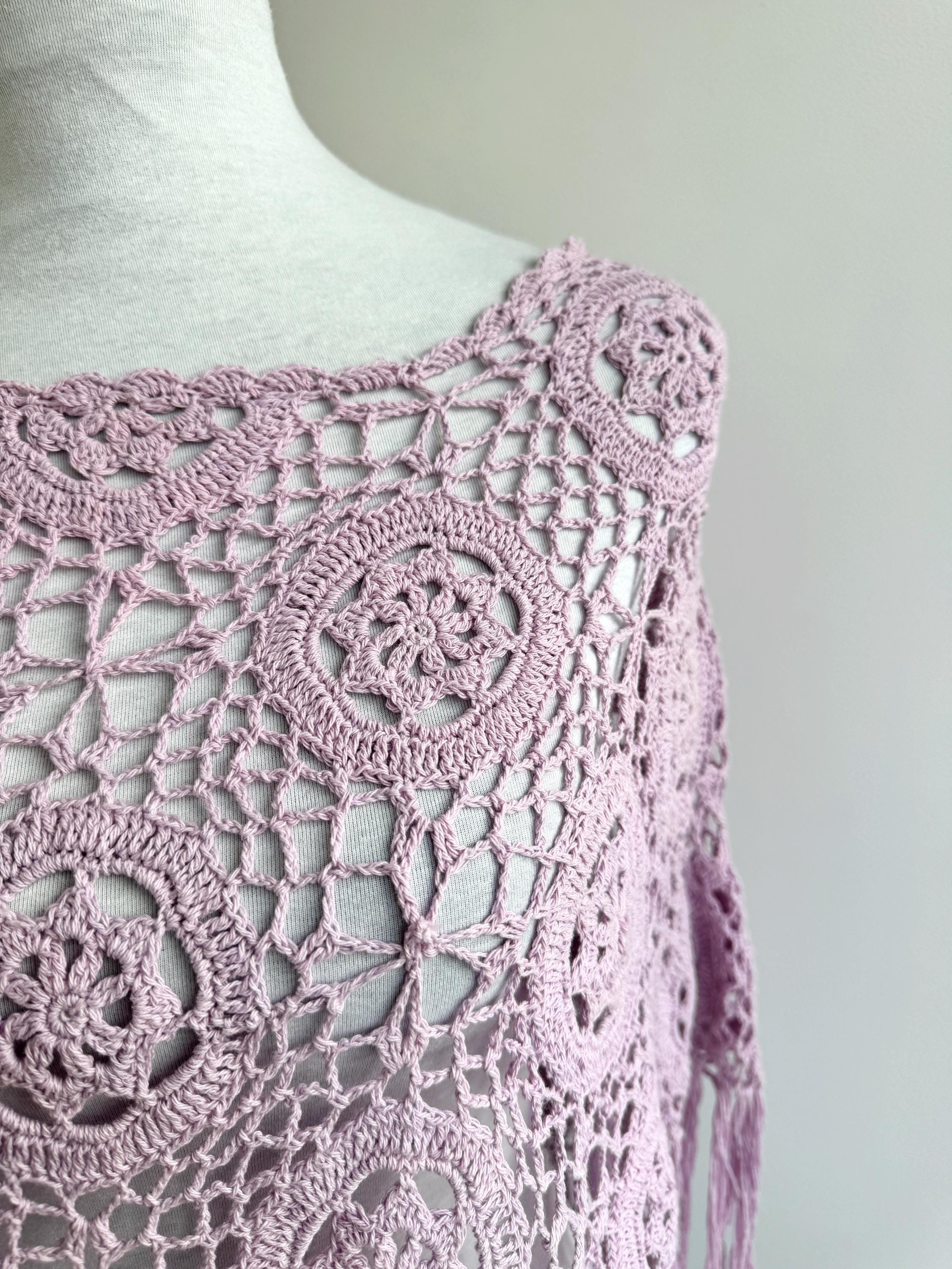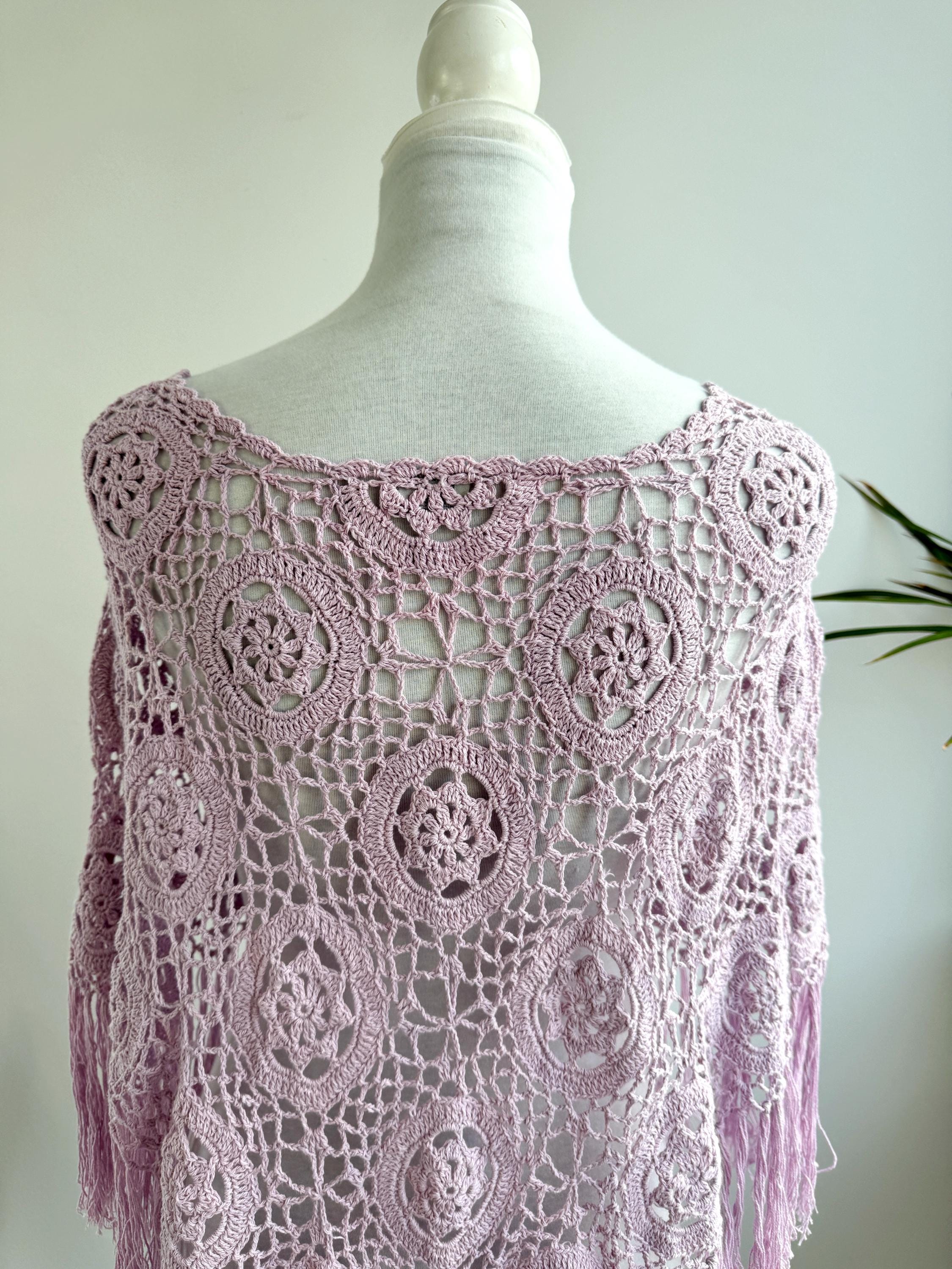 This is a vintage beautiful sheer crochet lace poncho with fringe in delicate soft lilac color. This light purple lace poncho has beautiful floral pattern and fringed detailing at the bottom. This sheer shoulder cover up is made of natural fabric which is made of 100% cotton. This cottagecore poncho top is ideal to wear over your bikini or as a light throw on top on your tank top or boho dress. You can also wear it in the spring/ fall season over a collared shirt or a turtleneck for a layered effect