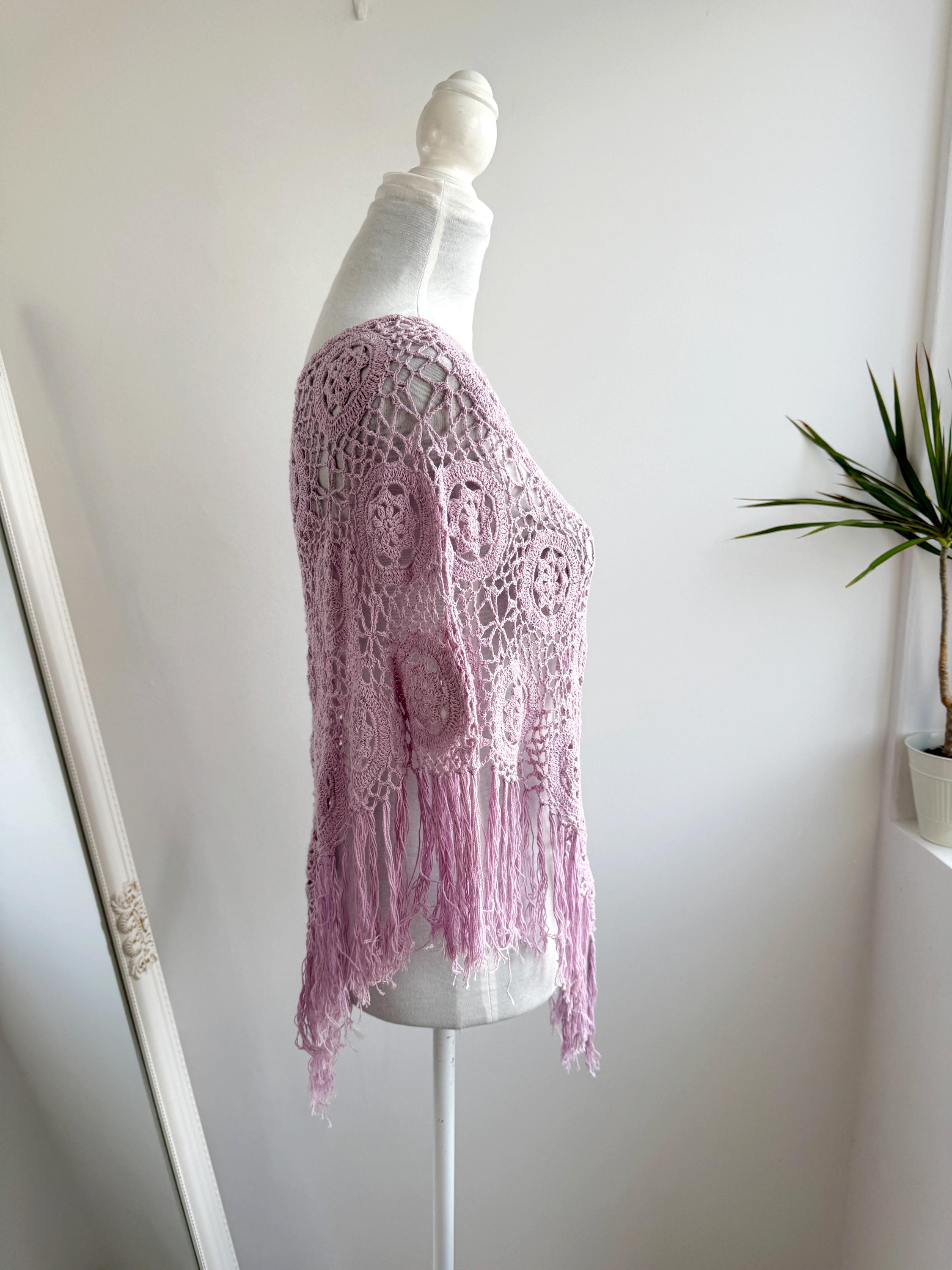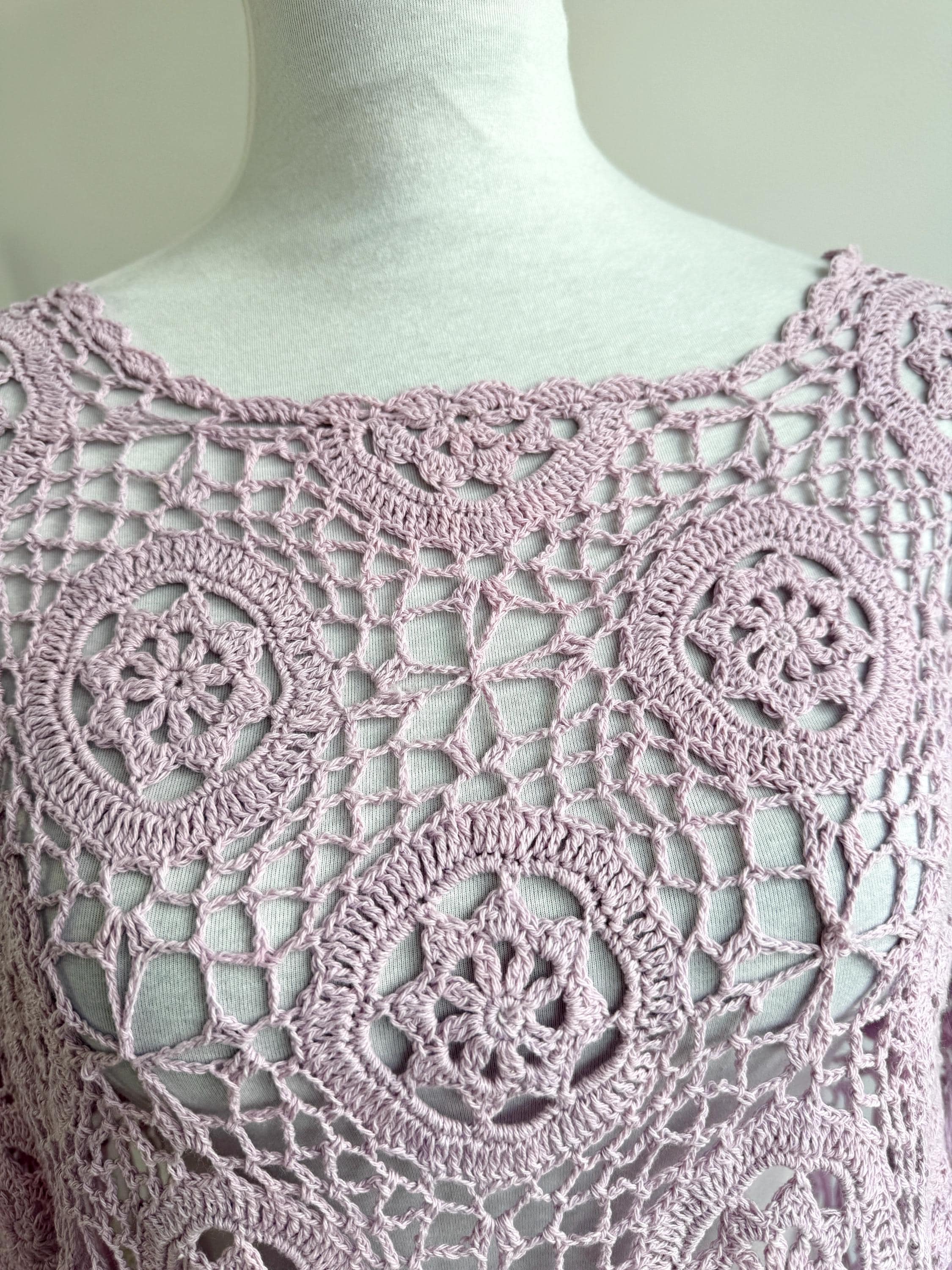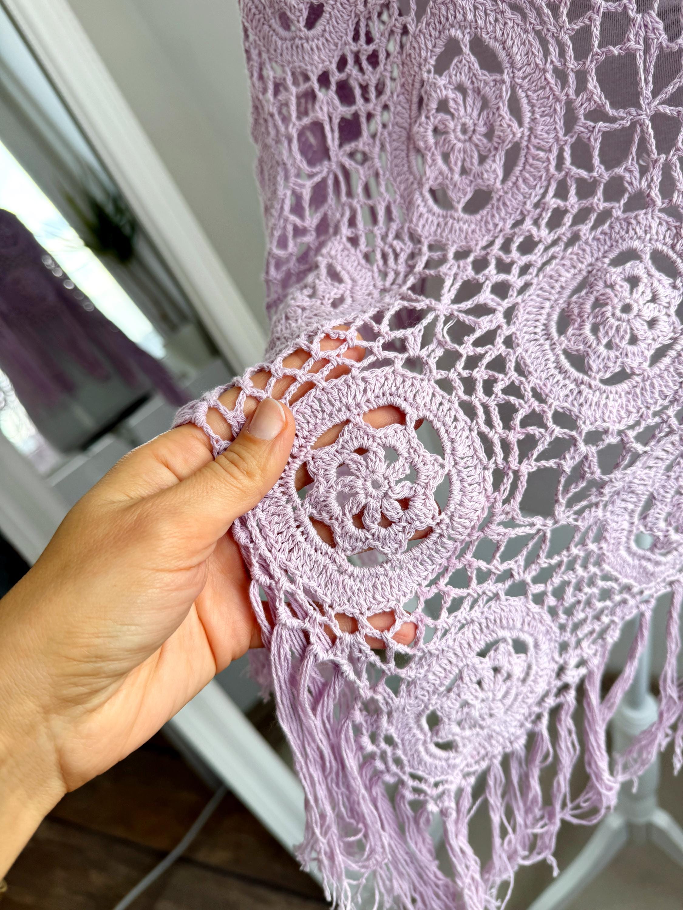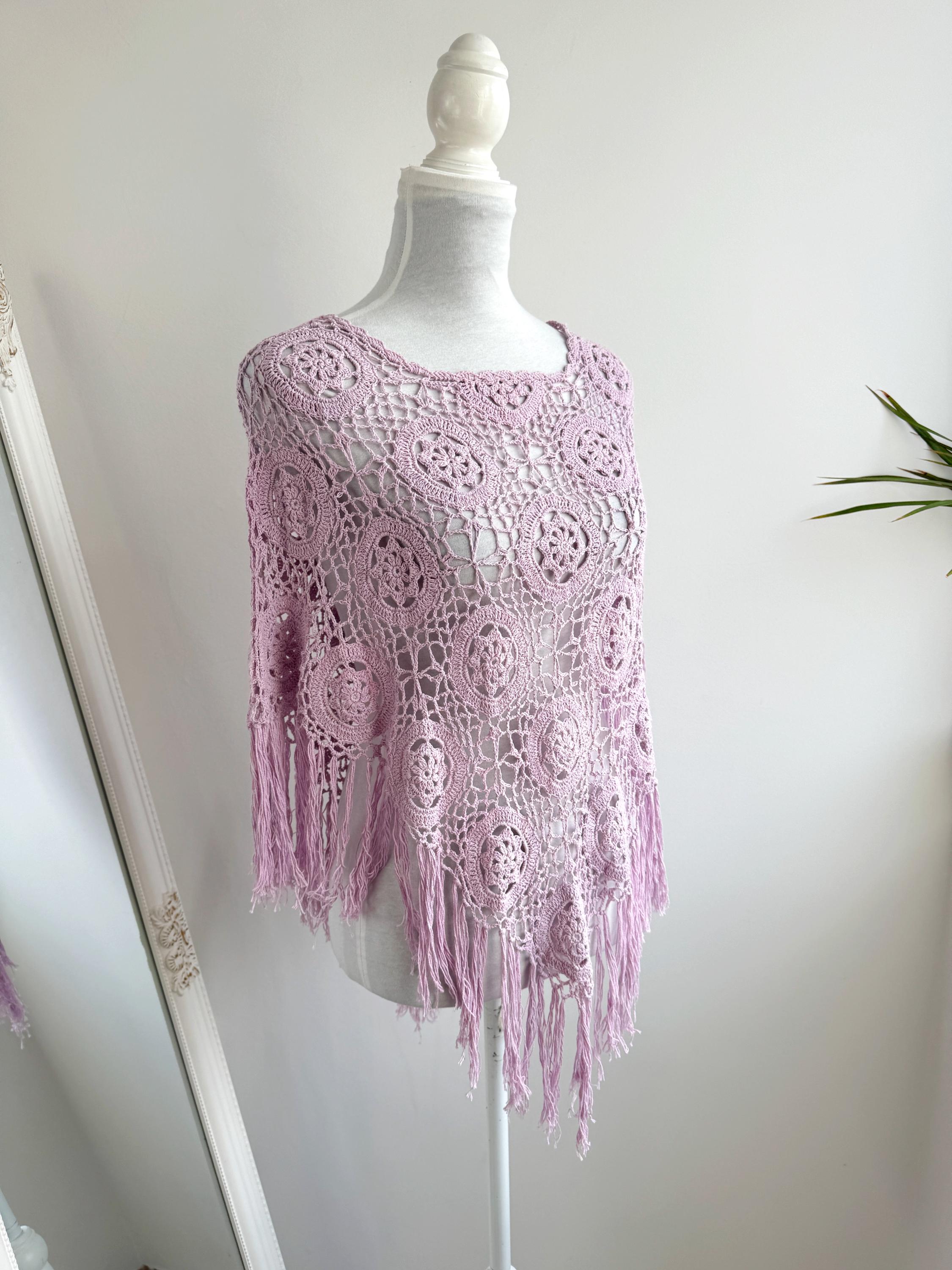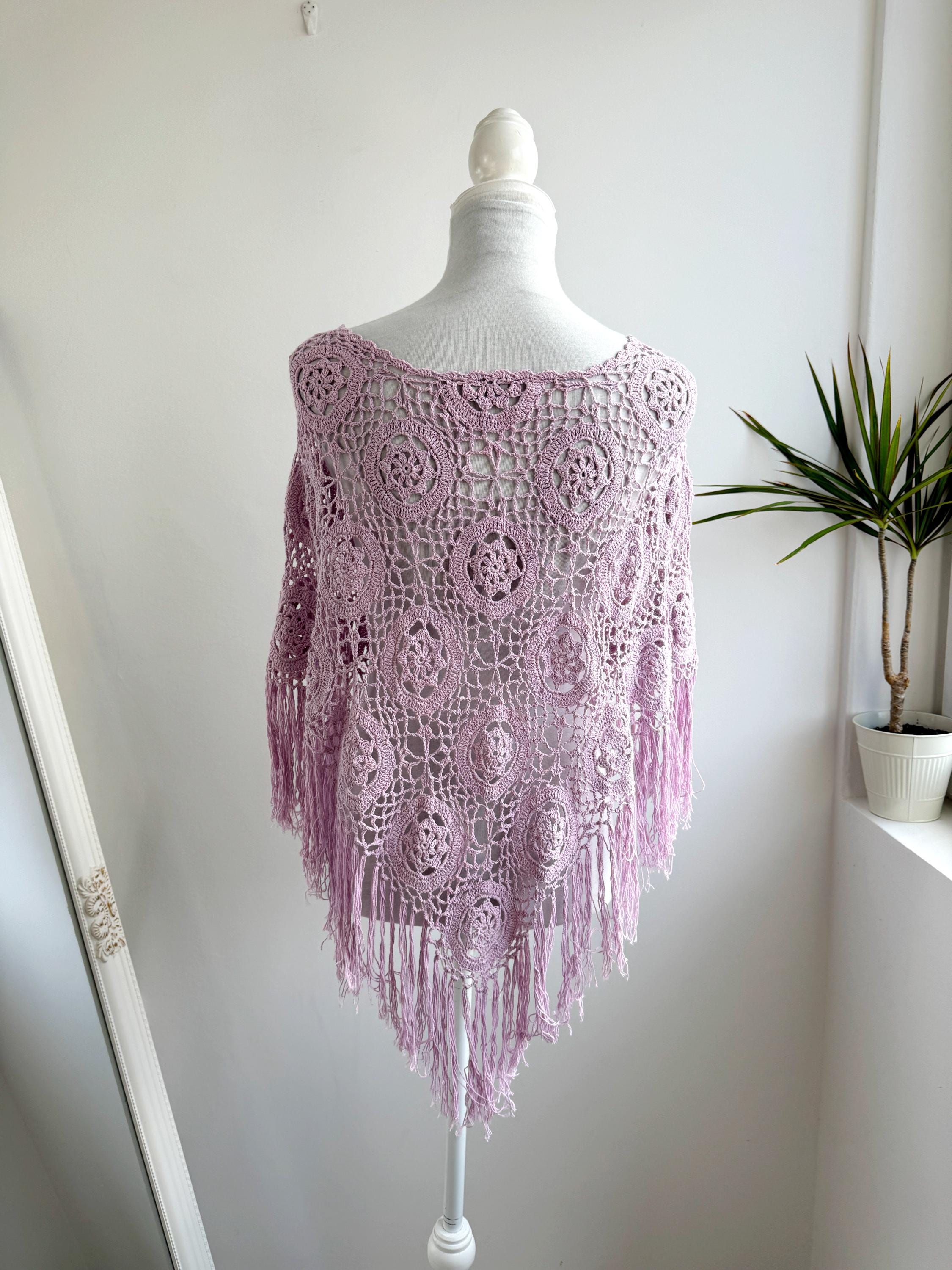 This is a vintage beautiful sheer crochet lace poncho with fringe in delicate soft lilac color. This light purple lace poncho has beautiful floral pattern and fringed detailing at the bottom. This sheer shoulder cover up is made of natural fabric which is made of 100% cotton. This cottagecore poncho top is ideal to wear over your bikini or as a light throw on top on your tank top or boho dress. You can also wear it in the spring/ fall season over a collared shirt or a turtleneck for a layered effect