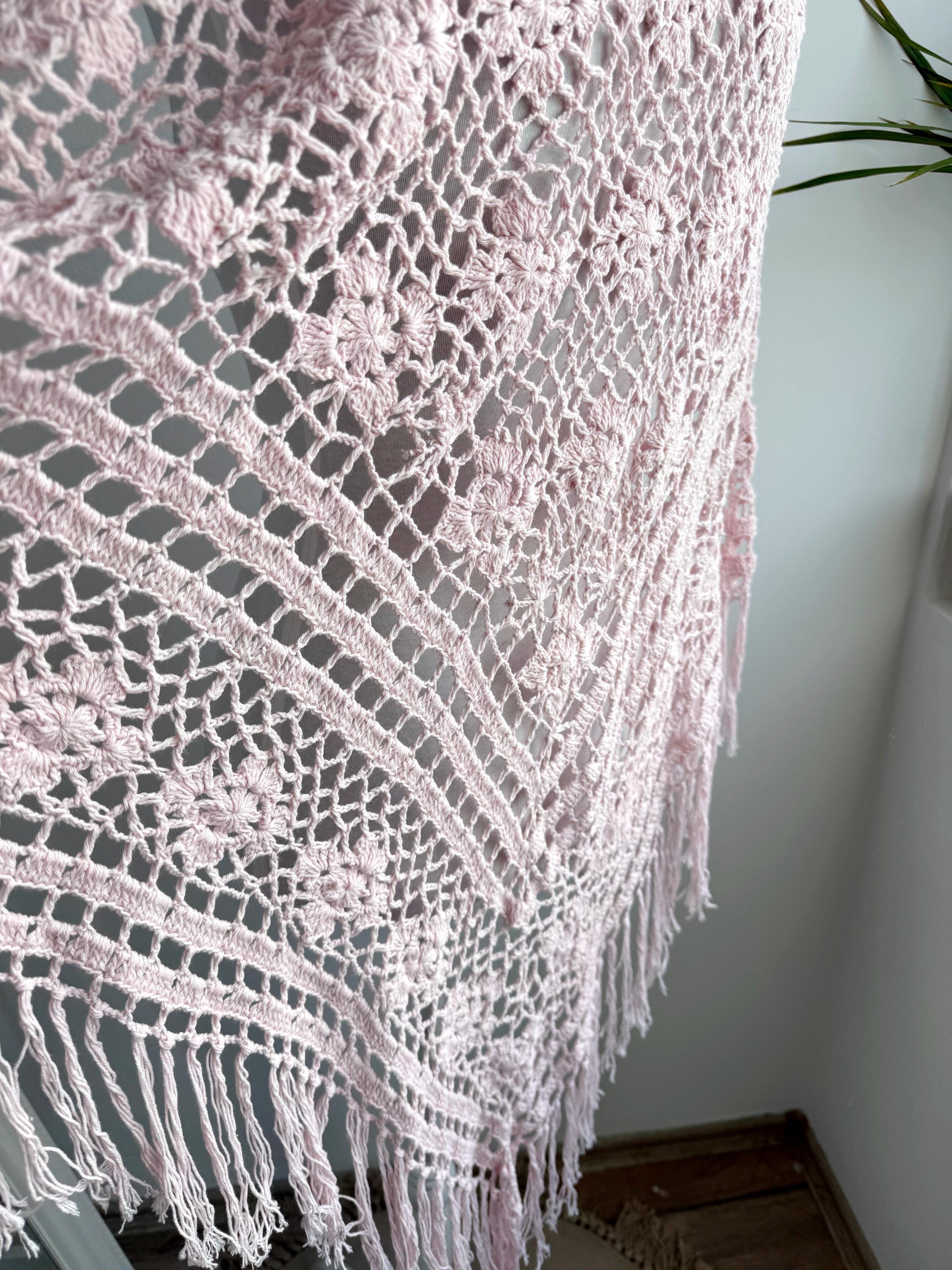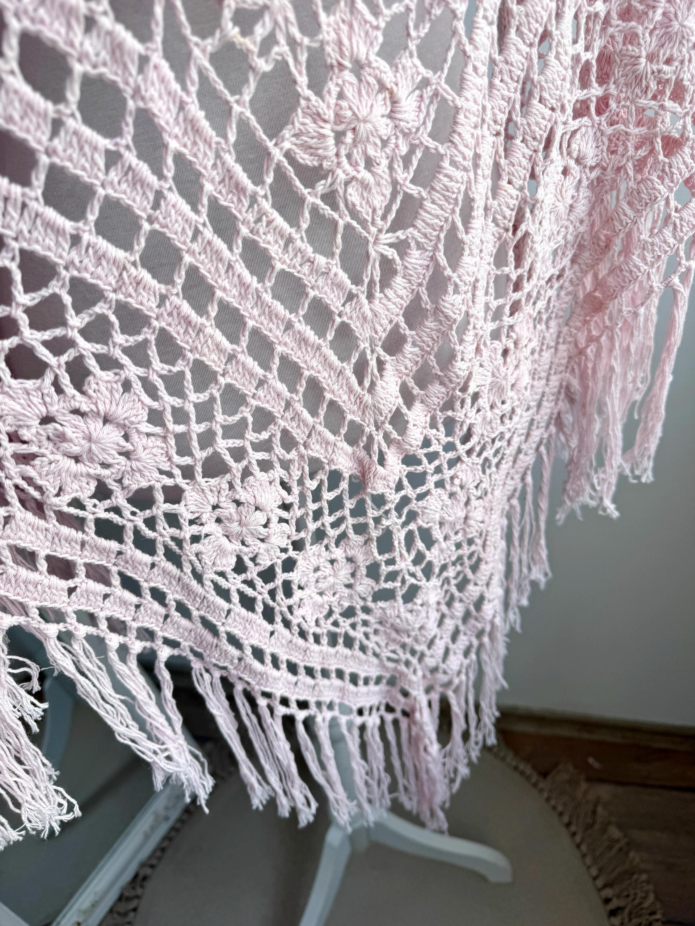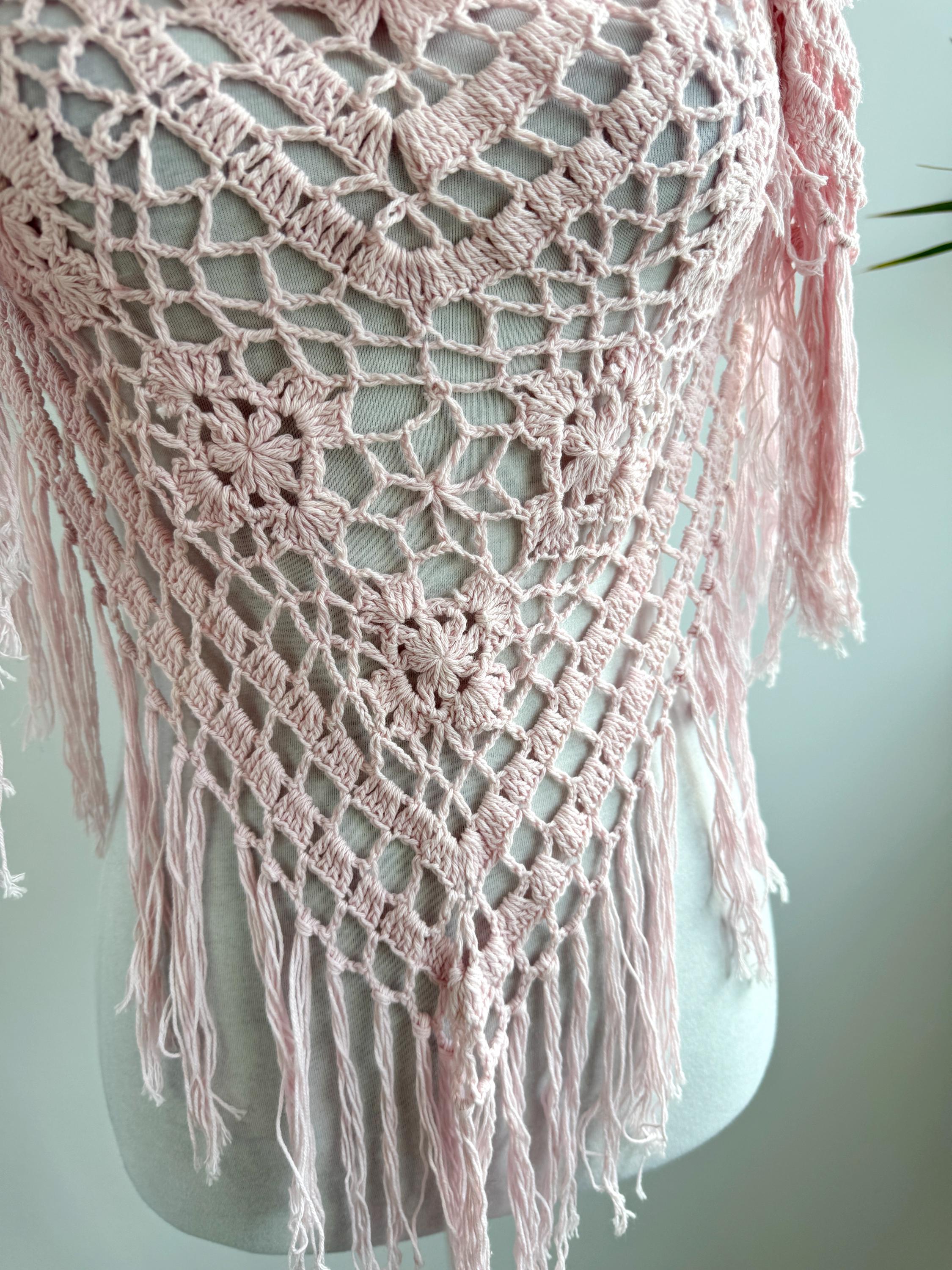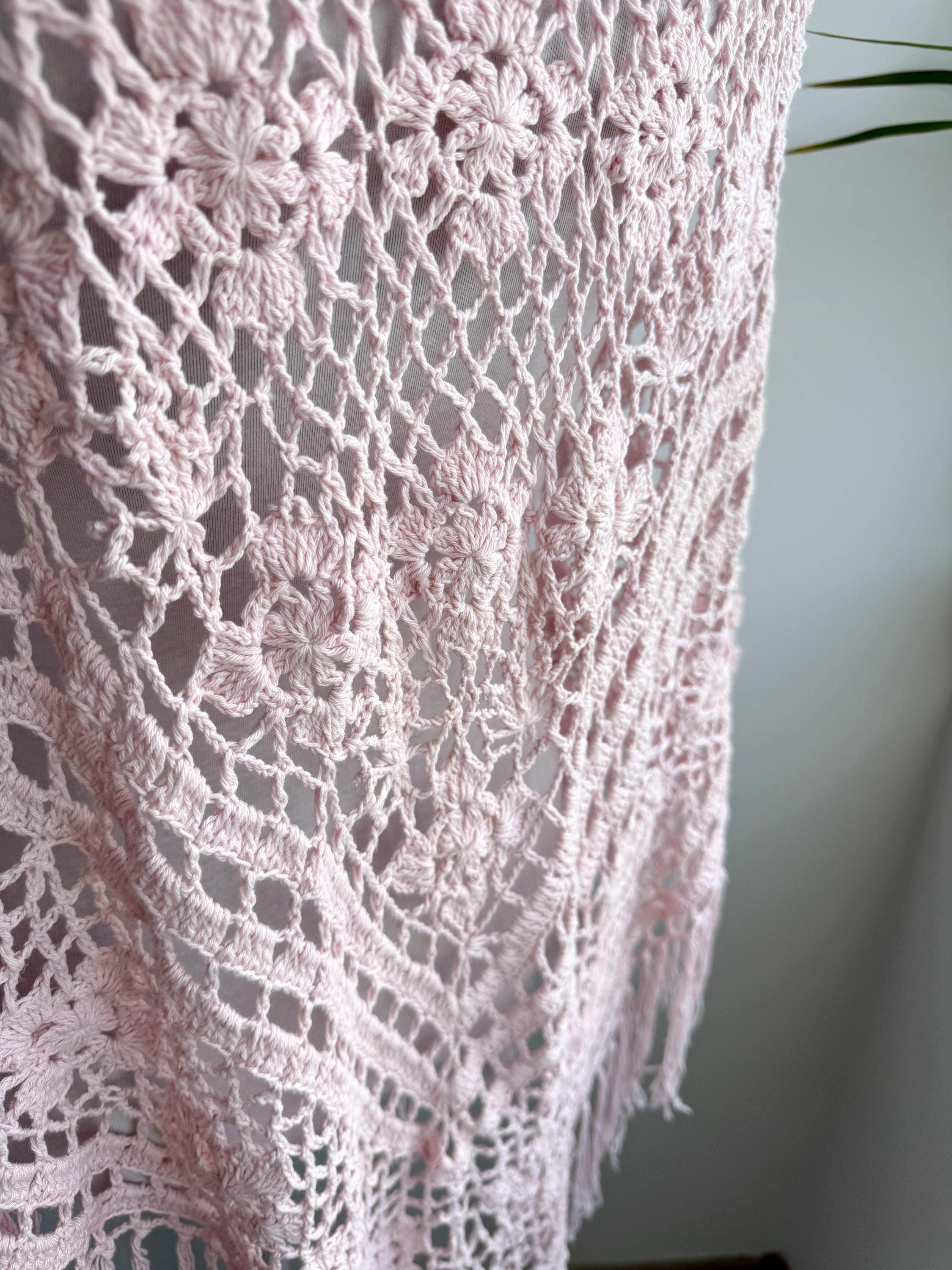 This delicate, dusty pink crochet shawl is a beautiful find from the Swedish brand Lindex. Crafted from 100% cotton, this lace crochet shawl features an intricate series of floral and star-shaped crochet motifs that create a lightweight, breathable, and highly textured lace effect. The classic triangle shape and generous fringe add a rhythmic movement to this grannycore wrap, making it a perfect layer for bohemian, cottagecore, or romantic retro-inspired outfits.