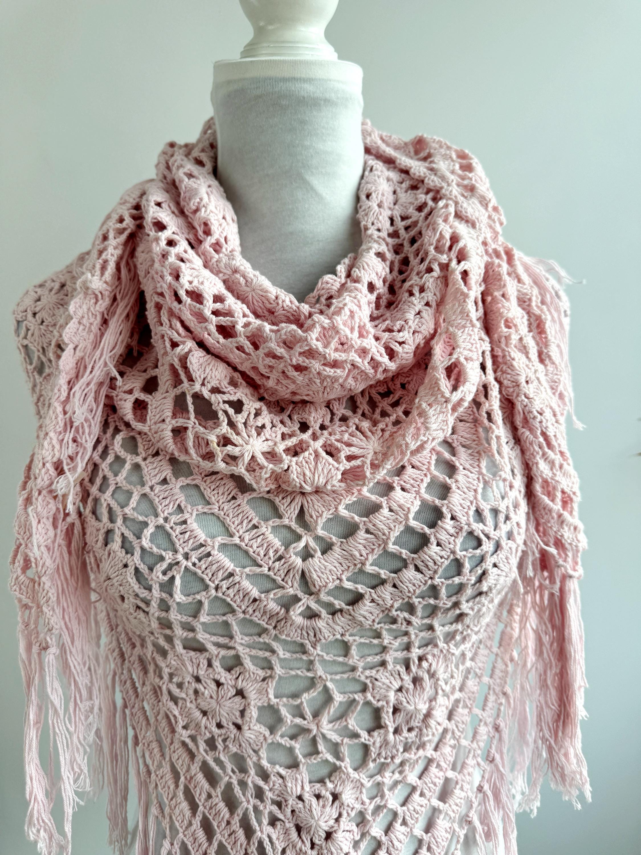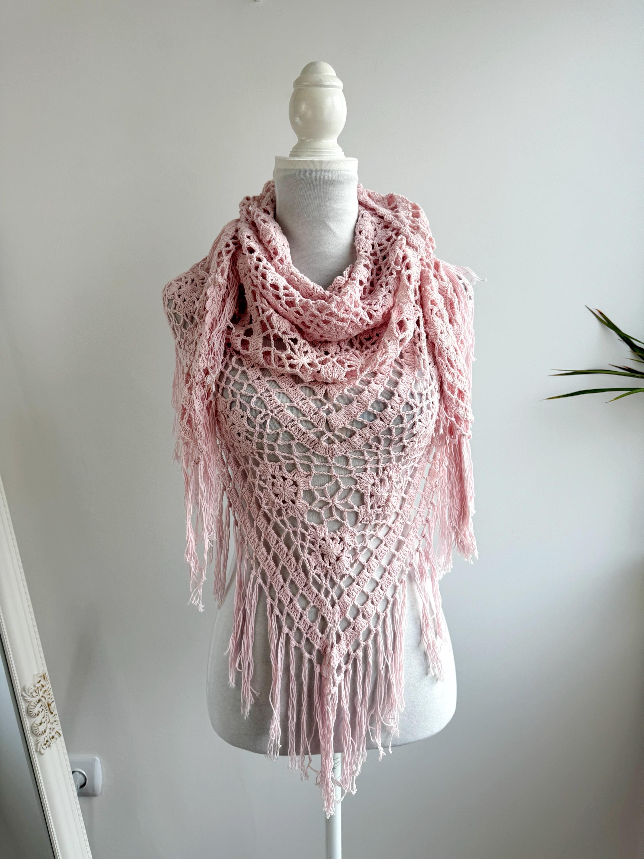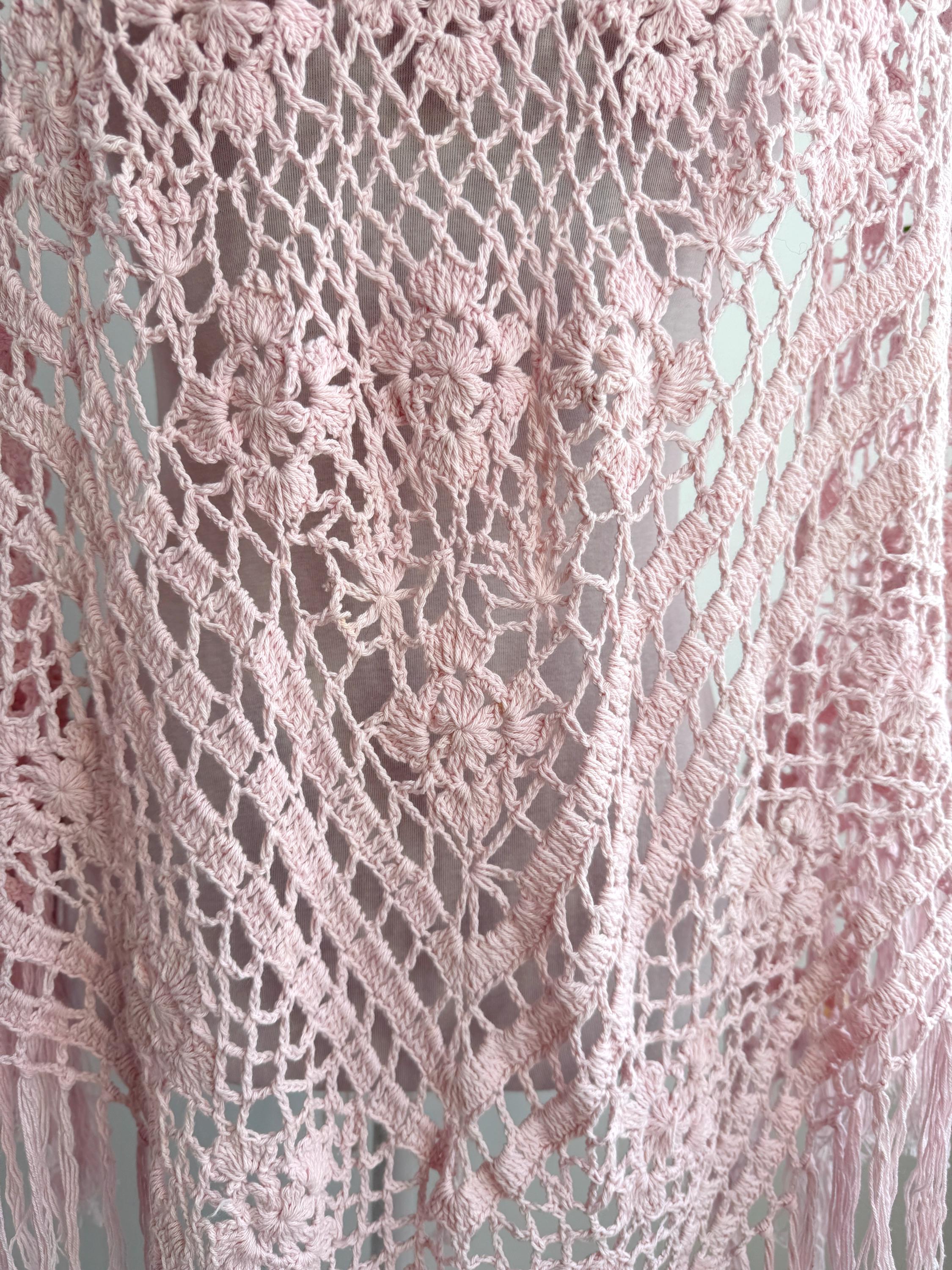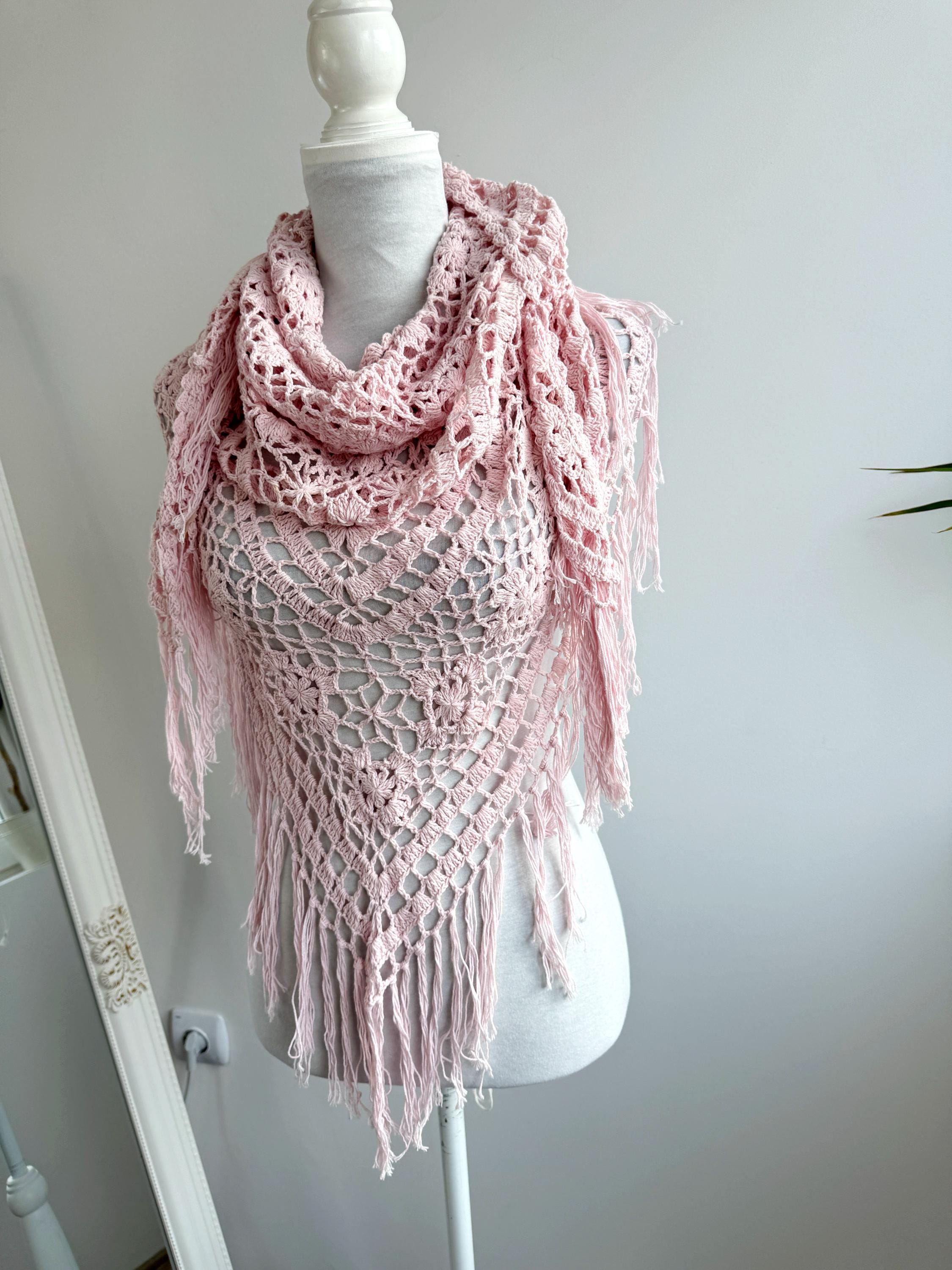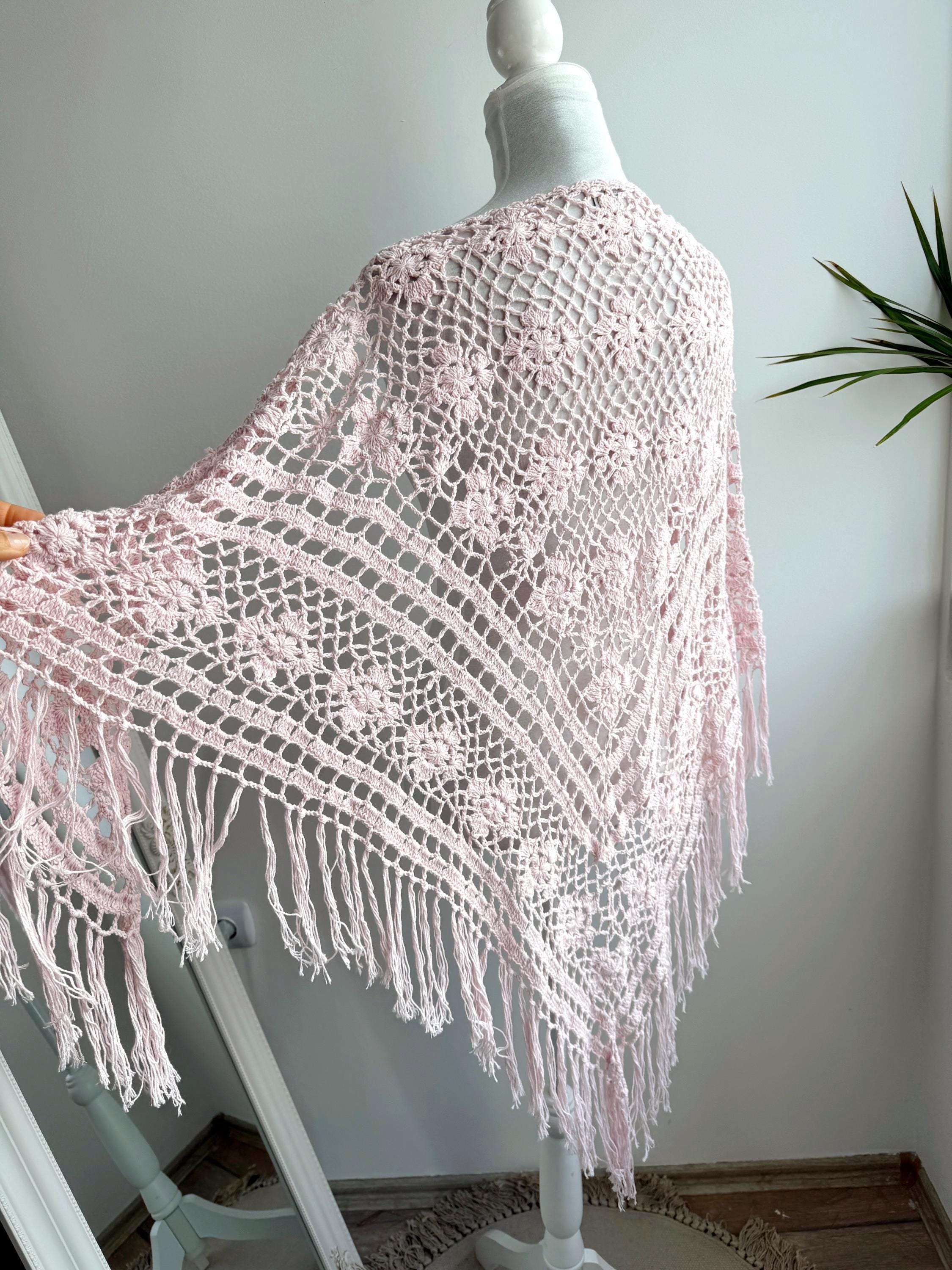 This delicate, dusty pink crochet shawl is a beautiful find from the Swedish brand Lindex. Crafted from 100% cotton, this lace crochet shawl features an intricate series of floral and star-shaped crochet motifs that create a lightweight, breathable, and highly textured lace effect. The classic triangle shape and generous fringe add a rhythmic movement to this grannycore wrap, making it a perfect layer for bohemian, cottagecore, or romantic retro-inspired outfits.