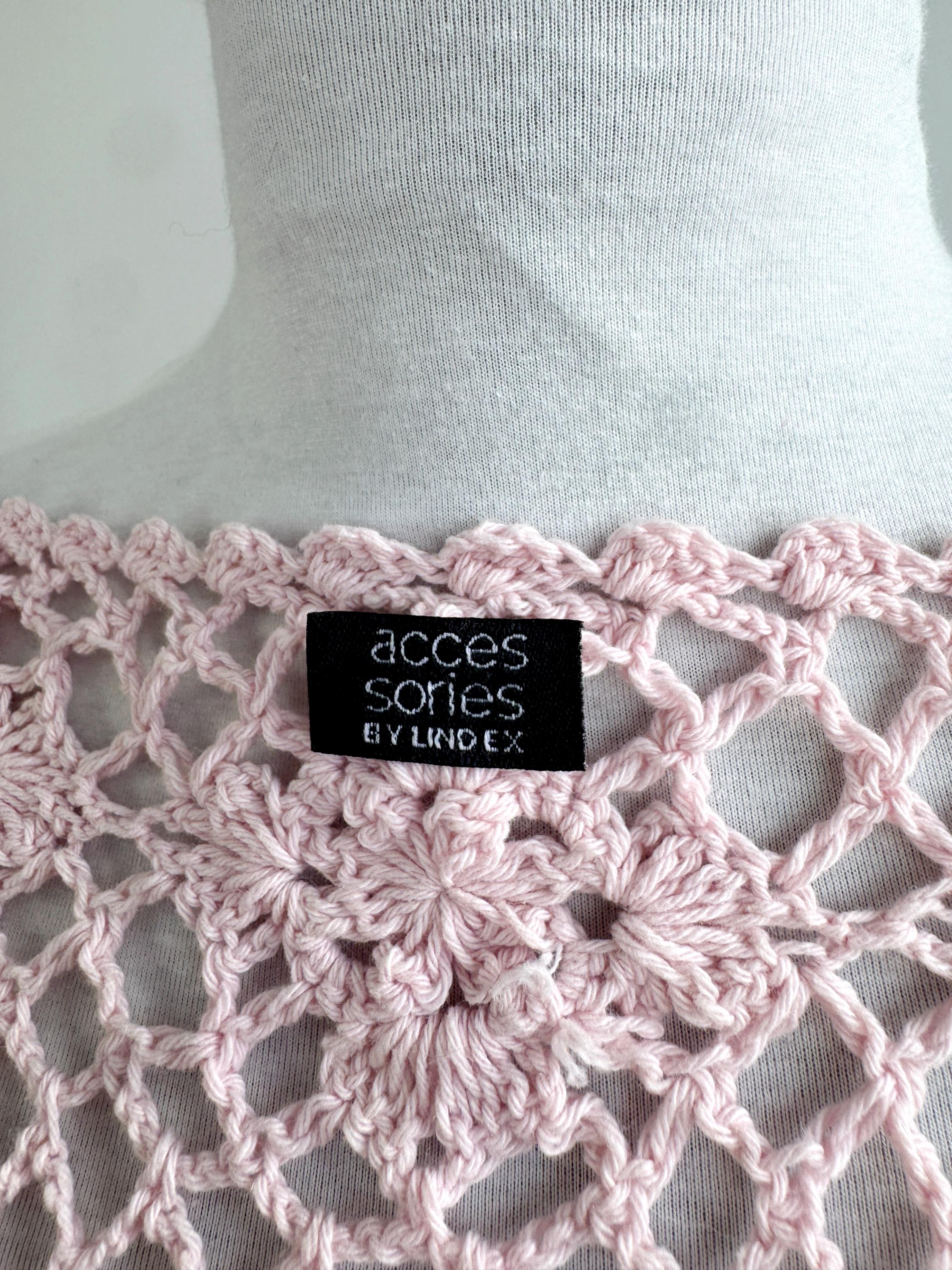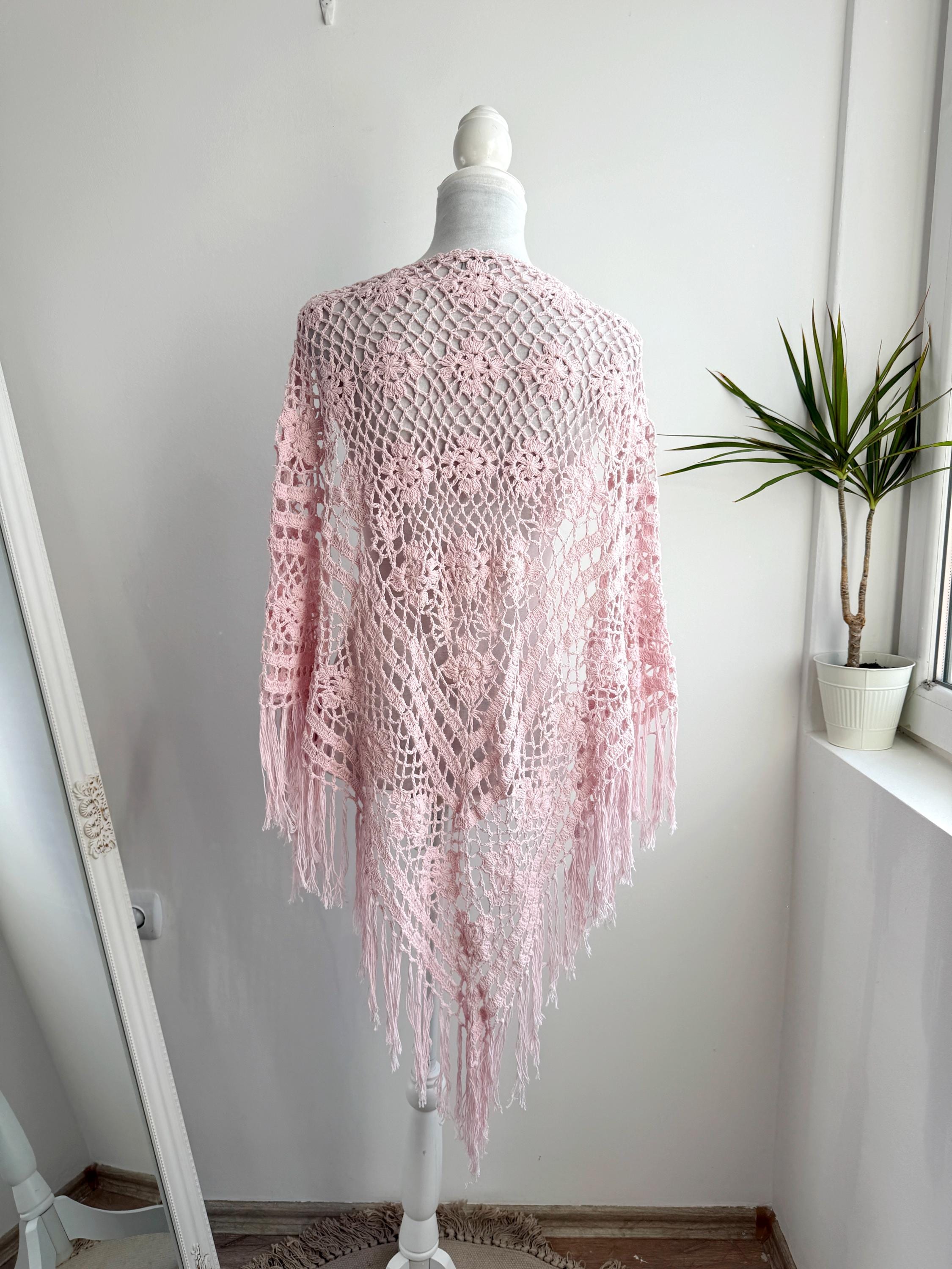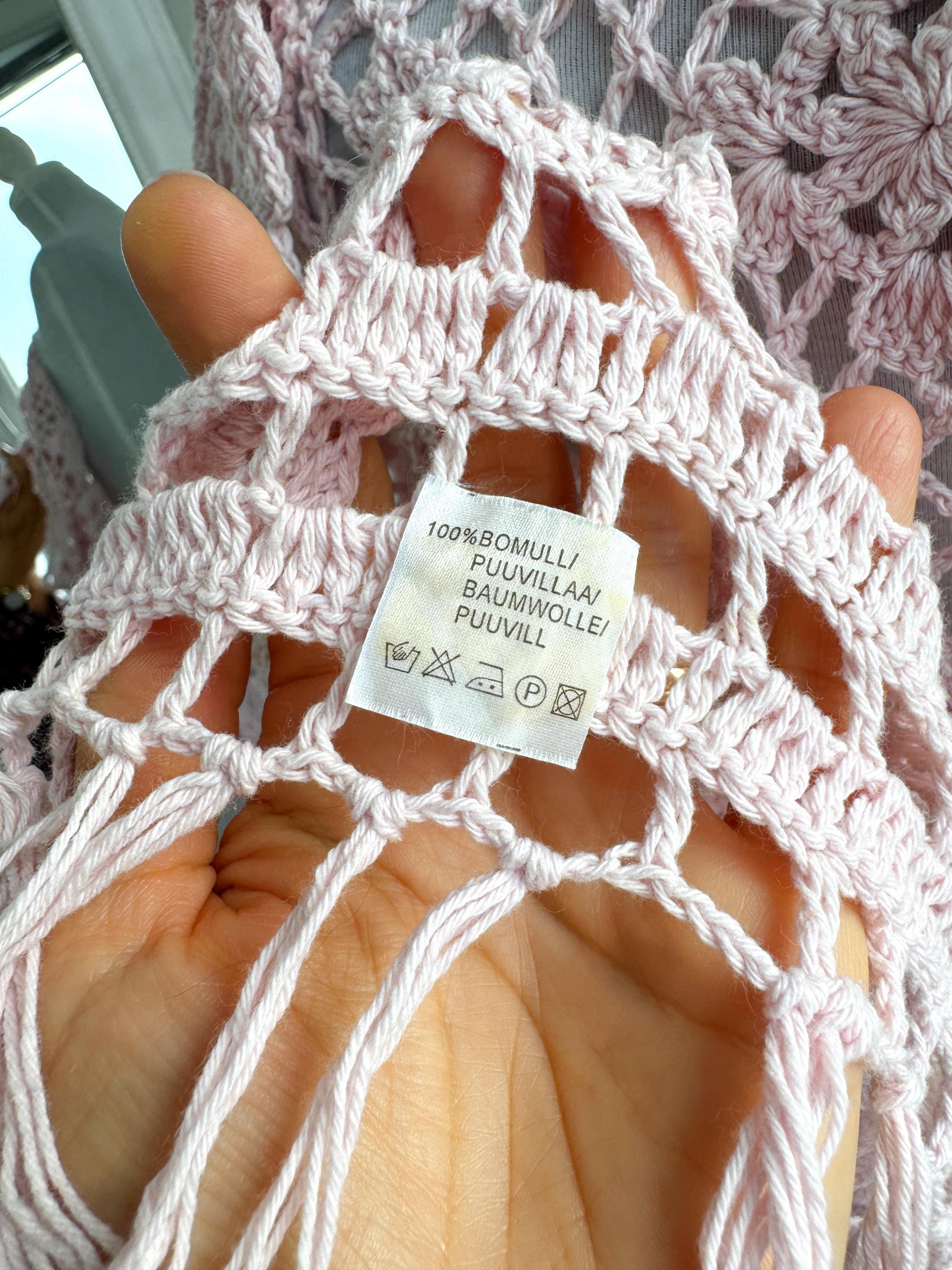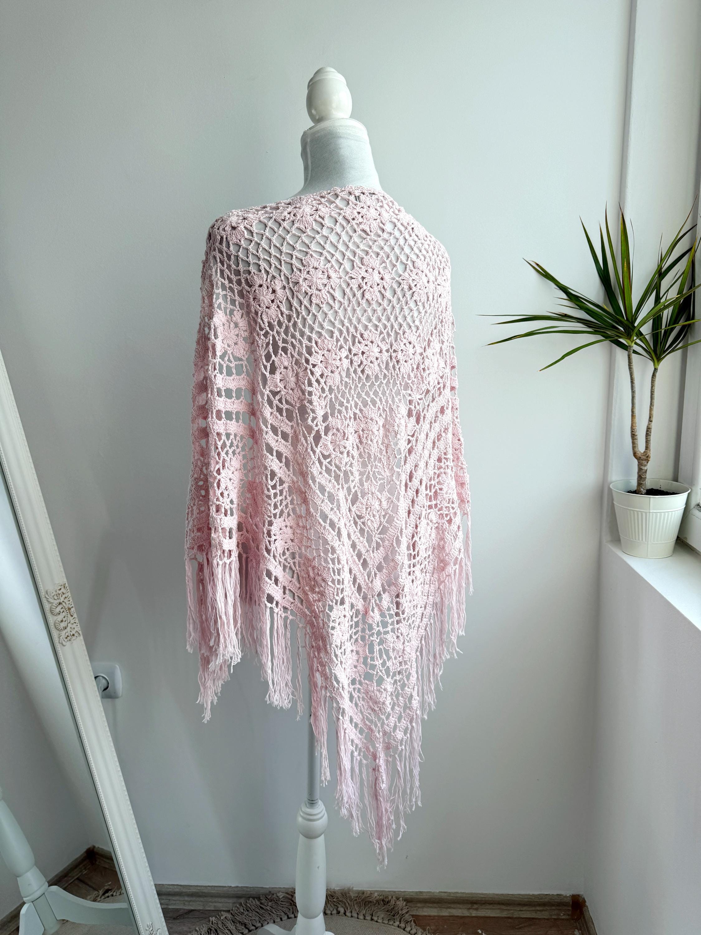 This delicate, dusty pink crochet shawl is a beautiful find from the Swedish brand Lindex. Crafted from 100% cotton, this lace crochet shawl features an intricate series of floral and star-shaped crochet motifs that create a lightweight, breathable, and highly textured lace effect. The classic triangle shape and generous fringe add a rhythmic movement to this grannycore wrap, making it a perfect layer for bohemian, cottagecore, or romantic retro-inspired outfits.