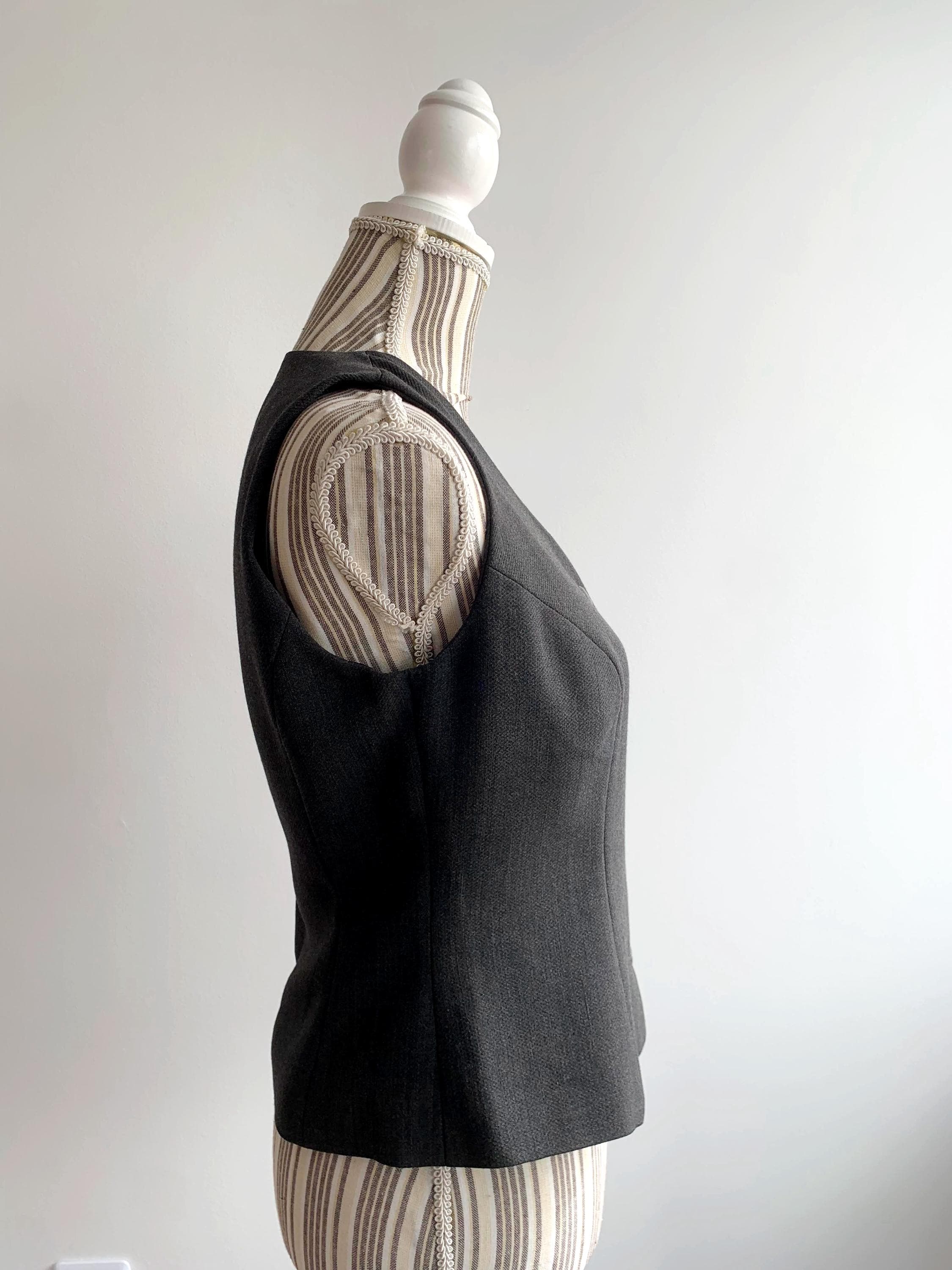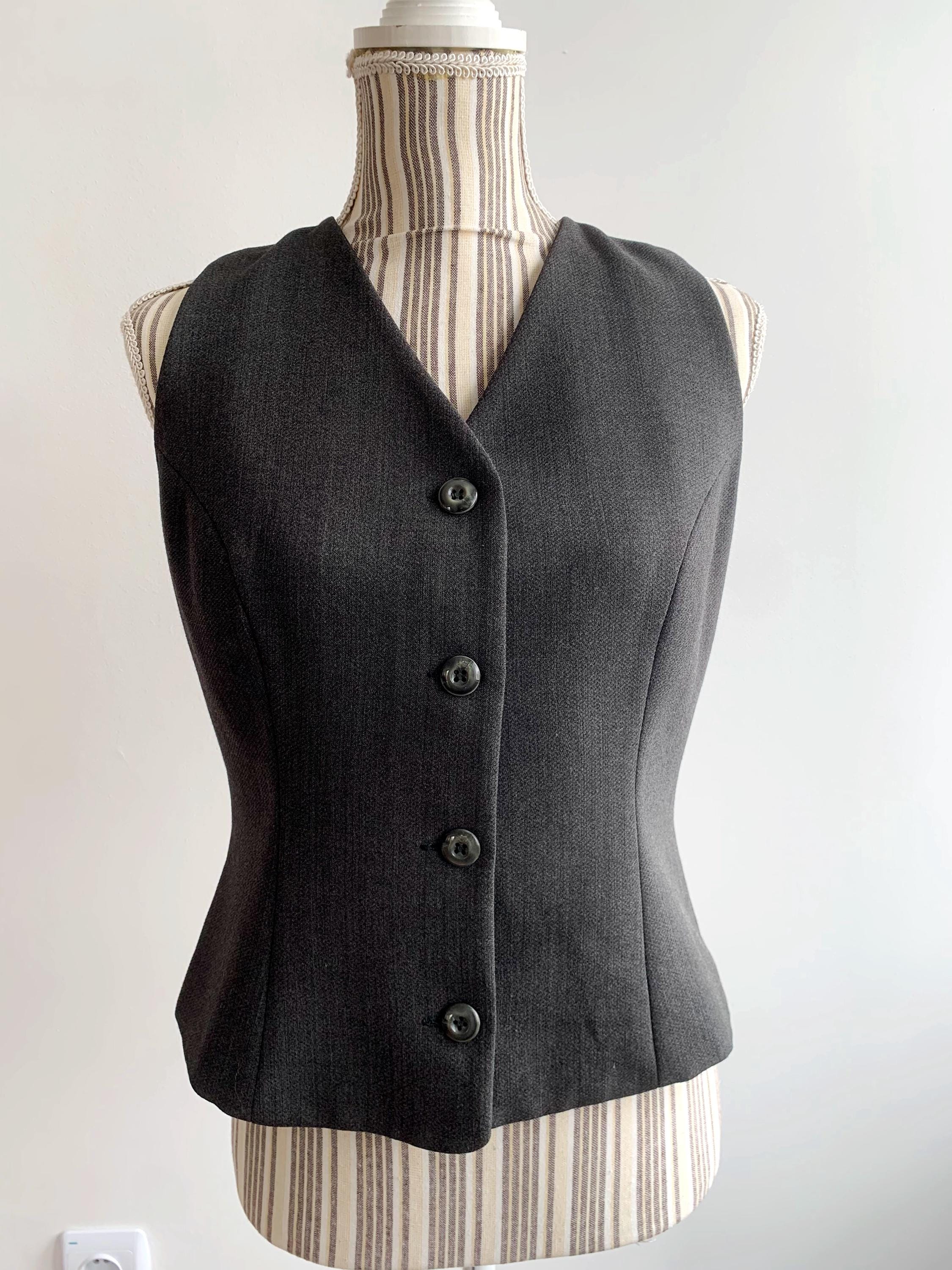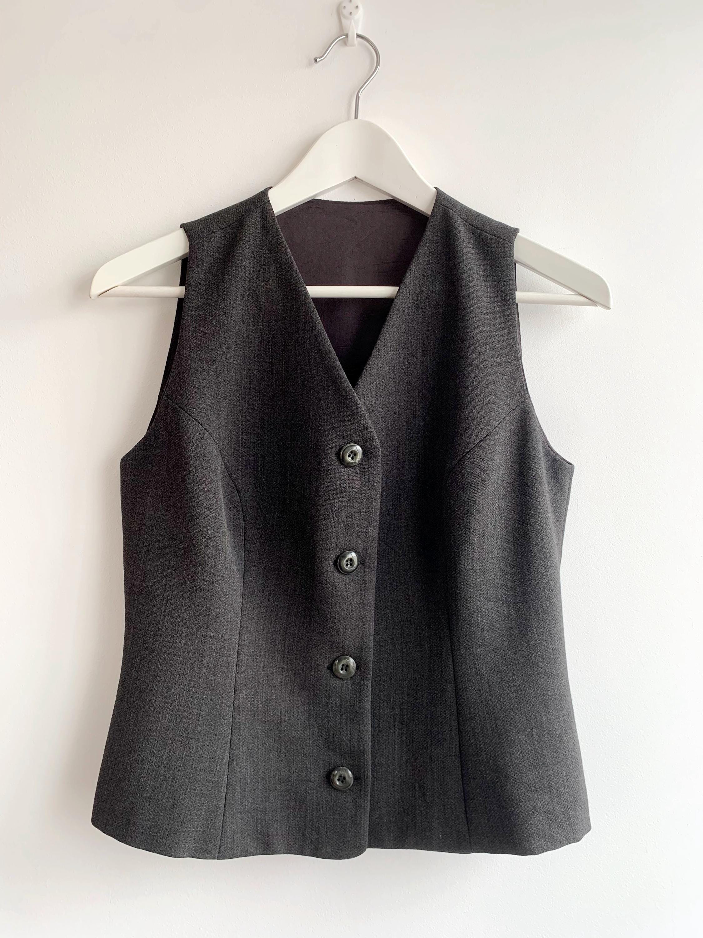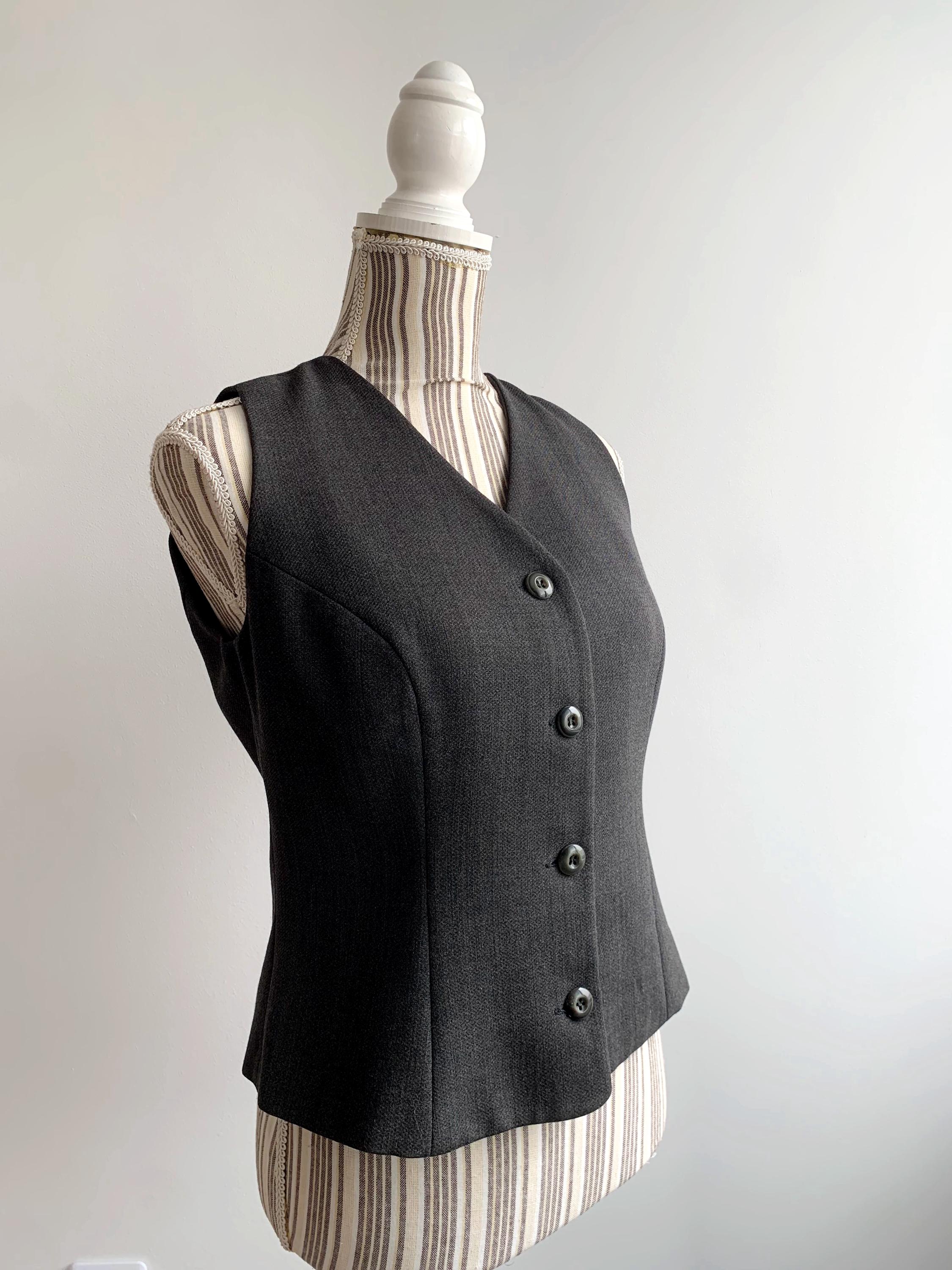 This sophisticated vintage Italian wool vest is the ultimate versatile layering piece for your wardrobe. Expertly tailored with a sleek, minimalist silhouette, this charcoal grey waistcoat effortlessly bridges the gap between 90s office chic and modern dark academia aesthetics. The high-quality wool-viscose blend provides a refined texture and a comfortable drape, making it perfect for pairing with a crisp white shirt, a silk blouse, or even wearing solo for a bold, sleeveless look.