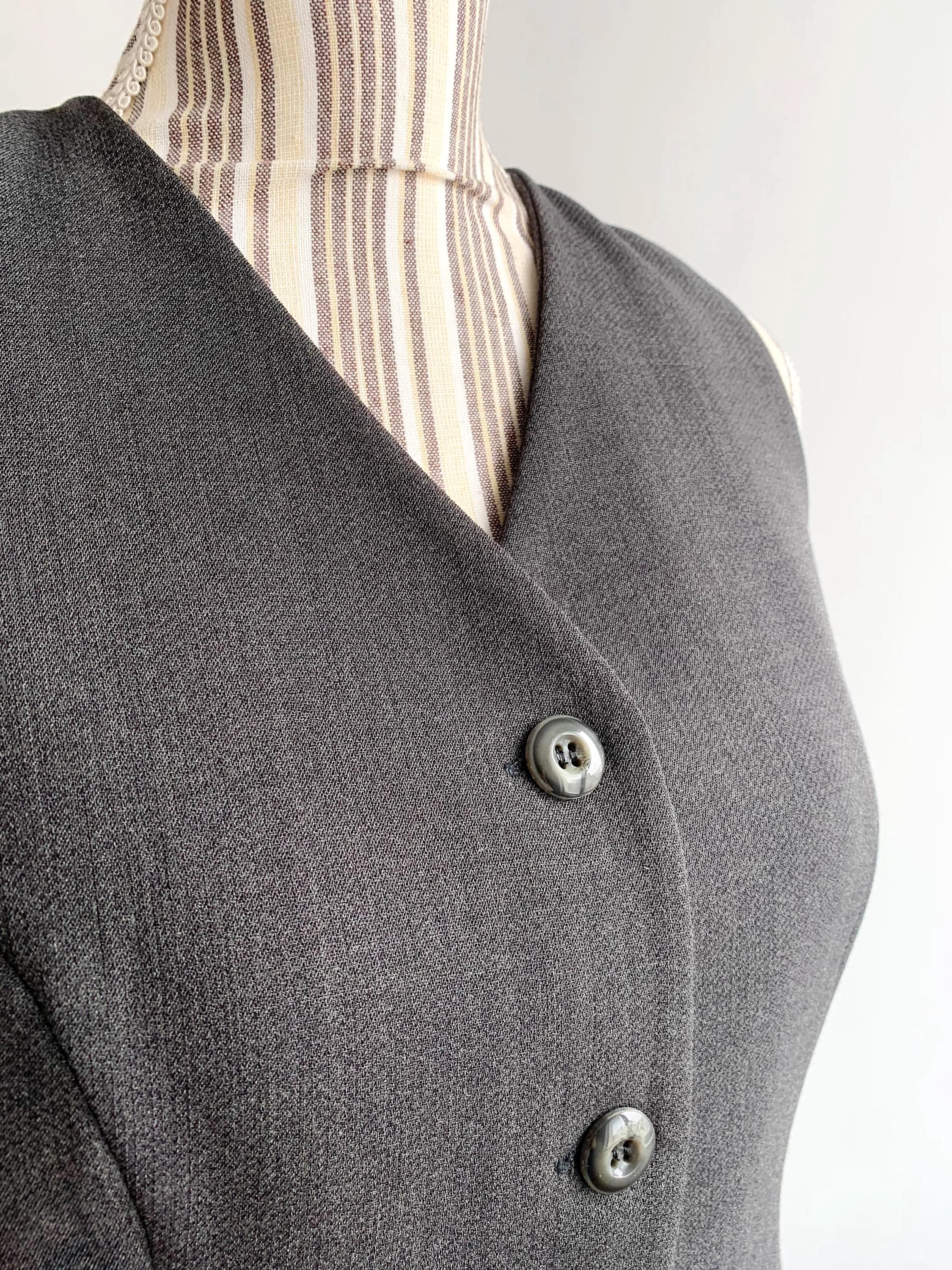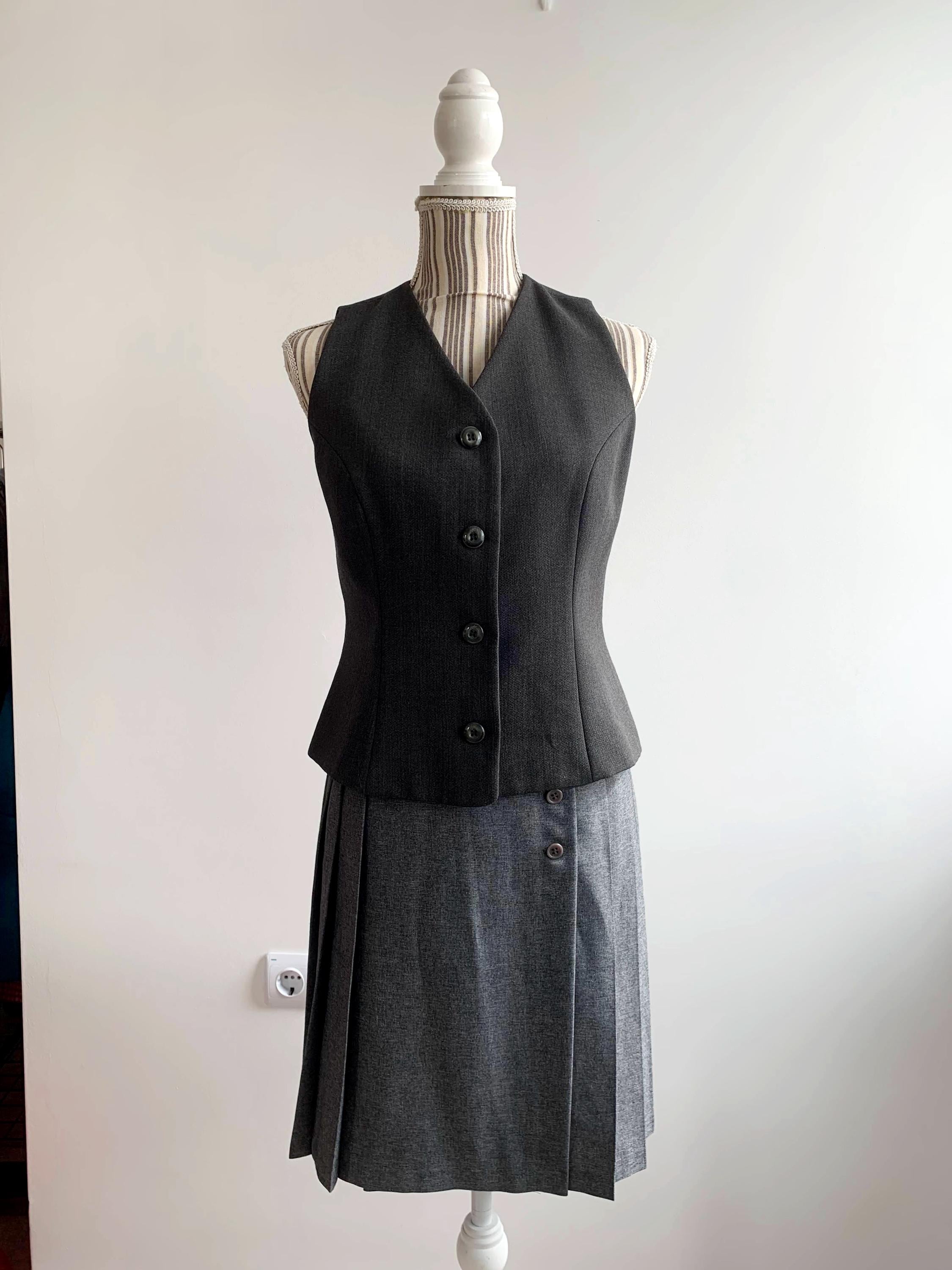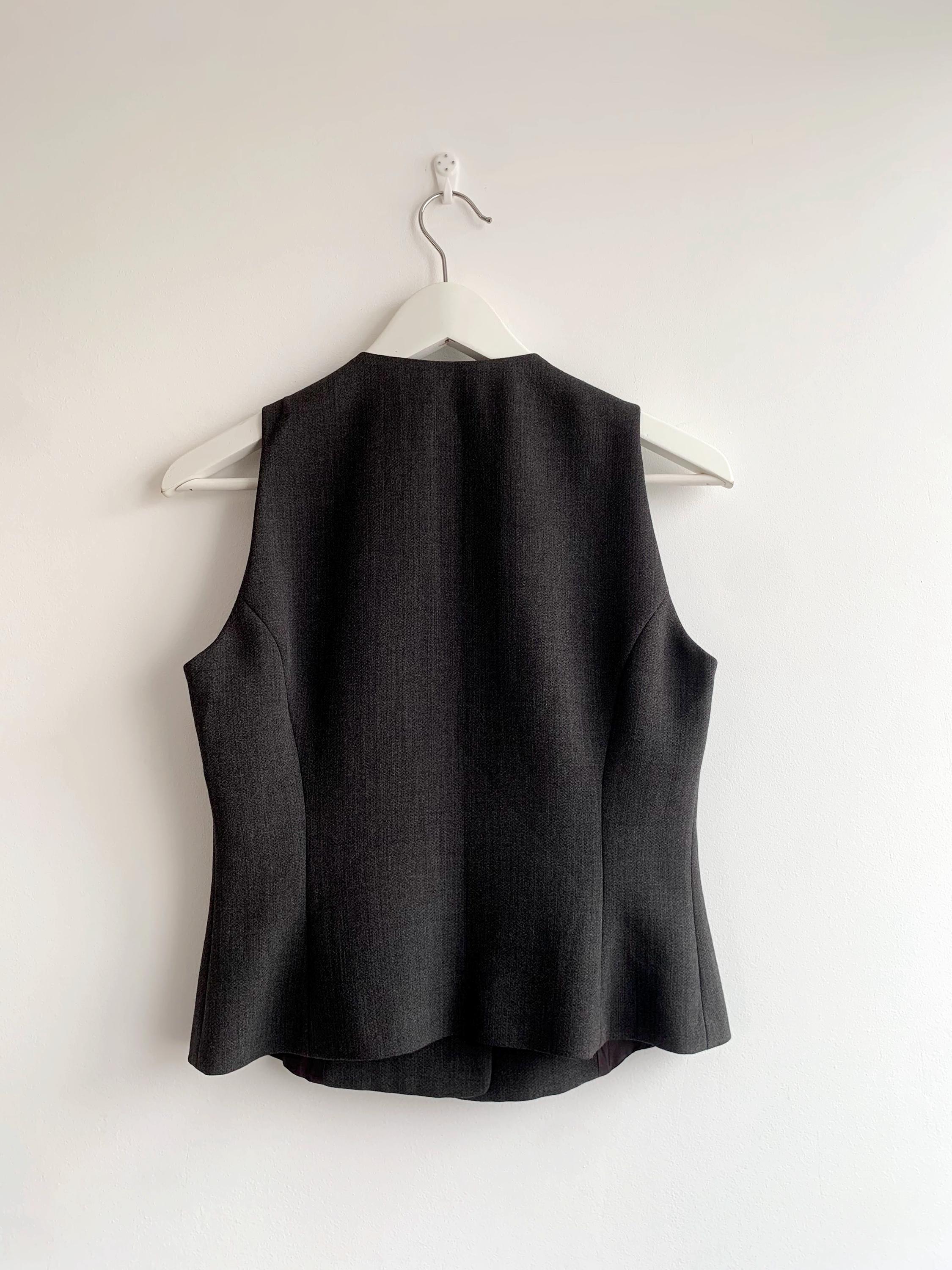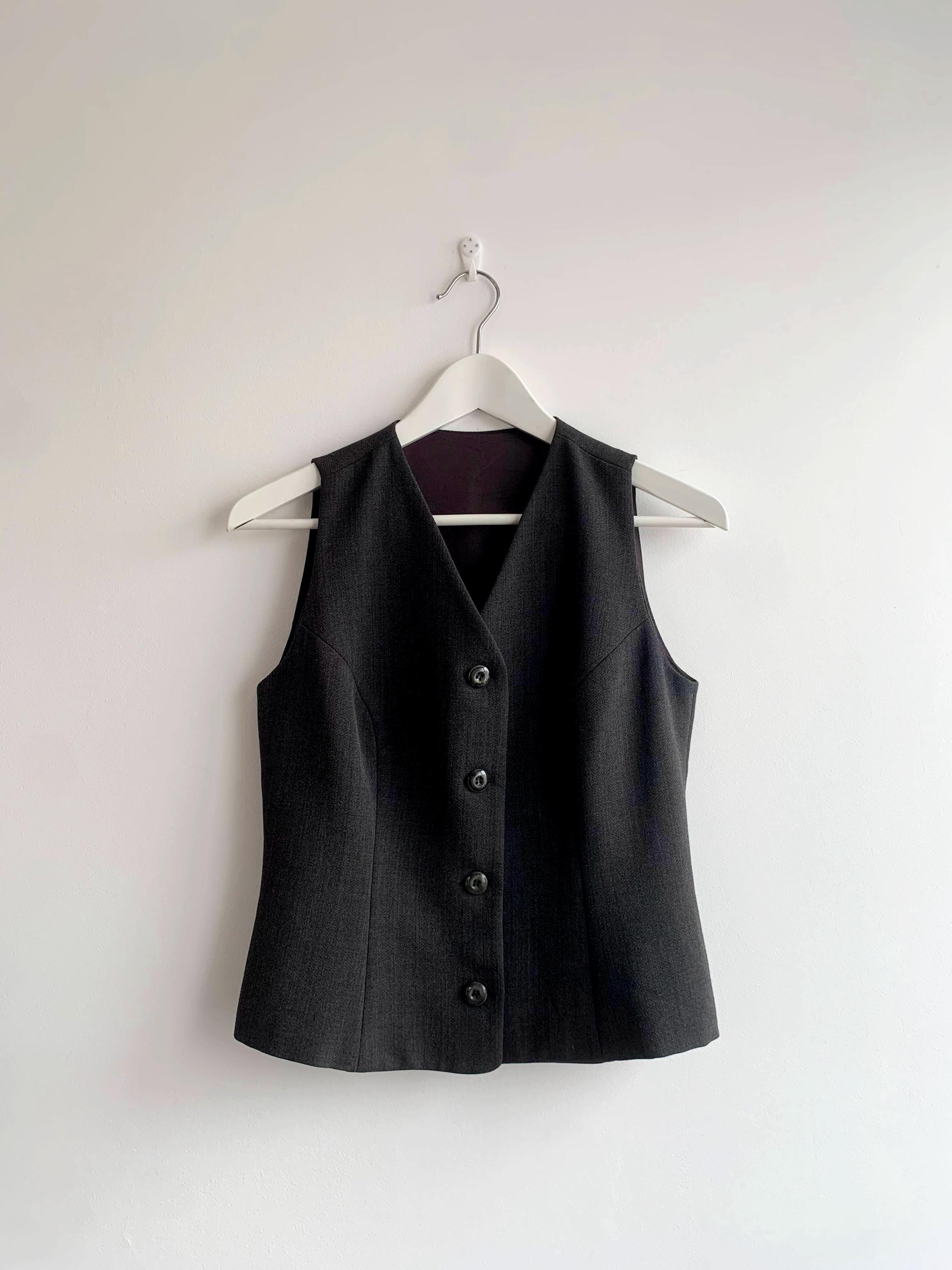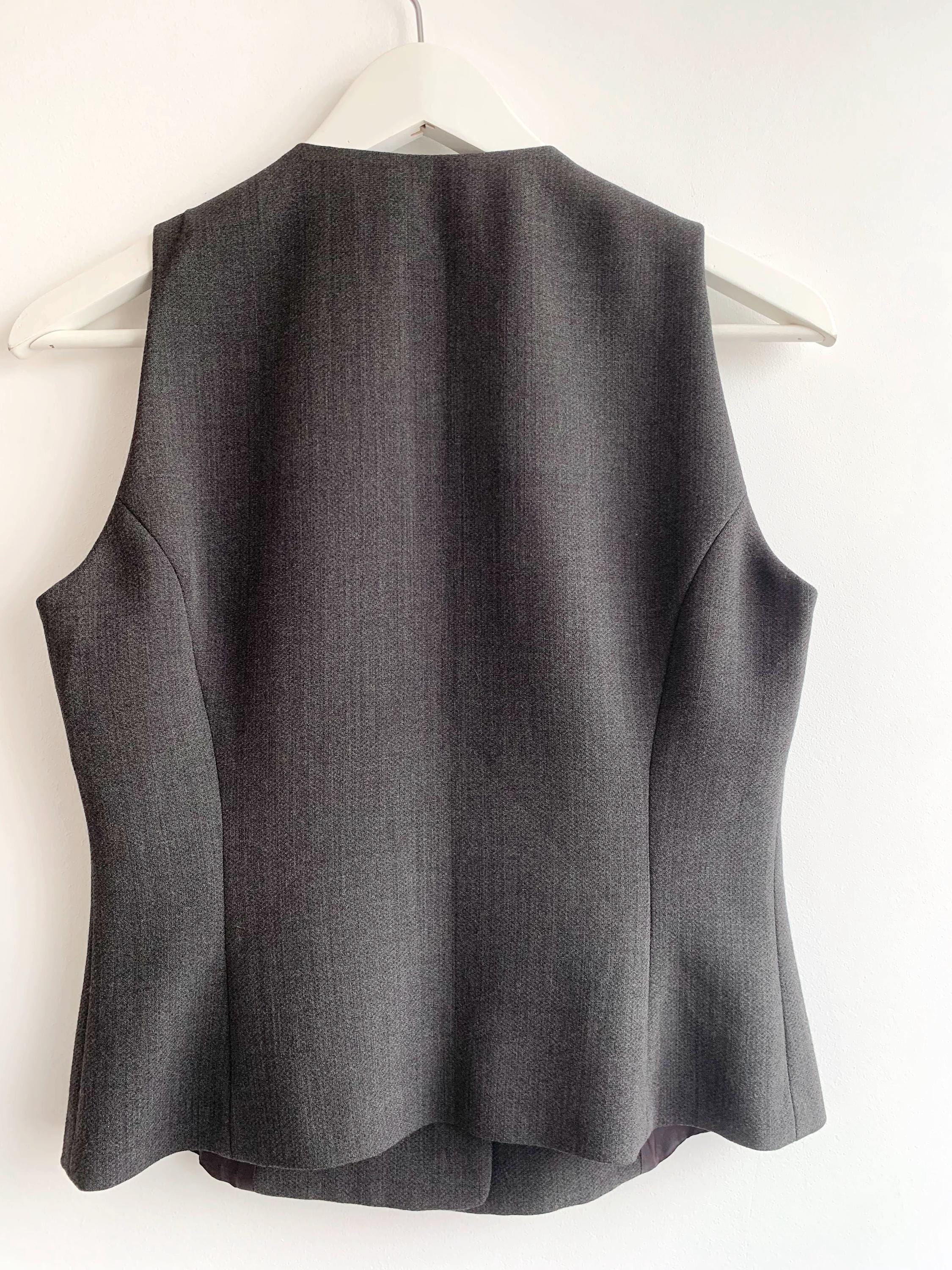 This sophisticated vintage Italian wool vest is the ultimate versatile layering piece for your wardrobe. Expertly tailored with a sleek, minimalist silhouette, this charcoal grey waistcoat effortlessly bridges the gap between 90s office chic and modern dark academia aesthetics. The high-quality wool-viscose blend provides a refined texture and a comfortable drape, making it perfect for pairing with a crisp white shirt, a silk blouse, or even wearing solo for a bold, sleeveless look.