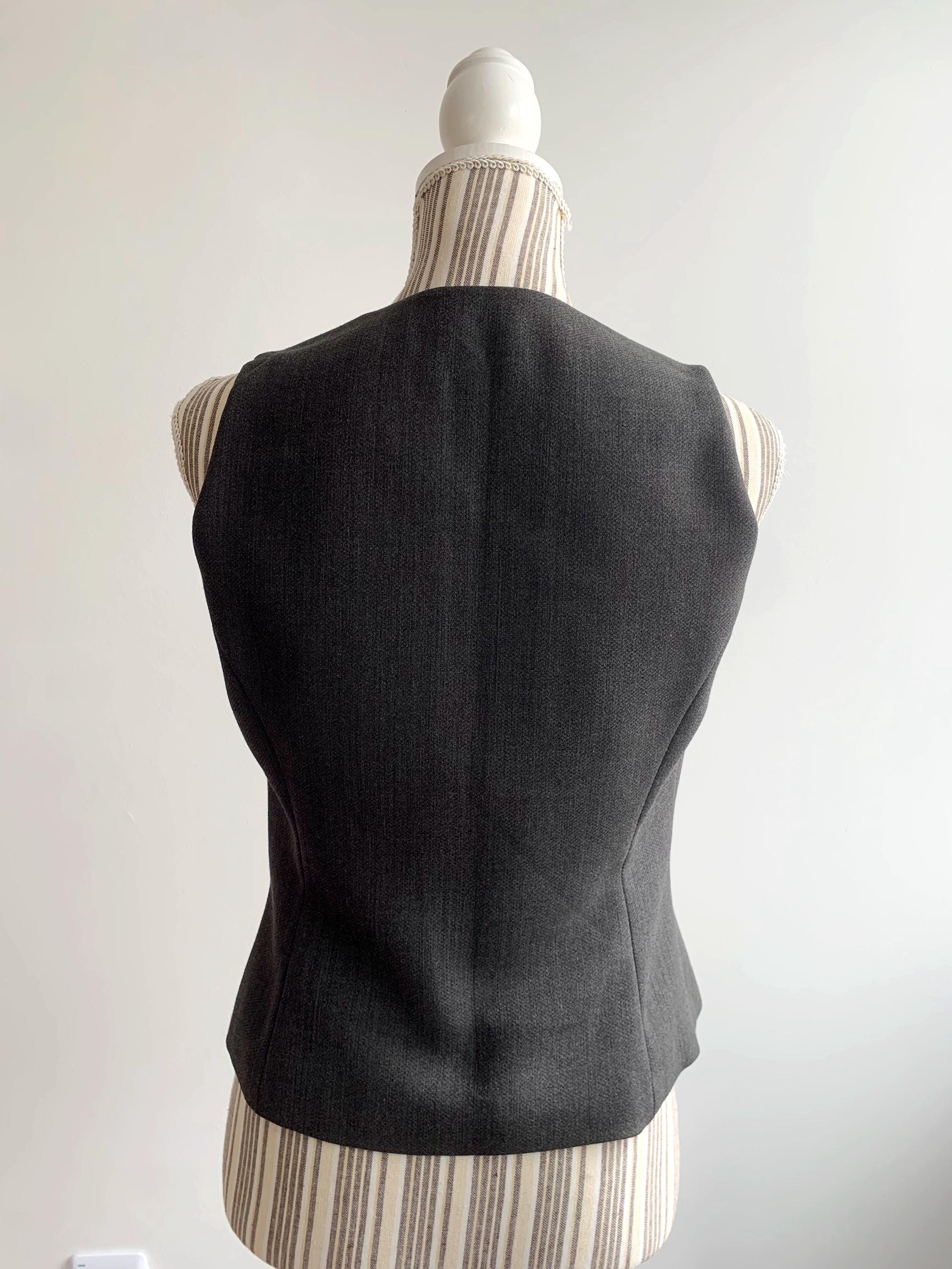 This grey wool vest features a classic four-button front closure, a flattering V-neckline, and a fully lined interior for a smooth fit. The dark grey charcoal hue is incredibly easy to style, offering a professional yet edgy touch to any outfit. Its structured yet feminine cut highlights the waist while maintaining a clean, sophisticated line.