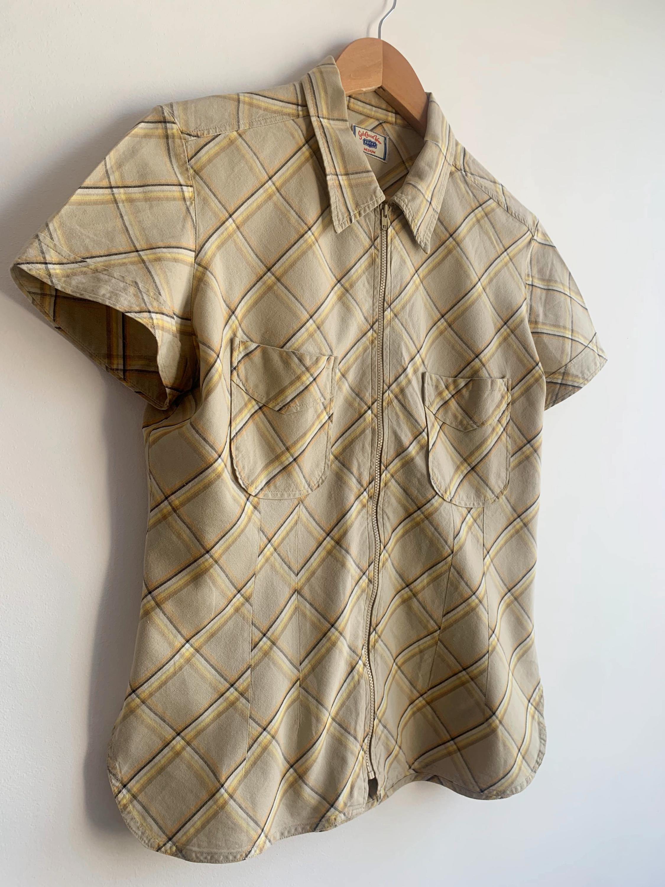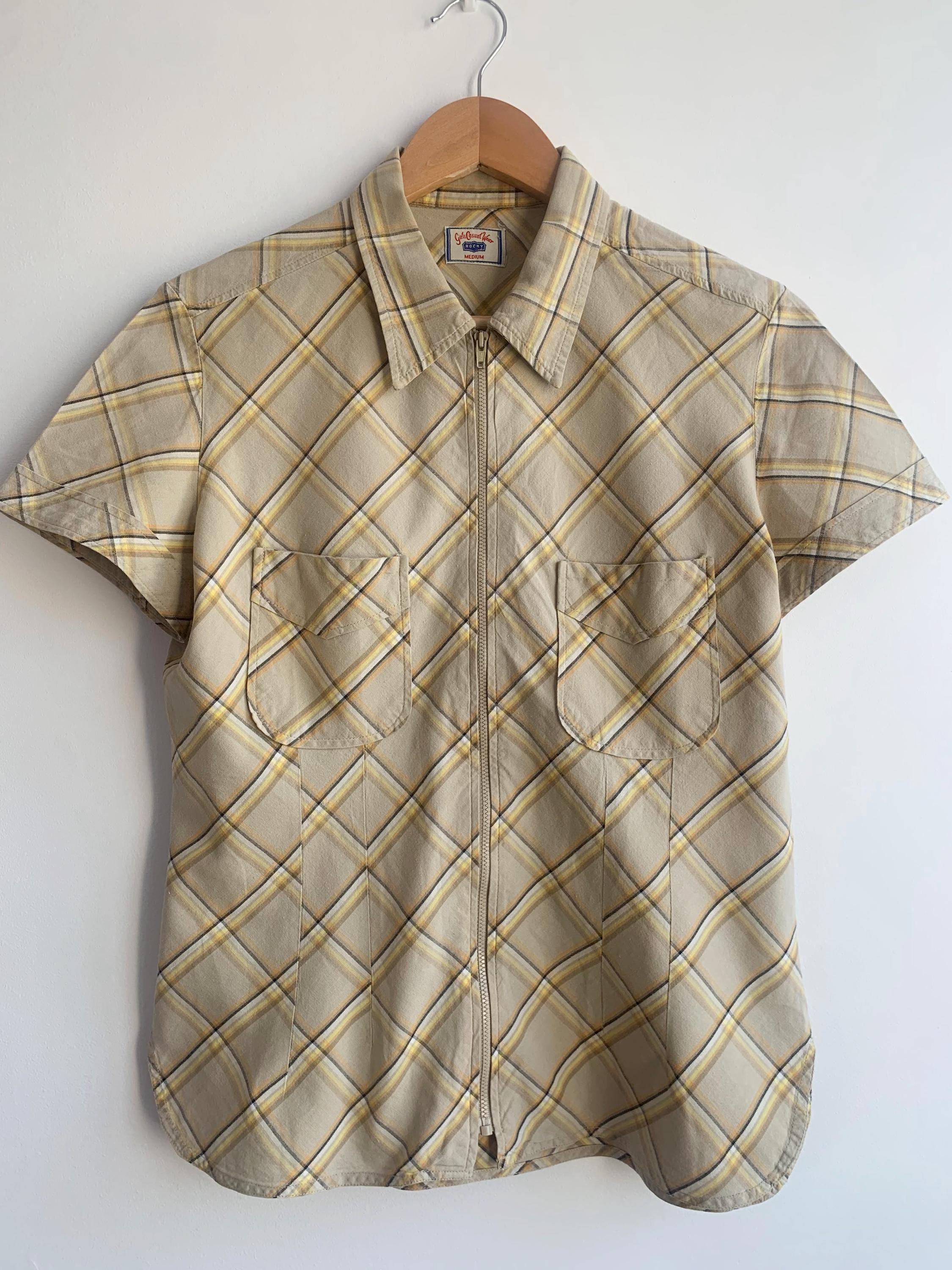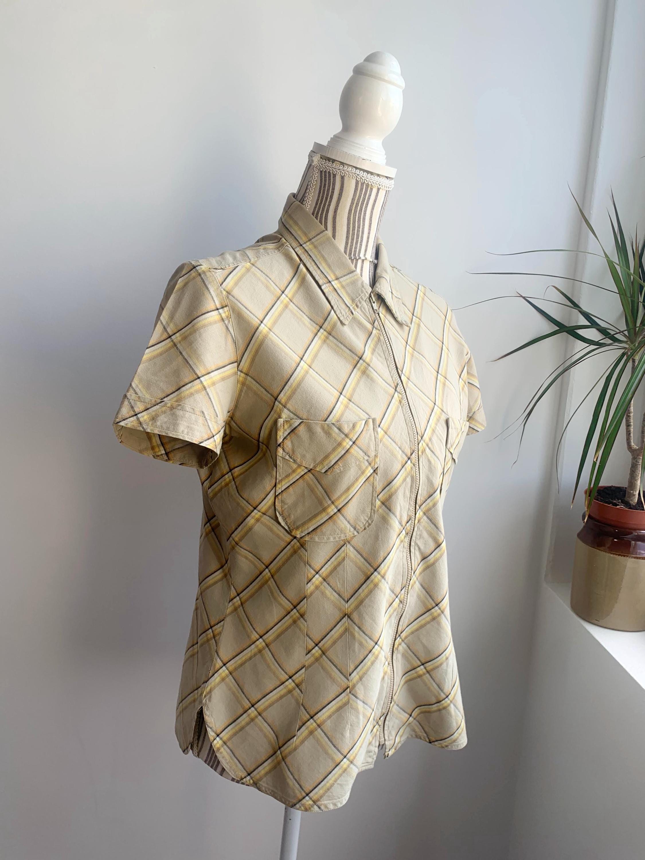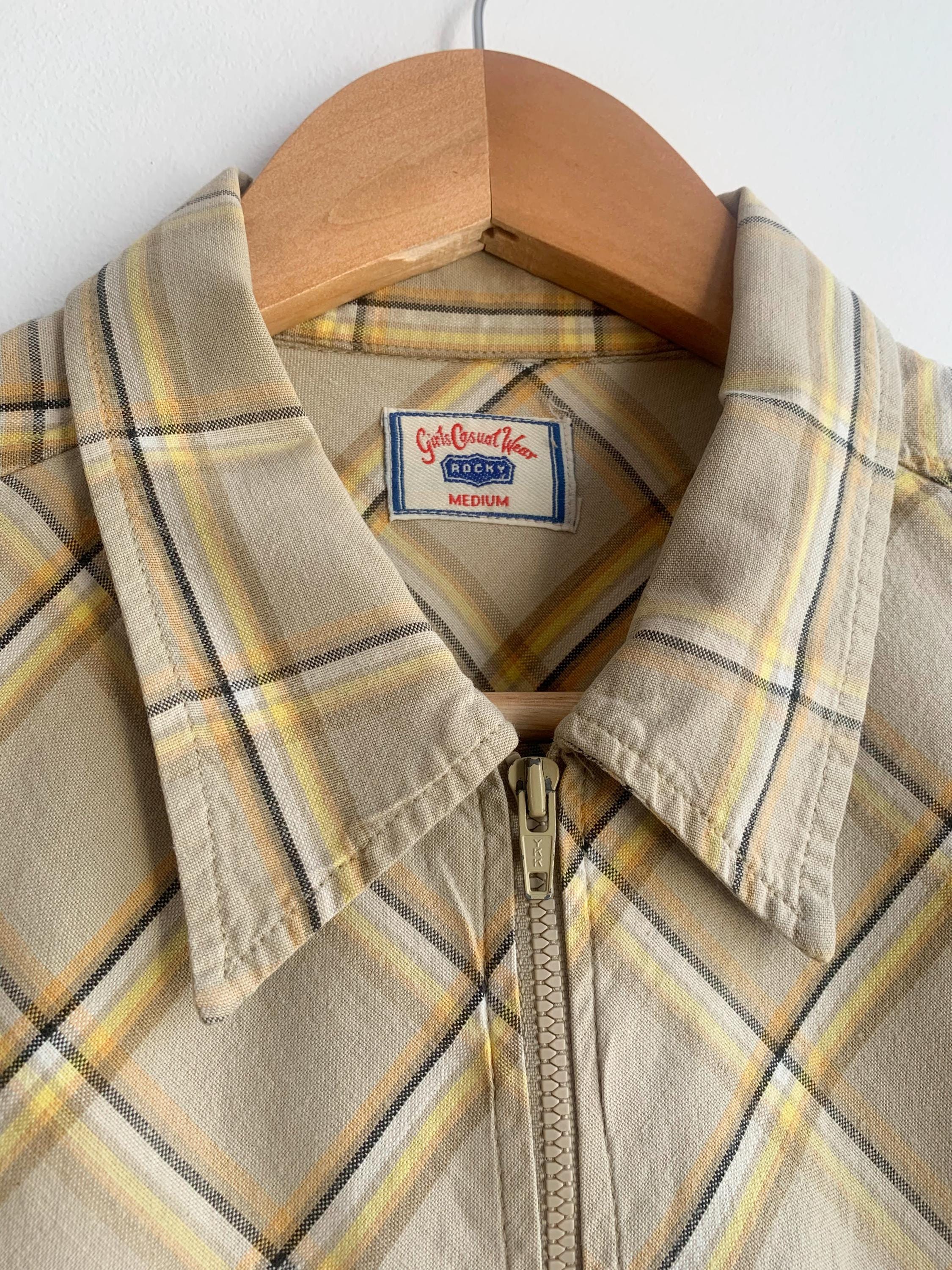 This is a vintage 1980s pure cotton zip-up shirt for women in size M by Rocky (Girls Casual Wear). Featuring a classic diagonal plaid pattern in earthy tan beige, yellow, and white, this collared shirt perfectly captures the effortless style of the era. The tailored fit, accented by structural darts and two functional chest pockets, makes it a versatile staple for high-waisted denim or vintage skirts.