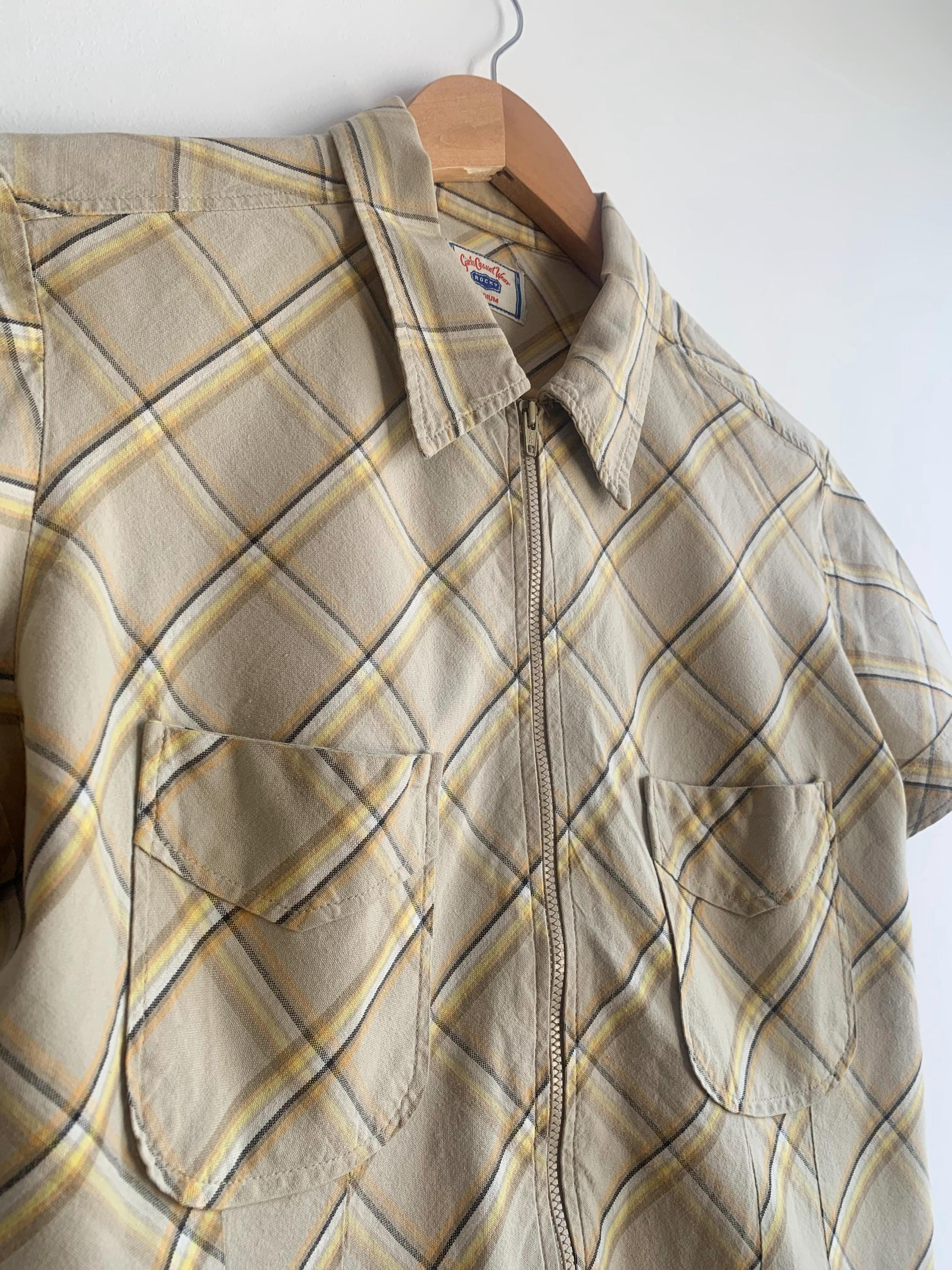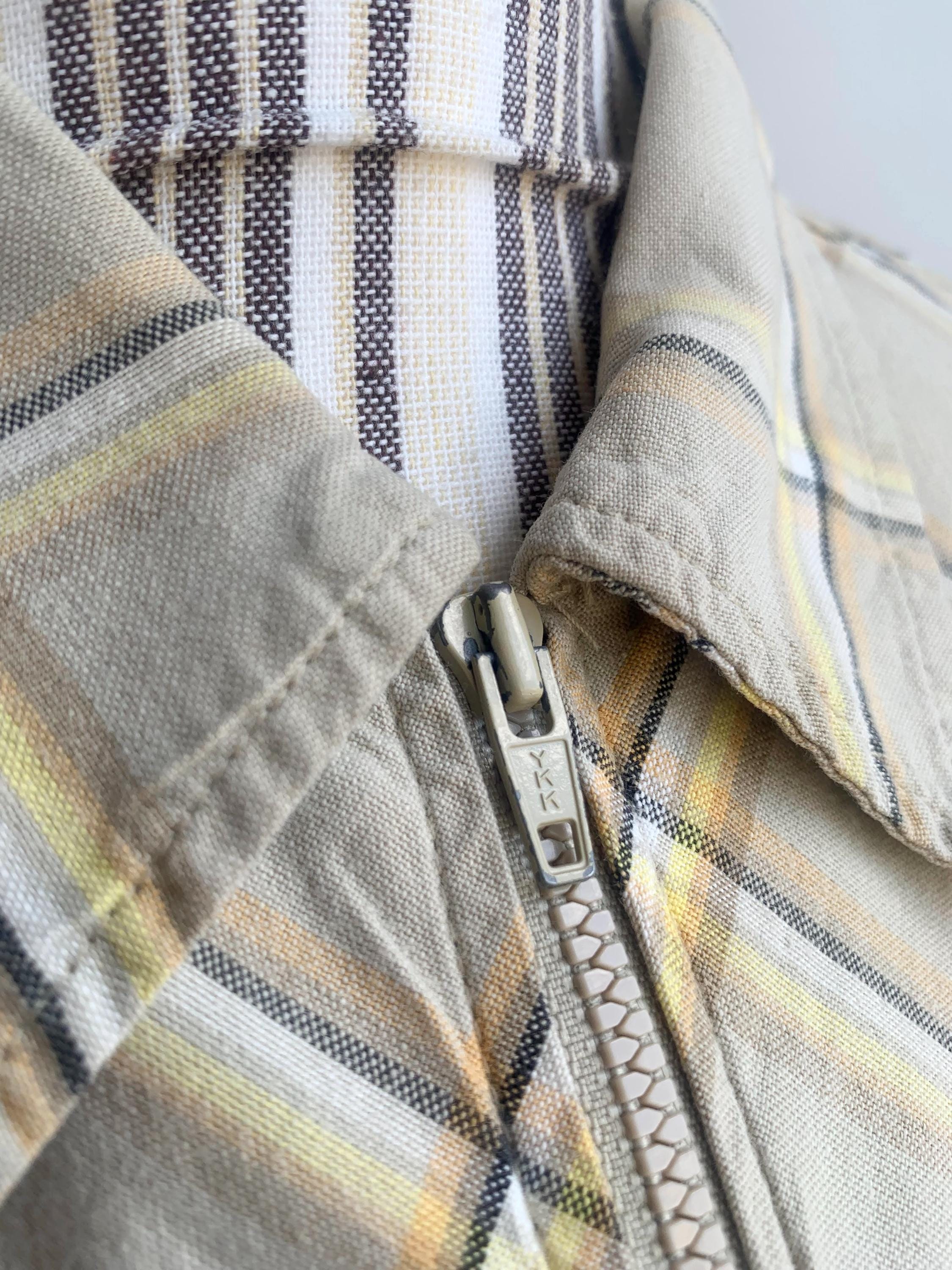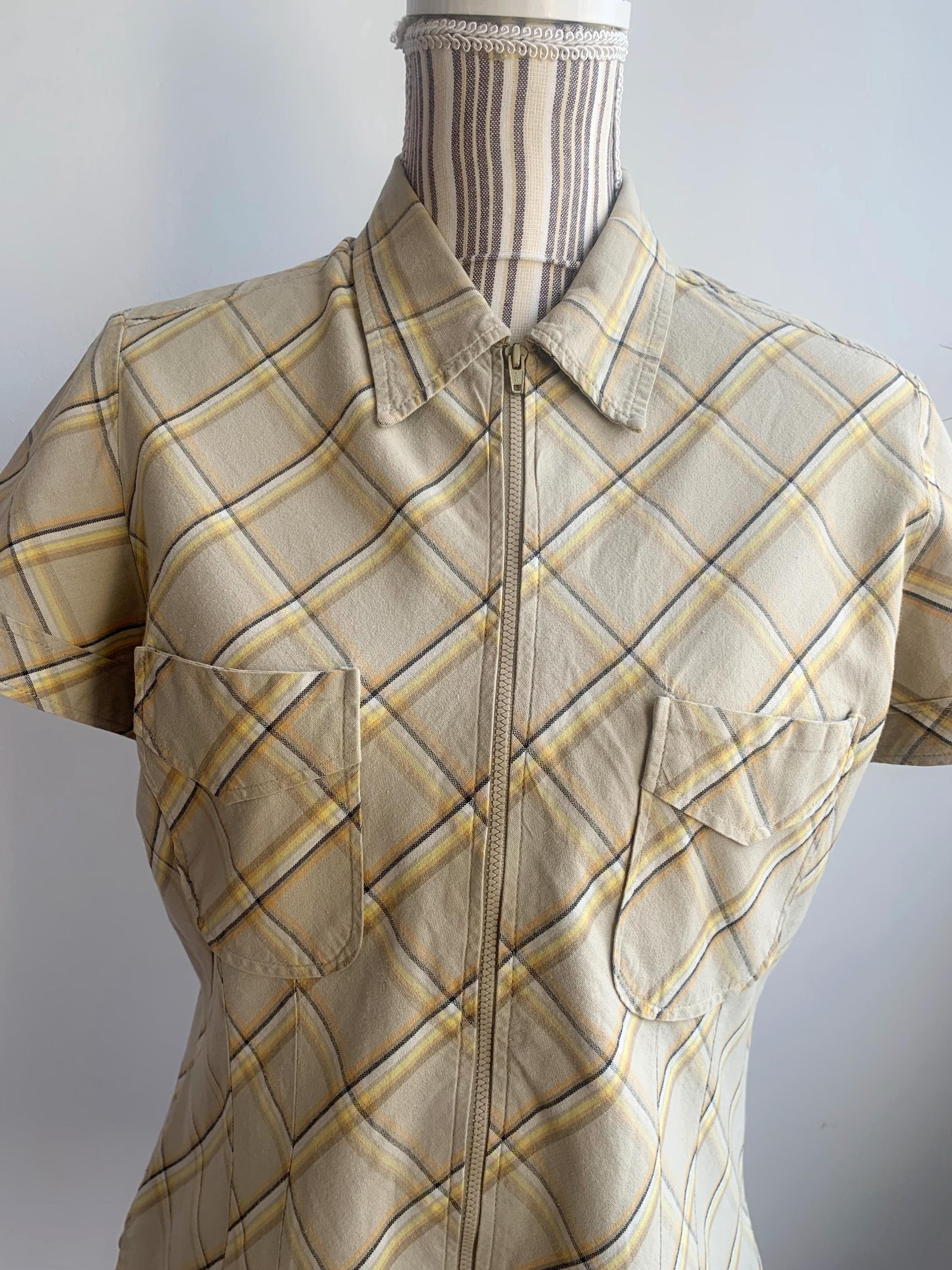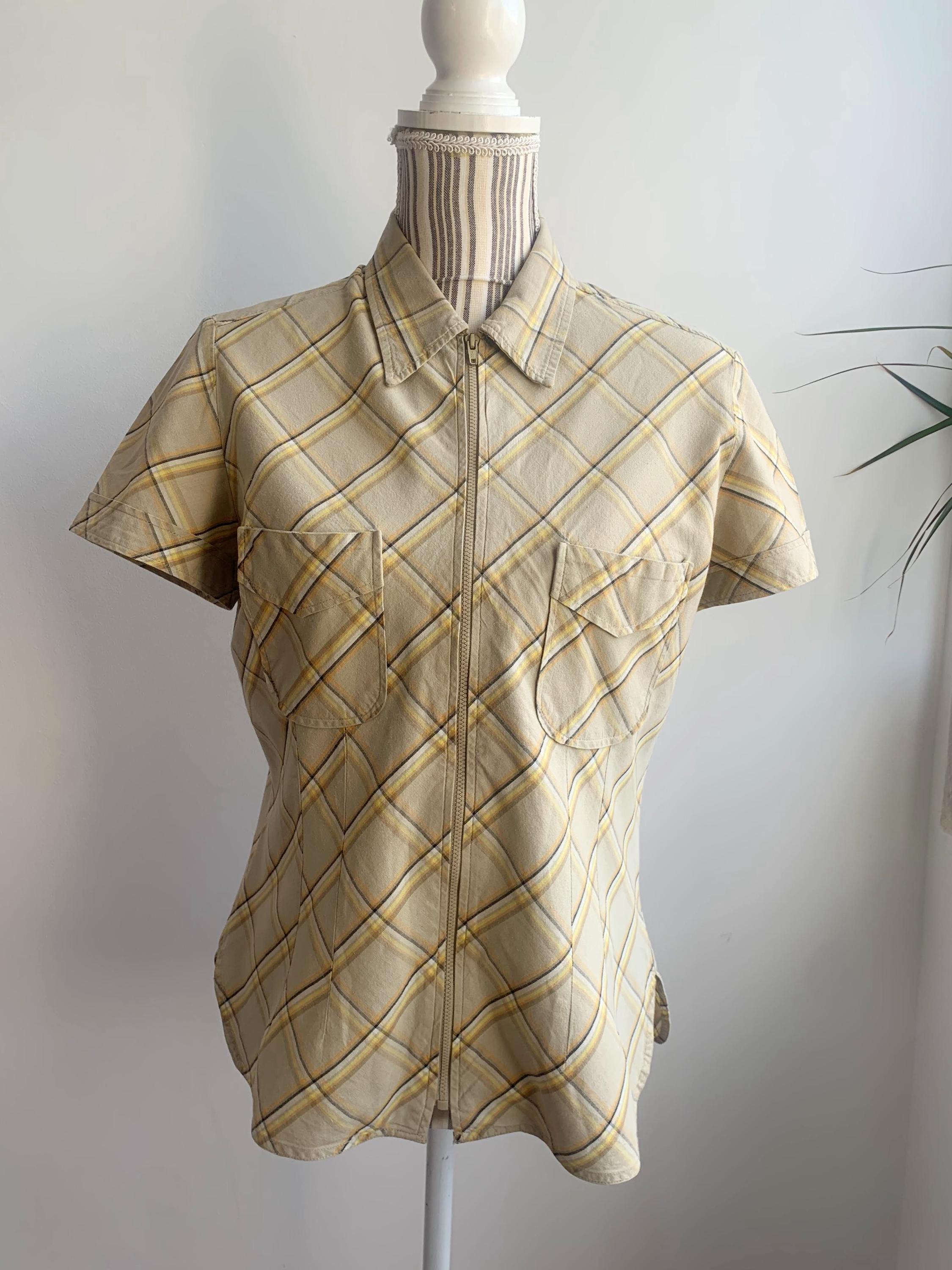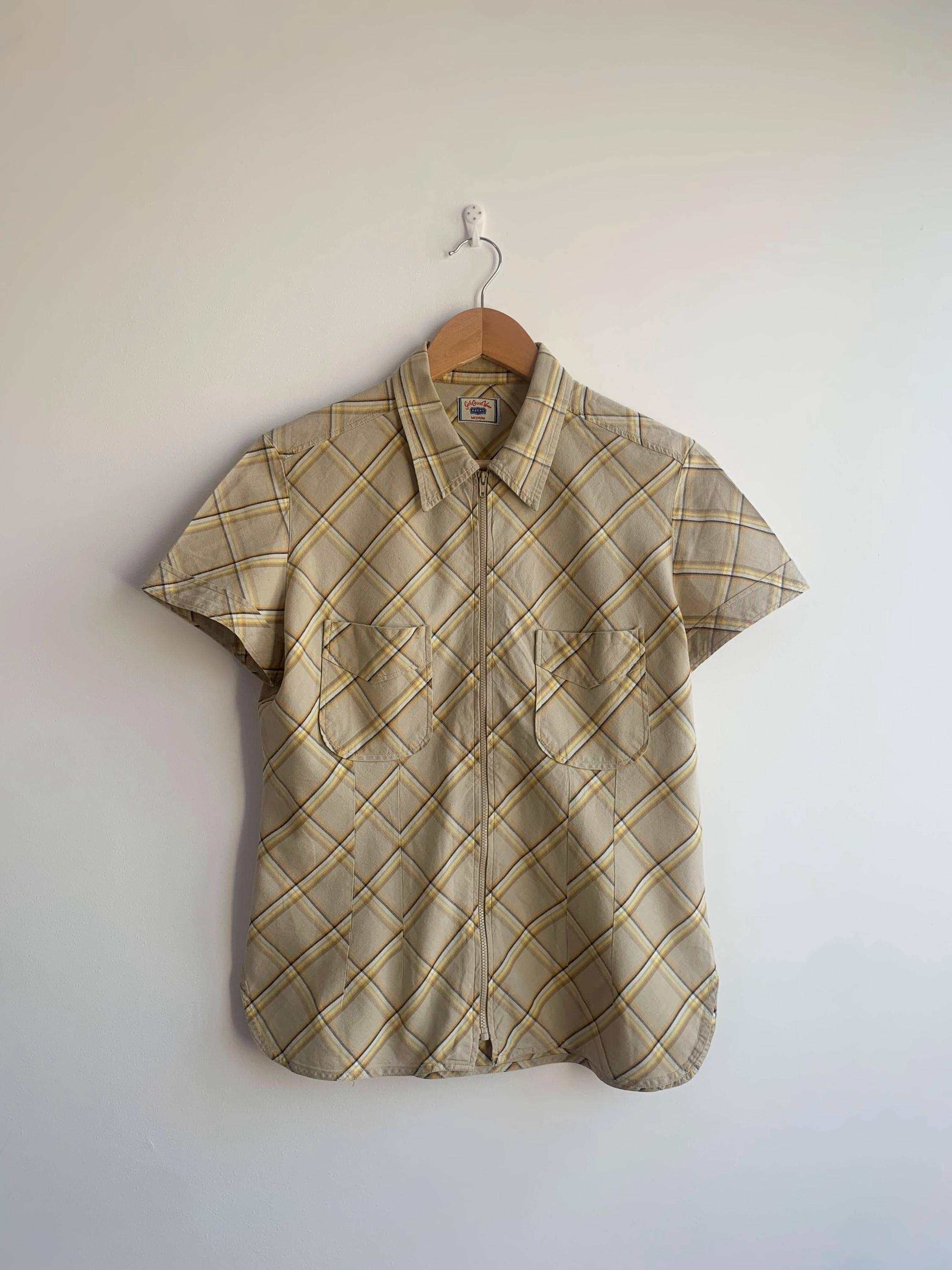 This is a vintage 1980s pure cotton zip-up shirt for women in size M by Rocky (Girls Casual Wear). Featuring a classic diagonal plaid pattern in earthy tan beige, yellow, and white, this collared shirt perfectly captures the effortless style of the era. The tailored fit, accented by structural darts and two functional chest pockets, makes it a versatile staple for high-waisted denim or vintage skirts.