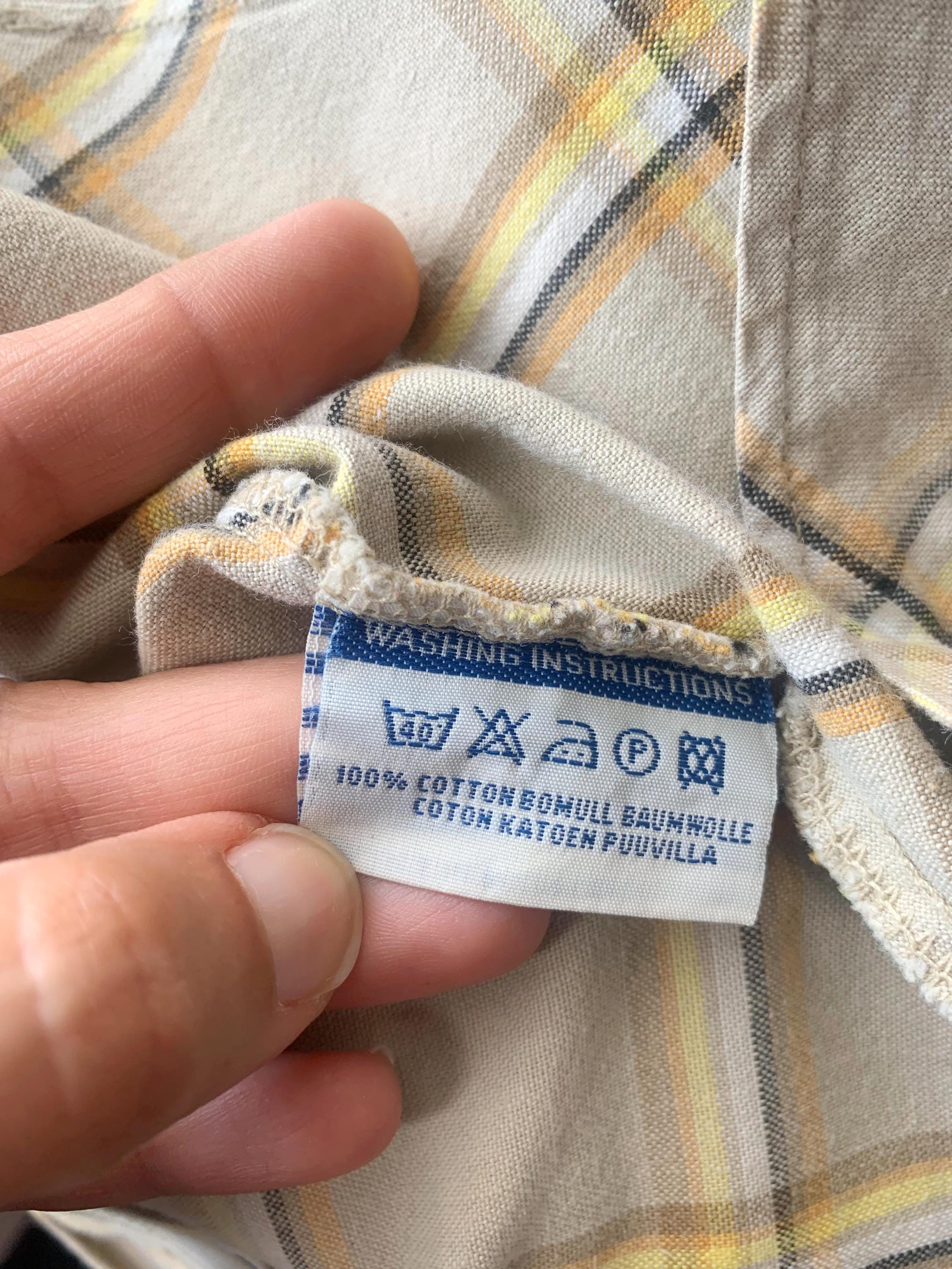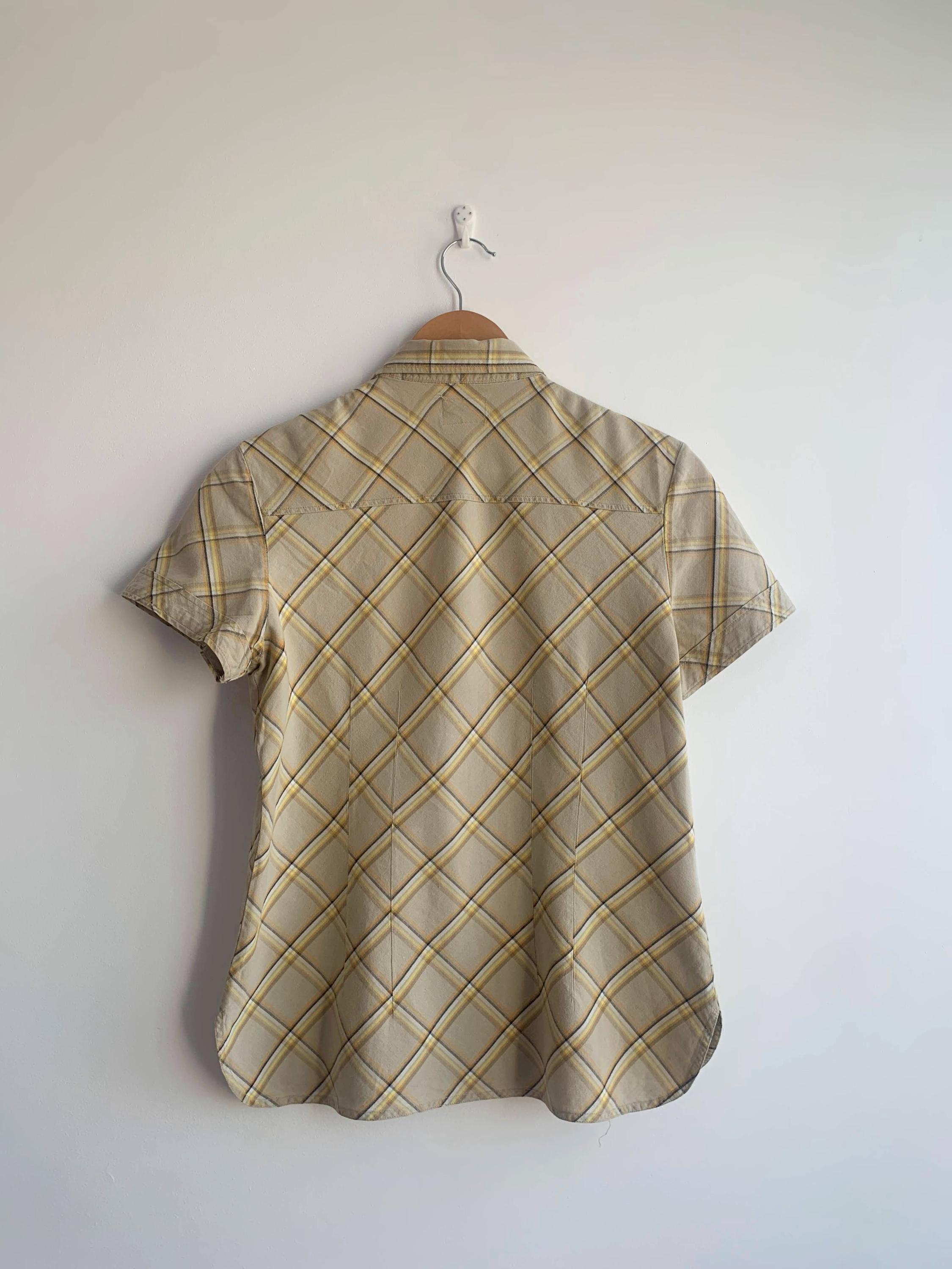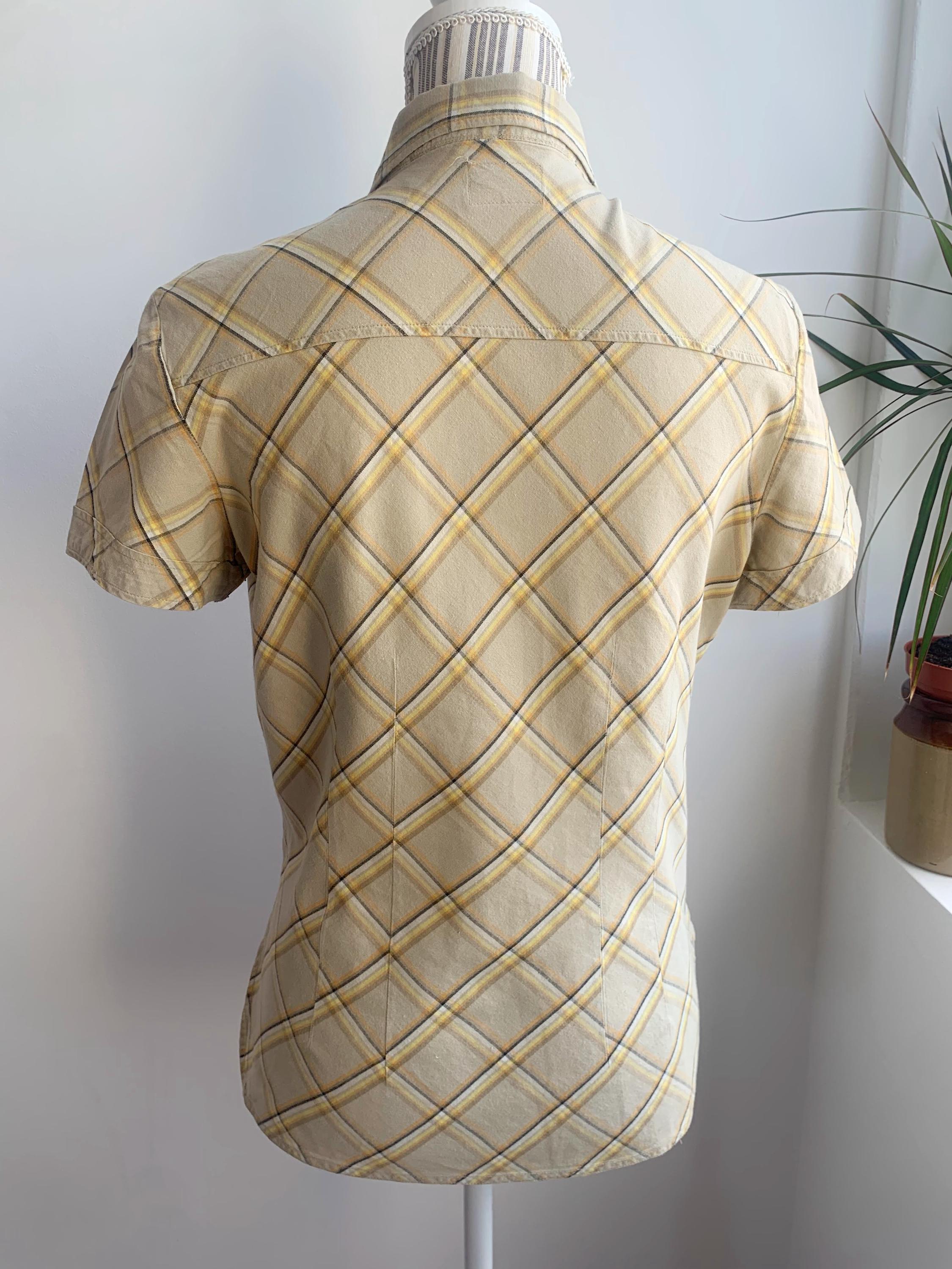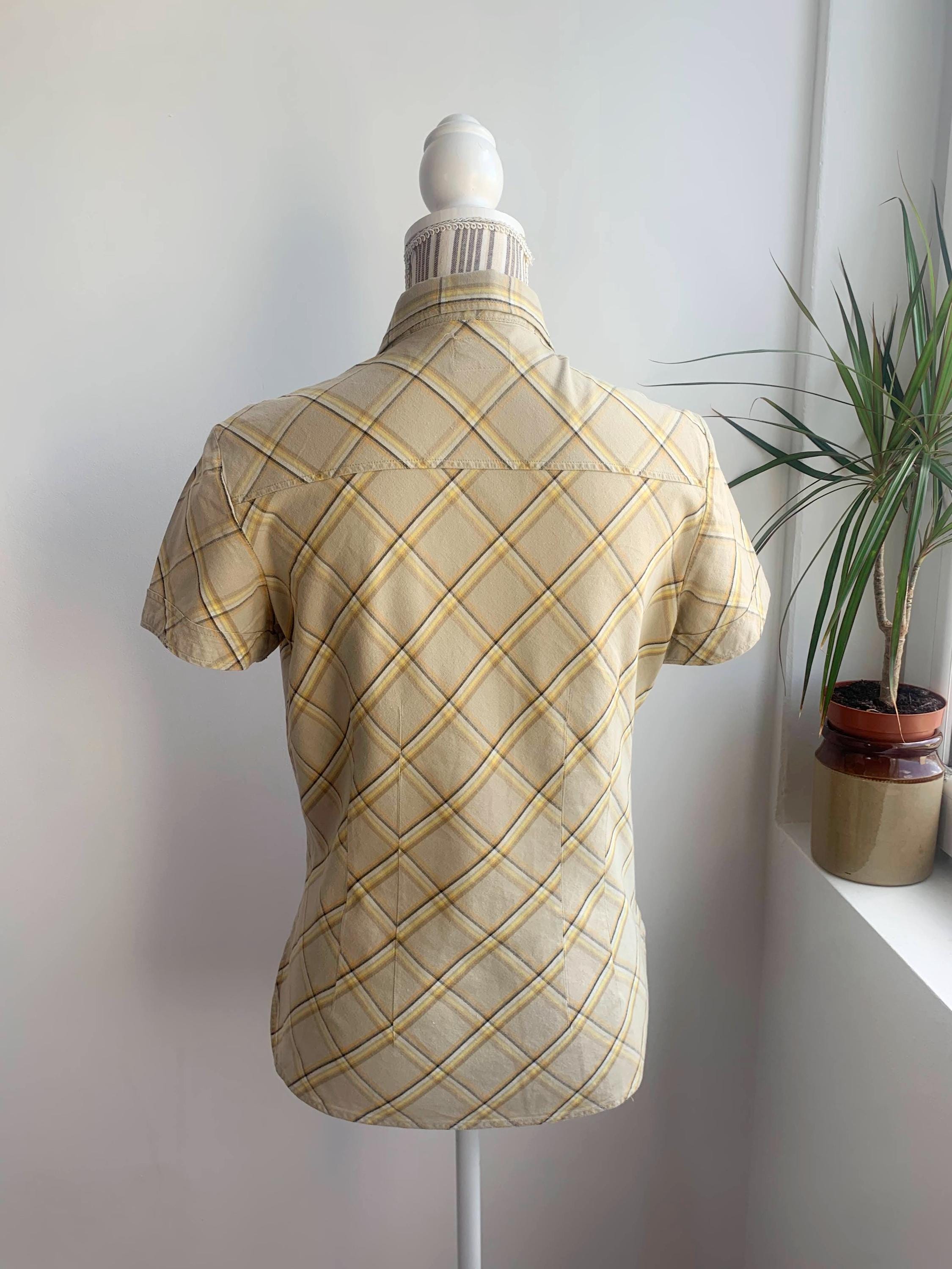 This is a vintage 1980s pure cotton zip-up shirt for women in size M by Rocky (Girls Casual Wear). Featuring a classic diagonal plaid pattern in earthy tan beige, yellow, and white, this collared shirt perfectly captures the effortless style of the era. The tailored fit, accented by structural darts and two functional chest pockets, makes it a versatile staple for high-waisted denim or vintage skirts.