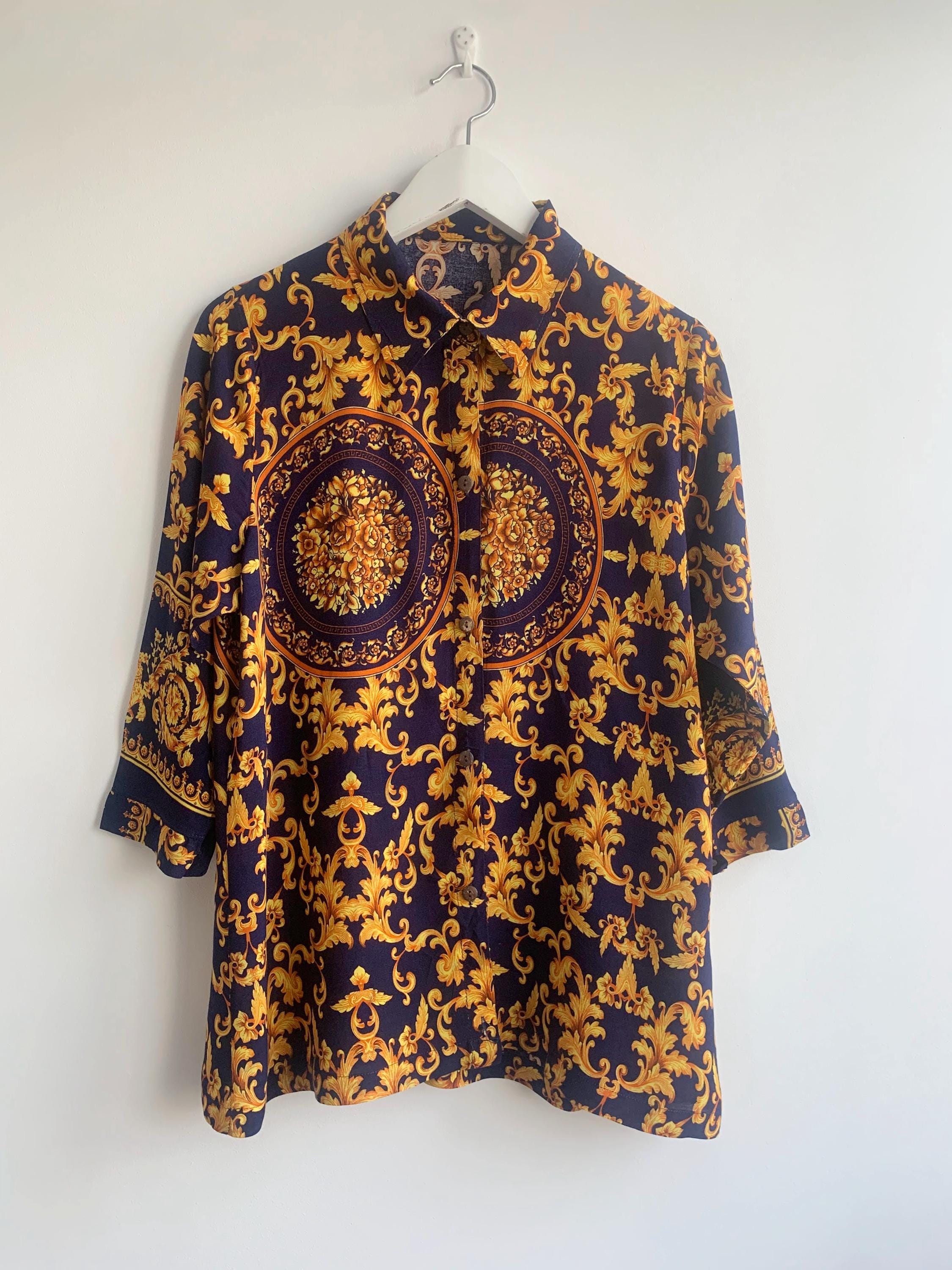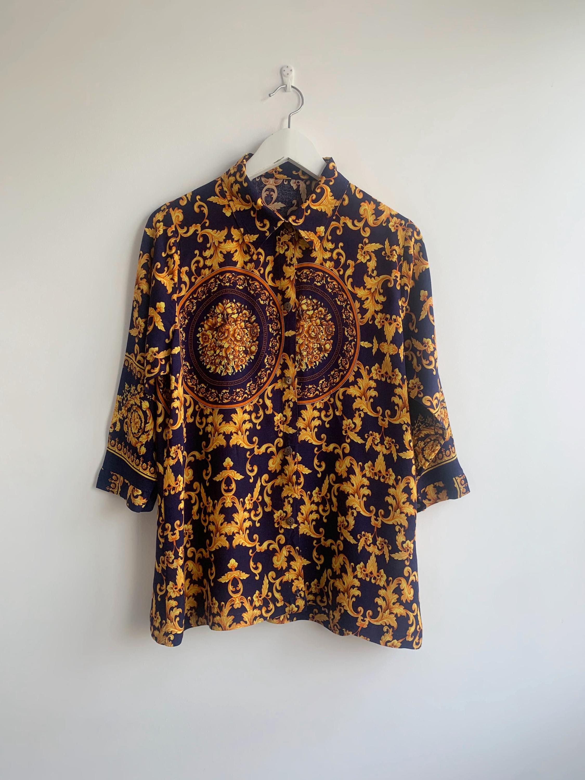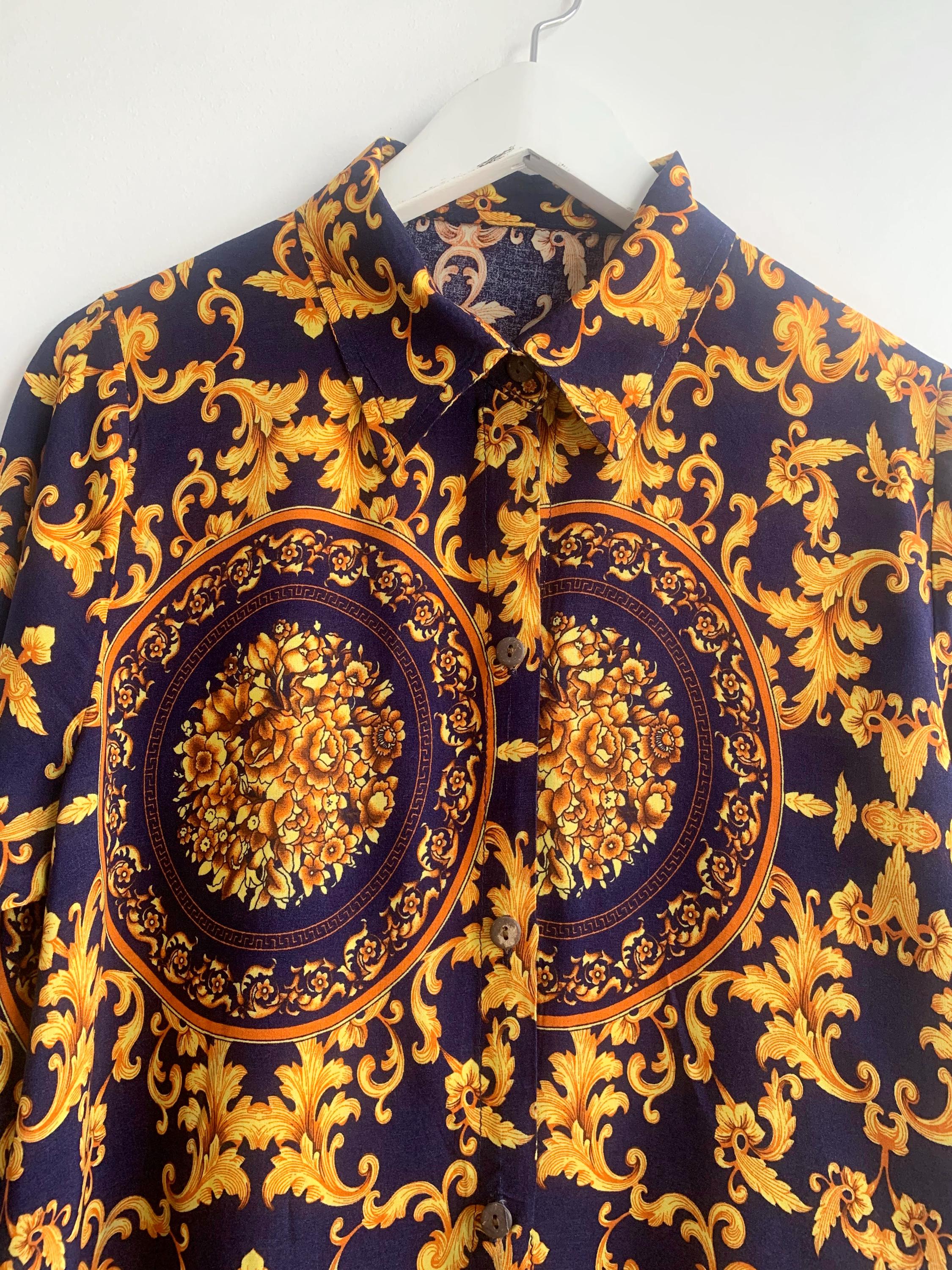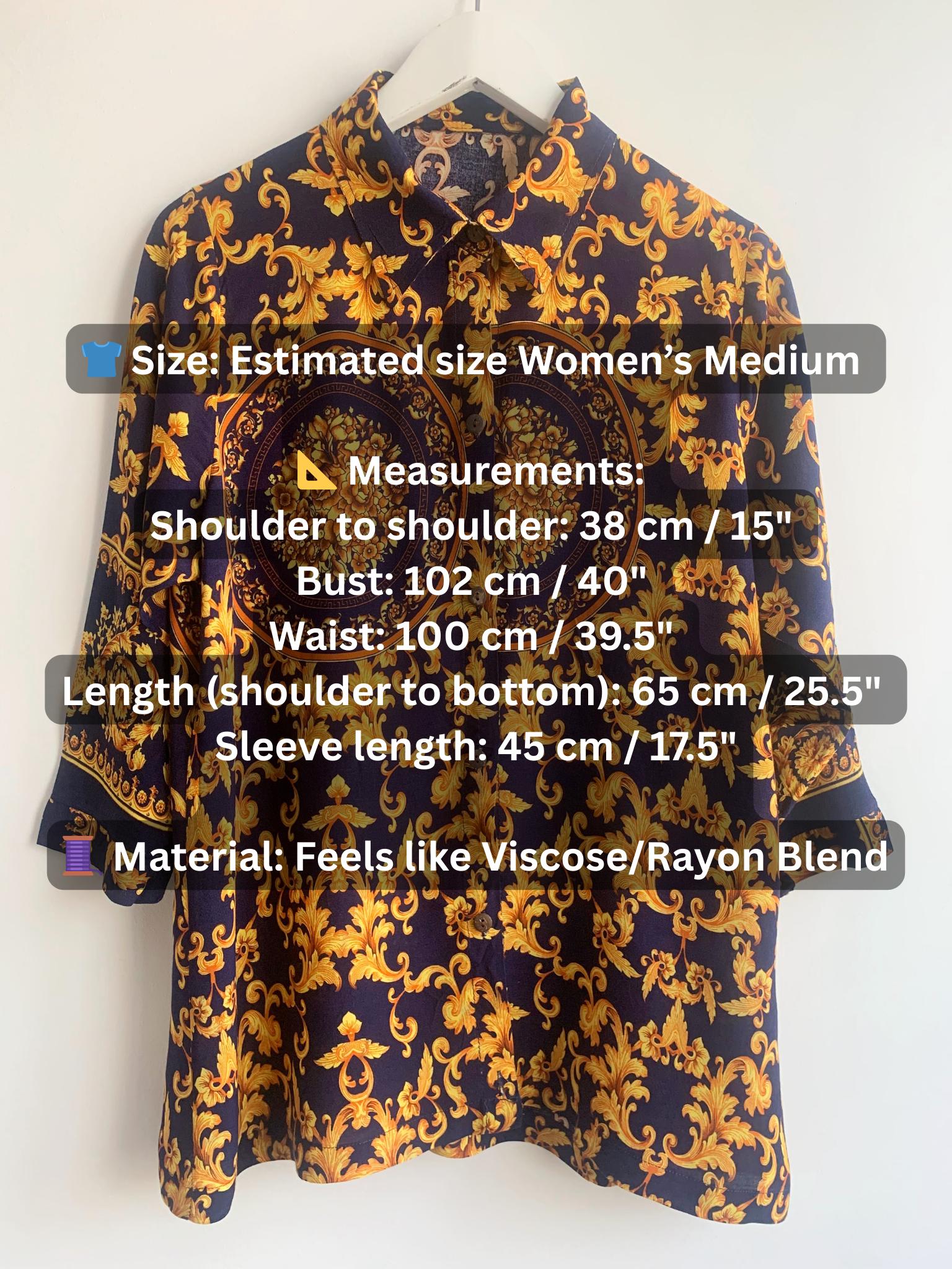 This is a vintage 90s baroque print blouse in navy blue and gold. Featuring a deep navy blue base accented by vibrant gold leaves and flowers ornate medallions, this collared button up shirt is the ultimate statement piece for lovers of maximalist aesthetics. The lightweight fabric (which feels like viscose/ rayon blend) offers a beautiful drape, making it perfect for tucking into high-waisted trousers or wearing loosely over leggings for a chic, retro look. The classic button-down front is complemented by elegant half sleeves, giving it a sophisticated silhouette that transitions effortlessly from office wear to evening outings.