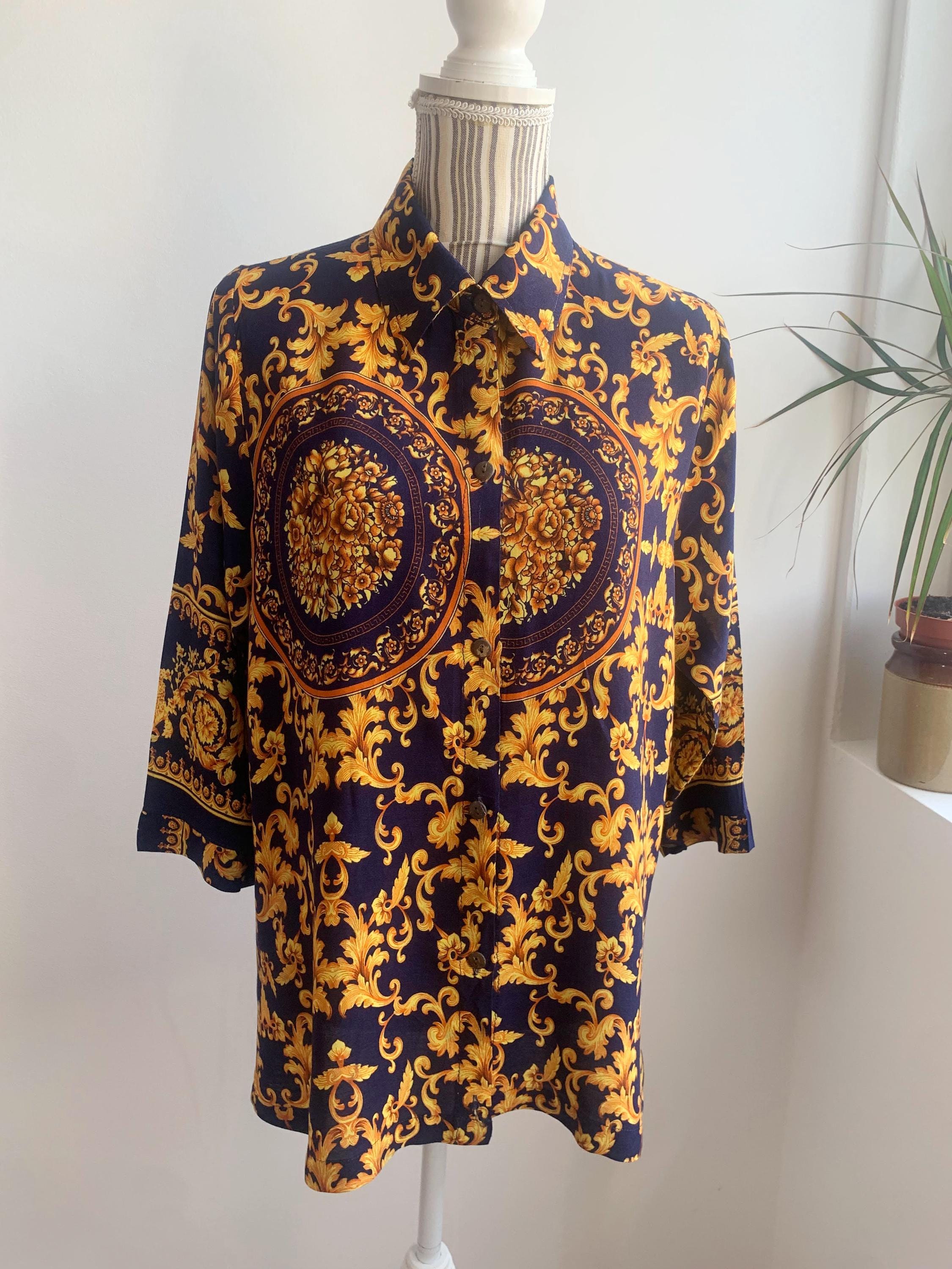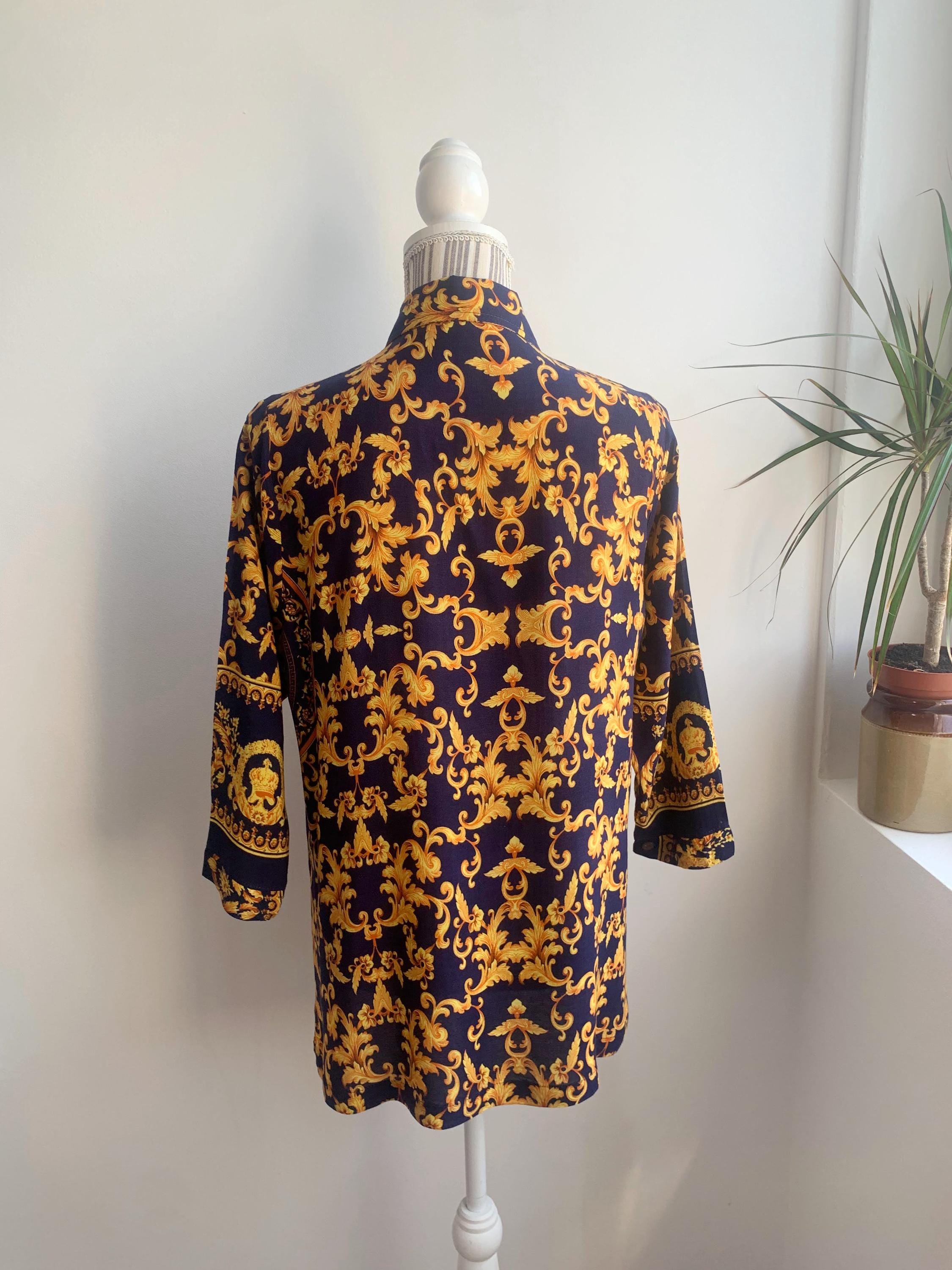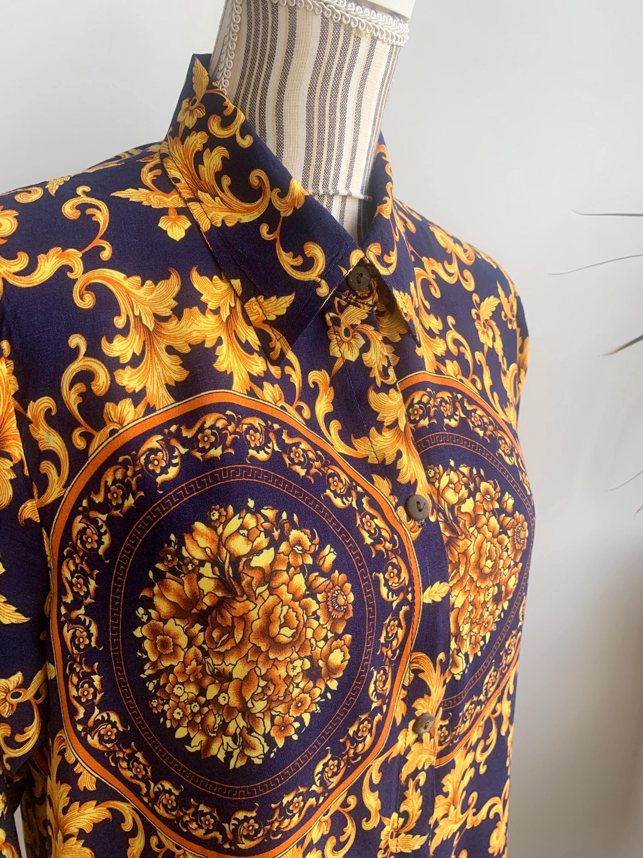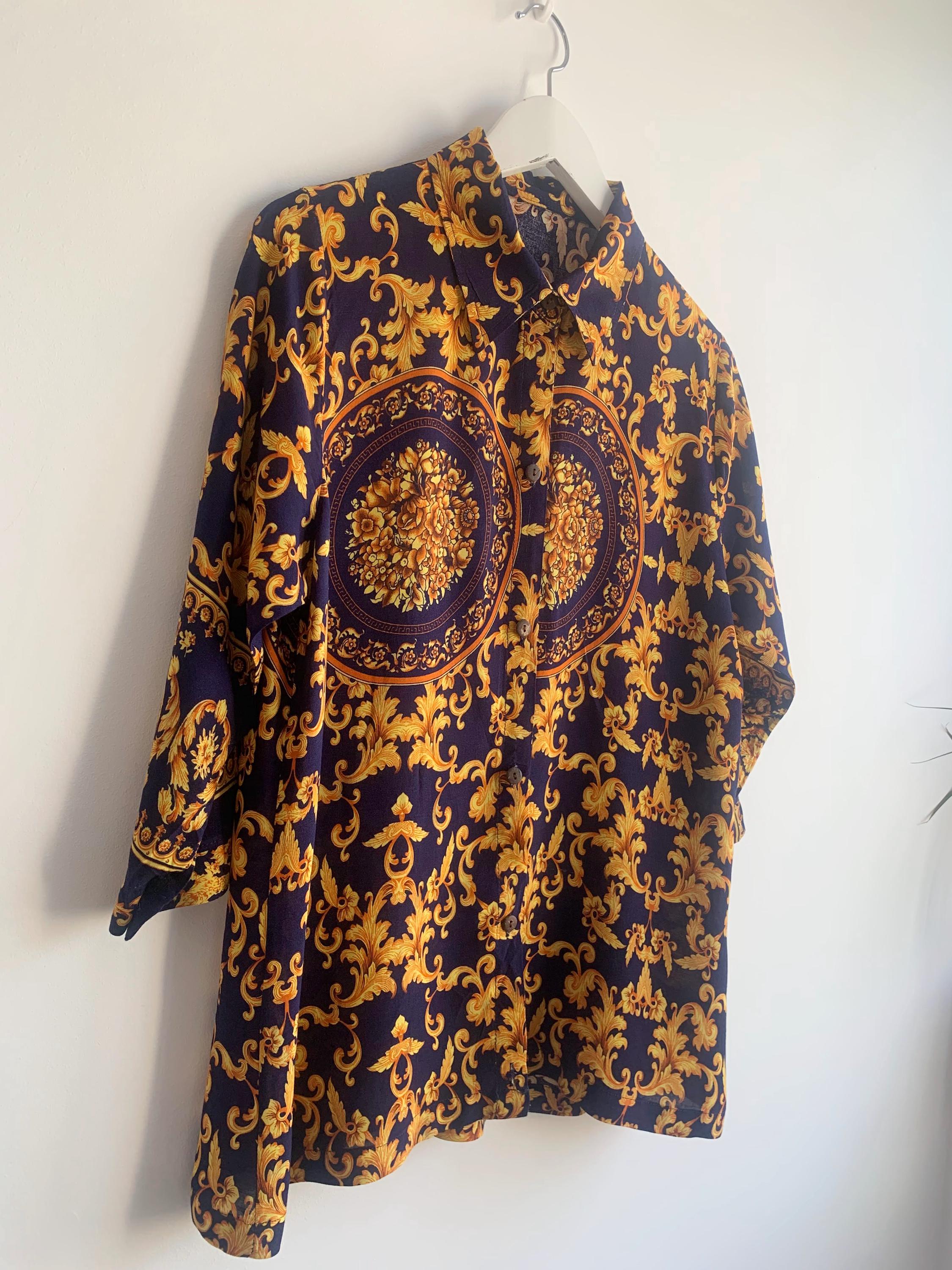 This is a vintage 90s baroque print blouse in navy blue and gold. Featuring a deep navy blue base accented by vibrant gold leaves and flowers ornate medallions, this collared button up shirt is the ultimate statement piece for lovers of maximalist aesthetics. The lightweight fabric (which feels like viscose/ rayon blend) offers a beautiful drape, making it perfect for tucking into high-waisted trousers or wearing loosely over leggings for a chic, retro look. The classic button-down front is complemented by elegant half sleeves, giving it a sophisticated silhouette that transitions effortlessly from office wear to evening outings.