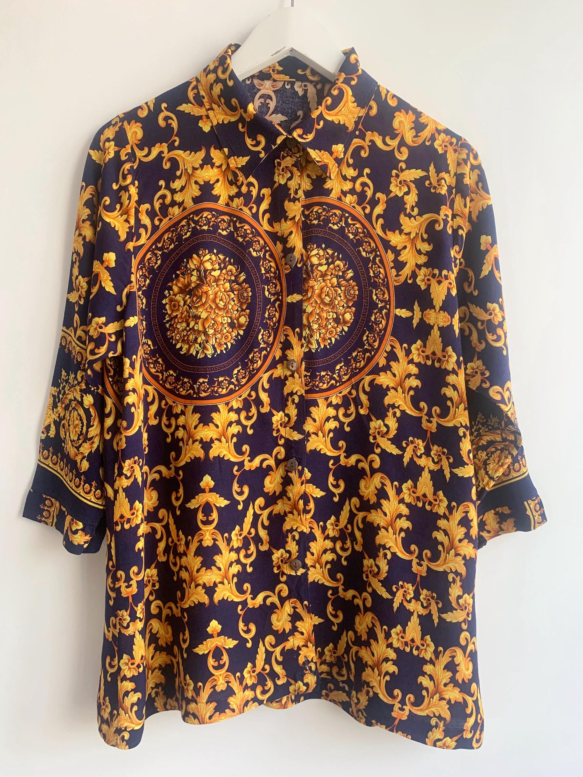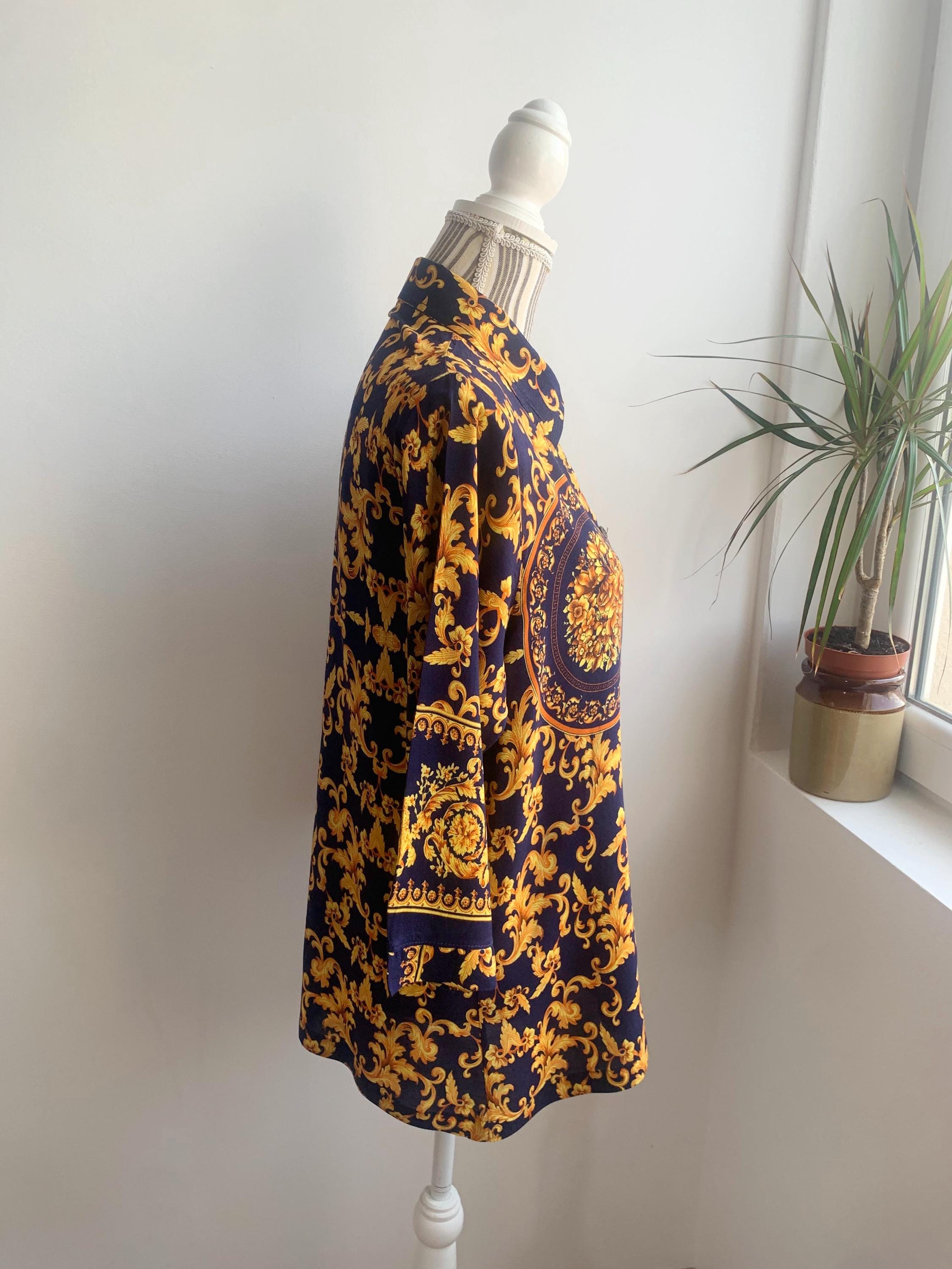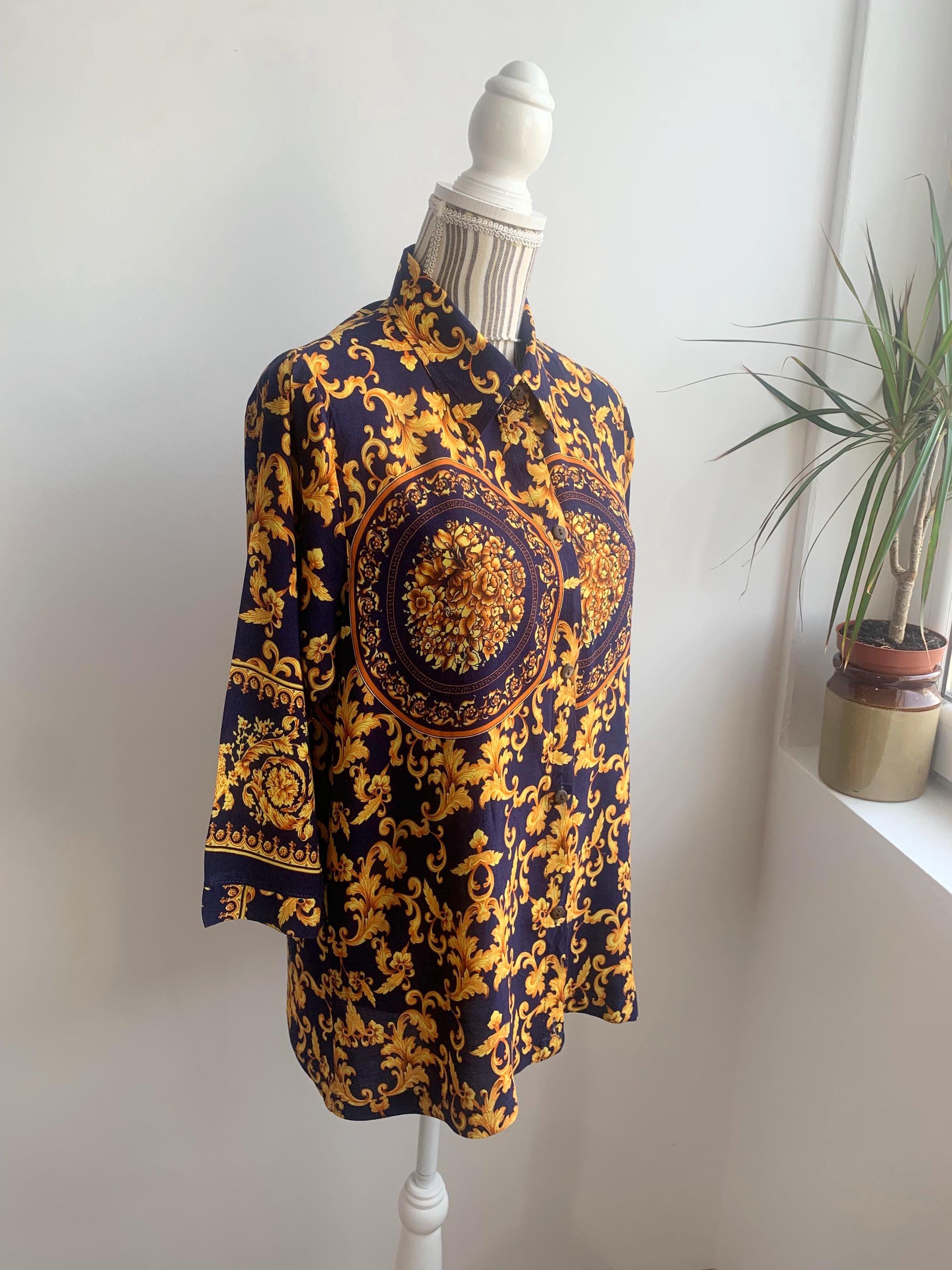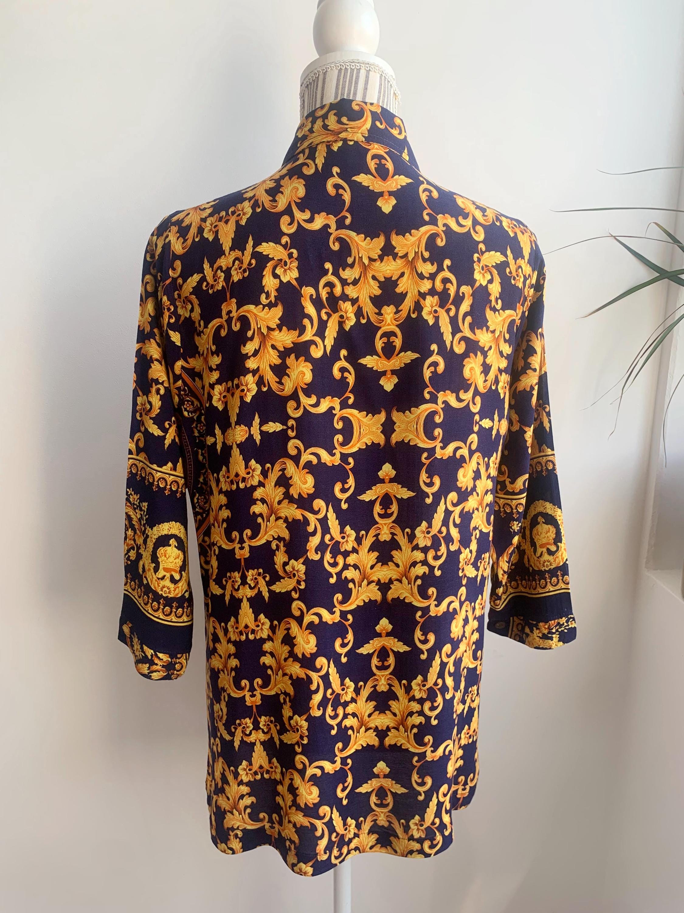 This is a vintage 90s baroque print blouse in navy blue and gold. Featuring a deep navy blue base accented by vibrant gold leaves and flowers ornate medallions, this collared button up shirt is the ultimate statement piece for lovers of maximalist aesthetics. The lightweight fabric (which feels like viscose/ rayon blend) offers a beautiful drape, making it perfect for tucking into high-waisted trousers or wearing loosely over leggings for a chic, retro look. The classic button-down front is complemented by elegant half sleeves, giving it a sophisticated silhouette that transitions effortlessly from office wear to evening outings.
