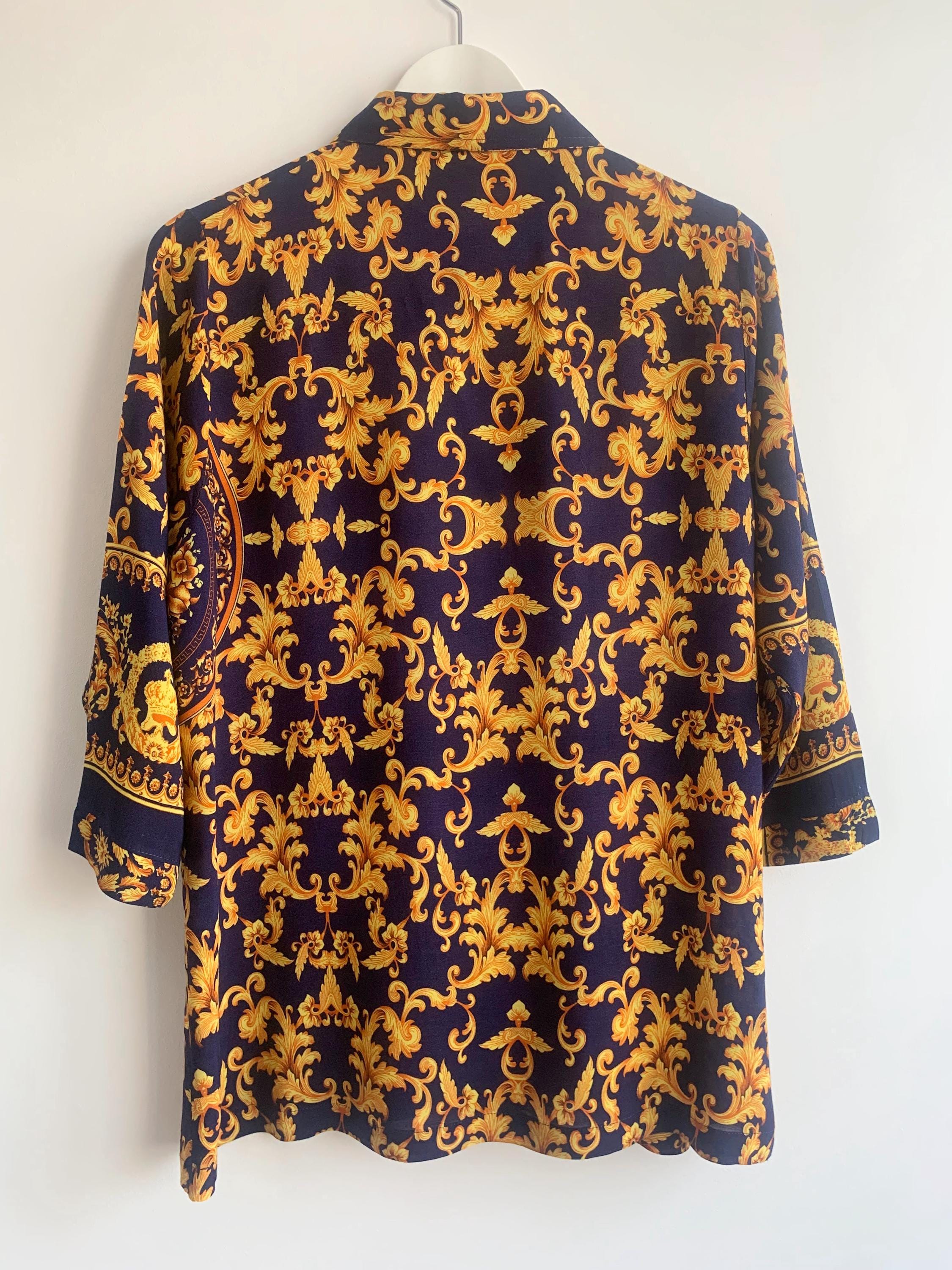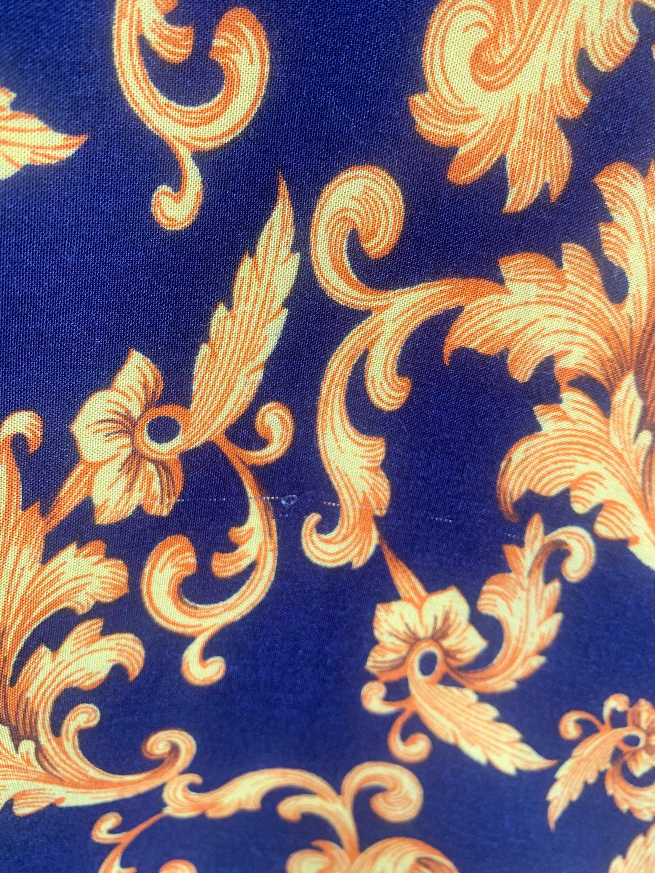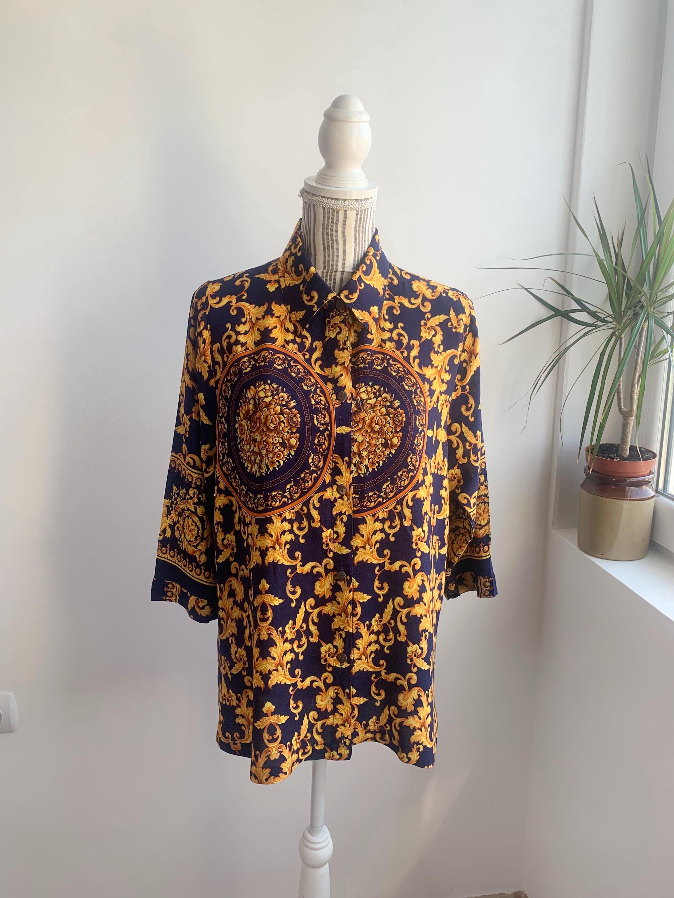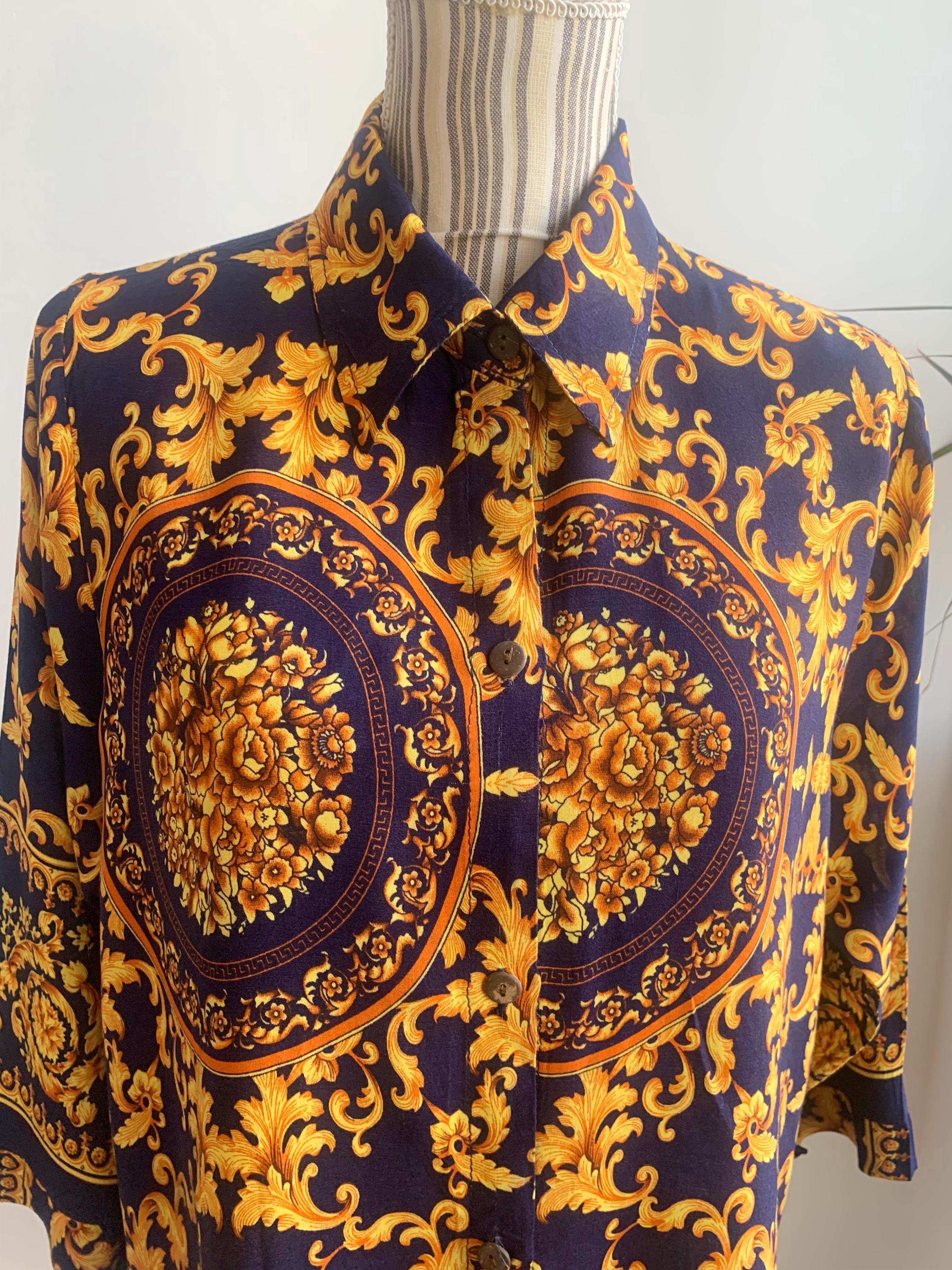 This is a vintage 90s baroque print blouse in navy blue and gold. Featuring a deep navy blue base accented by vibrant gold leaves and flowers ornate medallions, this collared button up shirt is the ultimate statement piece for lovers of maximalist aesthetics. The lightweight fabric (which feels like viscose/ rayon blend) offers a beautiful drape, making it perfect for tucking into high-waisted trousers or wearing loosely over leggings for a chic, retro look. The classic button-down front is complemented by elegant half sleeves, giving it a sophisticated silhouette that transitions effortlessly from office wear to evening outings.