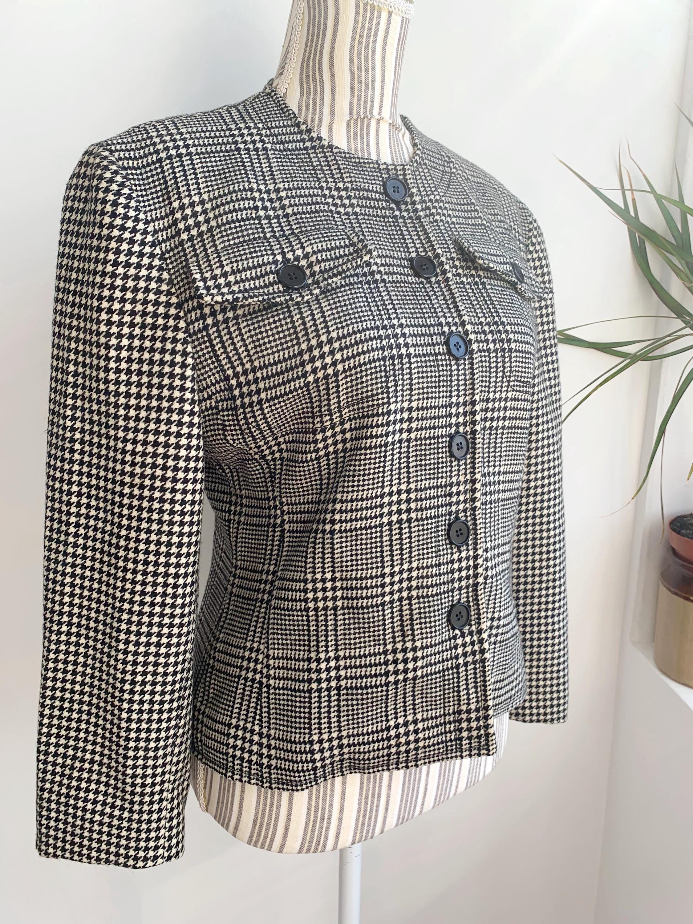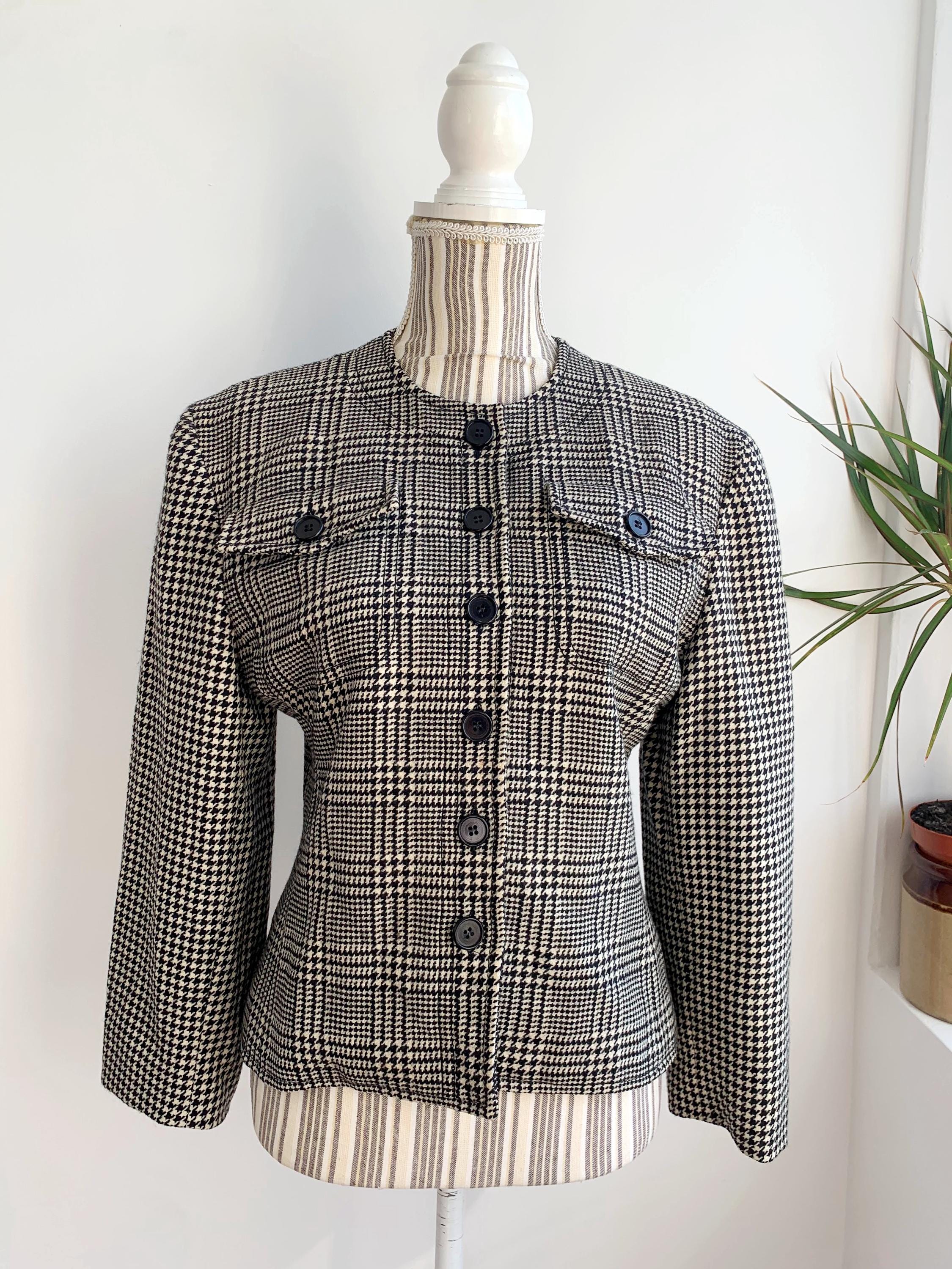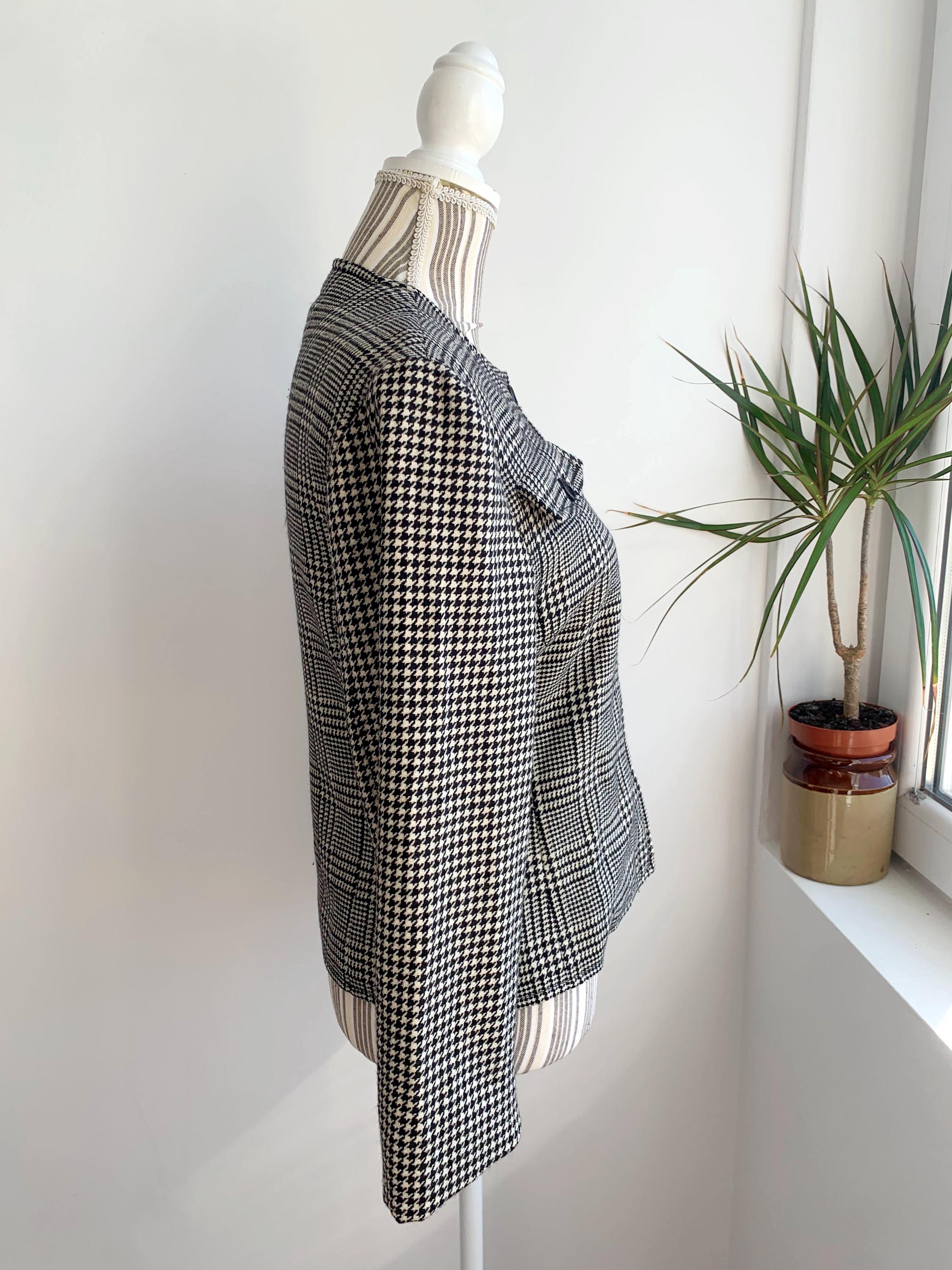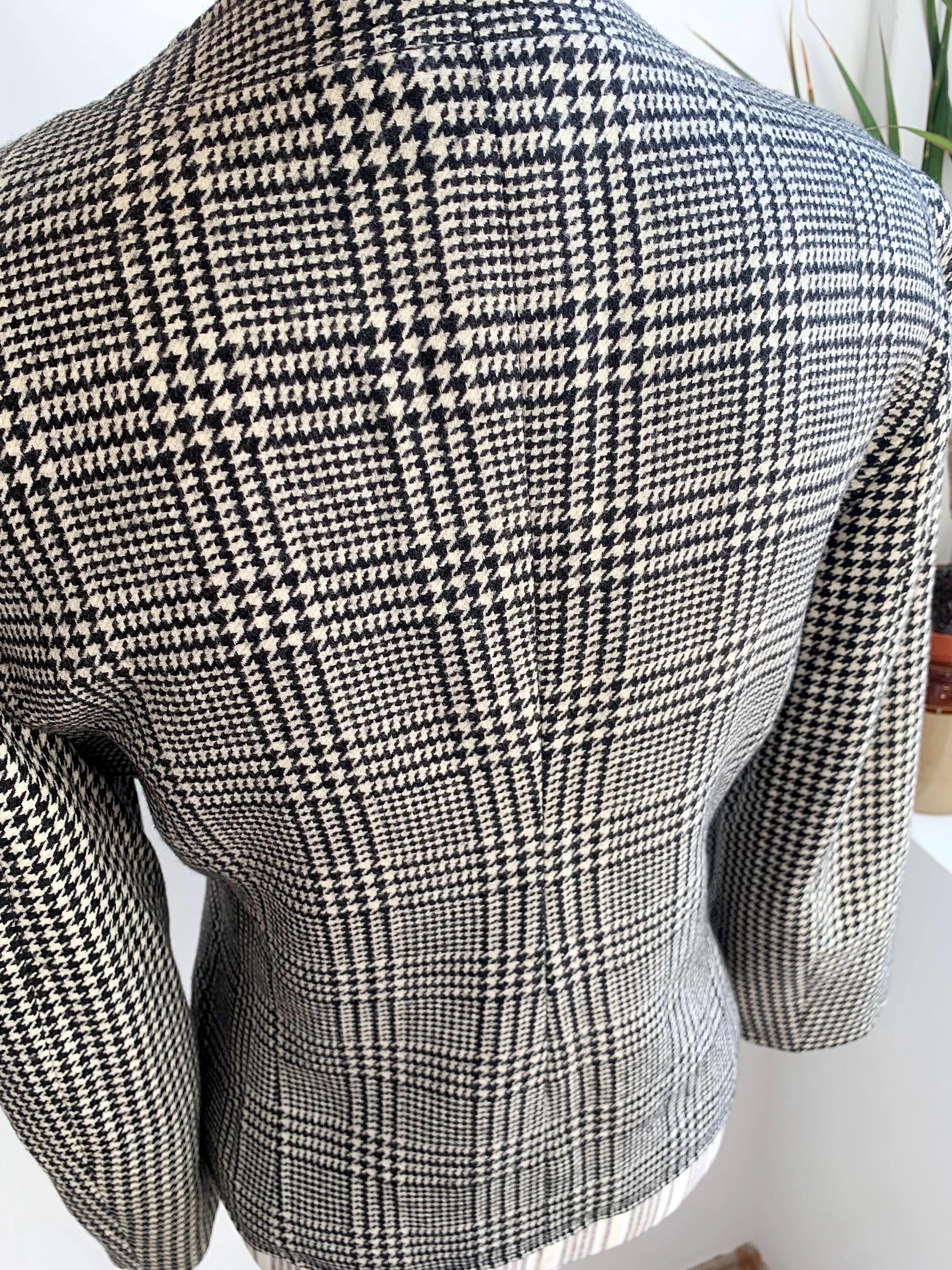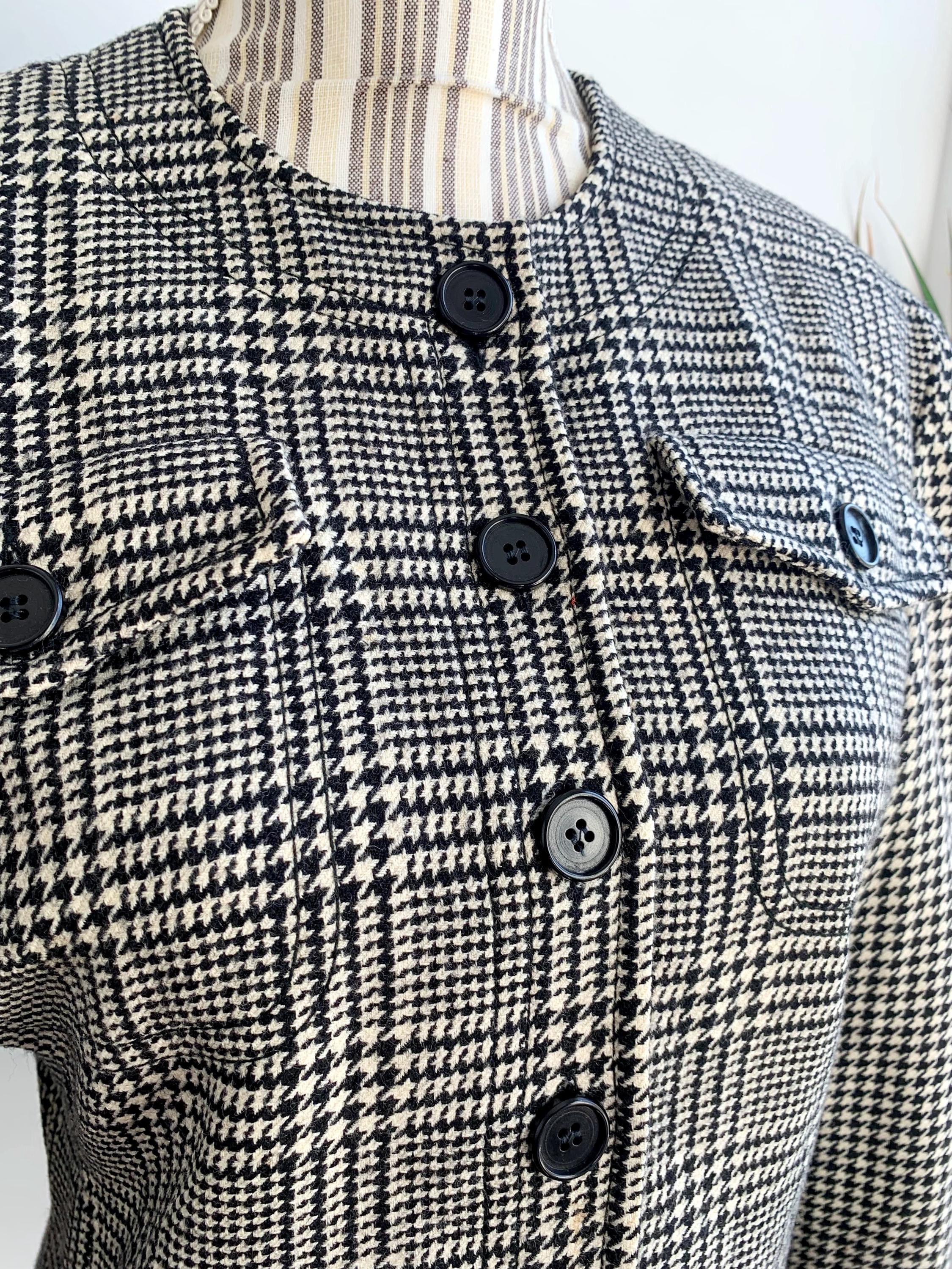 This pure wool blazer for women was crafted in Italy from 100% pure virgin wool. This wool jacket features a timeless black and white Glen plaid and houndstooth pattern that never goes out of style. The structured, collarless silhouette and decorative chest flaps offer a chic, minimalist aesthetic reminiscent of 90s designer tailoring.