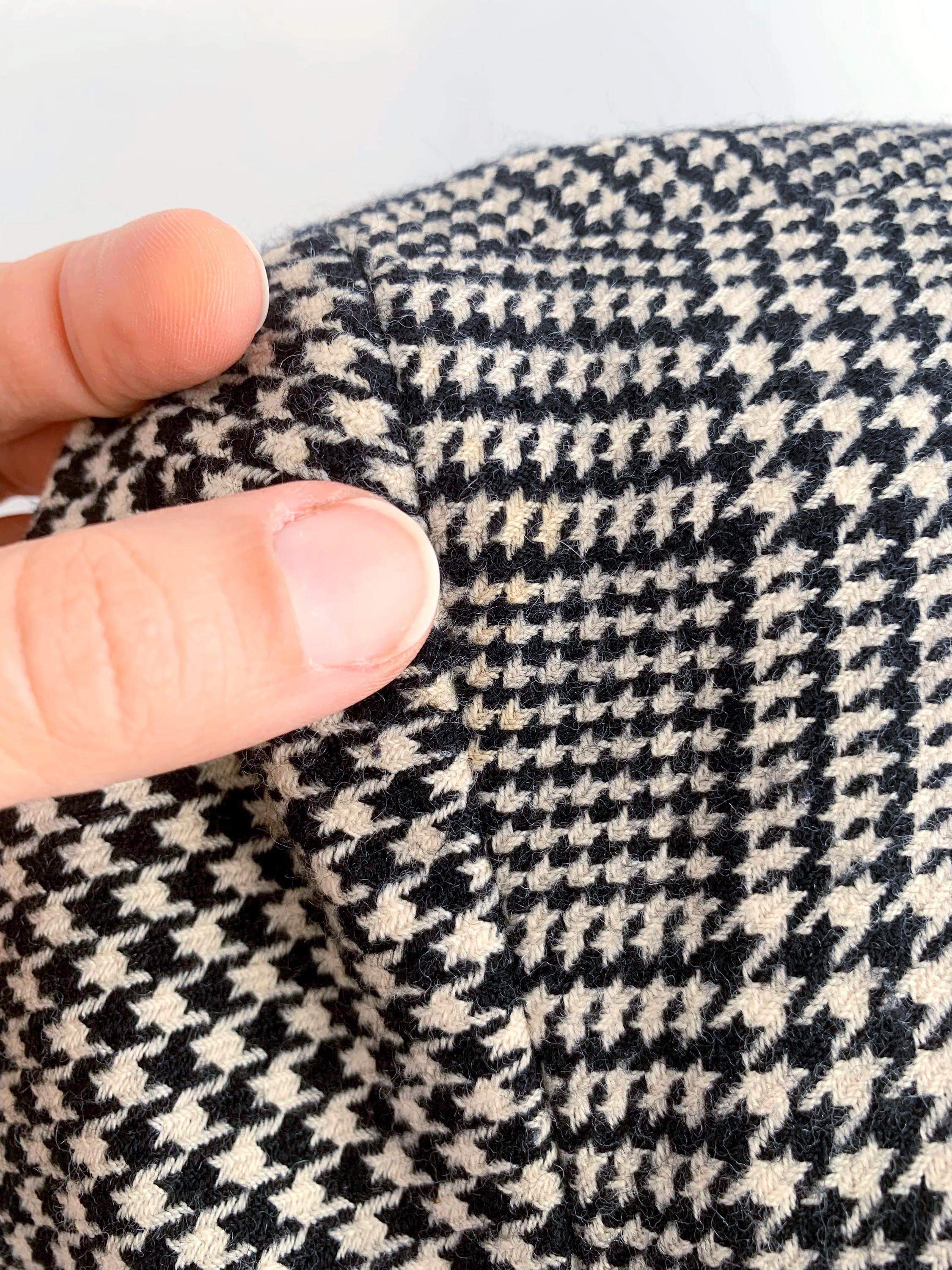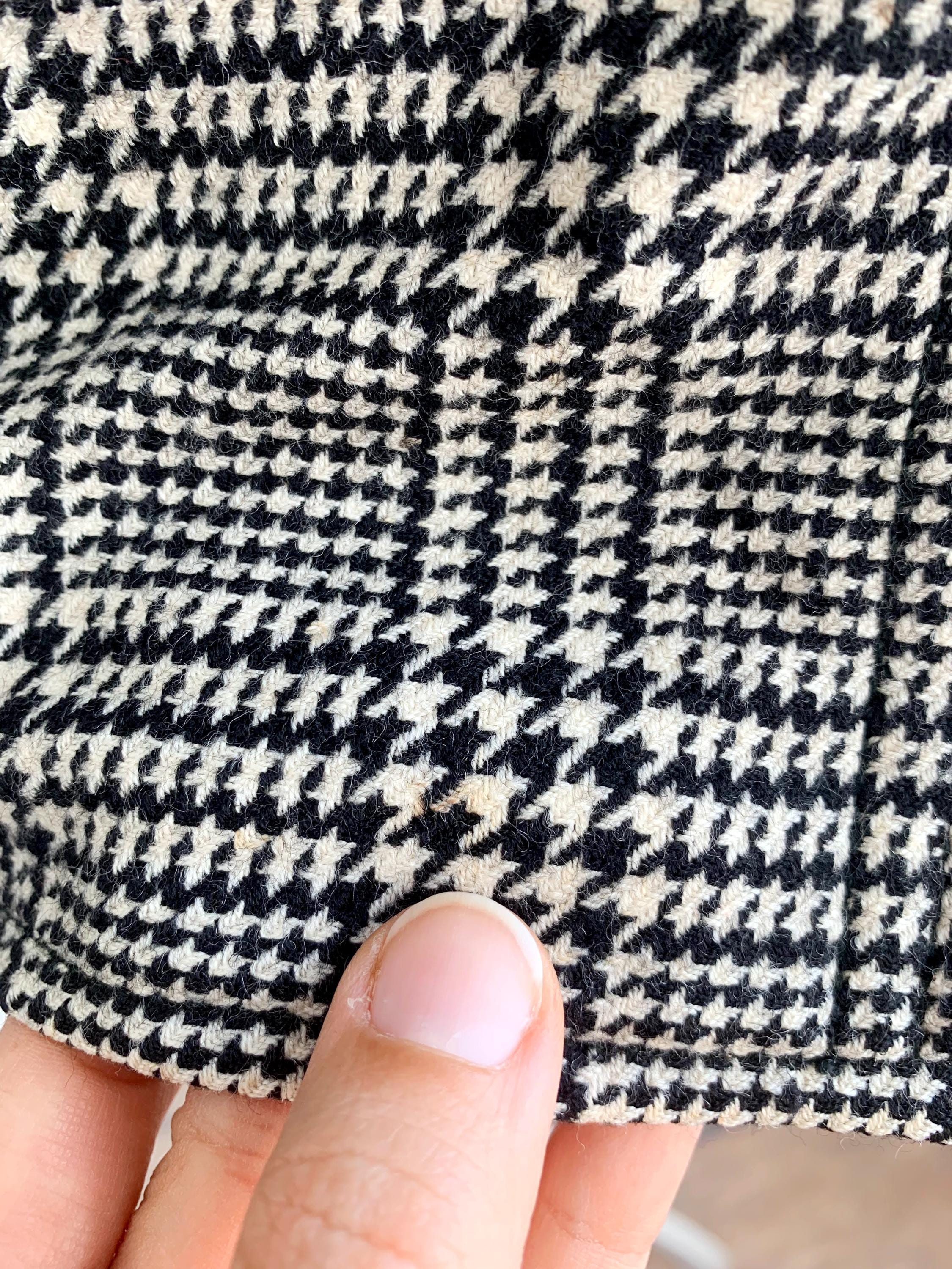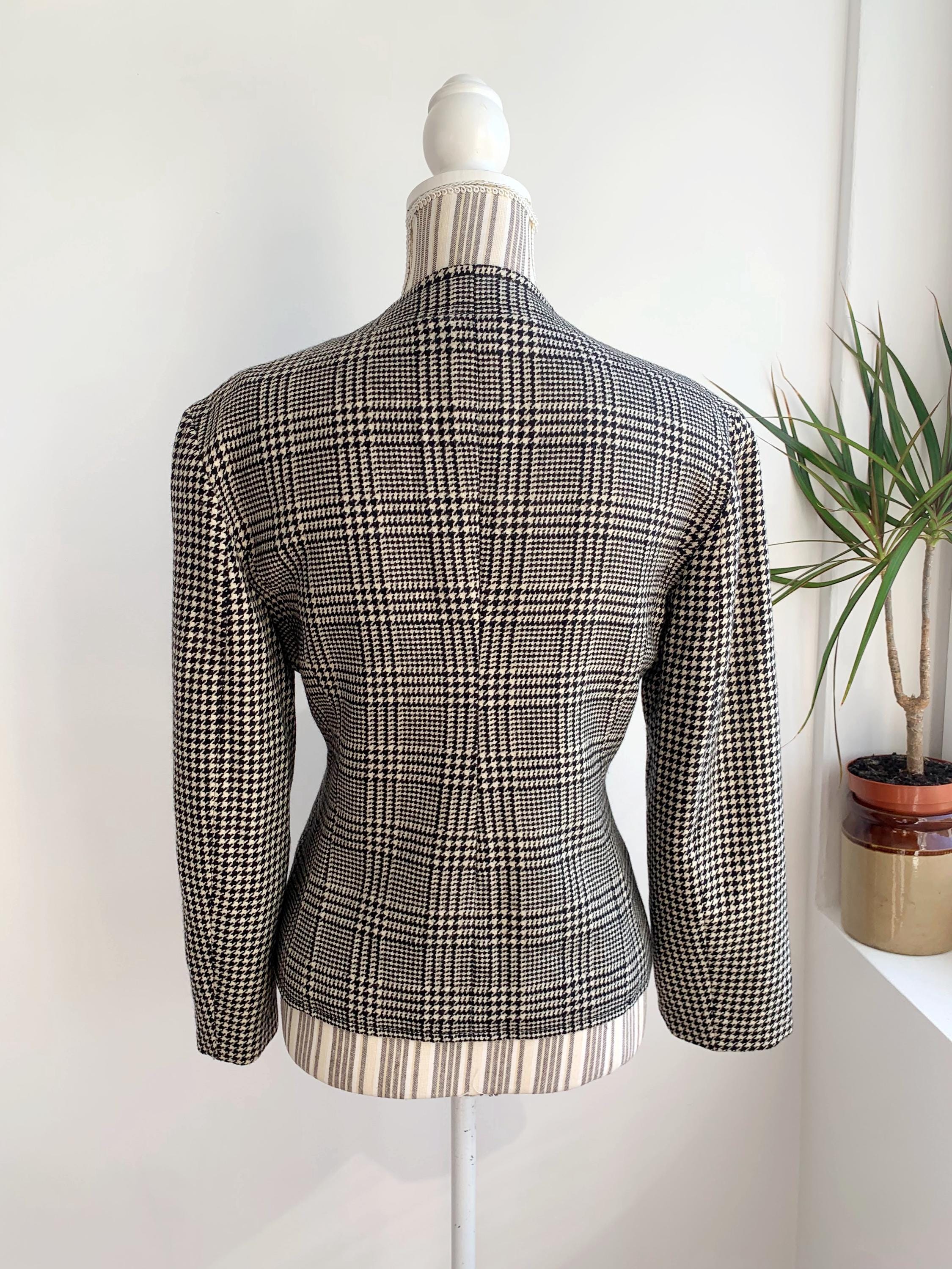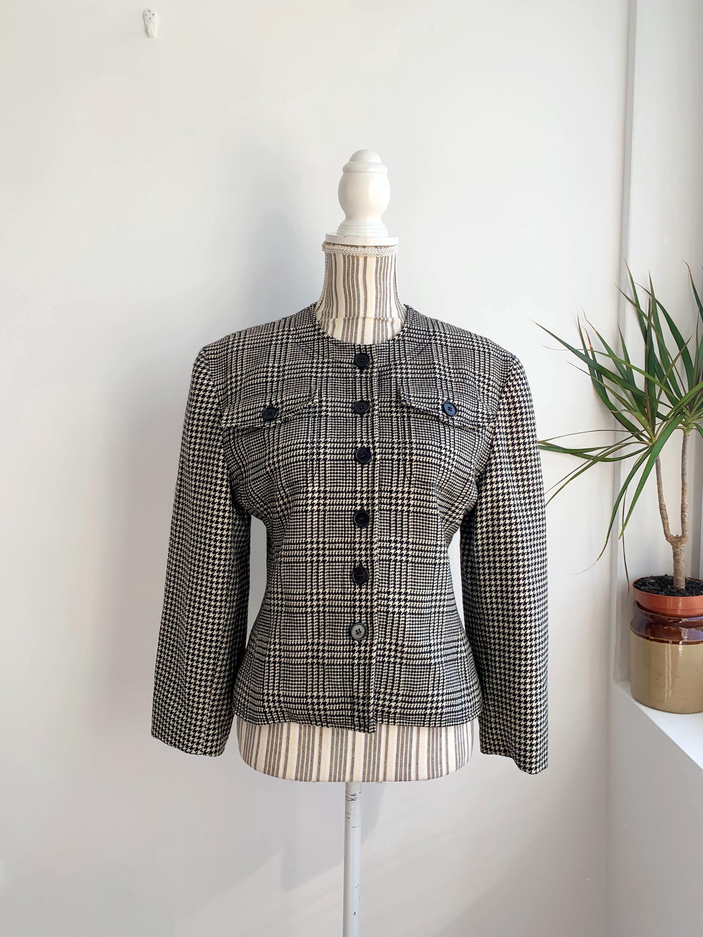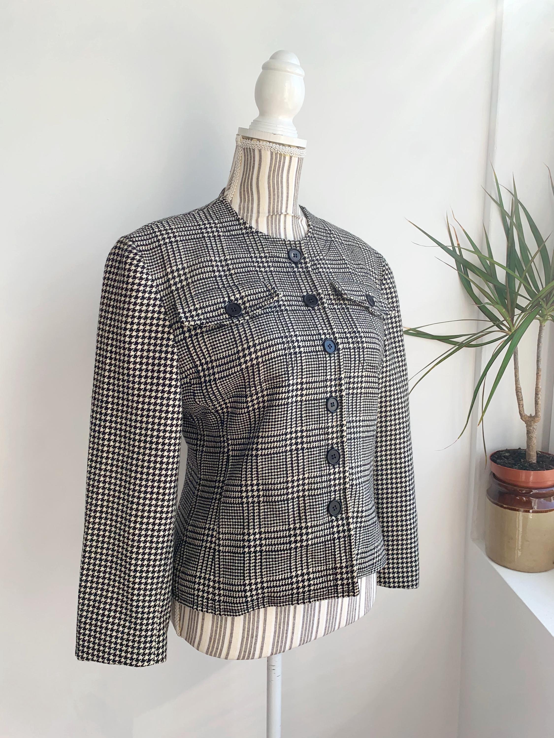 This pure wool blazer for women was crafted in Italy from 100% pure virgin wool. This wool jacket features a timeless black and white Glen plaid and houndstooth pattern that never goes out of style. The structured, collarless silhouette and decorative chest flaps offer a chic, minimalist aesthetic reminiscent of 90s designer tailoring.