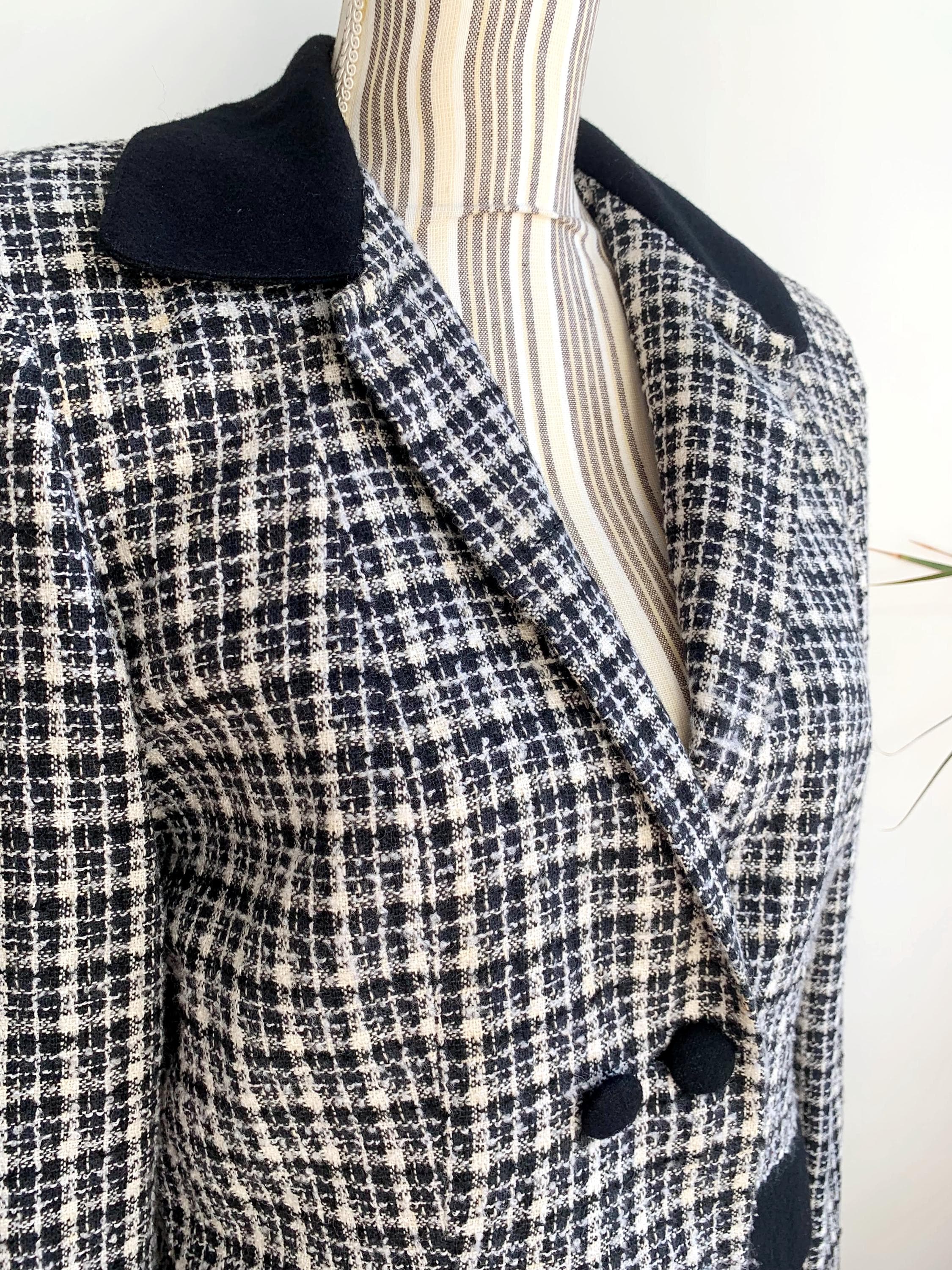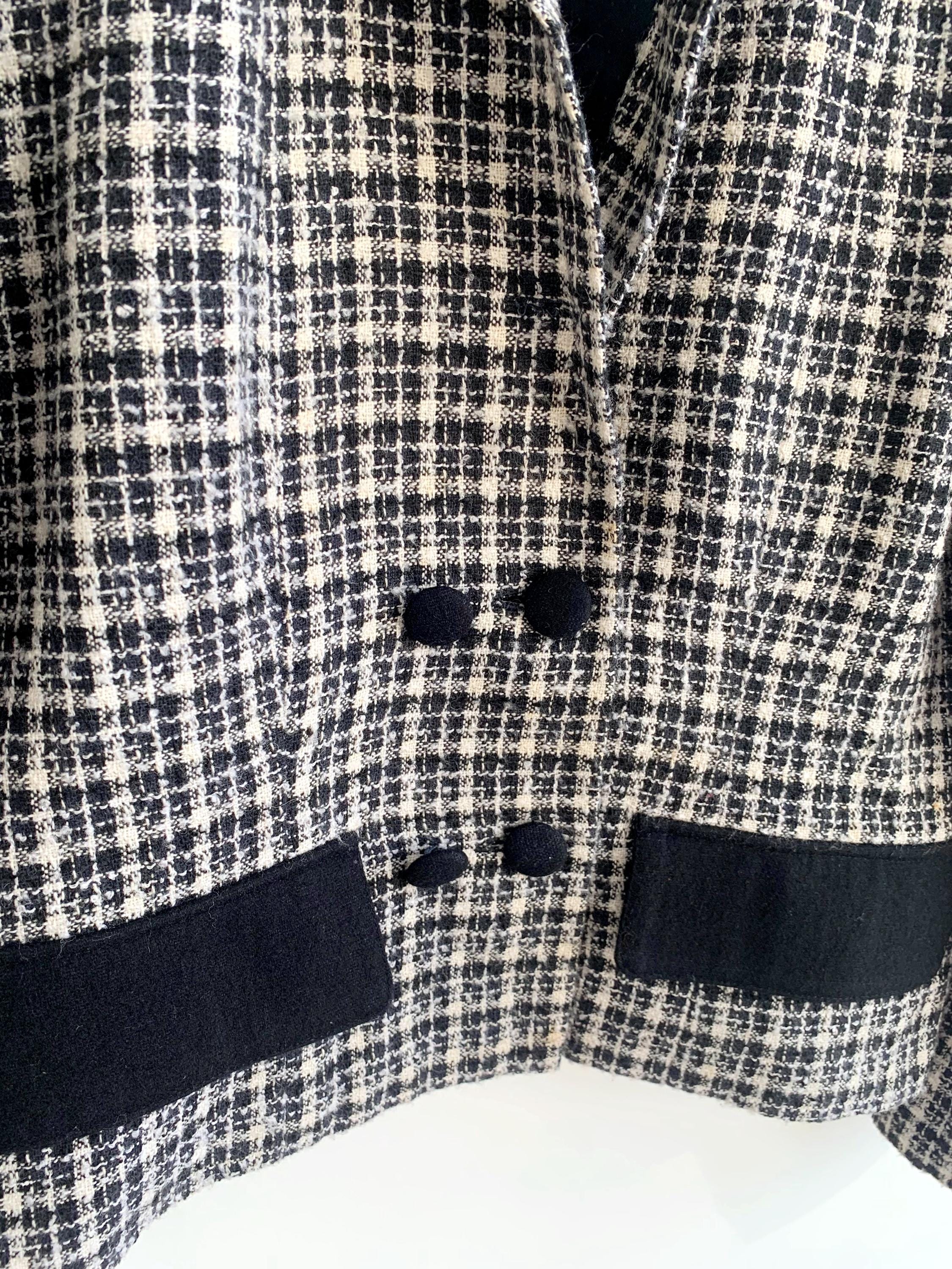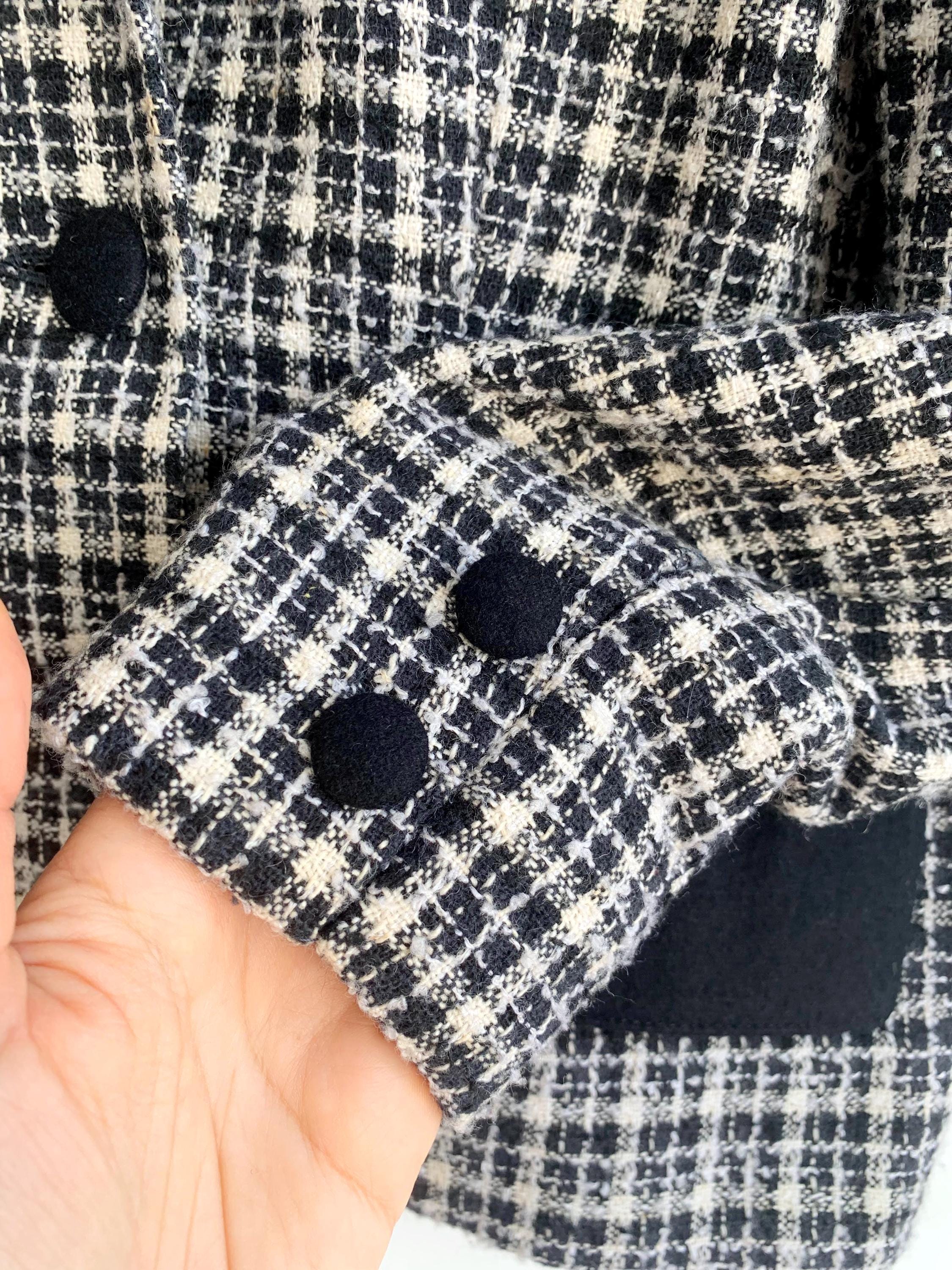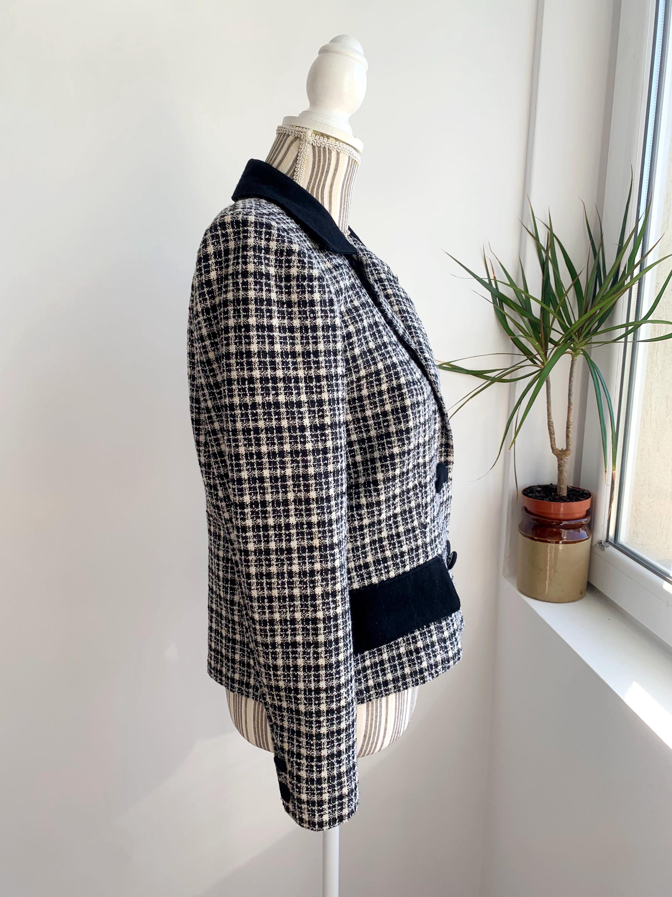 This is s beautiful vintage 90s textured plaid wool cropped coat made of tweed wool blend fabric. This monochrome tweed blazer jacket is made of cozy warm tweed fabric with solid black collor and pocket flaps ( imitation pockets). This black and white tweed wool blend jacket is perfect for the fall spring season. This classic 90s blazer is fully lined. You can also wear this tweed cropped coat in the warmer winter days with an oversized scarf and a warm hat. This fitted blazer coat has no tags or labels, it corresponds to size M women's. Please check the measurements below.