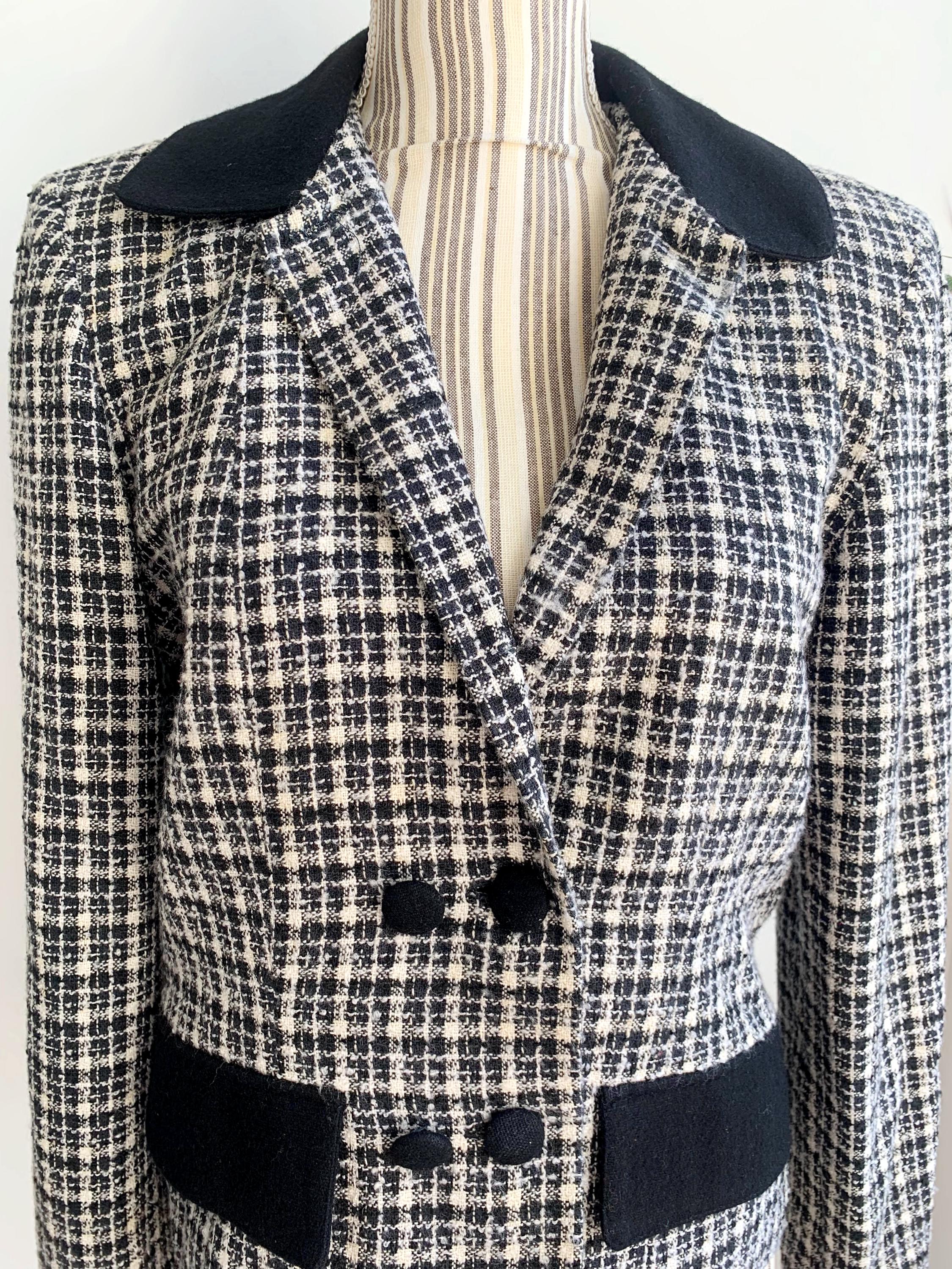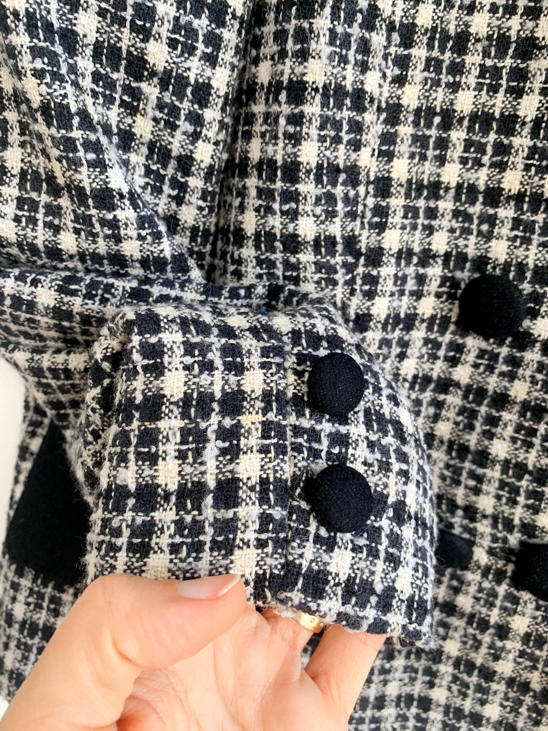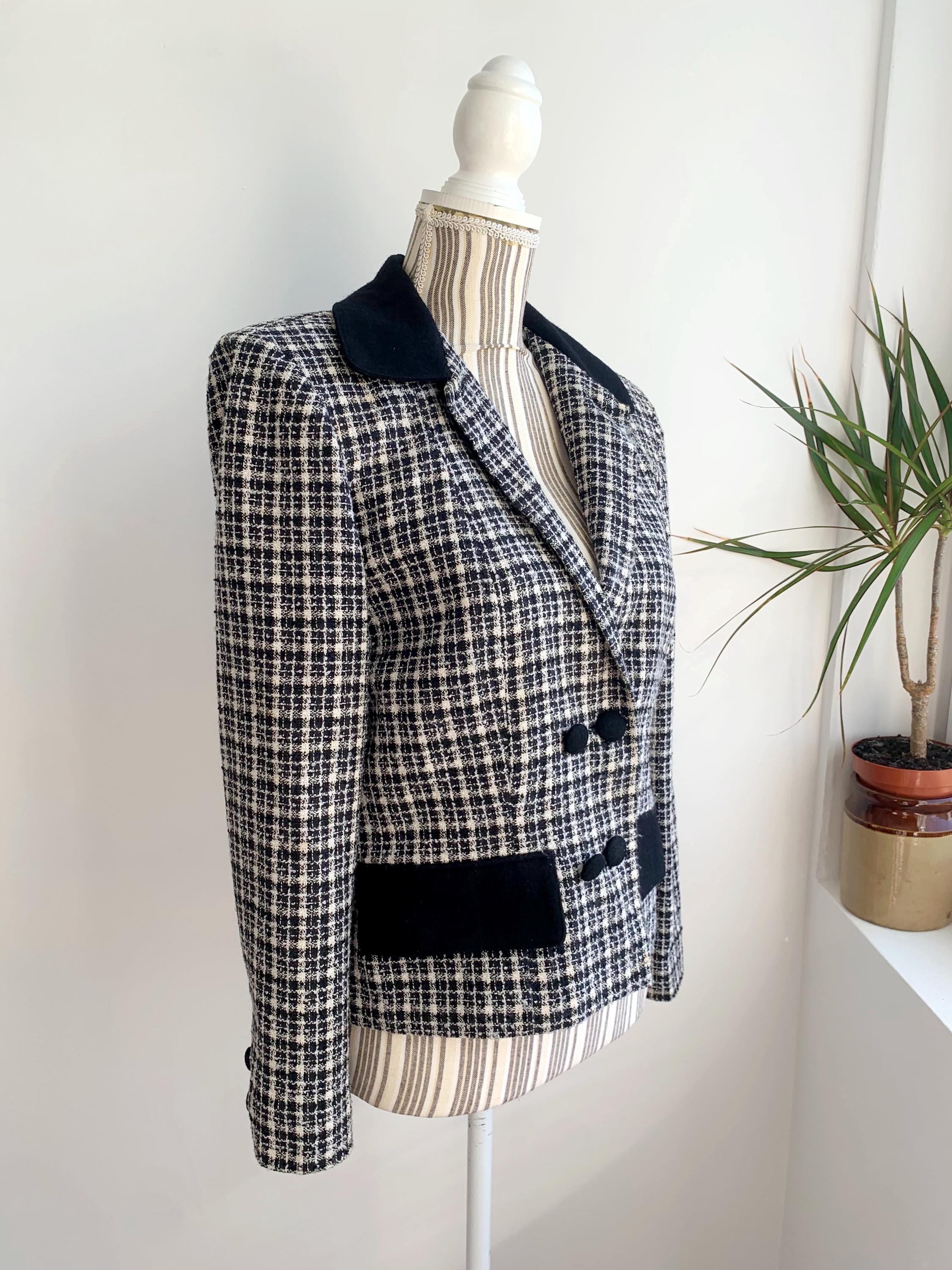 This is s beautiful vintage 90s textured plaid wool cropped coat made of tweed wool blend fabric. This monochrome tweed blazer jacket is made of cozy warm tweed fabric with solid black collor and pocket flaps ( imitation pockets). This black and white tweed wool blend jacket is perfect for the fall spring season. This classic 90s blazer is fully lined. You can also wear this tweed cropped coat in the warmer winter days with an oversized scarf and a warm hat. This fitted blazer coat has no tags or labels, it corresponds to size M women's. Please check the measurements below.