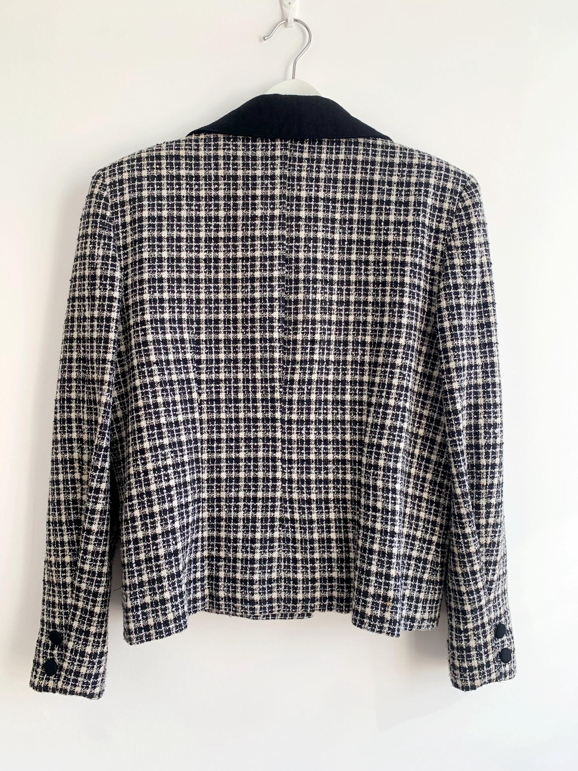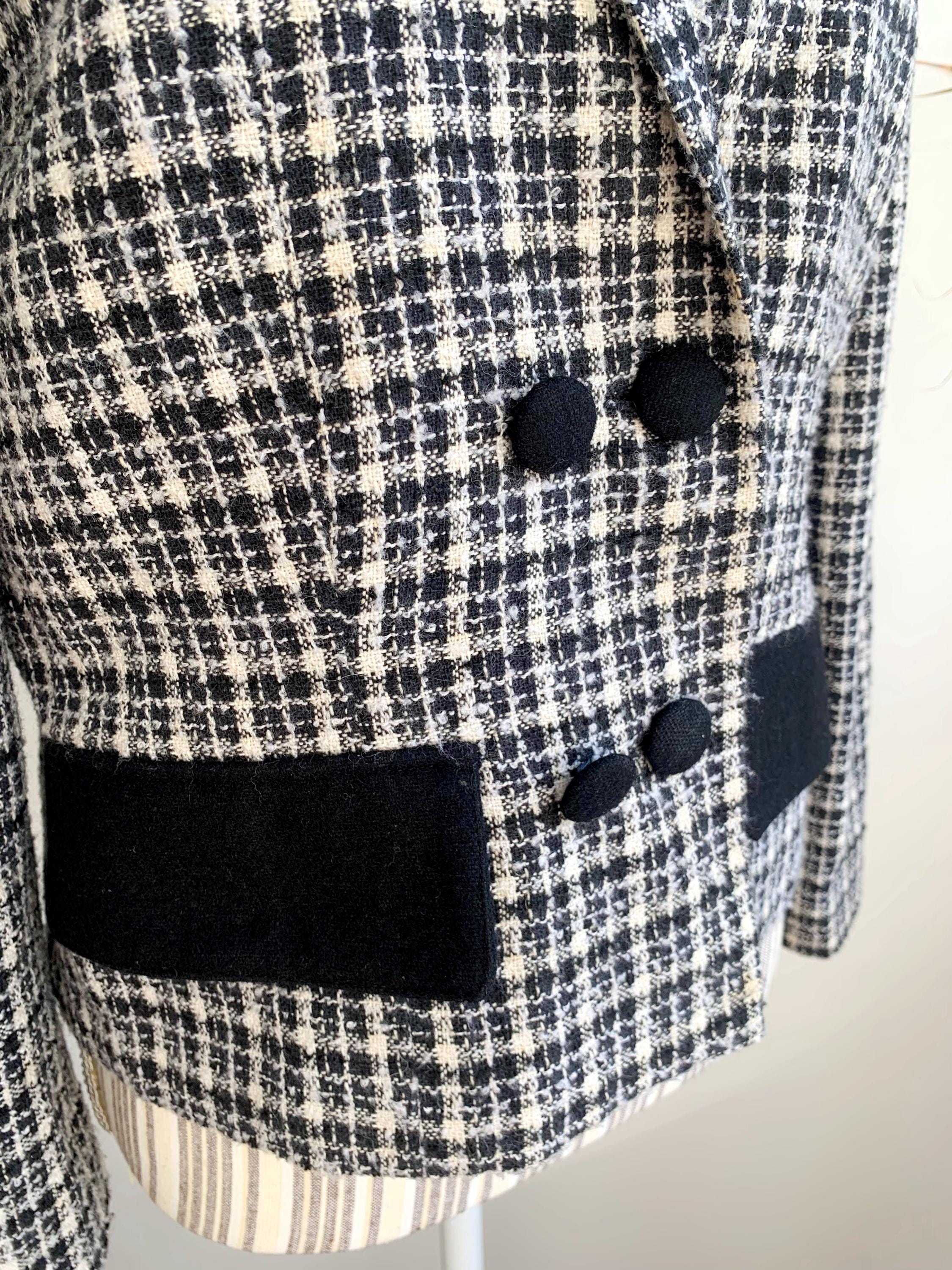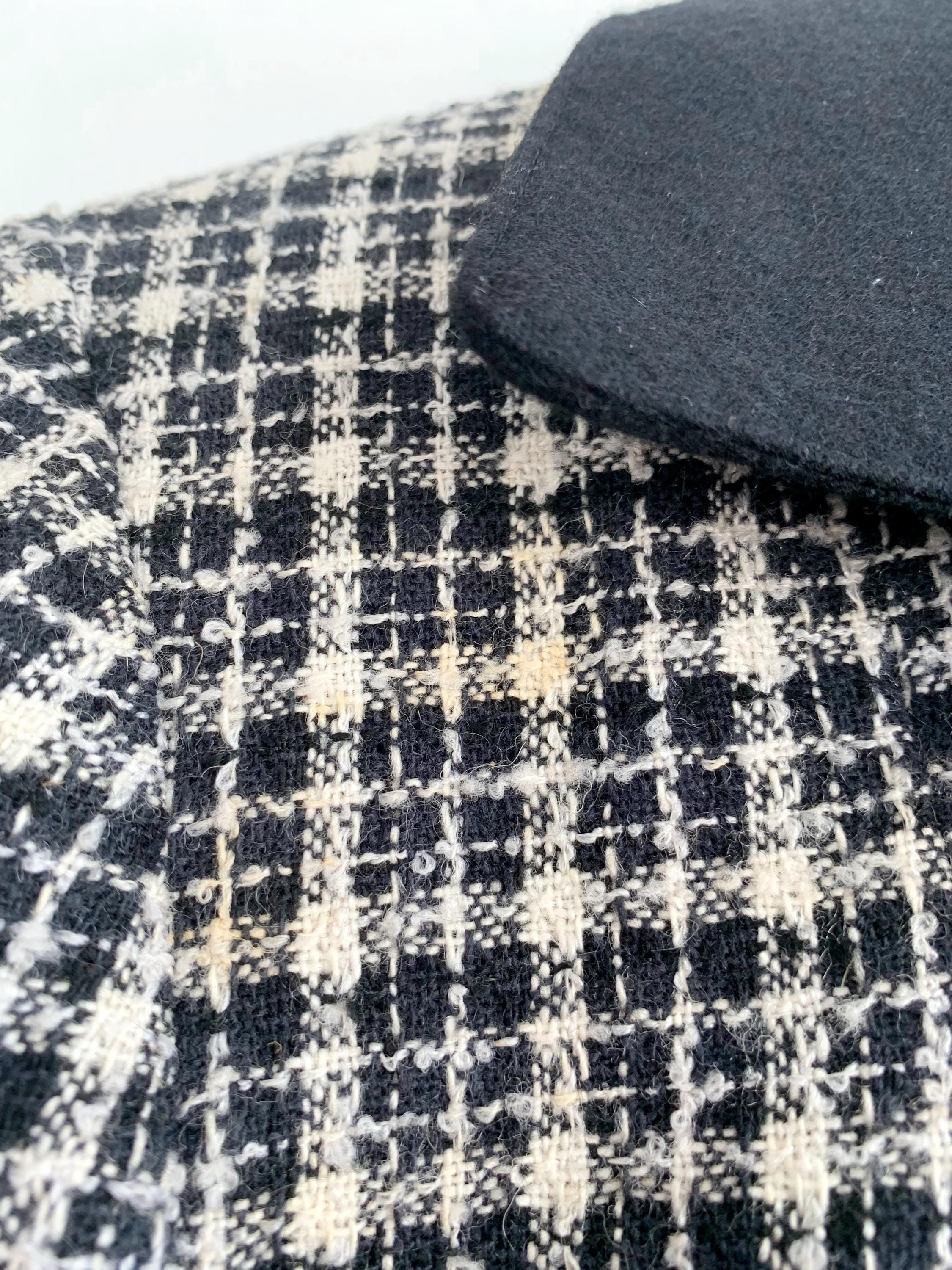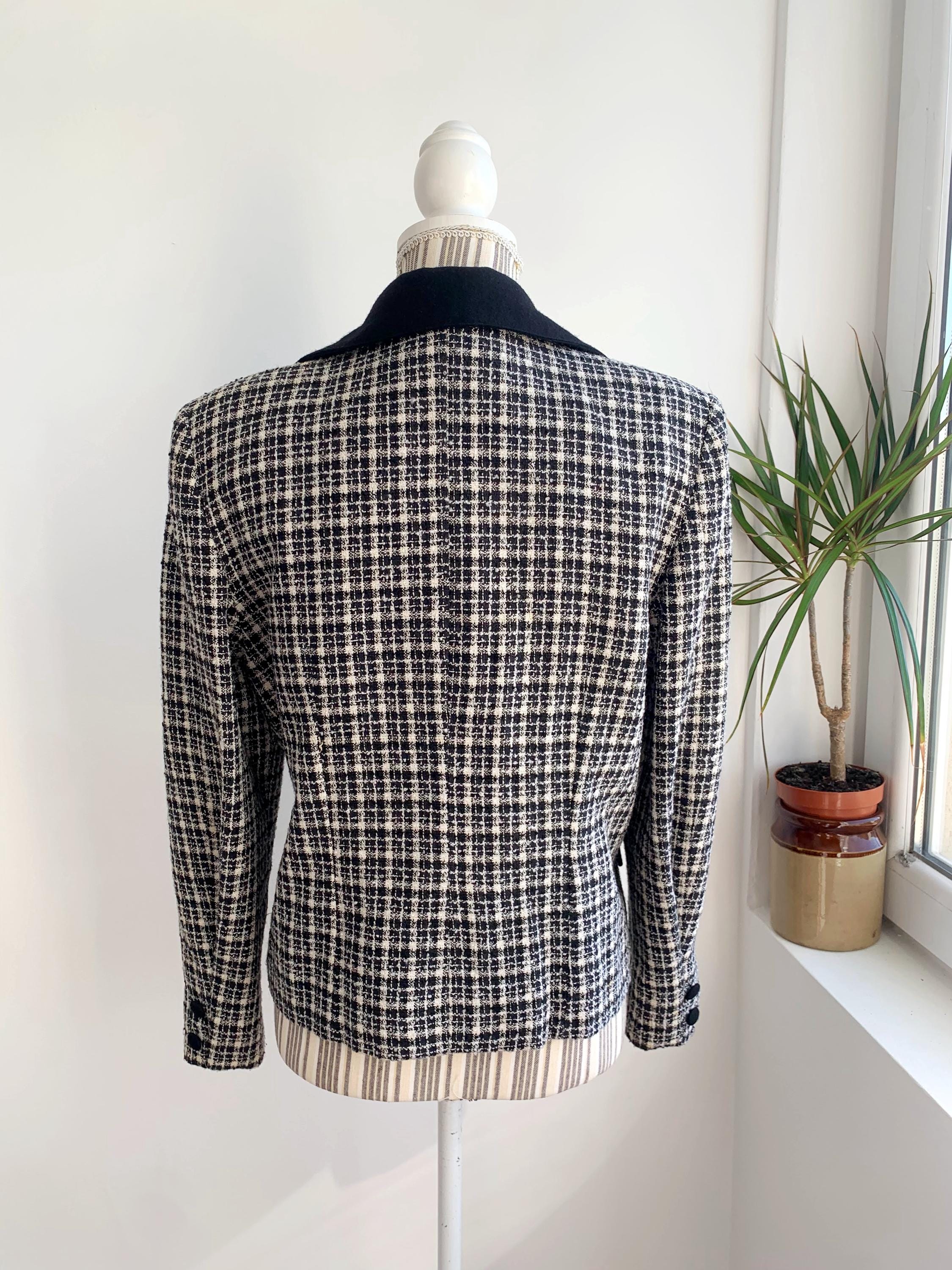 This is s beautiful vintage 90s textured plaid wool cropped coat made of tweed wool blend fabric. This monochrome tweed blazer jacket is made of cozy warm tweed fabric with solid black collor and pocket flaps ( imitation pockets). This black and white tweed wool blend jacket is perfect for the fall spring season. This classic 90s blazer is fully lined. You can also wear this tweed cropped coat in the warmer winter days with an oversized scarf and a warm hat. This fitted blazer coat has no tags or labels, it corresponds to size M women's. Please check the measurements below.