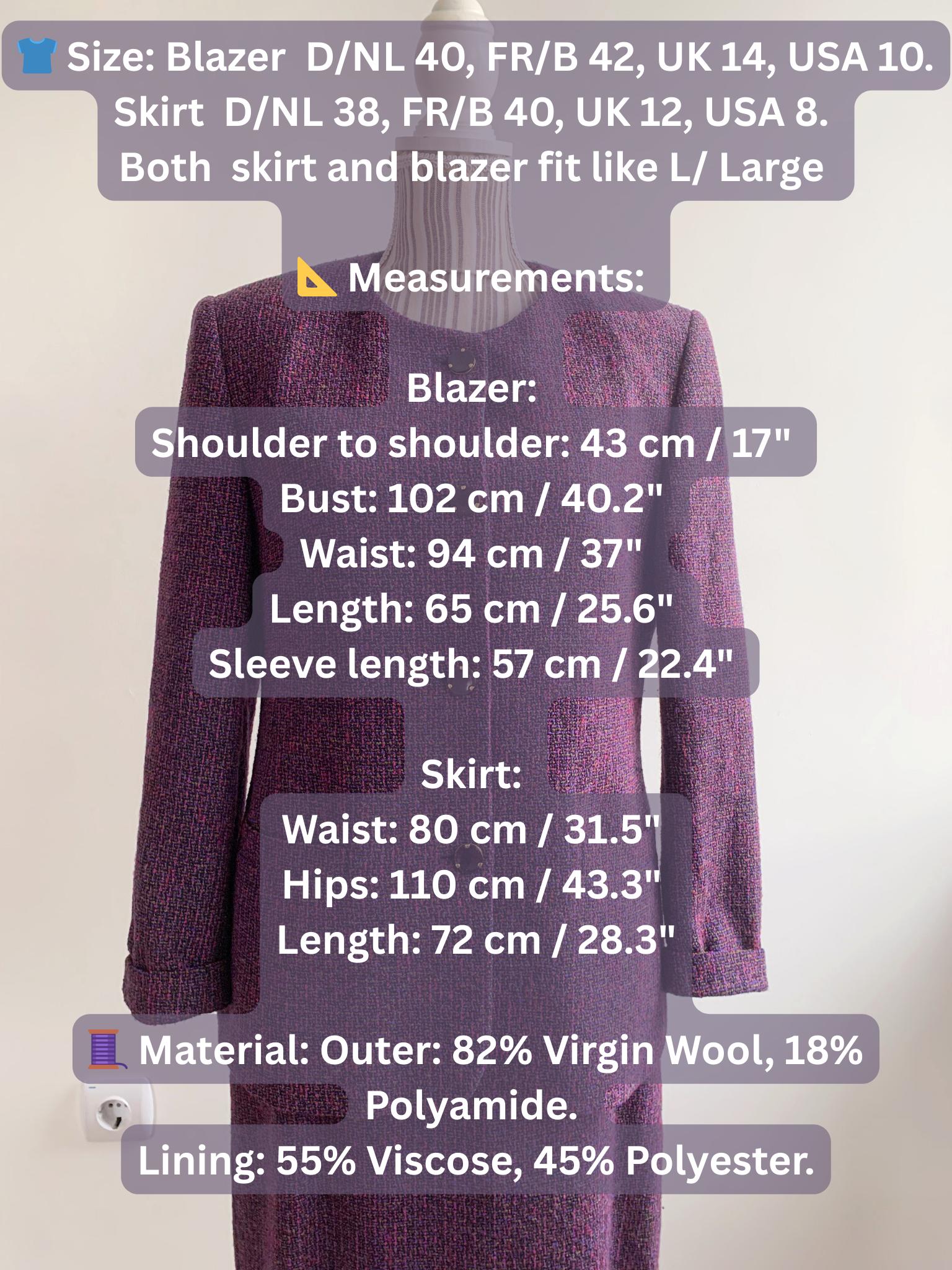 👕 Size: Blazer labeled as D/NL 40, FR/B 42, UK 14, USA 10. Skirt labeled as D/NL 38, FR/B 40, UK 12, USA 8. Both the skirt and blazer fit like a modern Large (please check measurements).
