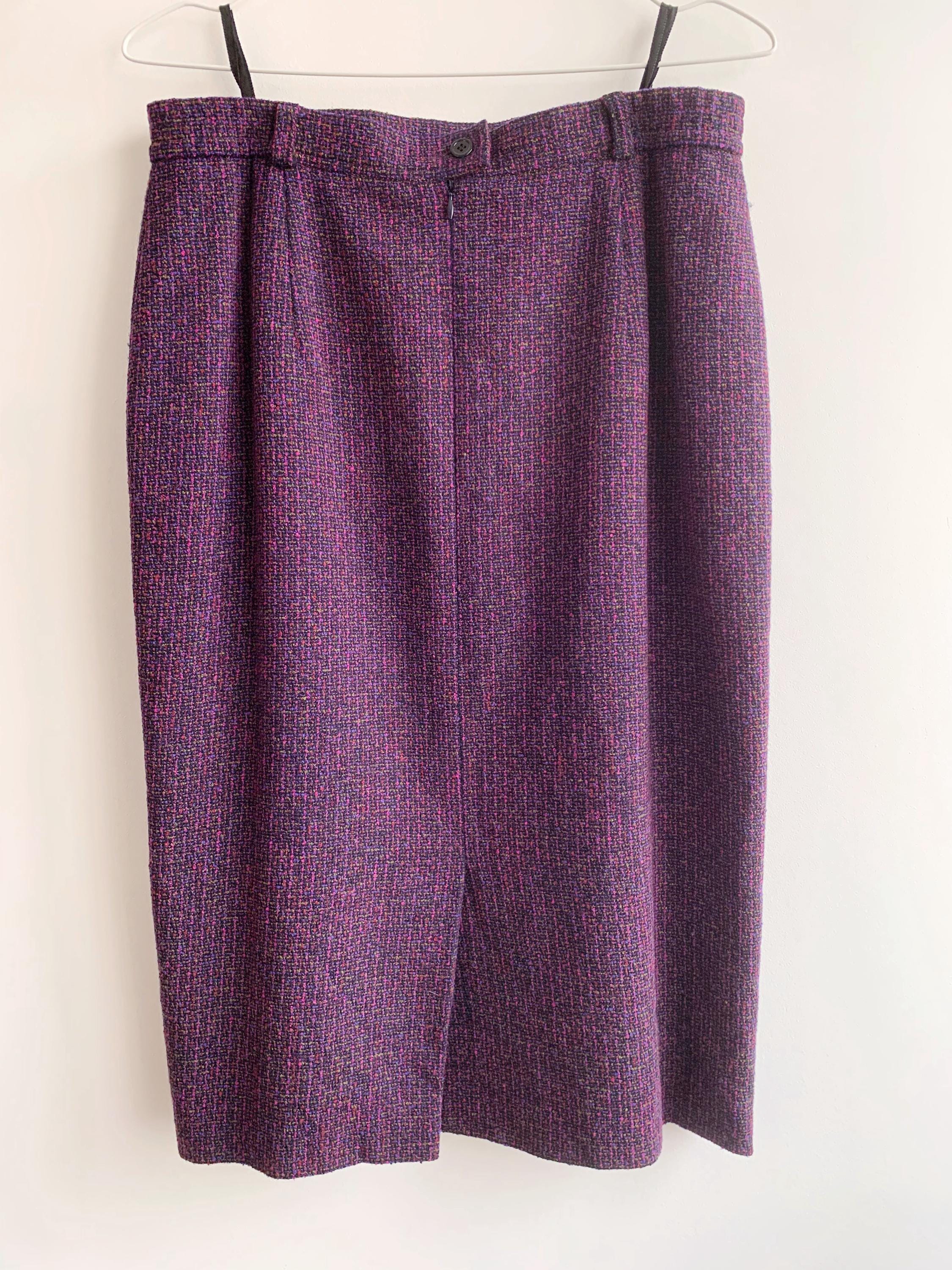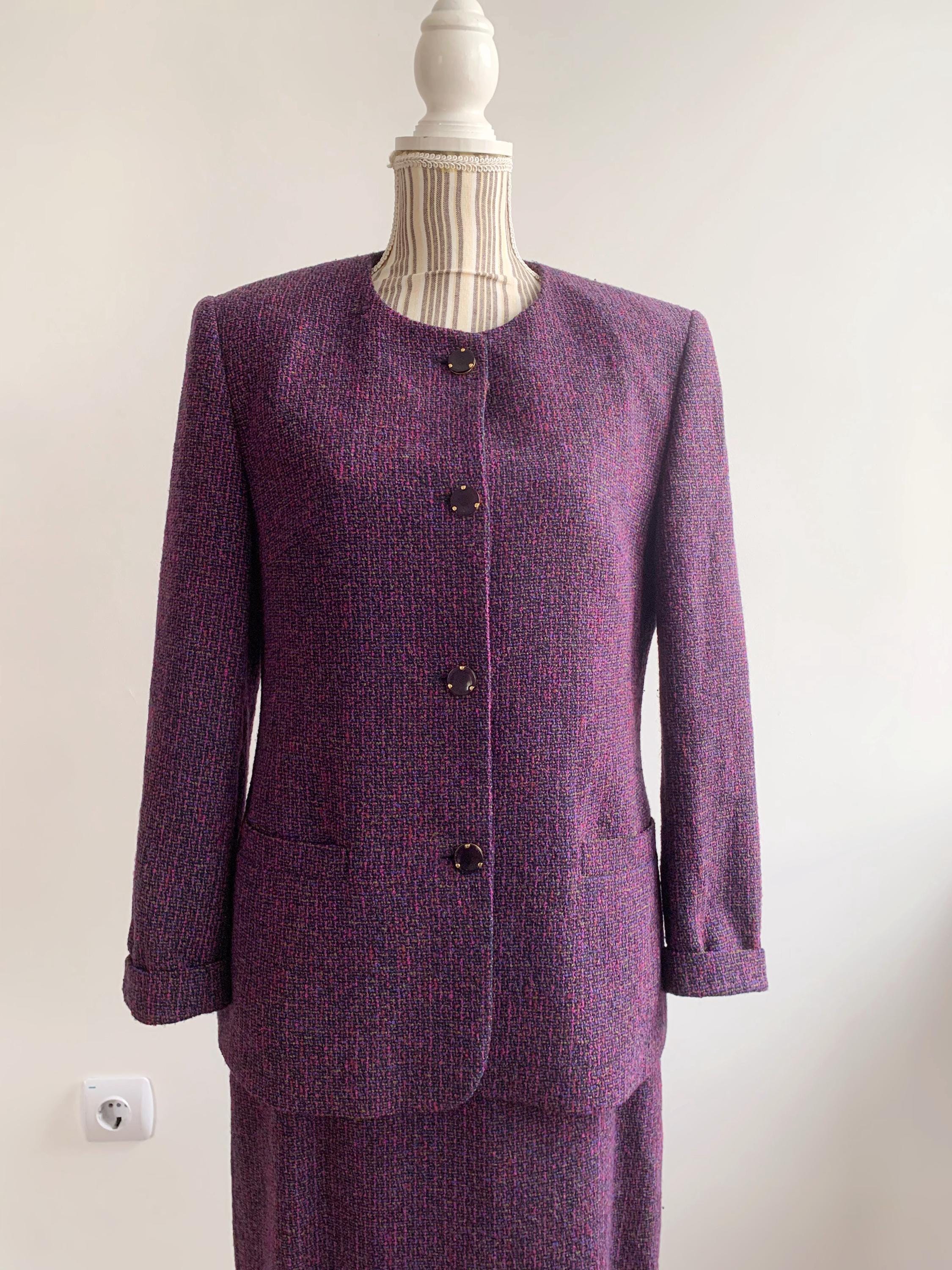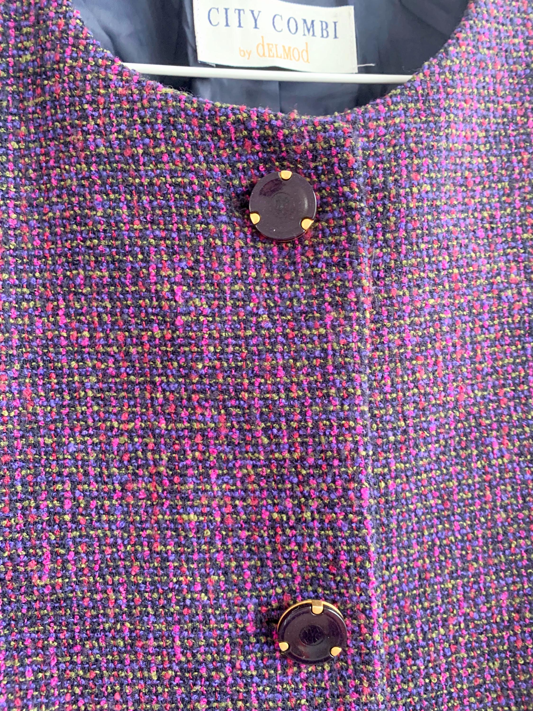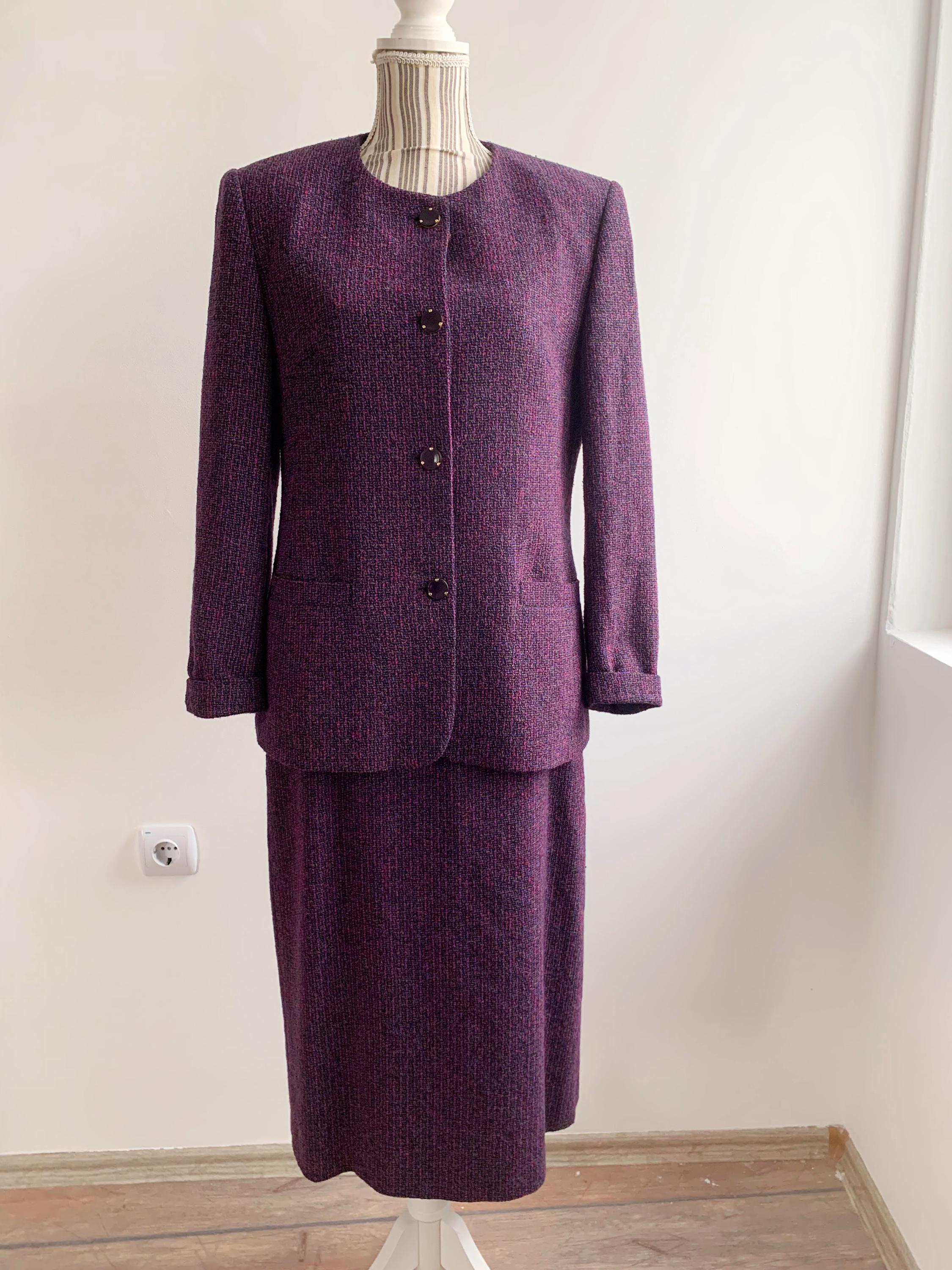 This is an exquisite vintage two-piece skirt suit by the renowned German brand Delmod (City Combi line) in size L is a masterclass in texture and color. Crafted from a premium virgin wool blend containing 82% wool and 18% polyamide, the tweed features a rich interplay of deep purple, fuchsia, and subtle emerald green flecks, creating a vibrant yet sophisticated look.