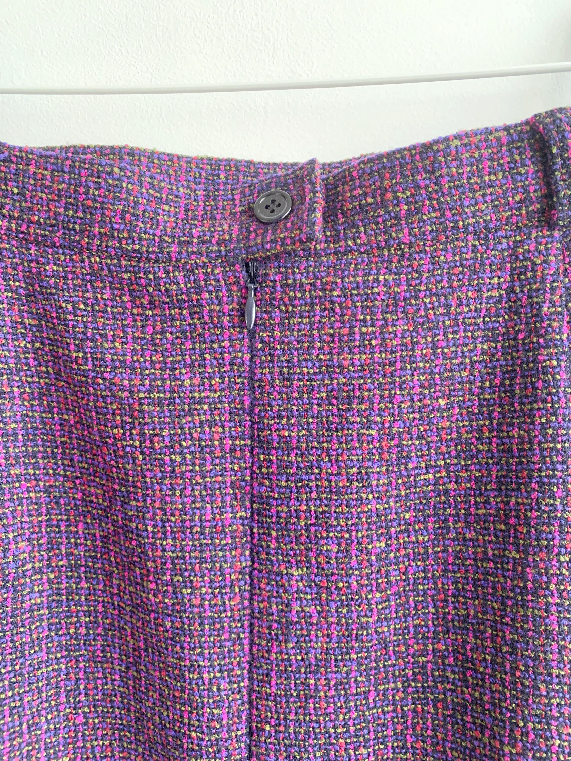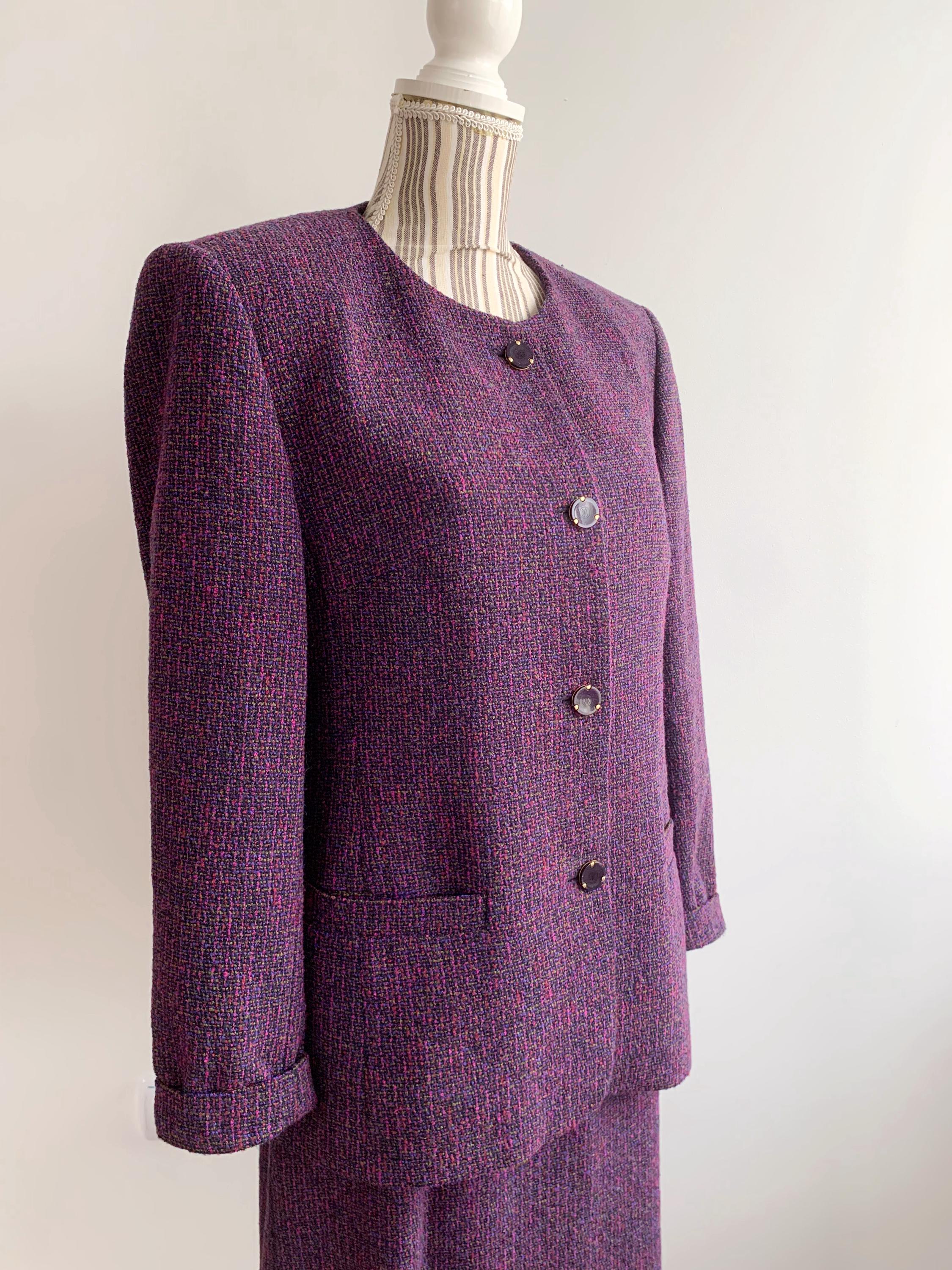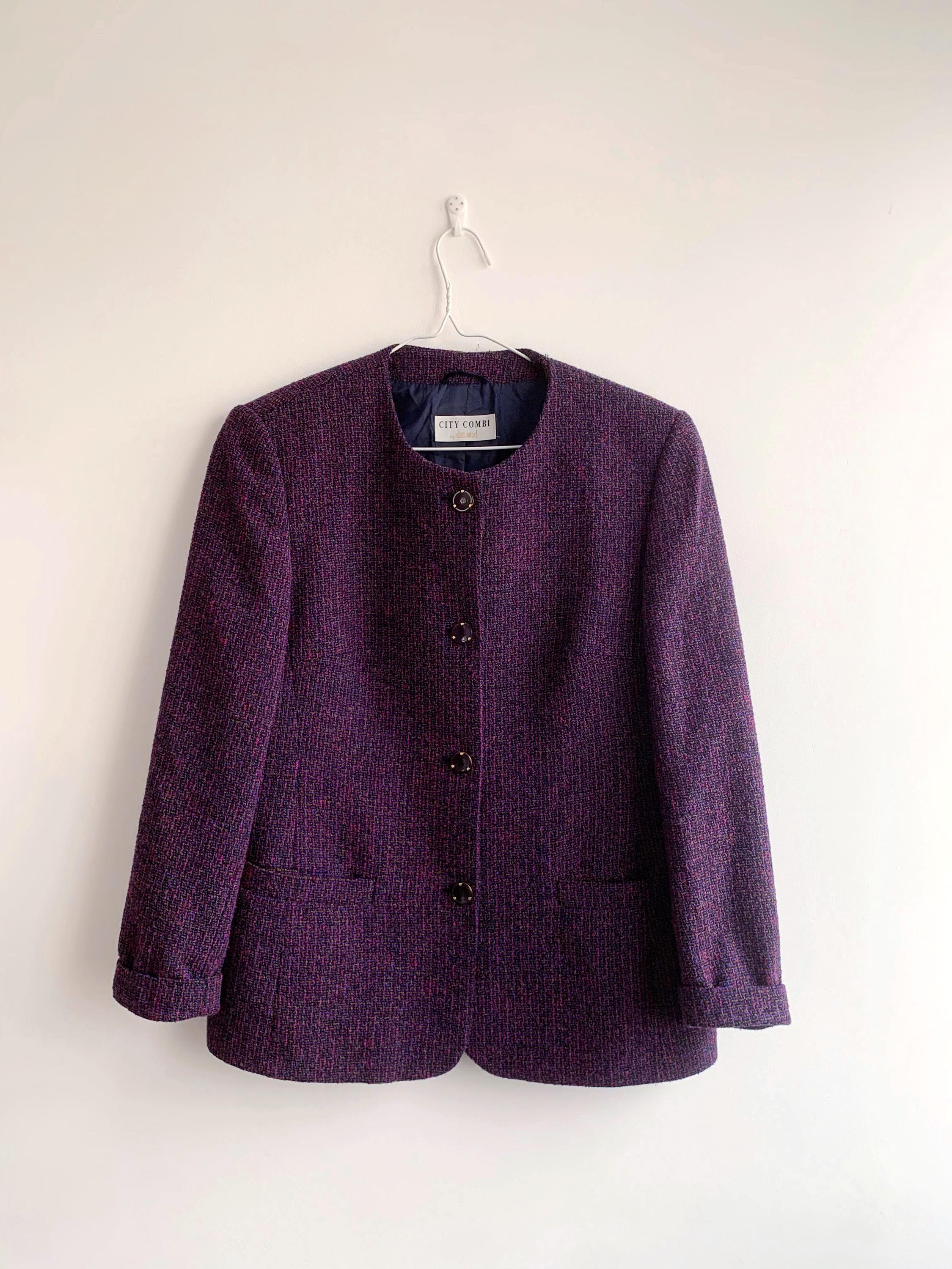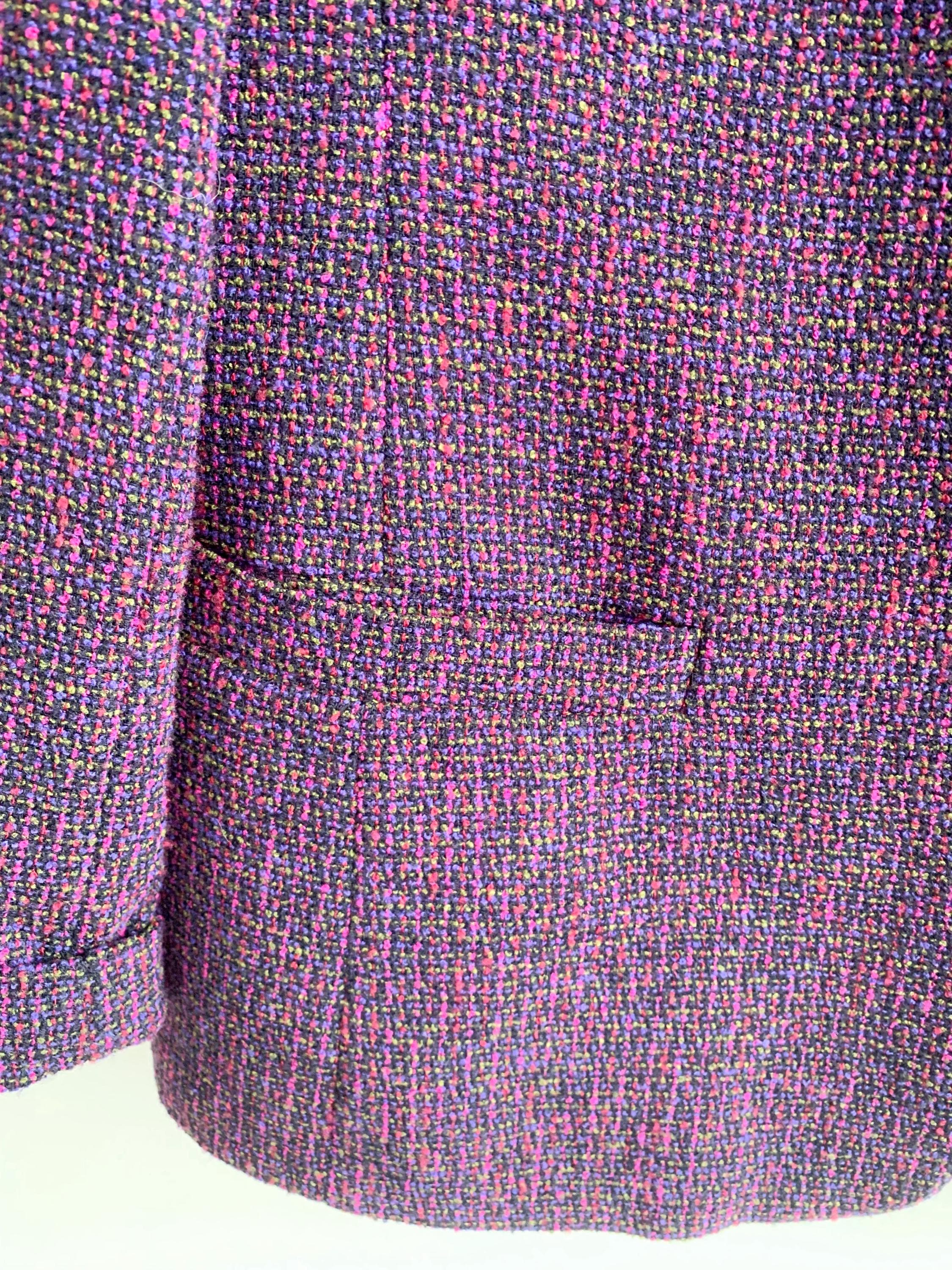 This is an exquisite vintage two-piece skirt suit by the renowned German brand Delmod (City Combi line) in size L is a masterclass in texture and color. Crafted from a premium virgin wool blend containing 82% wool and 18% polyamide, the tweed features a rich interplay of deep purple, fuchsia, and subtle emerald green flecks, creating a vibrant yet sophisticated look.