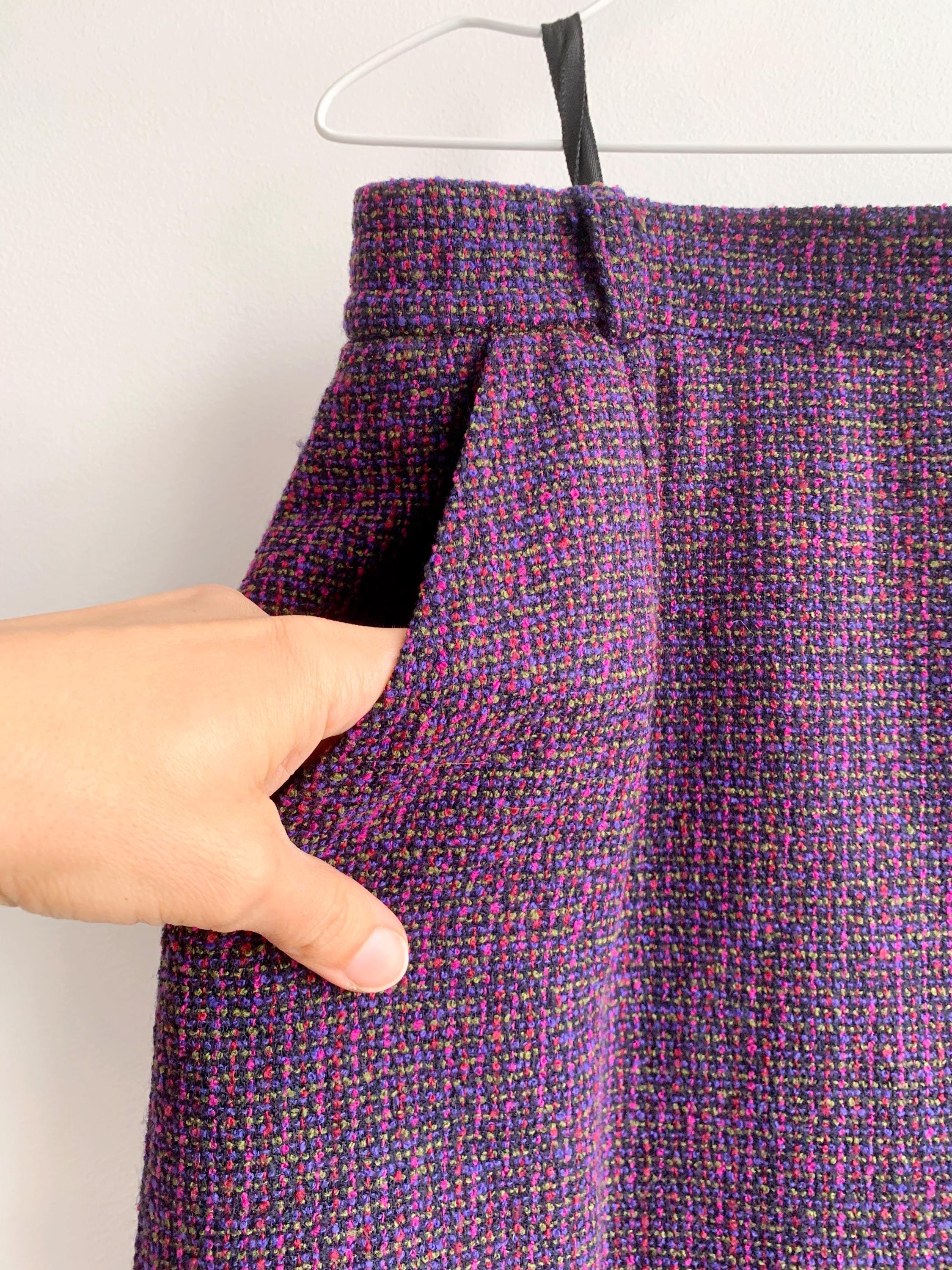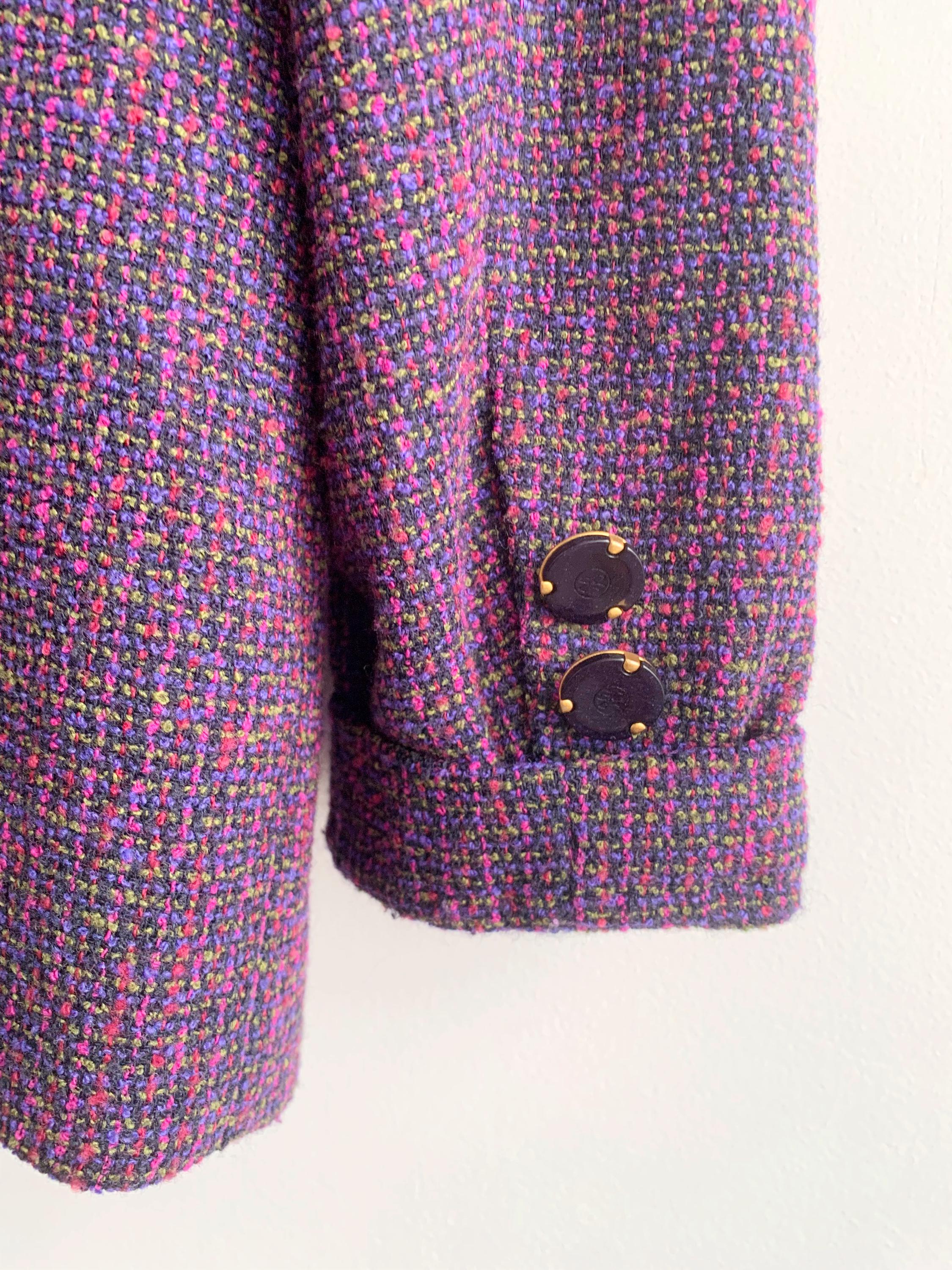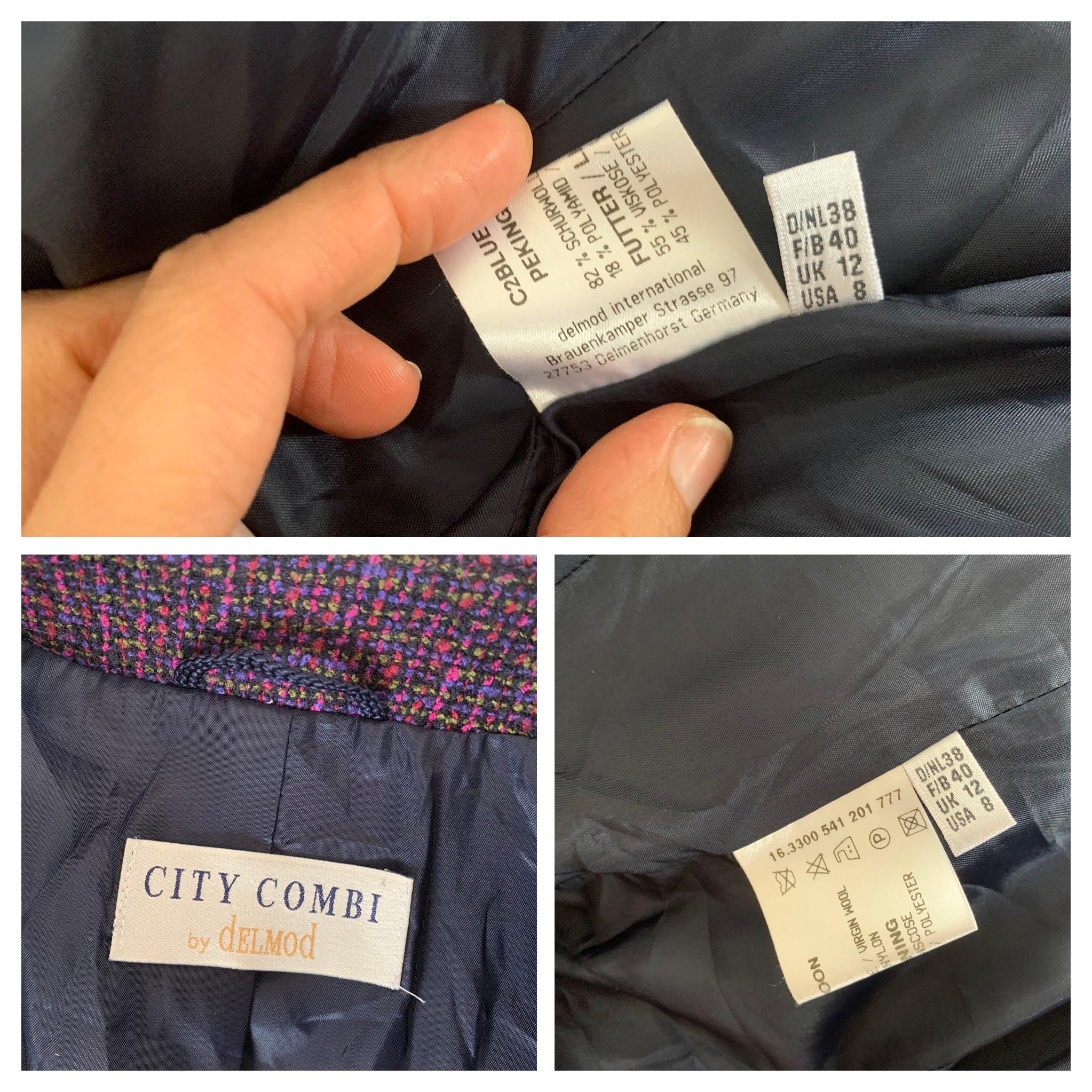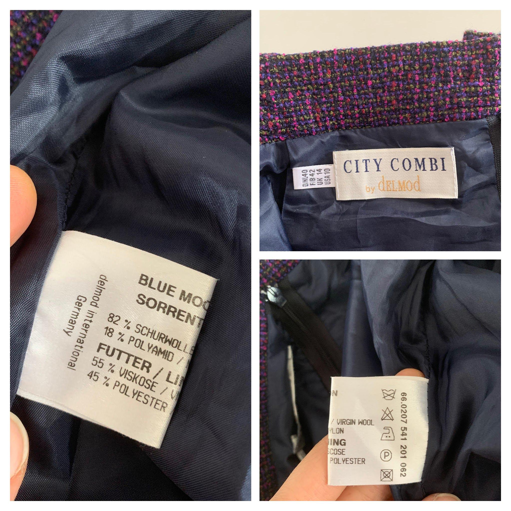 This is an exquisite vintage two-piece skirt suit by the renowned German brand Delmod (City Combi line) in size L is a masterclass in texture and color. Crafted from a premium virgin wool blend containing 82% wool and 18% polyamide, the tweed features a rich interplay of deep purple, fuchsia, and subtle emerald green flecks, creating a vibrant yet sophisticated look.