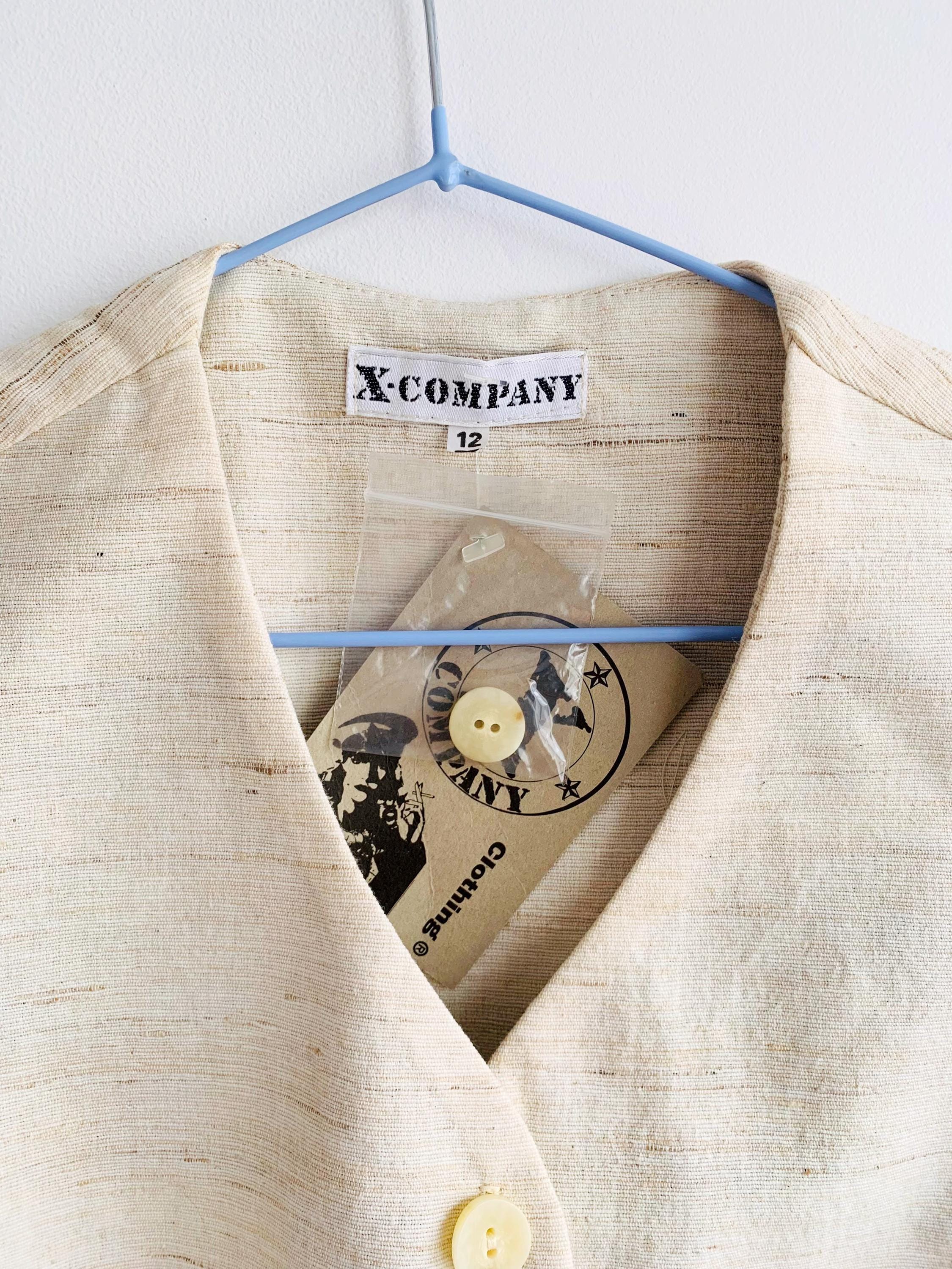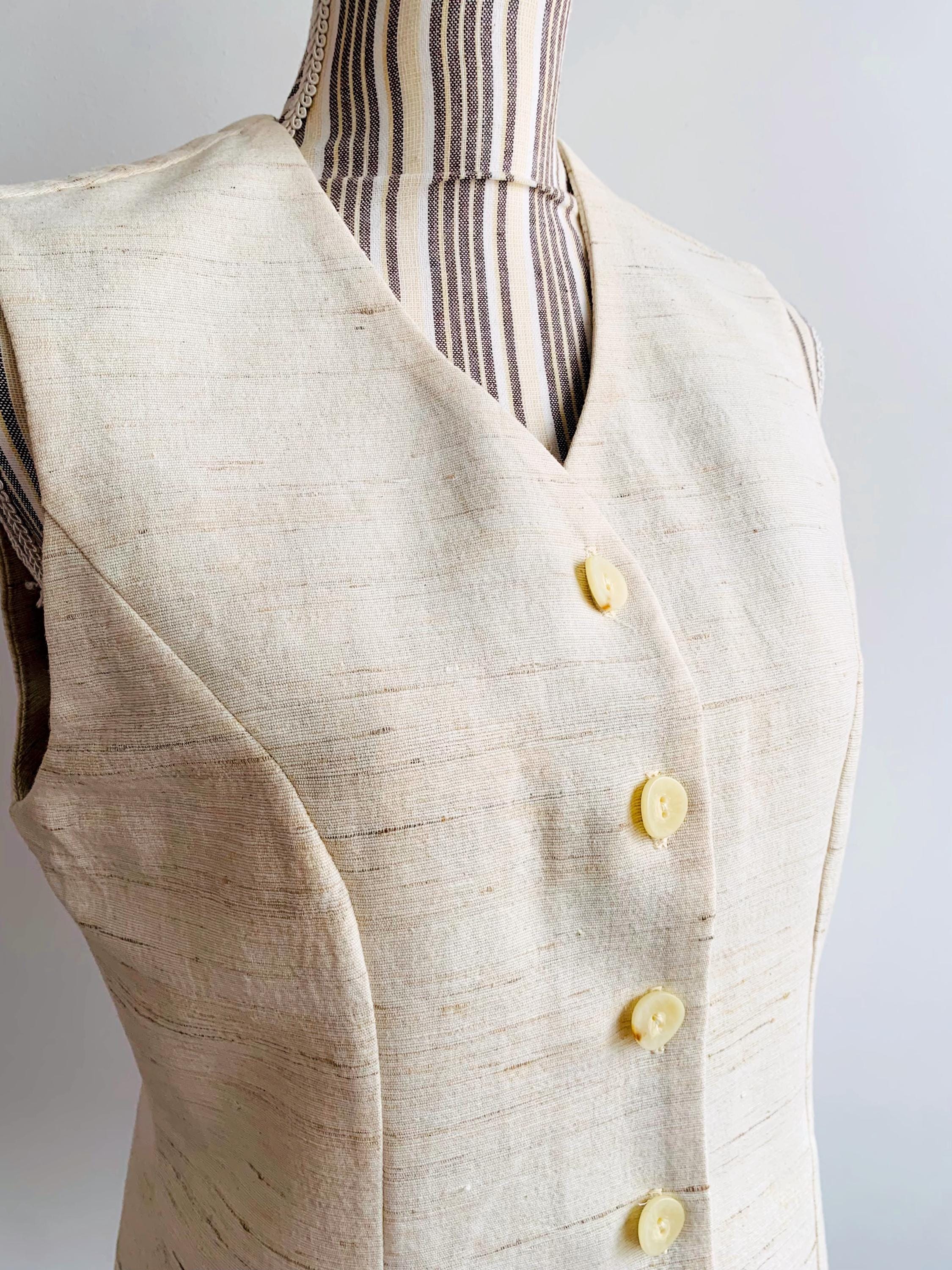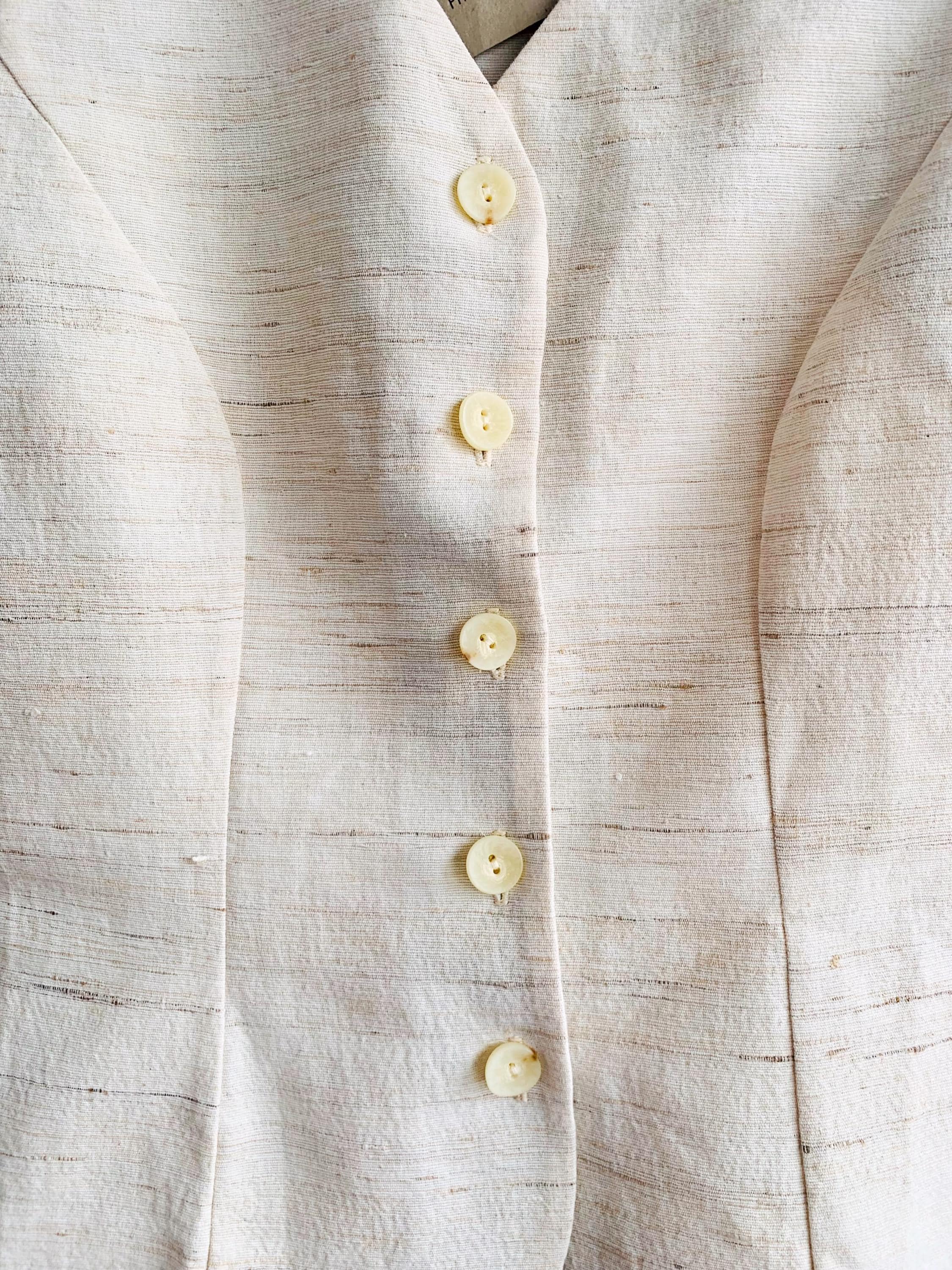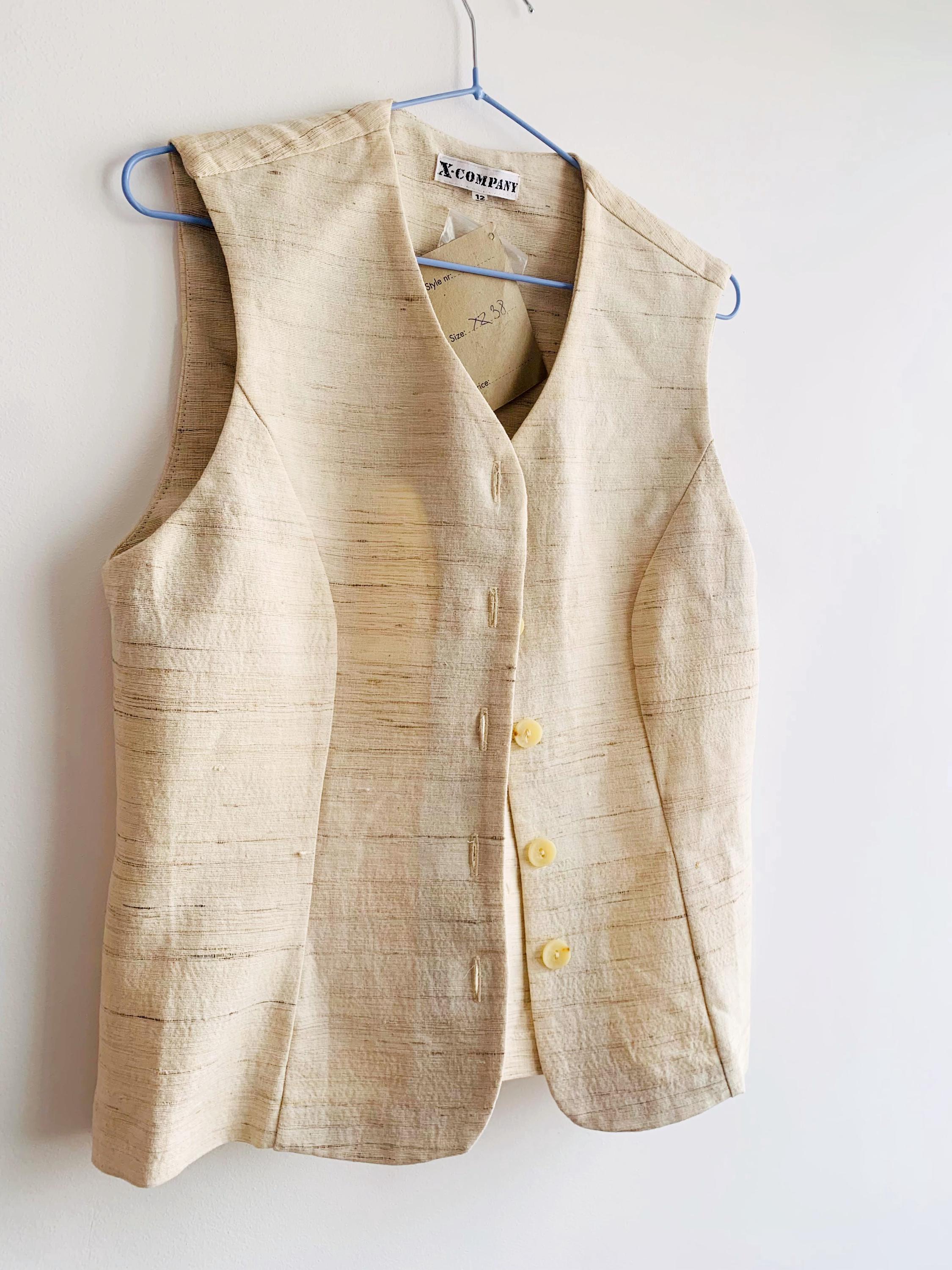 This is a high-quality sophisticated vintage silk and cotton blend waistcoat from X-Company in women's clothing size medium. Crafted in the UK, this silk blend waistcoat features a stunning textured weave that showcases the natural, slubby feel of raw silk. The neutral cream/ivory tone makes it an incredibly versatile staple for a minimalist or "quiet luxury" wardrobe.