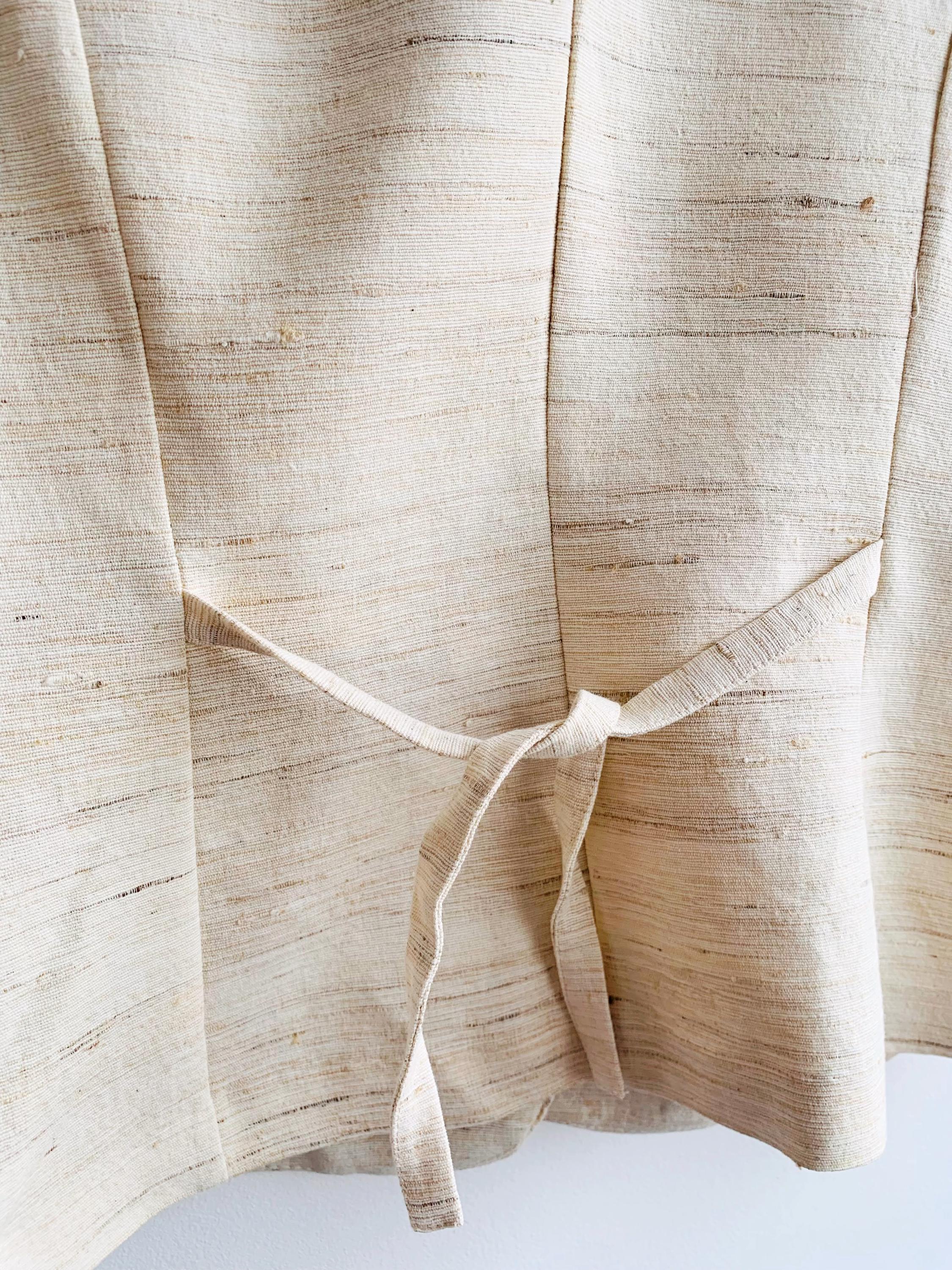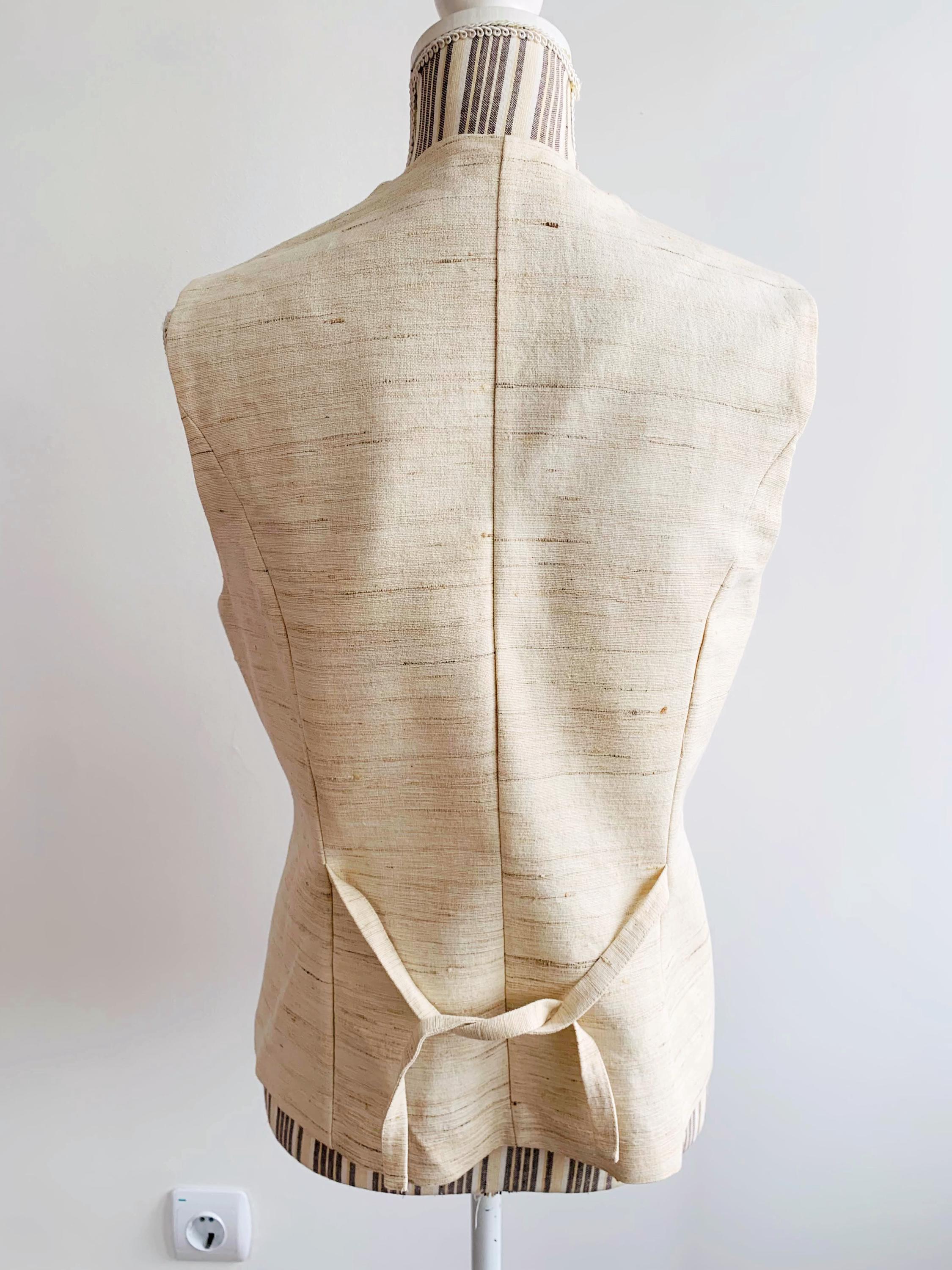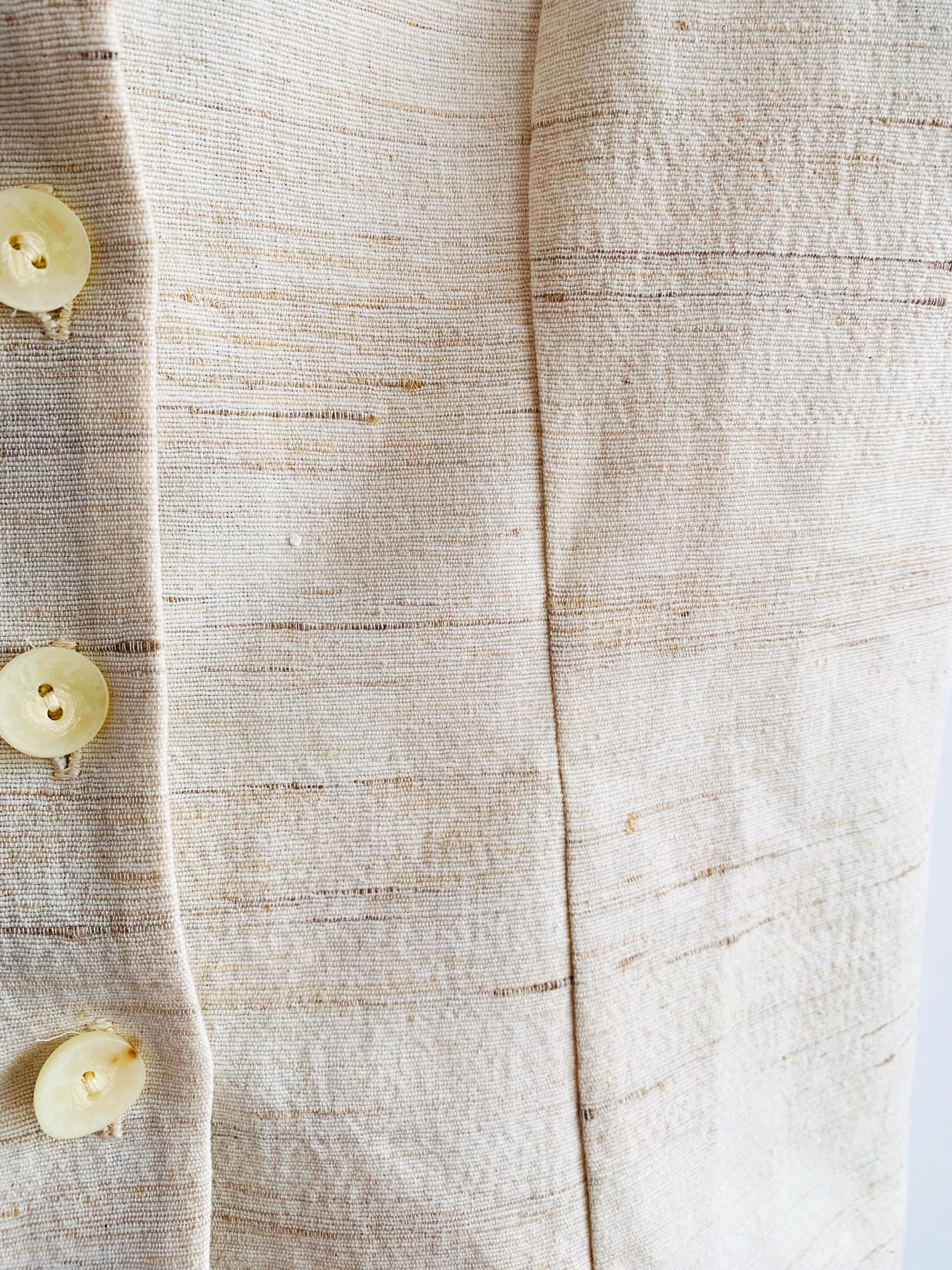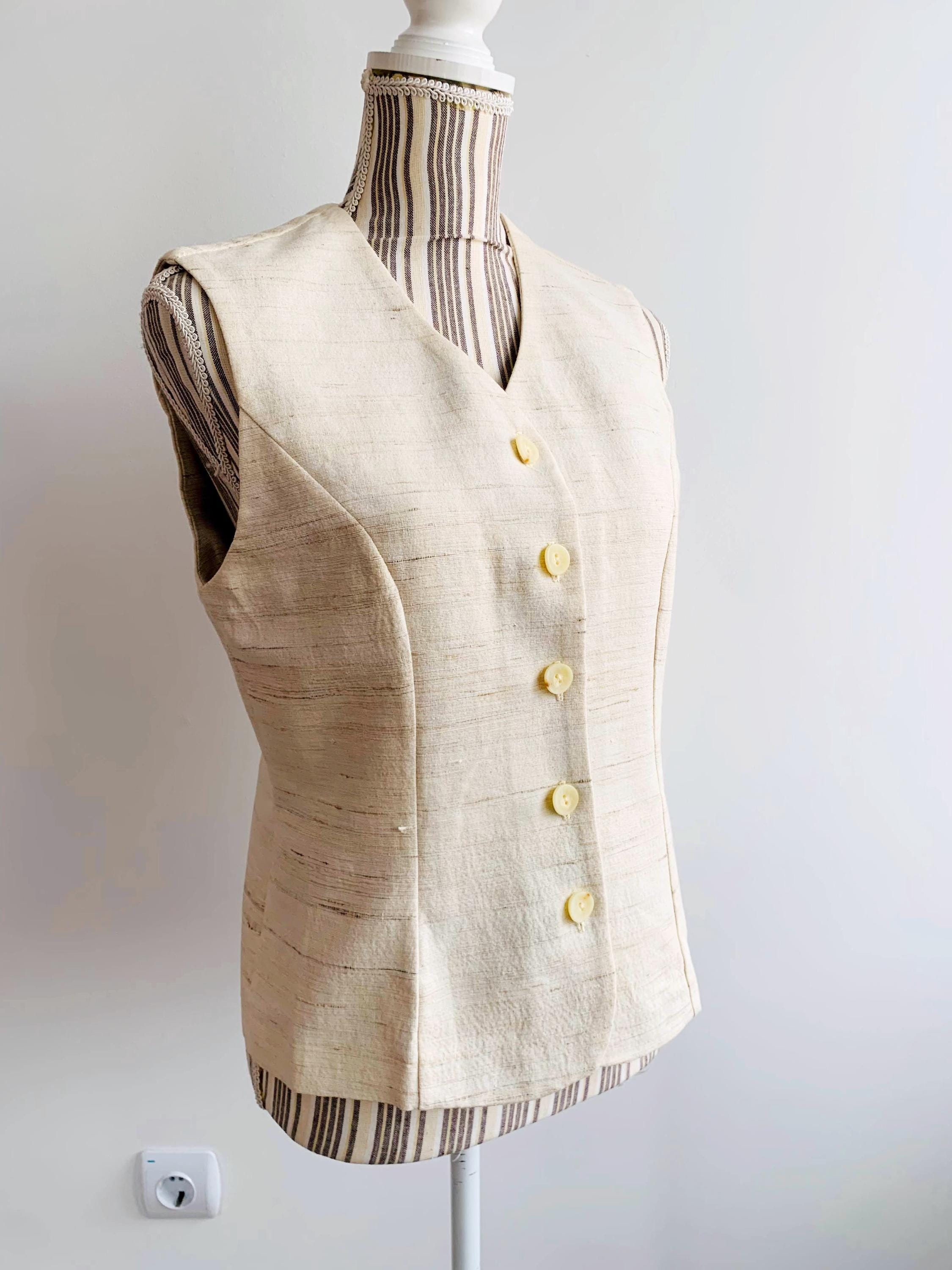 This is a high-quality sophisticated vintage silk and cotton blend waistcoat from X-Company in women's clothing size medium. Crafted in the UK, this silk blend waistcoat features a stunning textured weave that showcases the natural, slubby feel of raw silk. The neutral cream/ivory tone makes it an incredibly versatile staple for a minimalist or "quiet luxury" wardrobe.