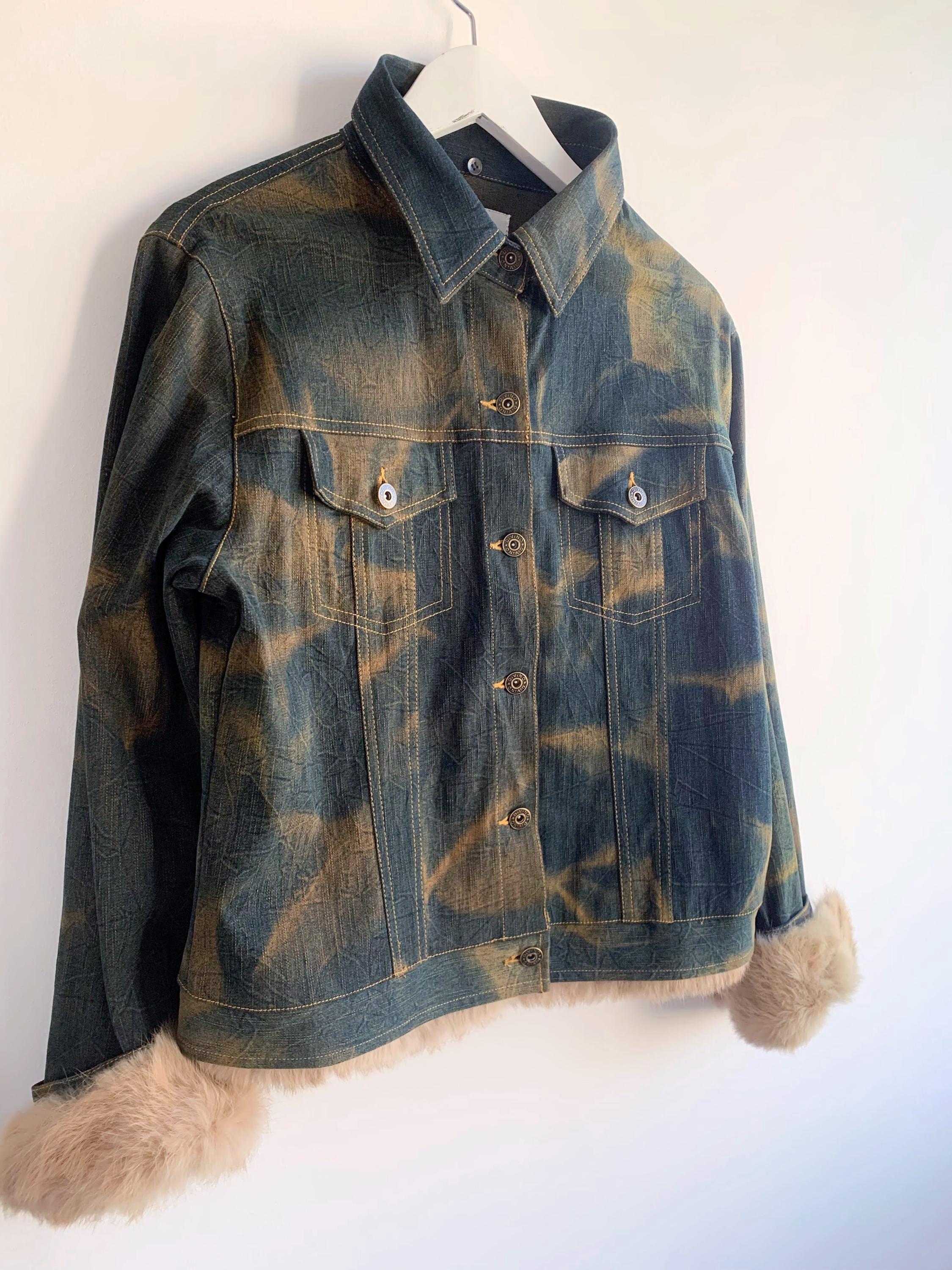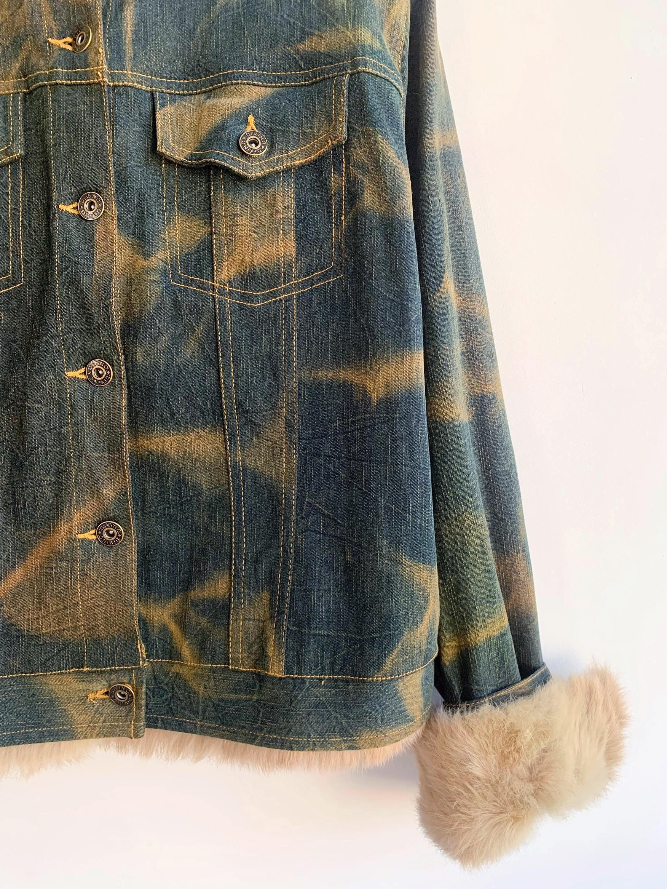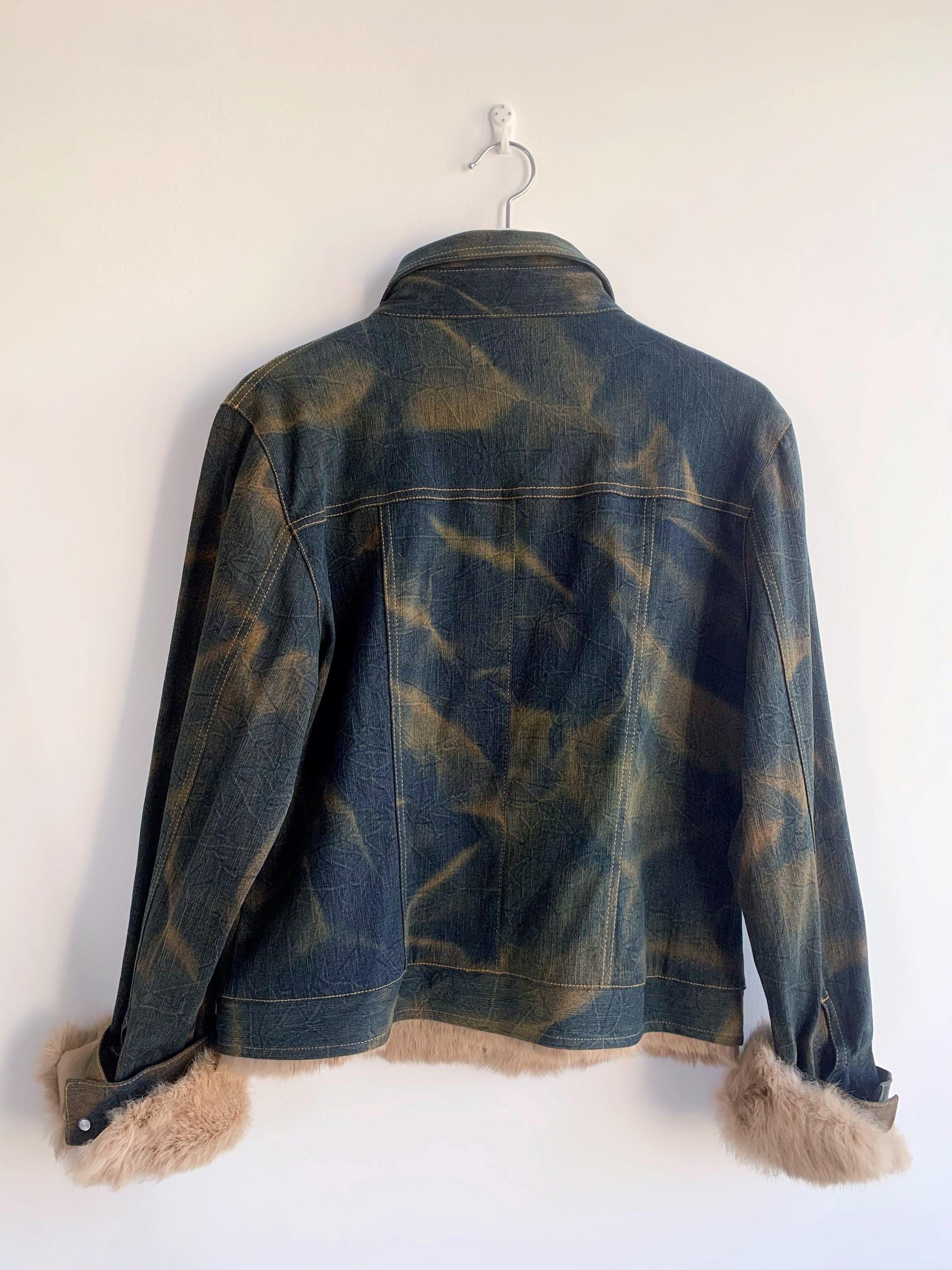 This is an iconic Y2K denim jacket for women from the early Y2Ks. Featuring a plush, camel faux fur trim on the bottom and the detachable cuffs, this piece perfectly captures the late 90s early Y2K aesthetic. The washed green denim has a classic mid-wash finish with subtle fading in camel color, giving it that genuine vintage character.