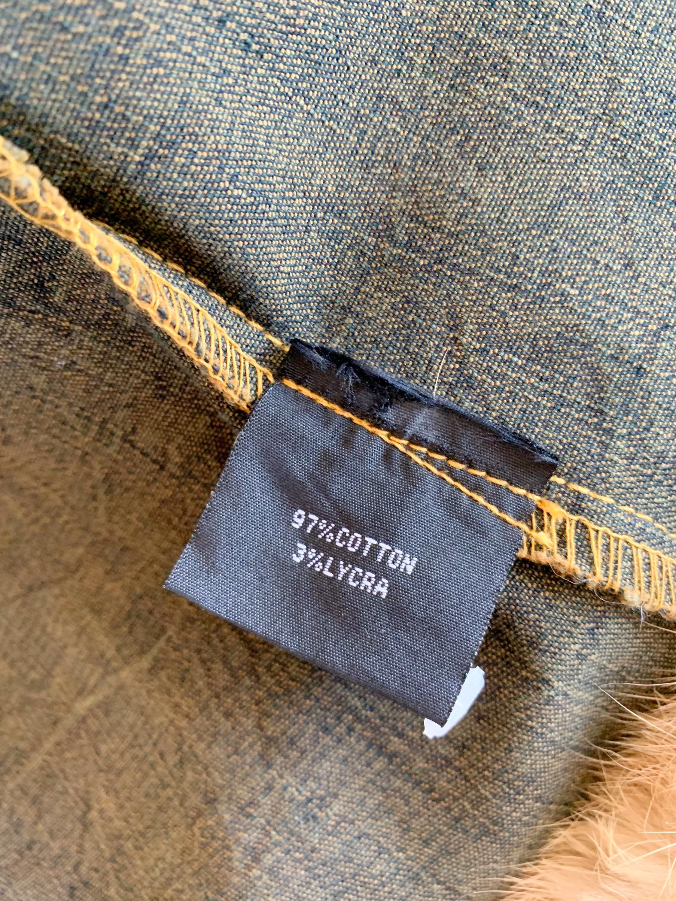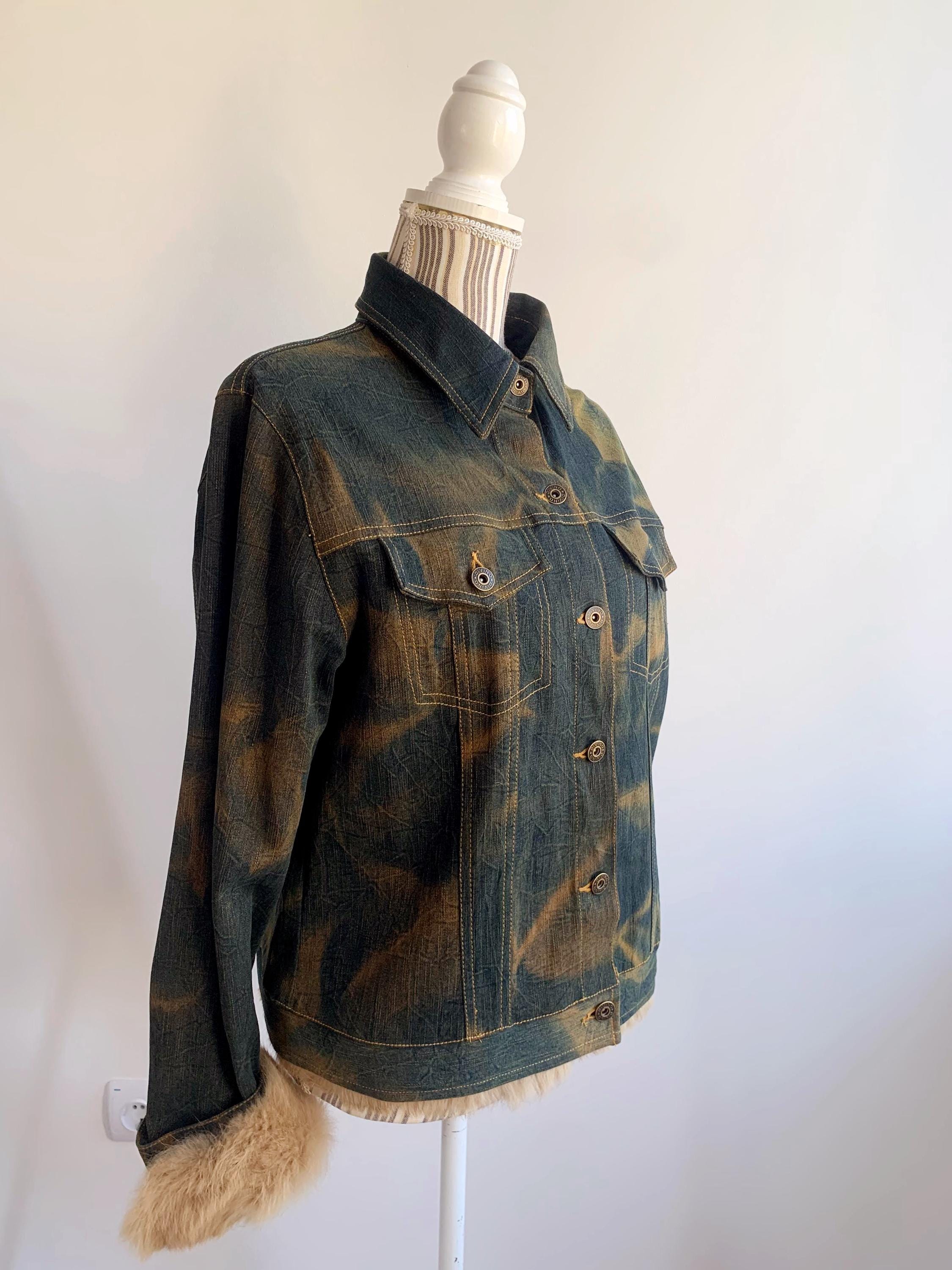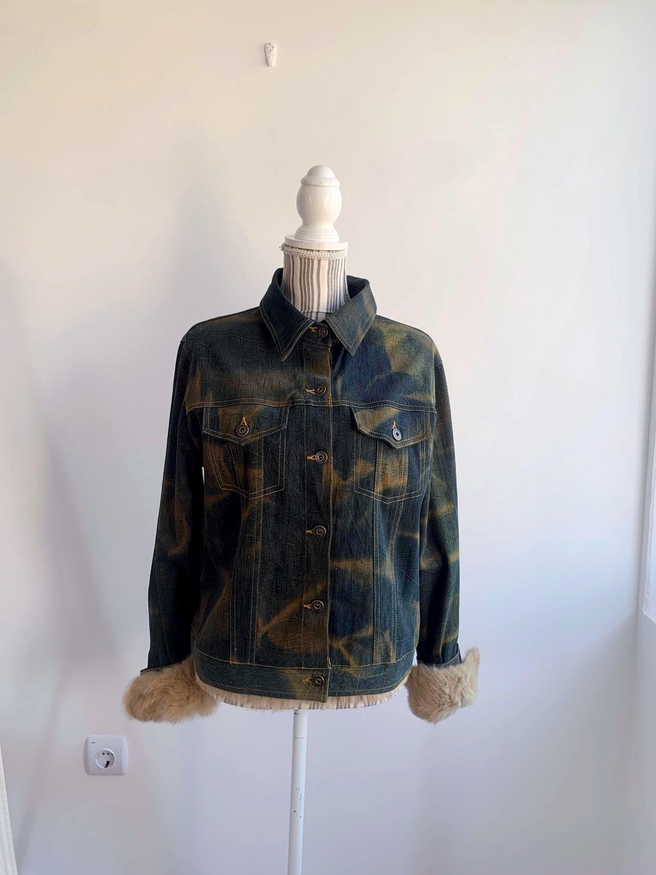 This is an iconic Y2K denim jacket for women from the early Y2Ks. Featuring a plush, camel faux fur trim on the bottom and the detachable cuffs, this piece perfectly captures the late 90s early Y2K aesthetic. The washed green denim has a classic mid-wash finish with subtle fading in camel color, giving it that genuine vintage character.