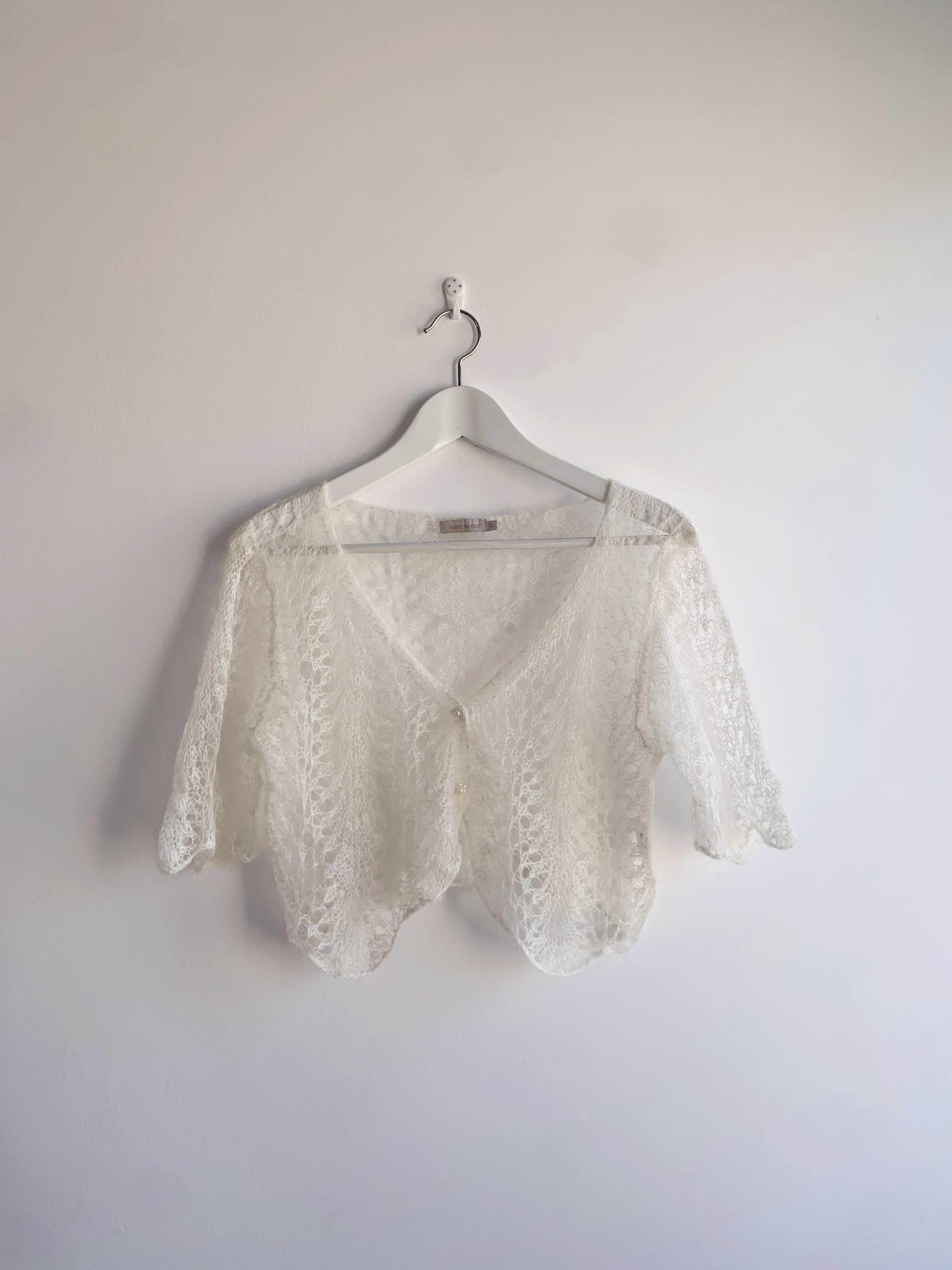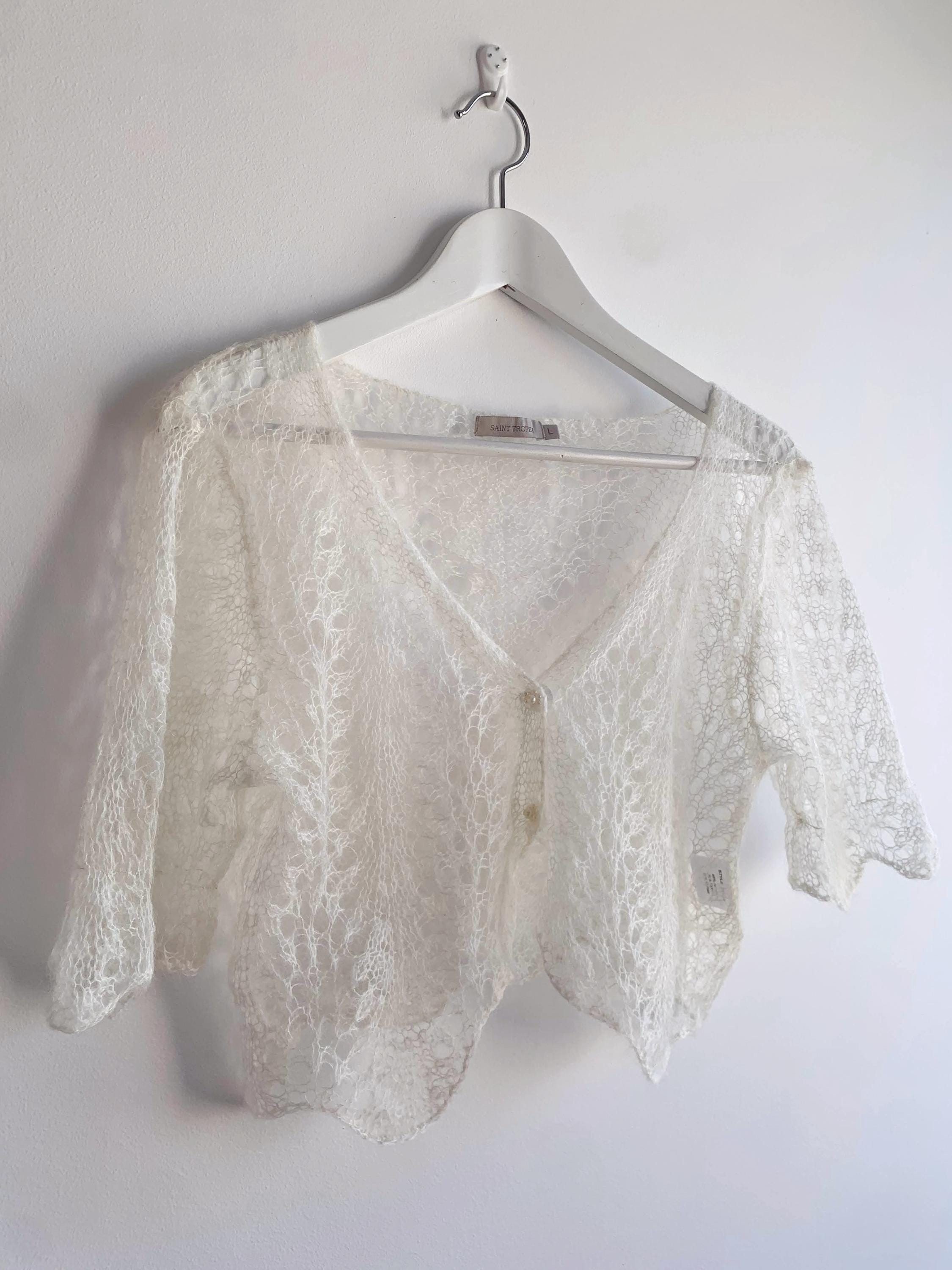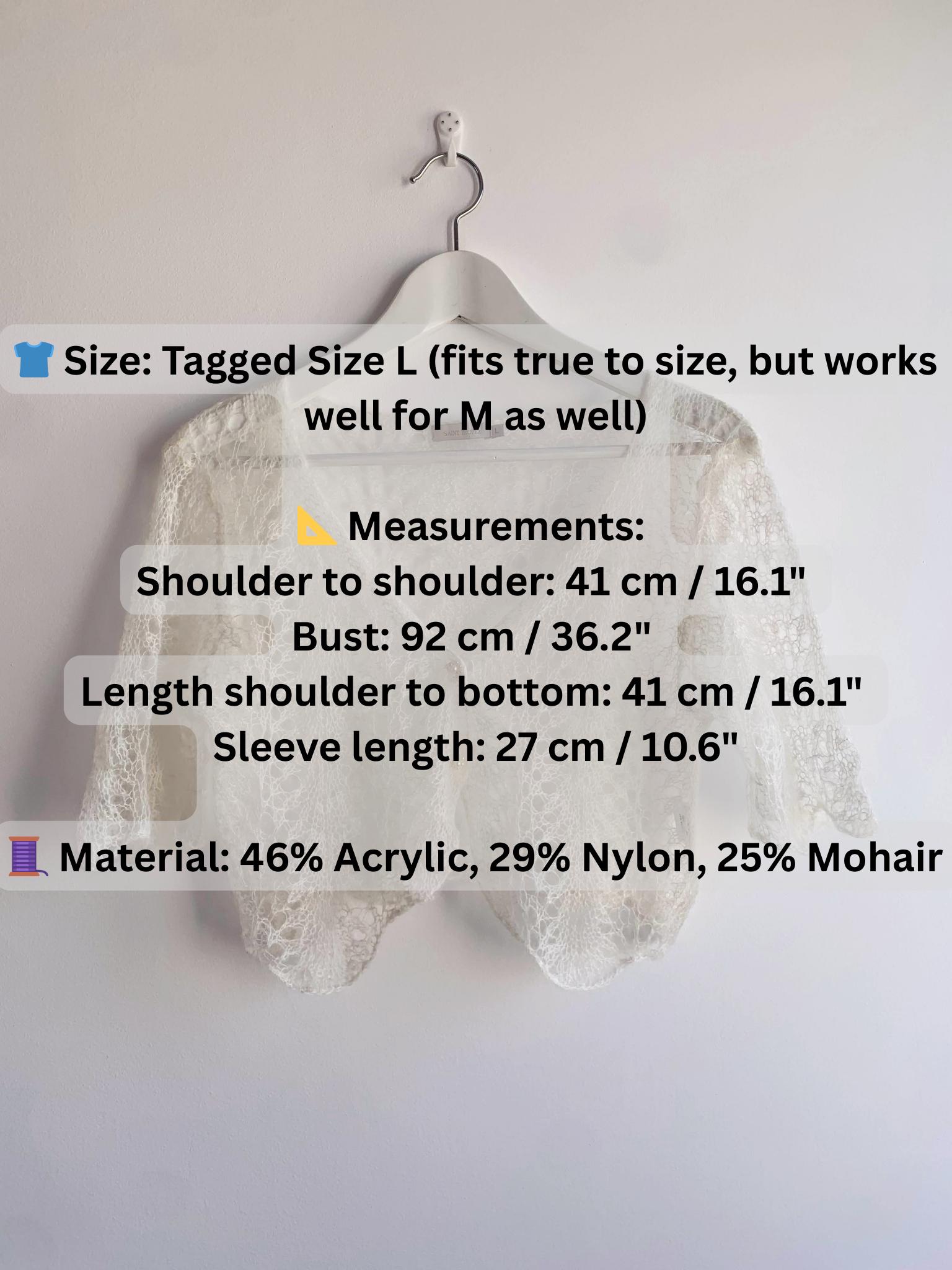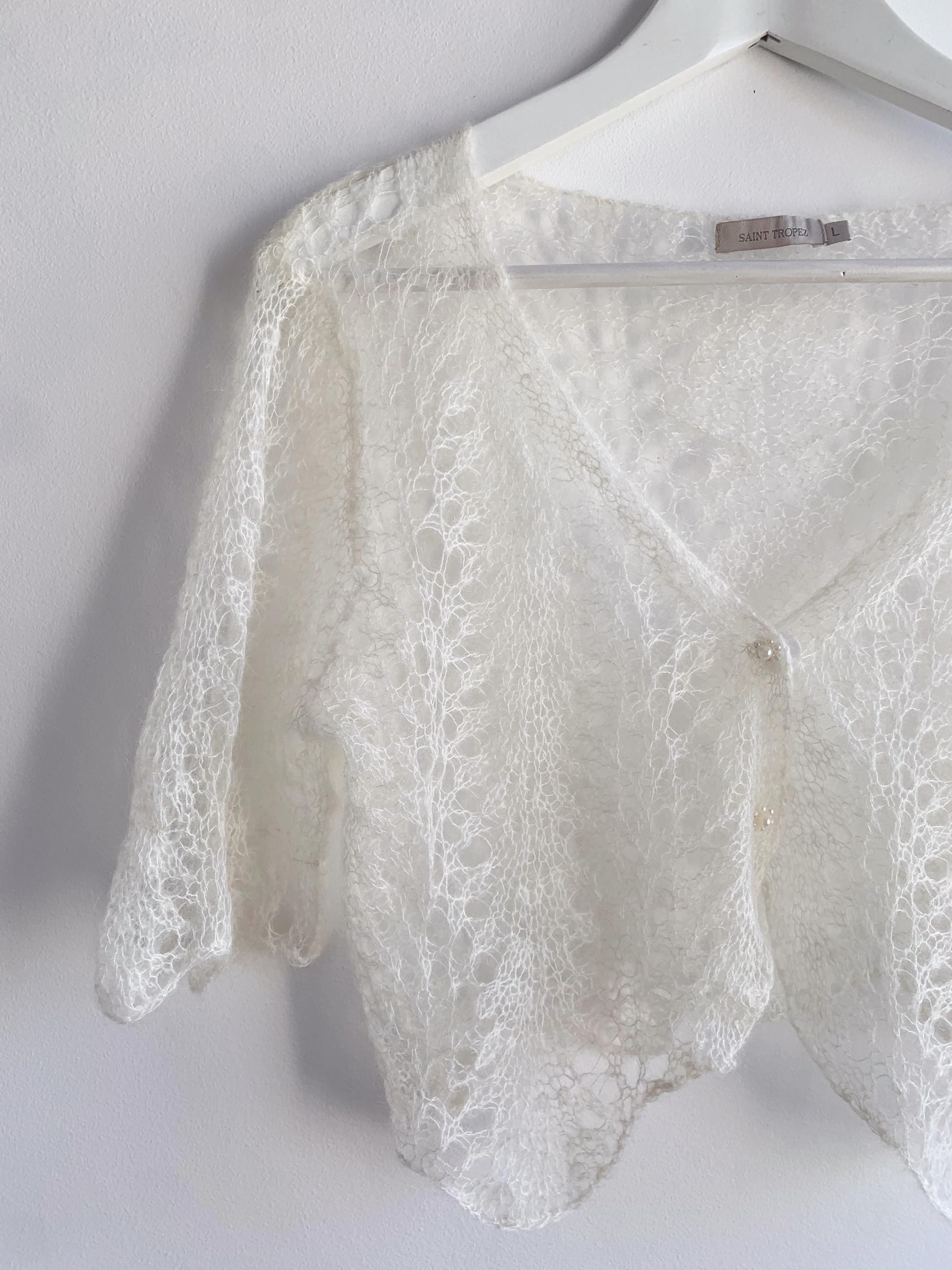 This is a stunning white mohair lace bolero shrug in size M/L. Crafted by Saint Tropez, this delicate piece features an intricate, open-knit "spiderweb" texture that provides a light, airy feel. The cropped silhouette and elegant short sleeves make it a versatile layering piece, perfect for transitioning between seasons or adding a romantic layer to a formal outfit.
