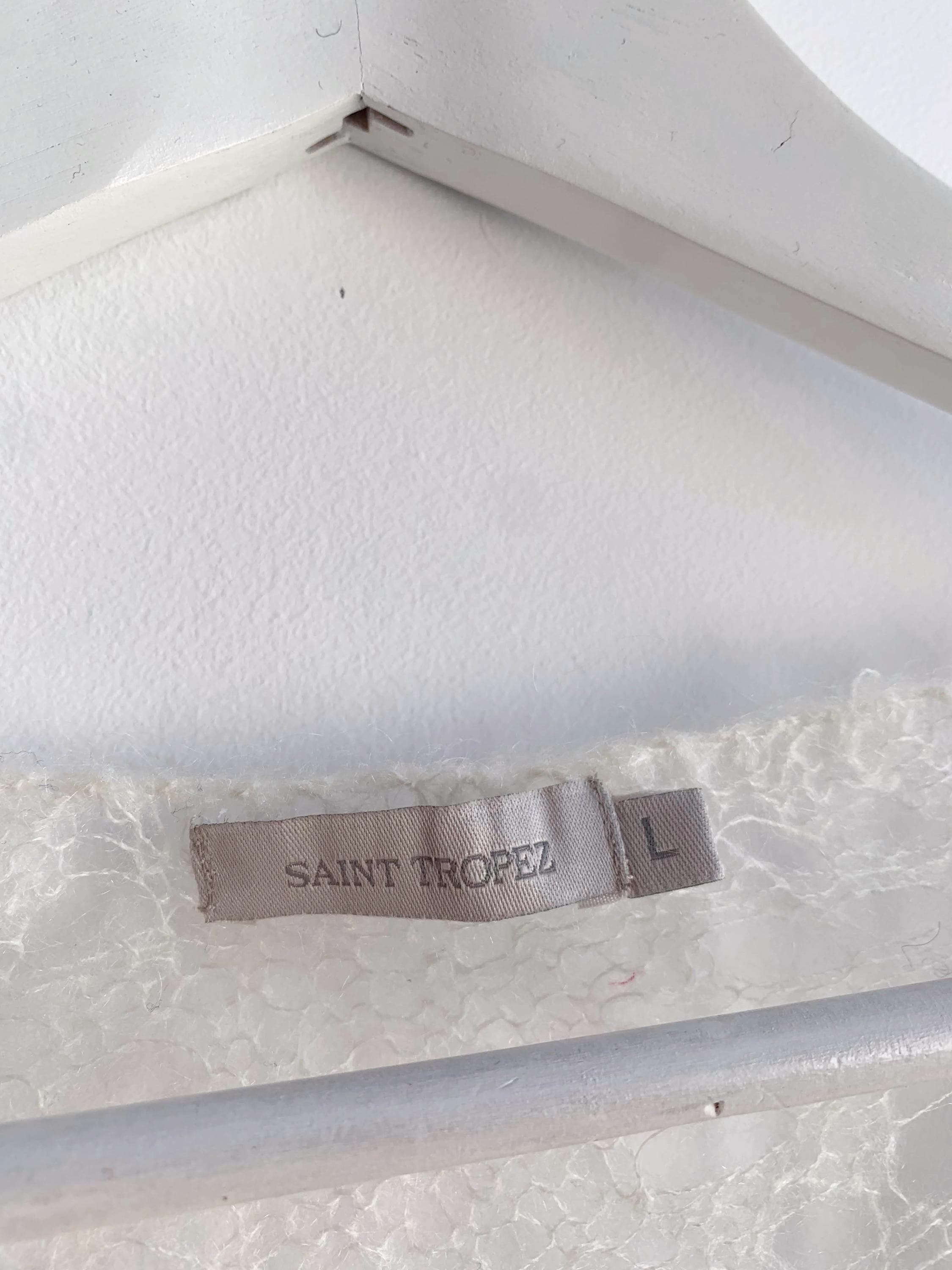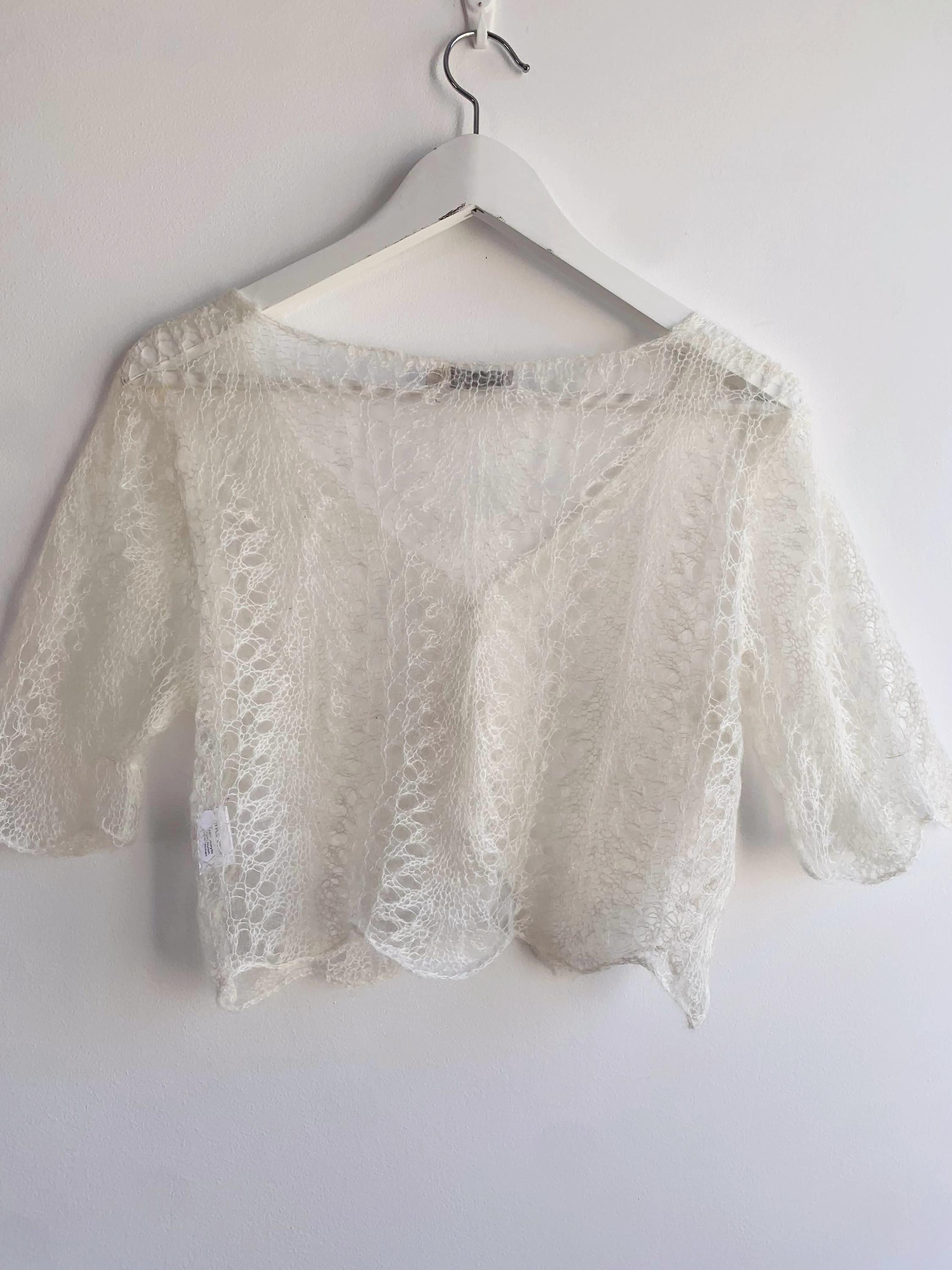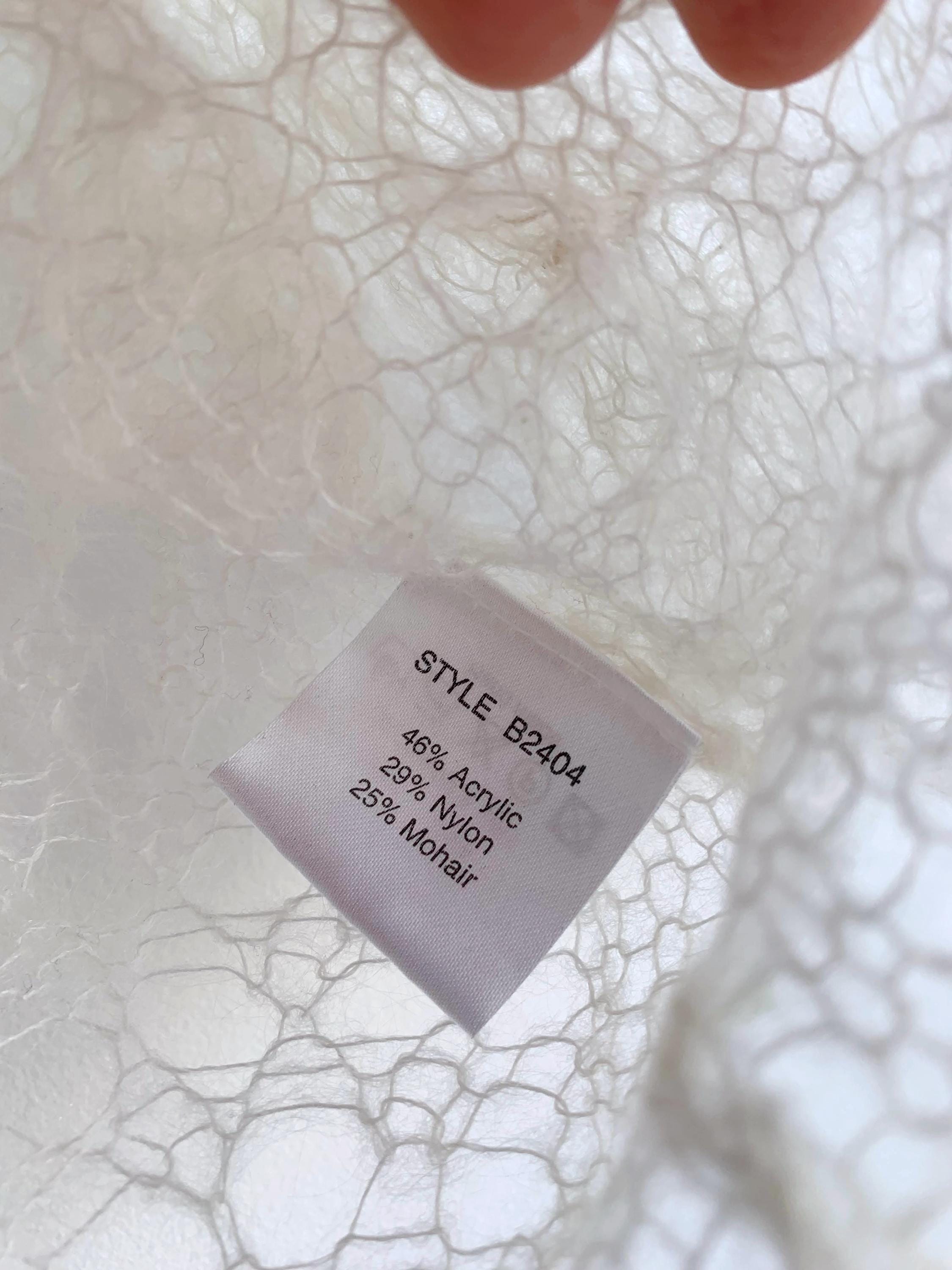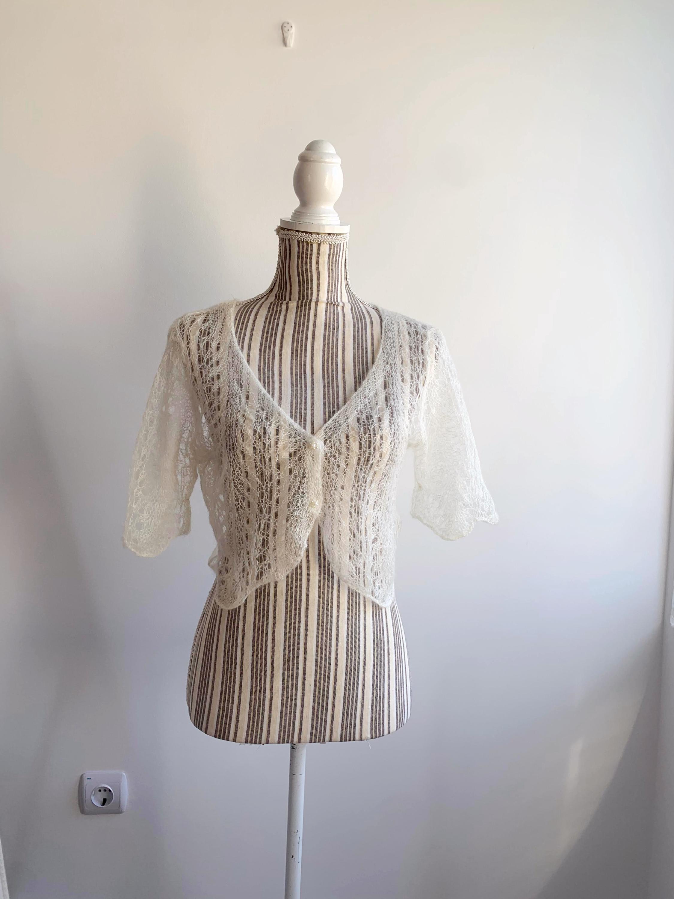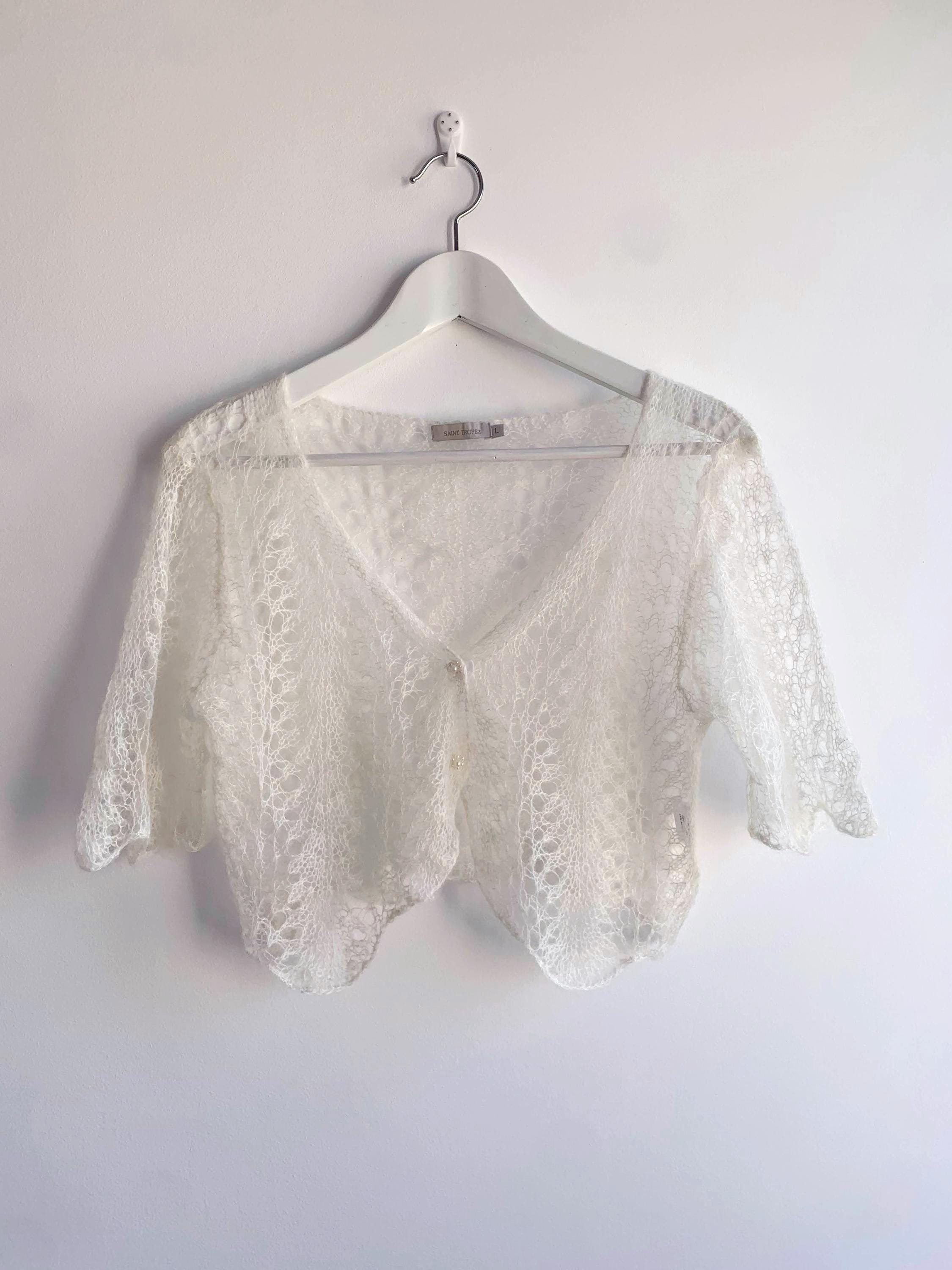 This is a stunning white mohair lace bolero shrug in size M/L. Crafted by Saint Tropez, this delicate piece features an intricate, open-knit "spiderweb" texture that provides a light, airy feel. The cropped silhouette and elegant short sleeves make it a versatile layering piece, perfect for transitioning between seasons or adding a romantic layer to a formal outfit.