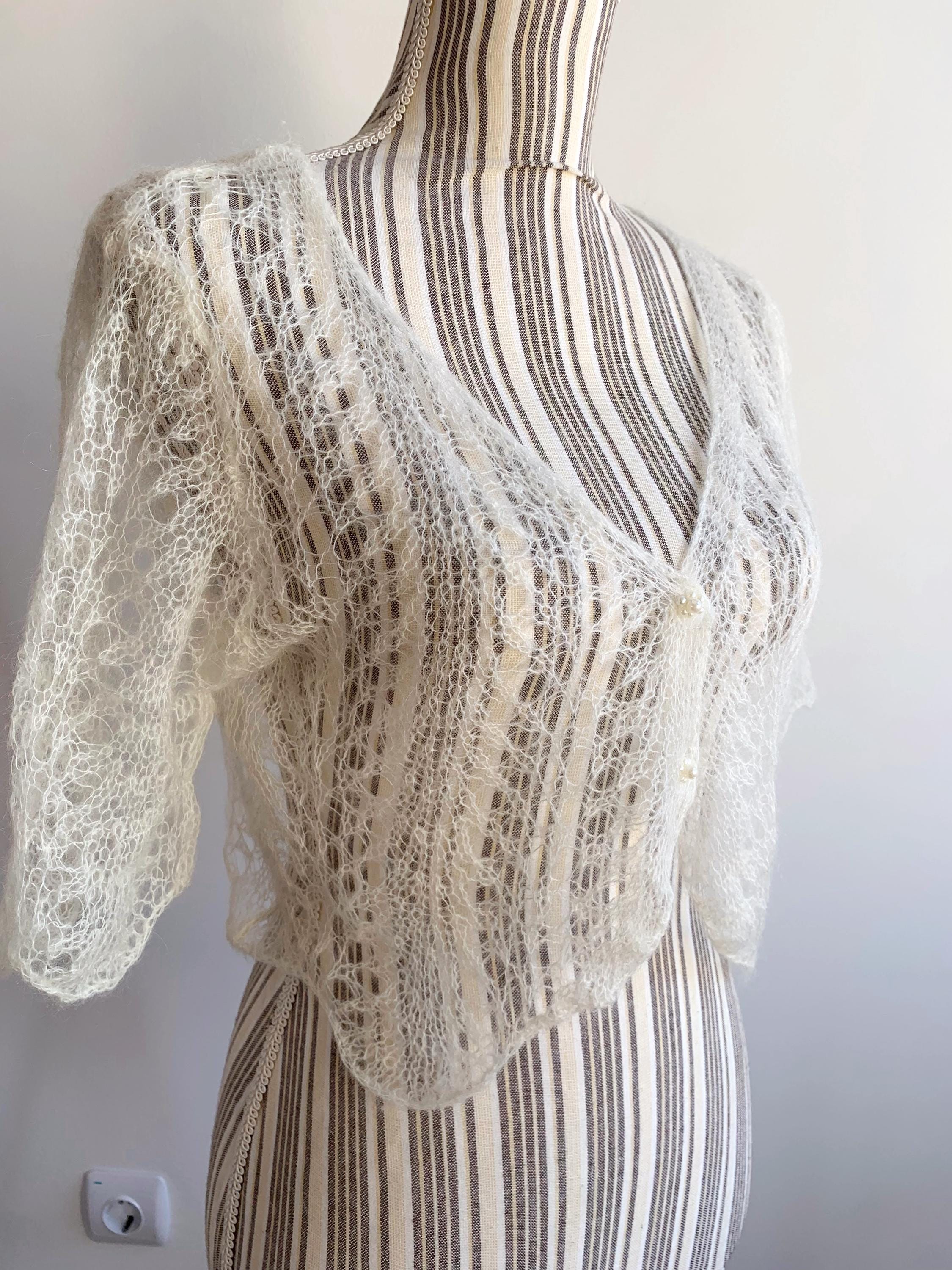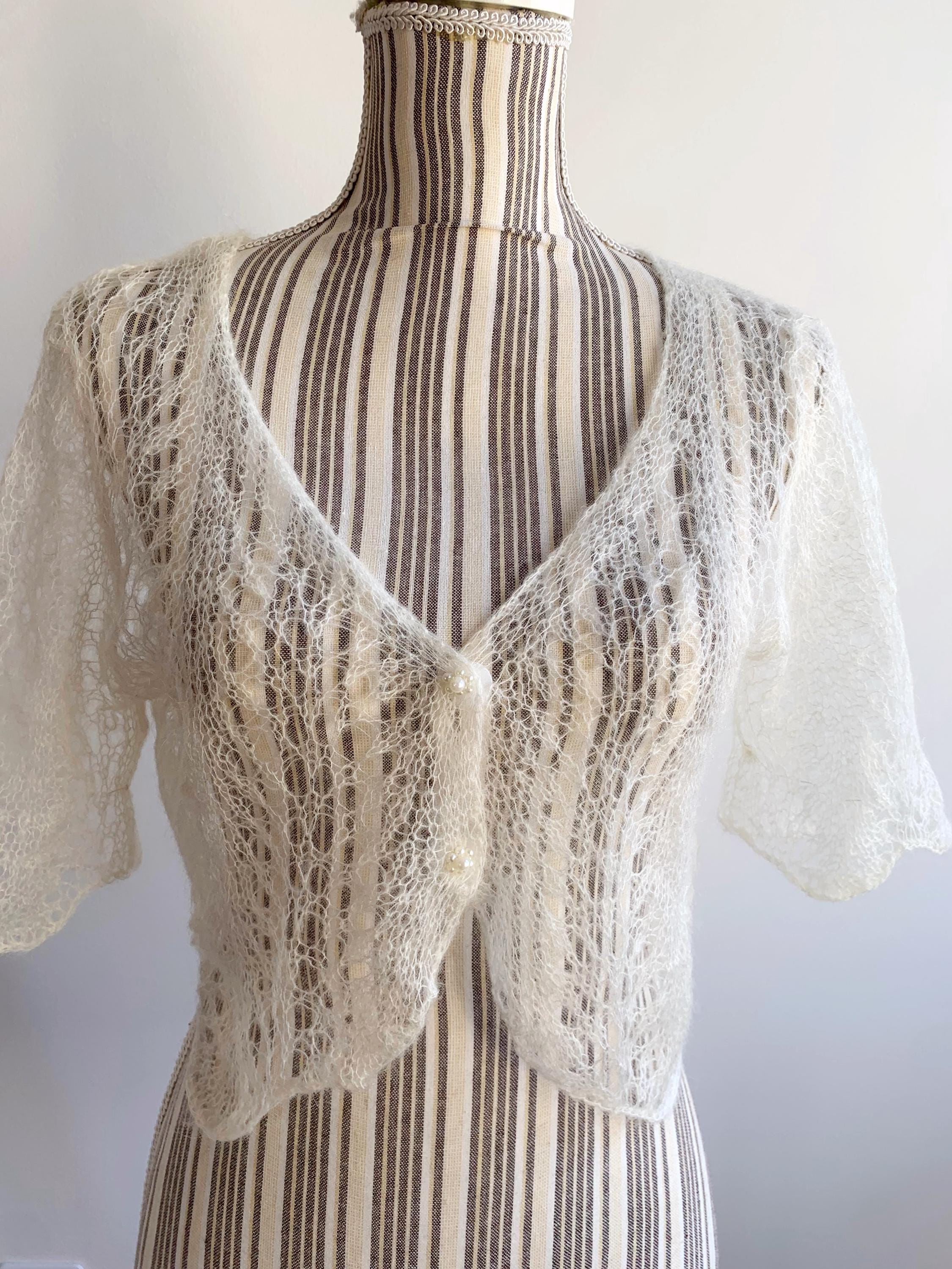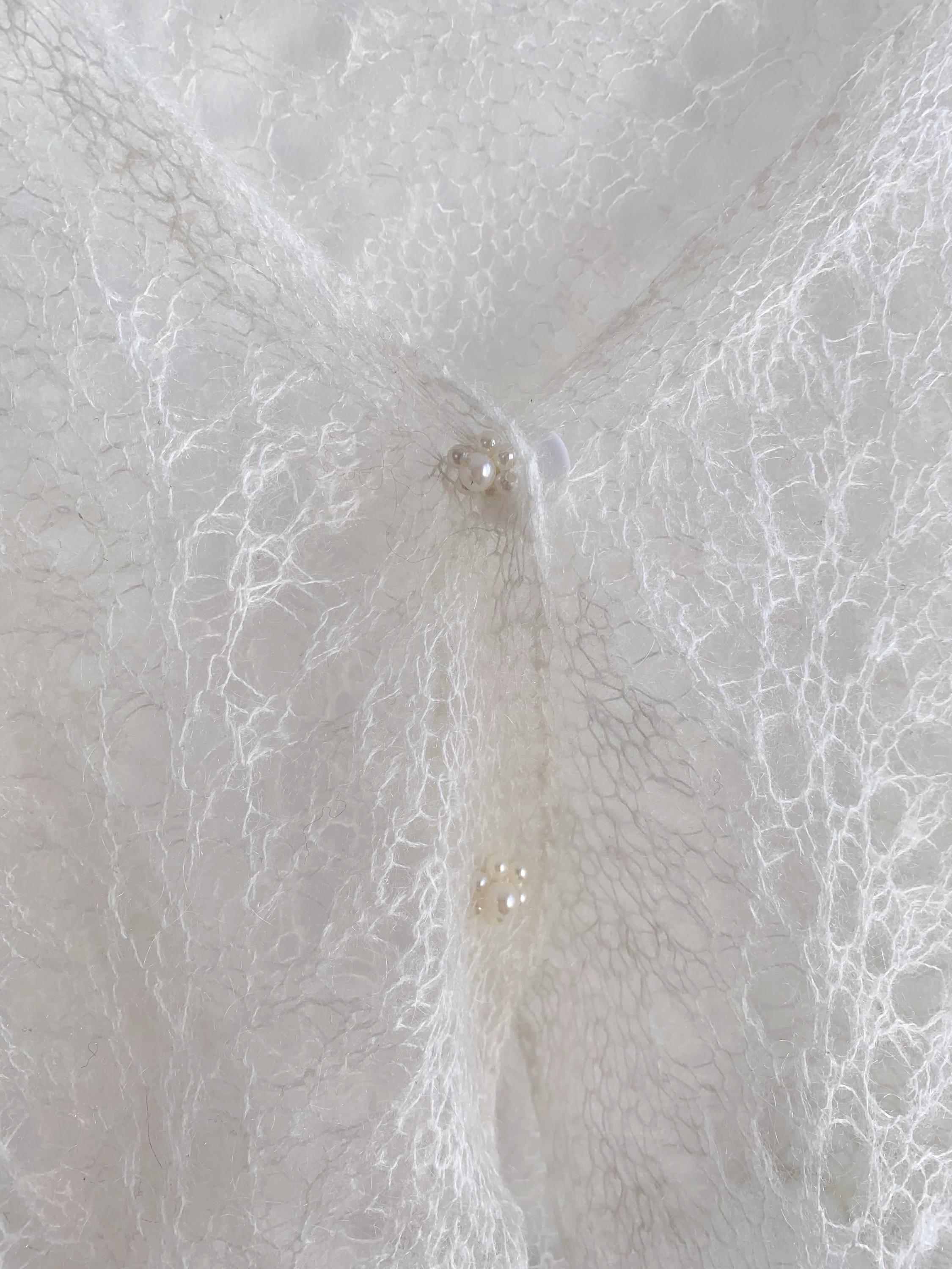 Two exquisite pearl-style buttons adorn the front, lending a vintage, feminine aesthetic. Whether you are looking for a unique bridal cover-up, a dainty layer for a summer dress, or a "fairycore" inspired addition to your daily style, this mohair-blend cardigan offers both texture and timeless appeal. The sheer, gauzy knit is remarkably soft and lightweight, ensuring comfort without sacrificing style.