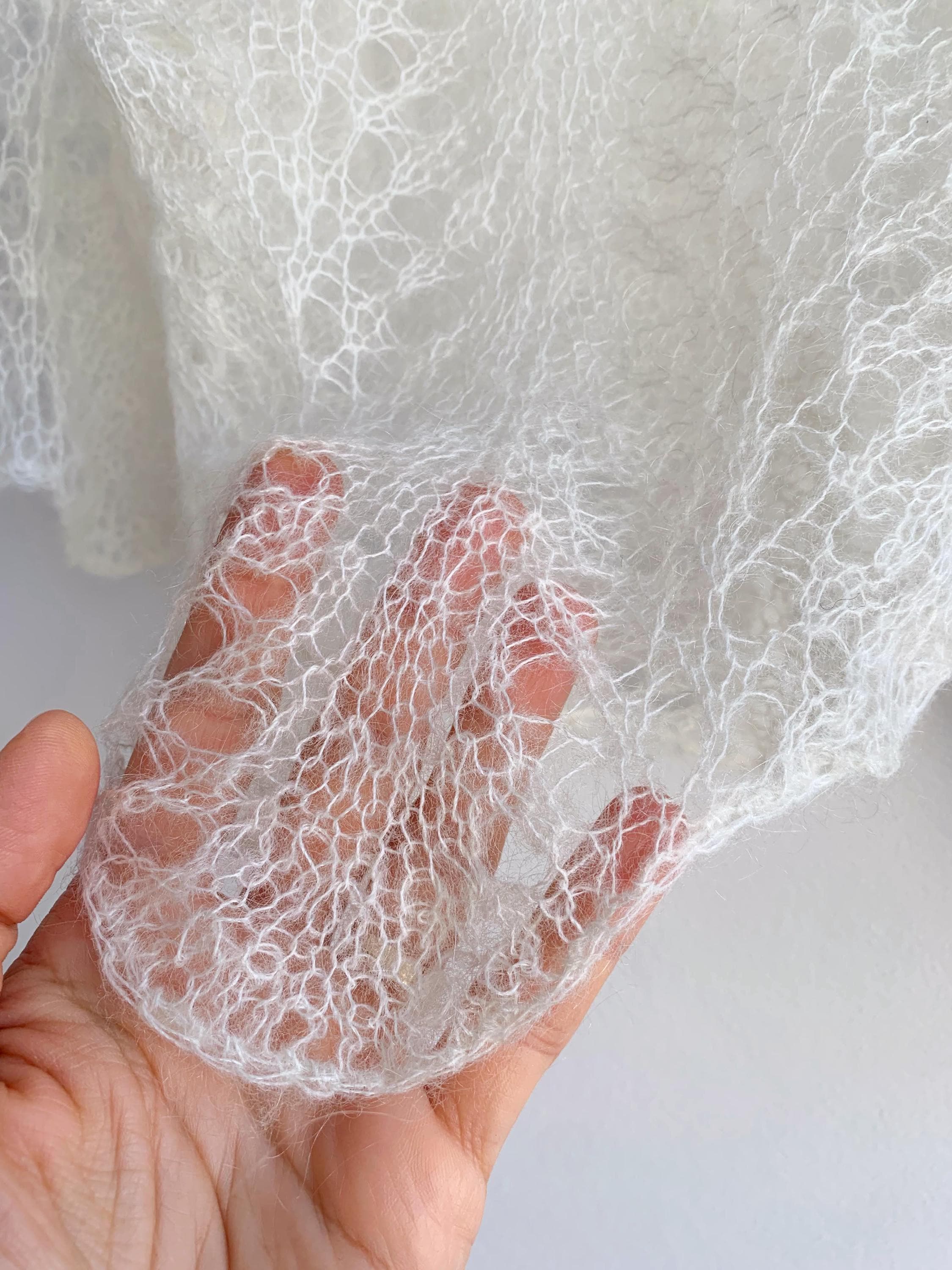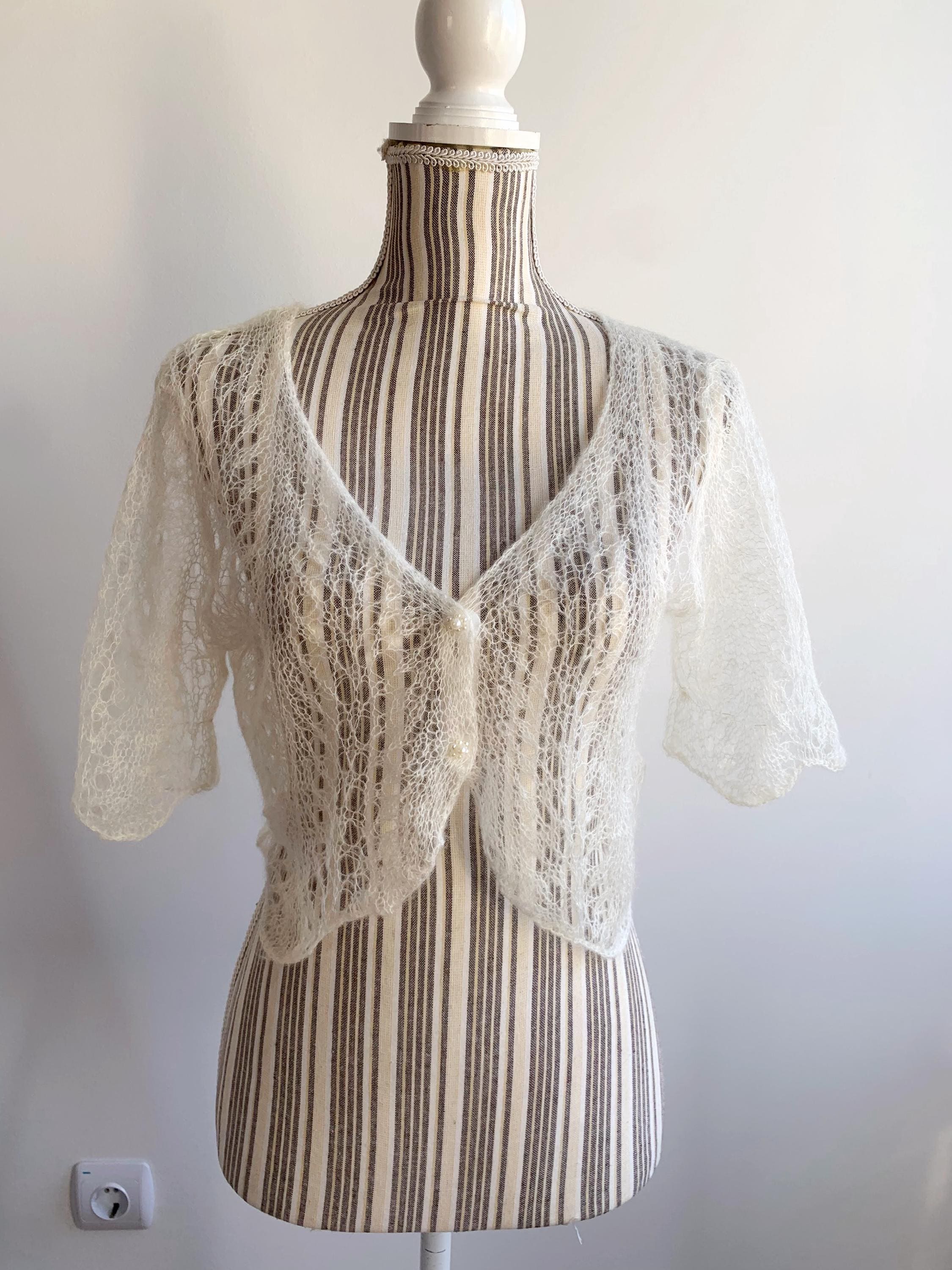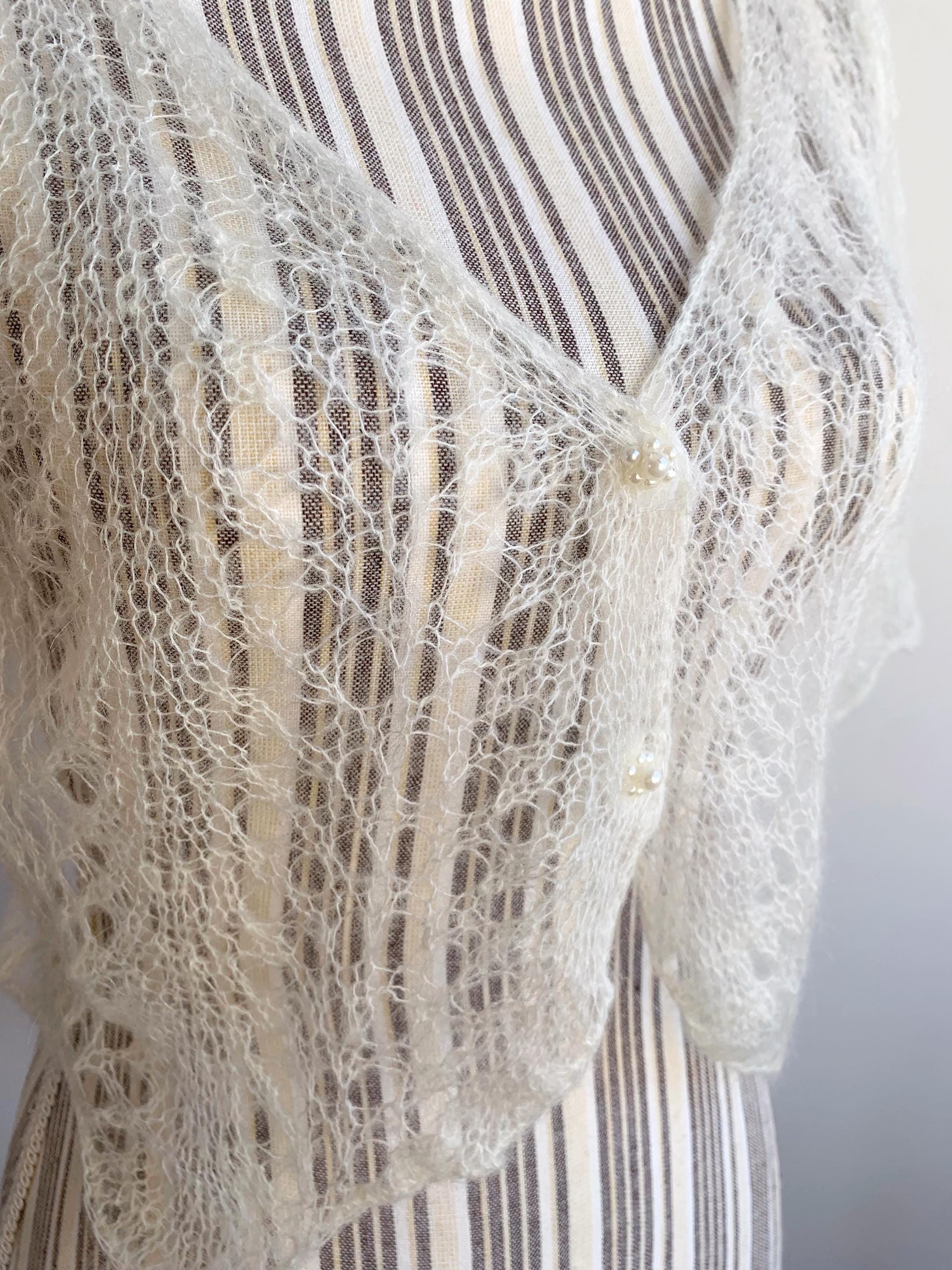 Two exquisite pearl-style buttons adorn the front, lending a vintage, feminine aesthetic. Whether you are looking for a unique bridal cover-up, a dainty layer for a summer dress, or a "fairycore" inspired addition to your daily style, this mohair-blend cardigan offers both texture and timeless appeal. The sheer, gauzy knit is remarkably soft and lightweight, ensuring comfort without sacrificing style.