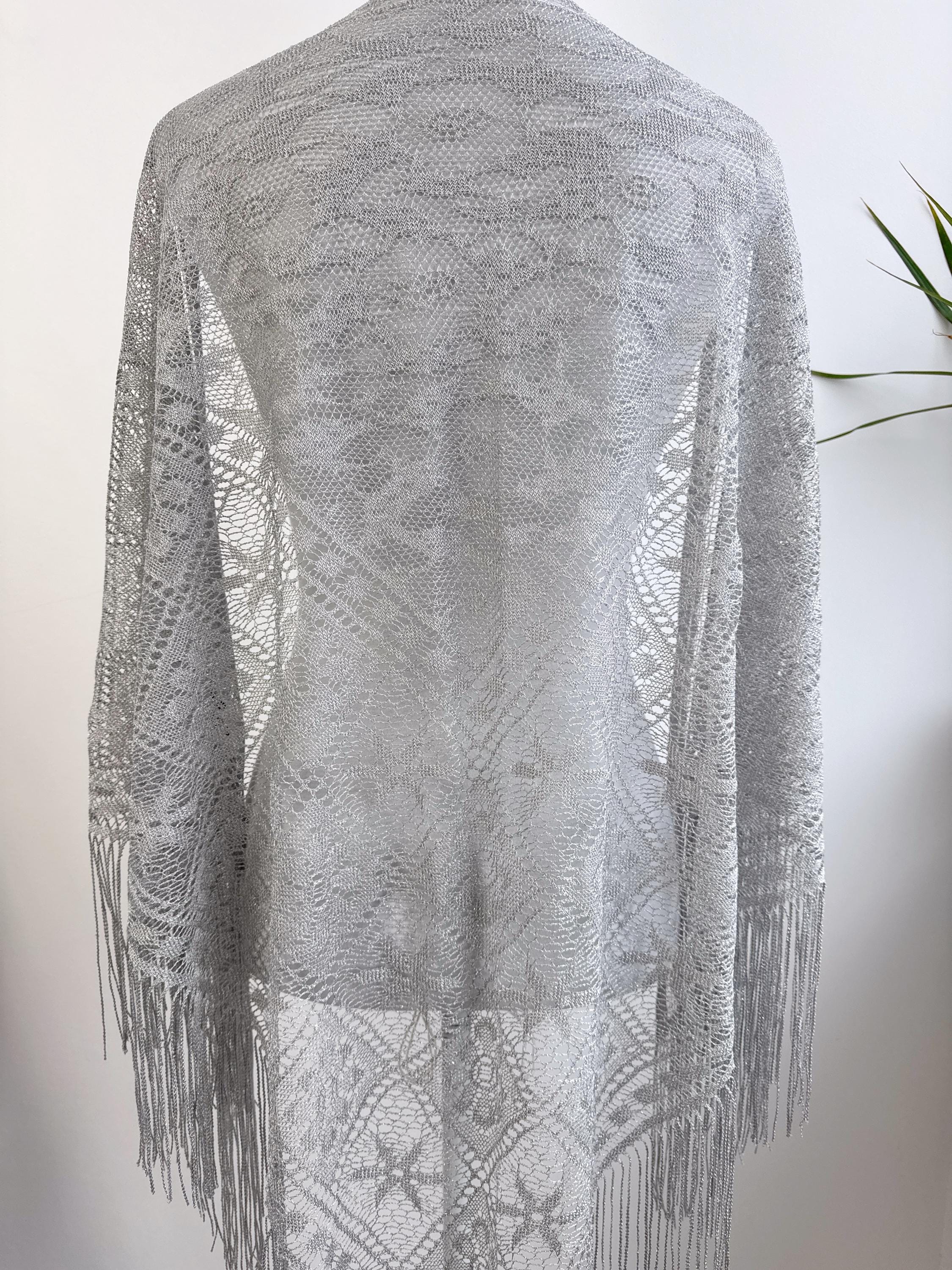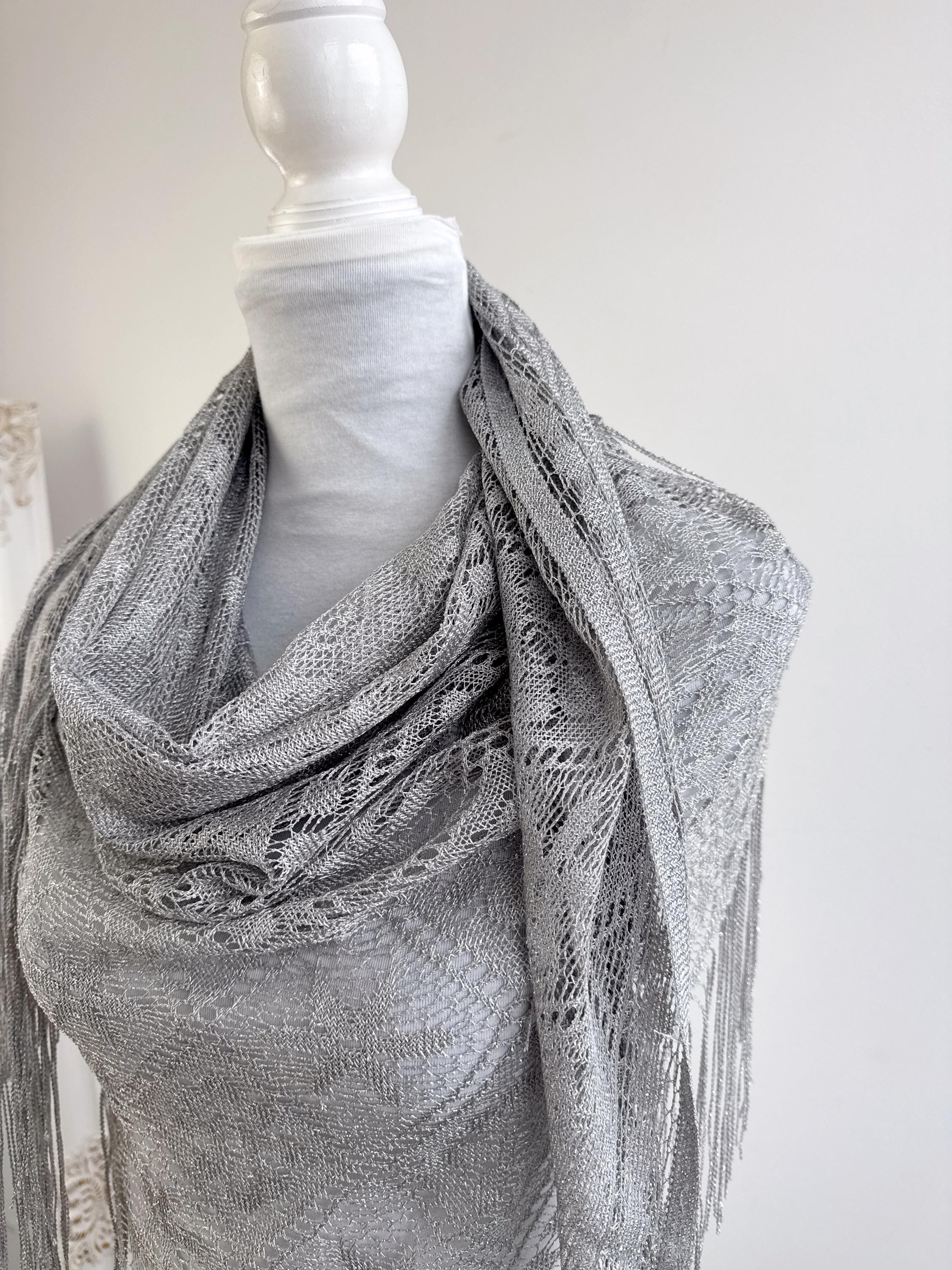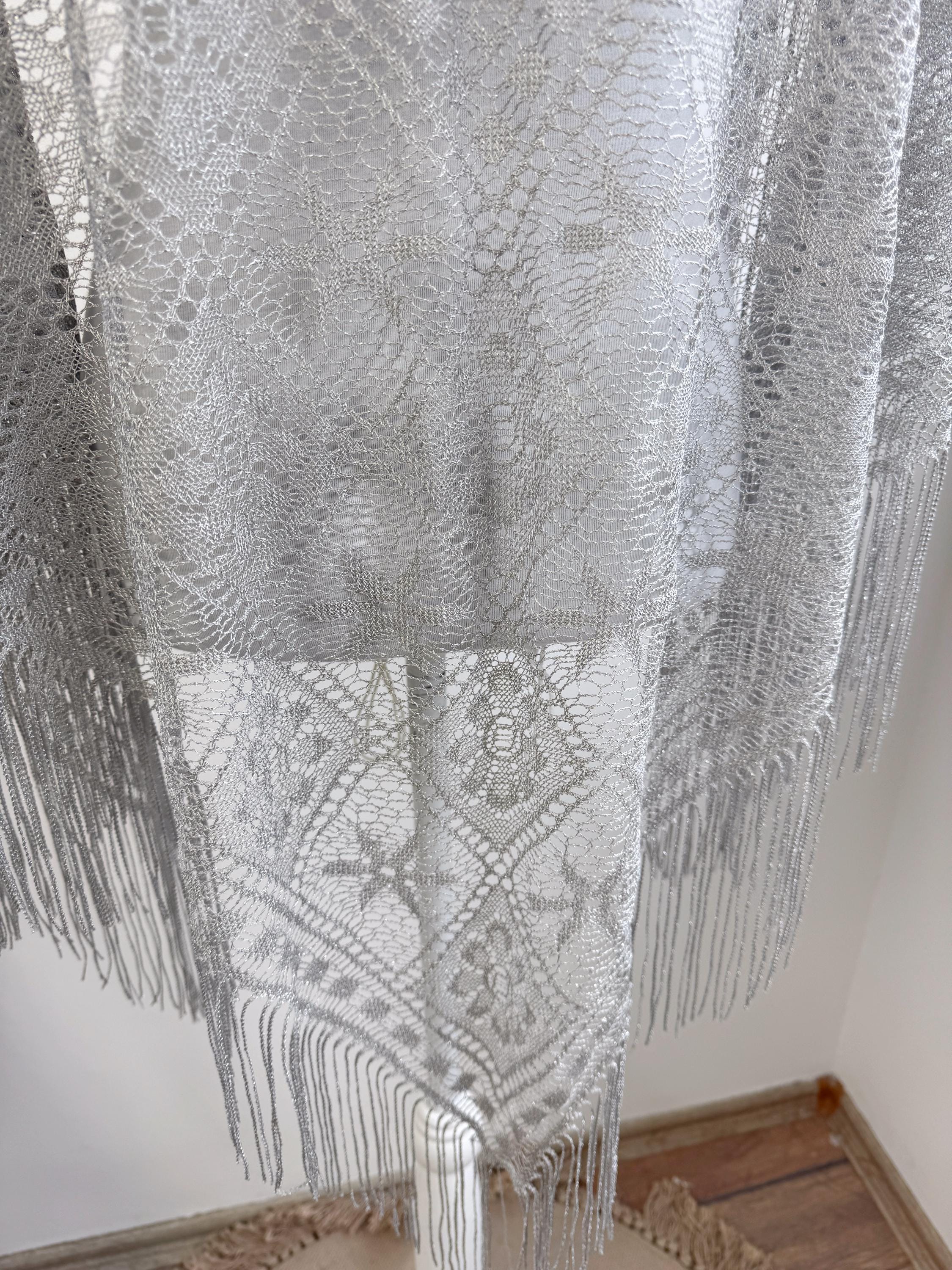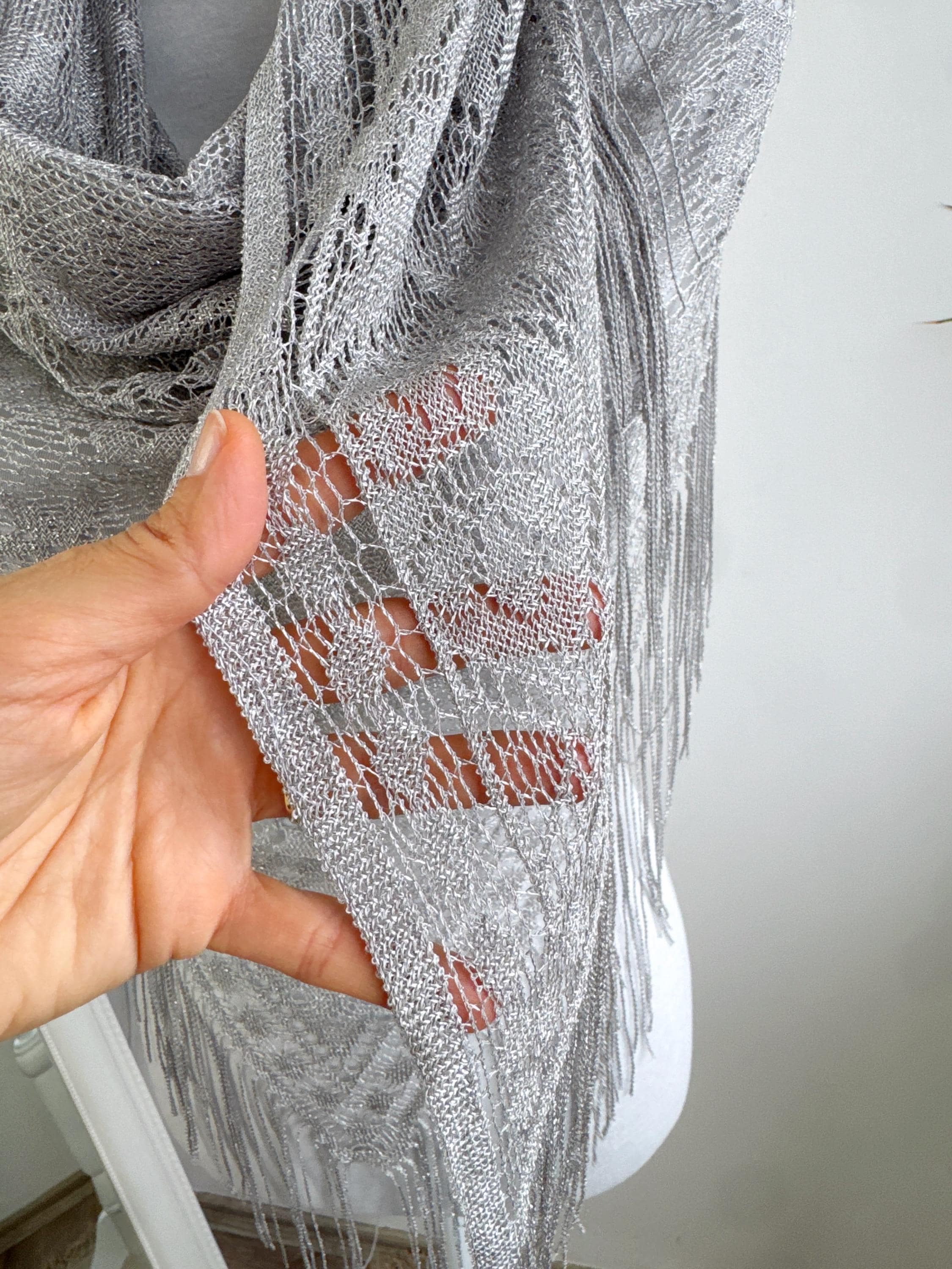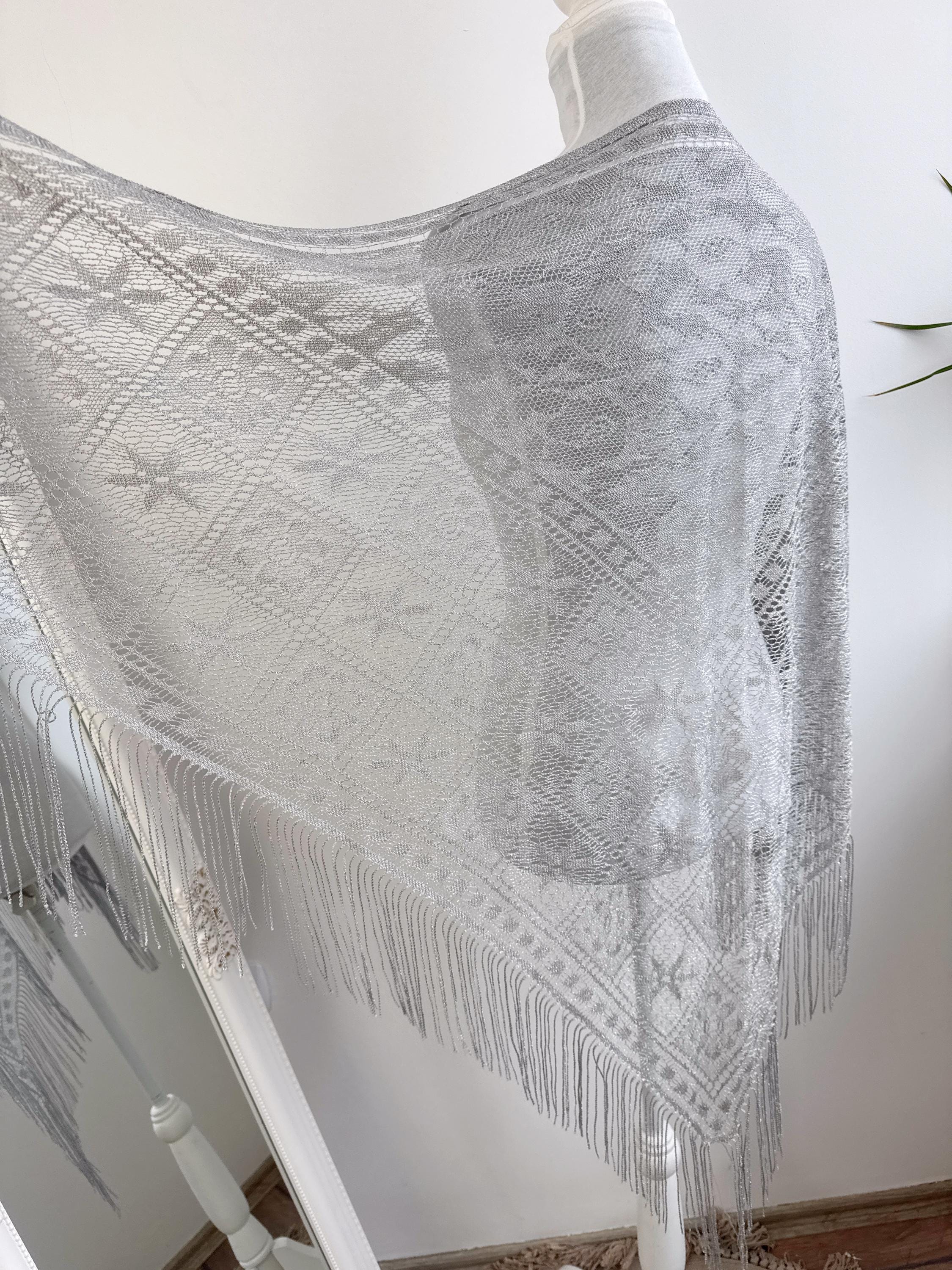 This is a vintage light silver grey bohemian lace shawl with silver lame and lovely floral geometric decoration and fringed detailing around the edges. This see through scarf has a triangular shape. It is very delicate and lightweight. Perfect to wear over a dress, a solid color blouse or turtleneck. This white lace shawl will add a pop a style to your outfit.