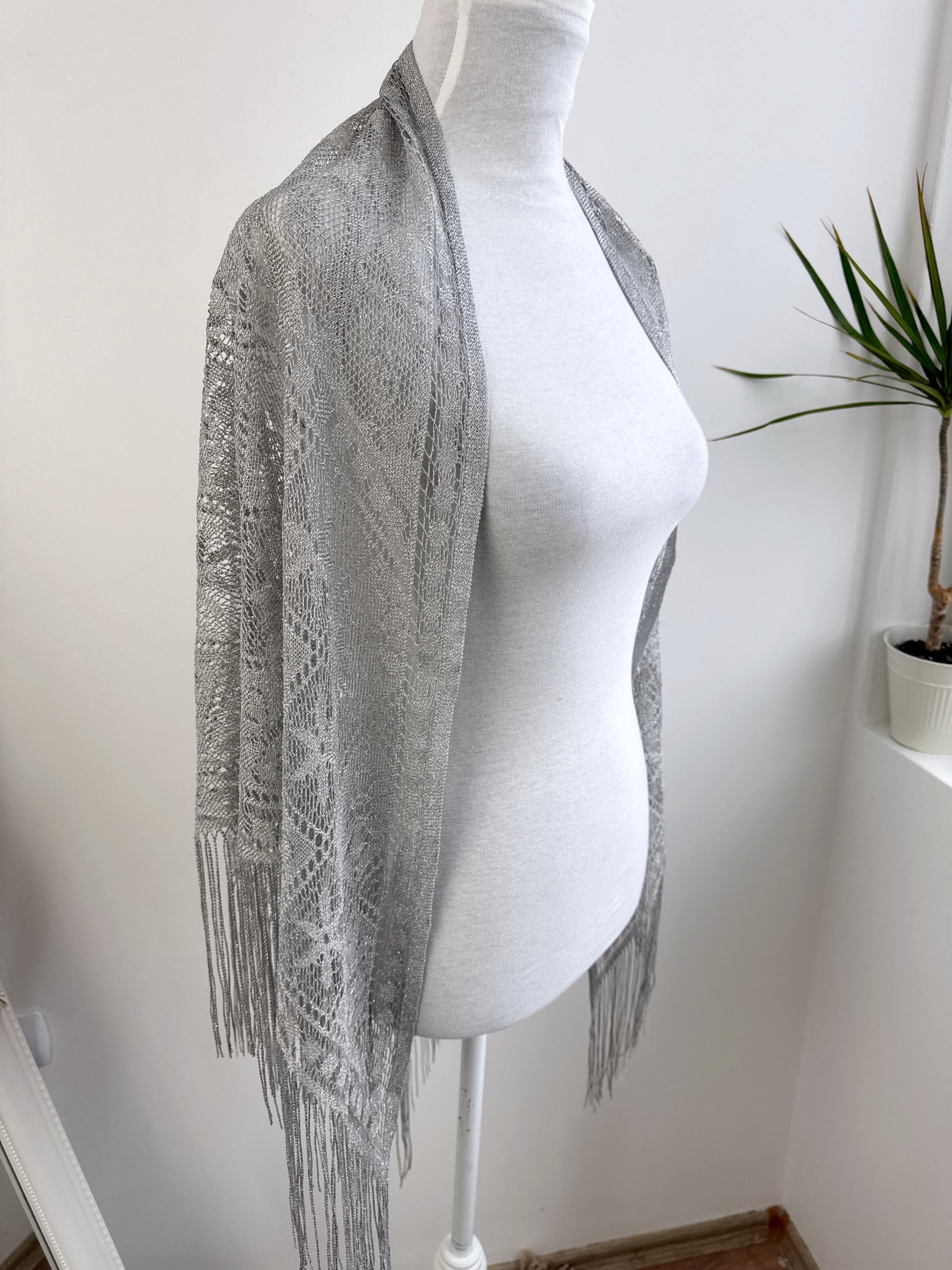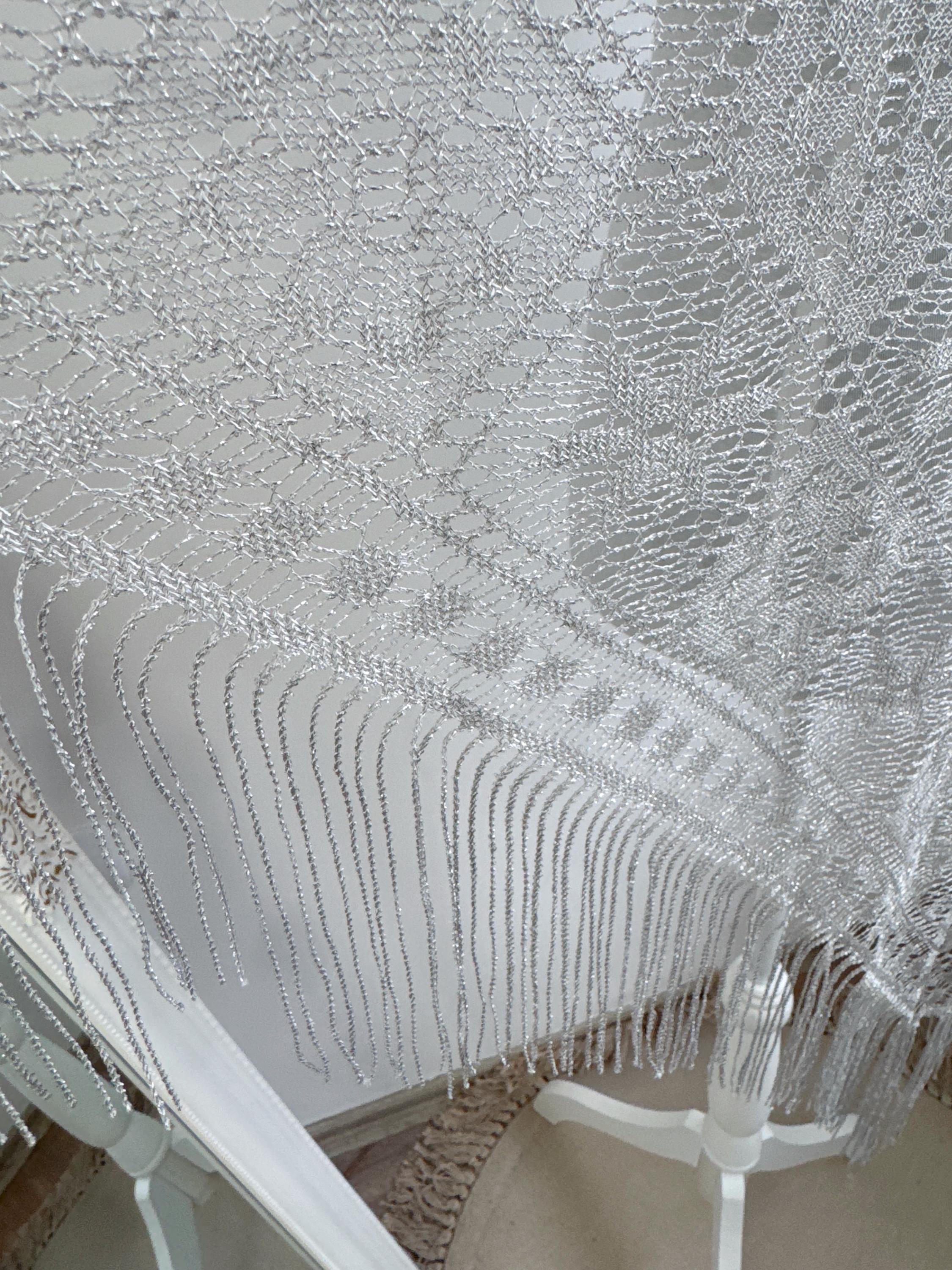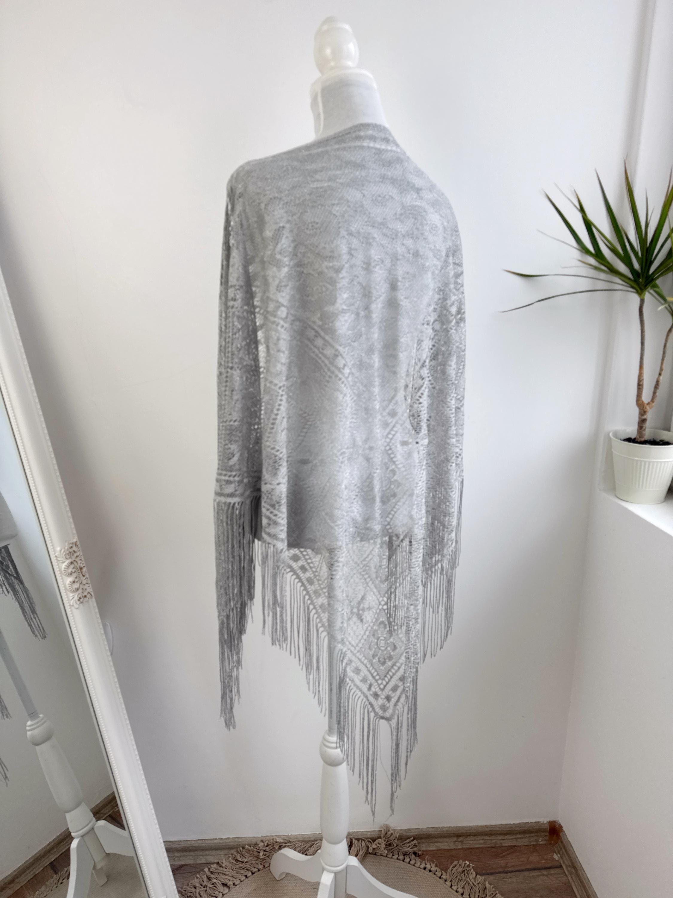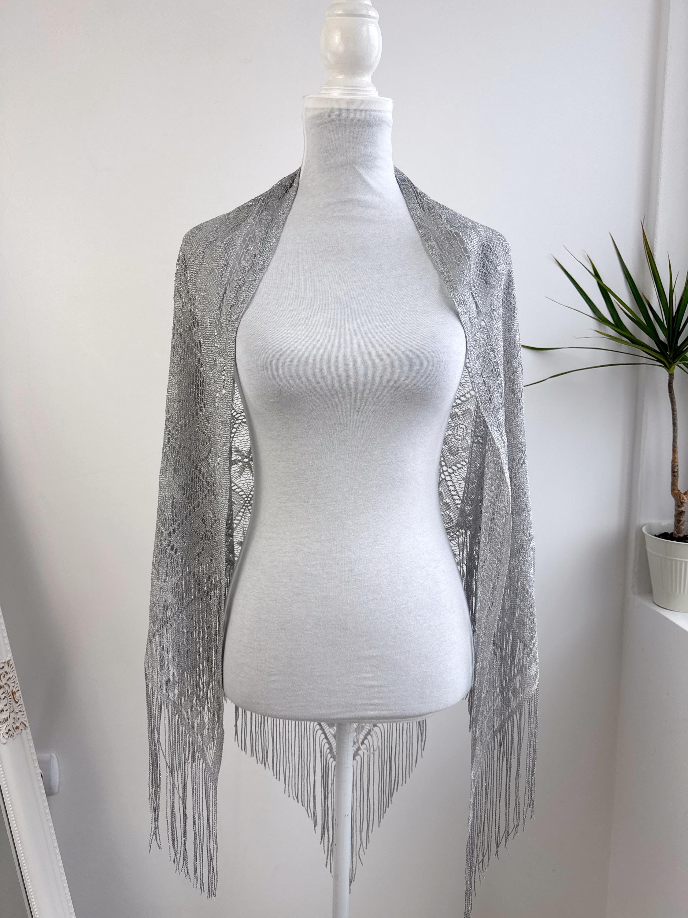 This is a vintage light silver grey bohemian lace shawl with silver lame and lovely floral geometric decoration and fringed detailing around the edges. This see through scarf has a triangular shape. It is very delicate and lightweight. Perfect to wear over a dress, a solid color blouse or turtleneck. This white lace shawl will add a pop a style to your outfit.