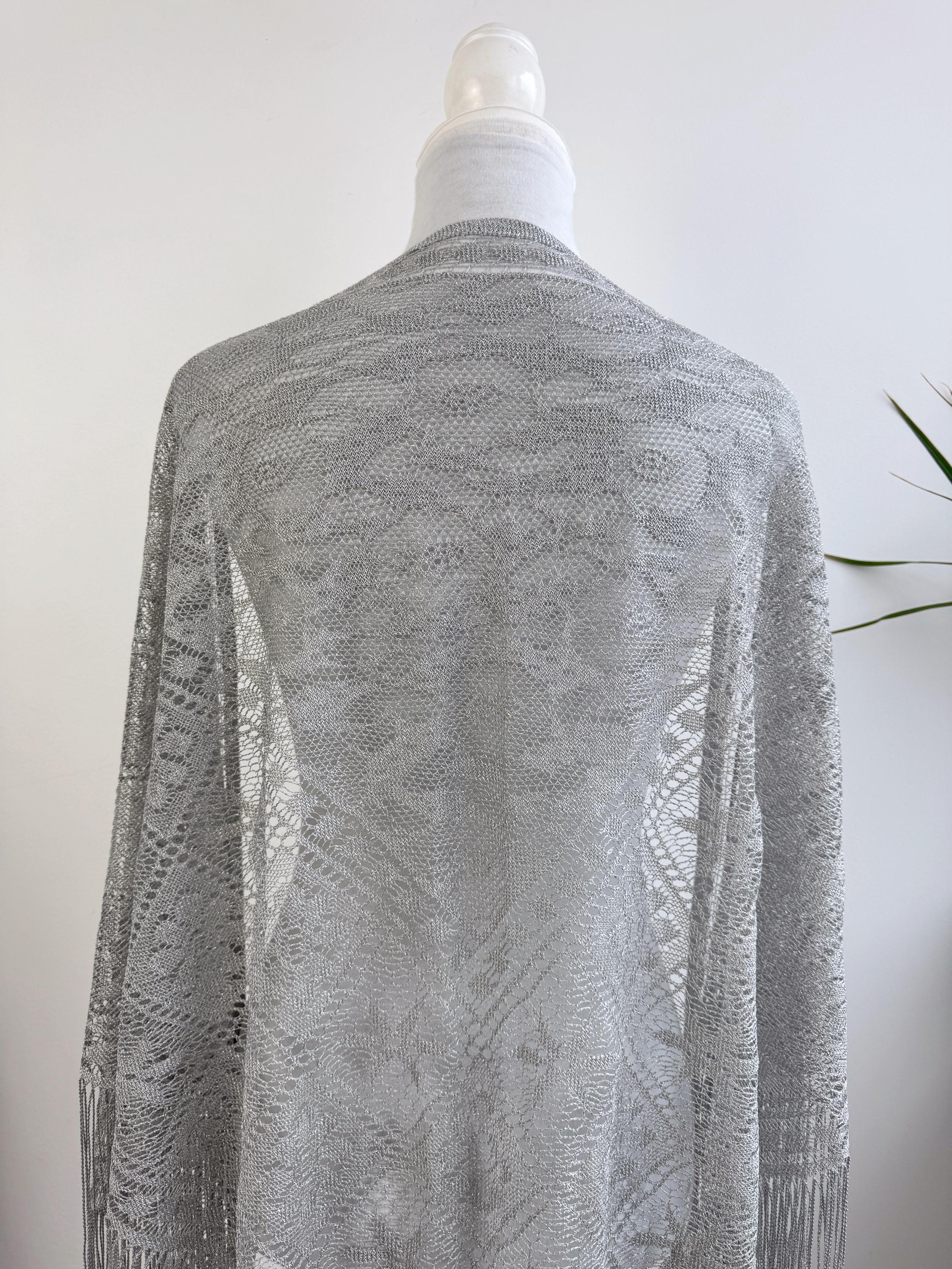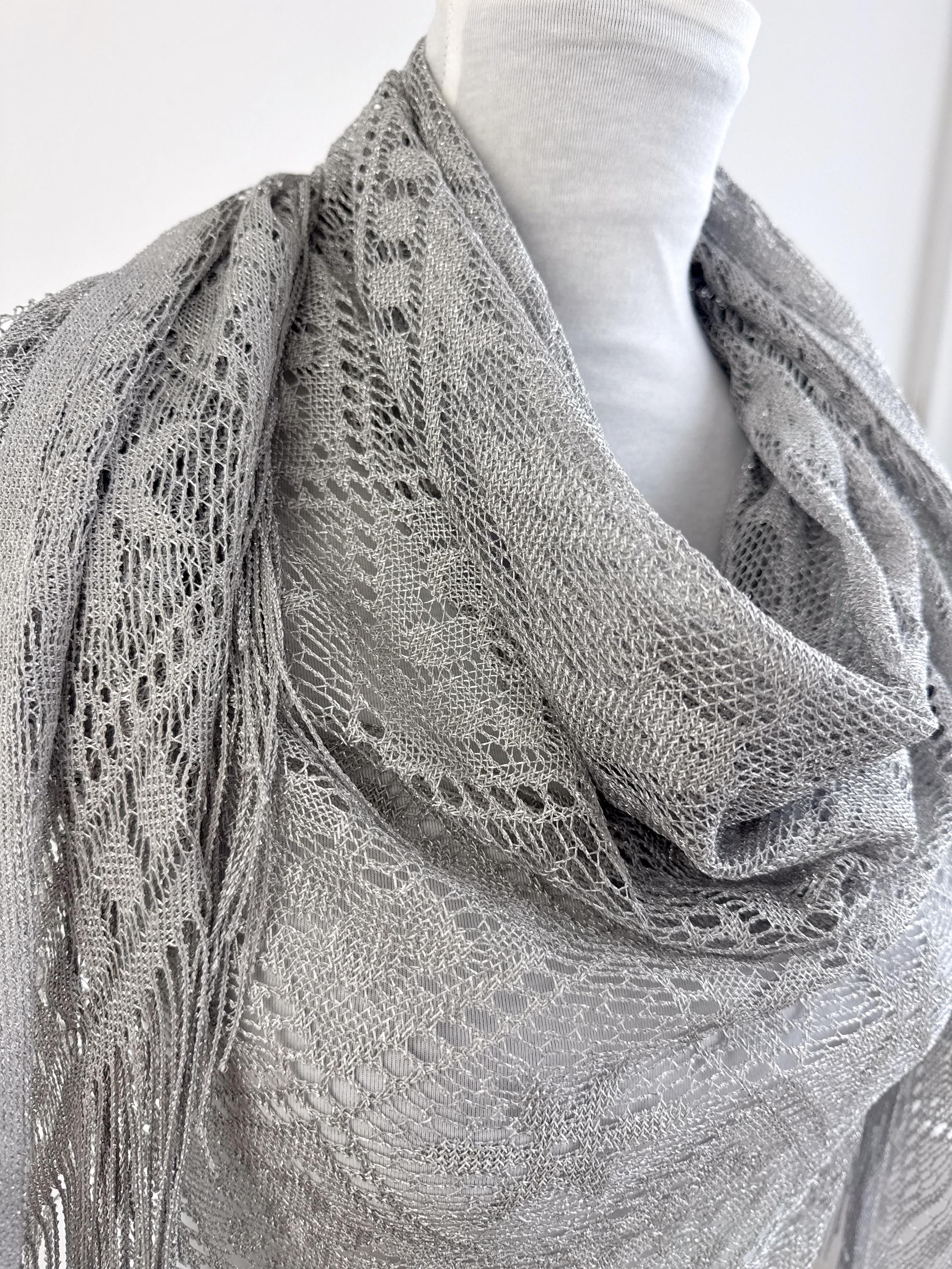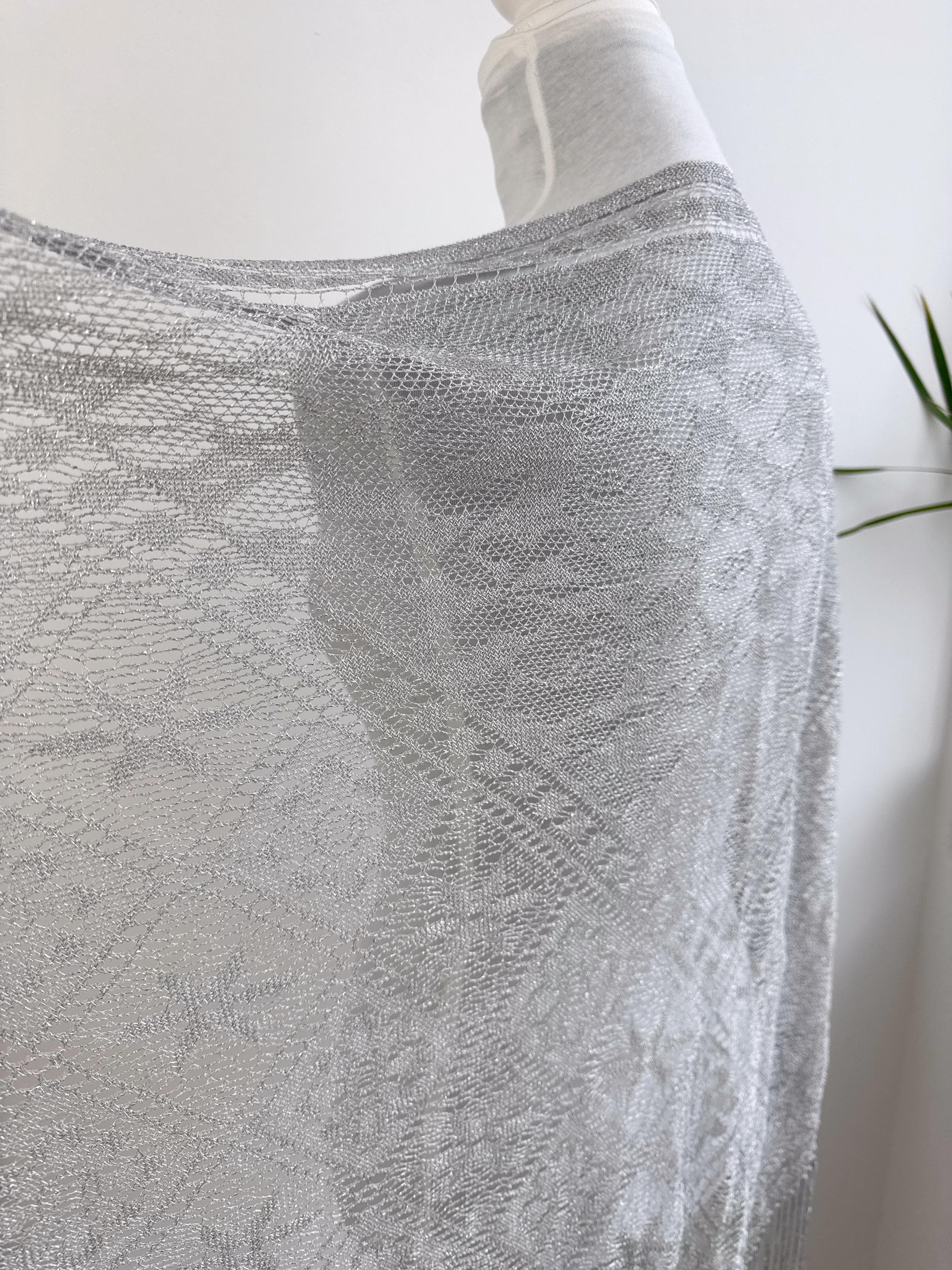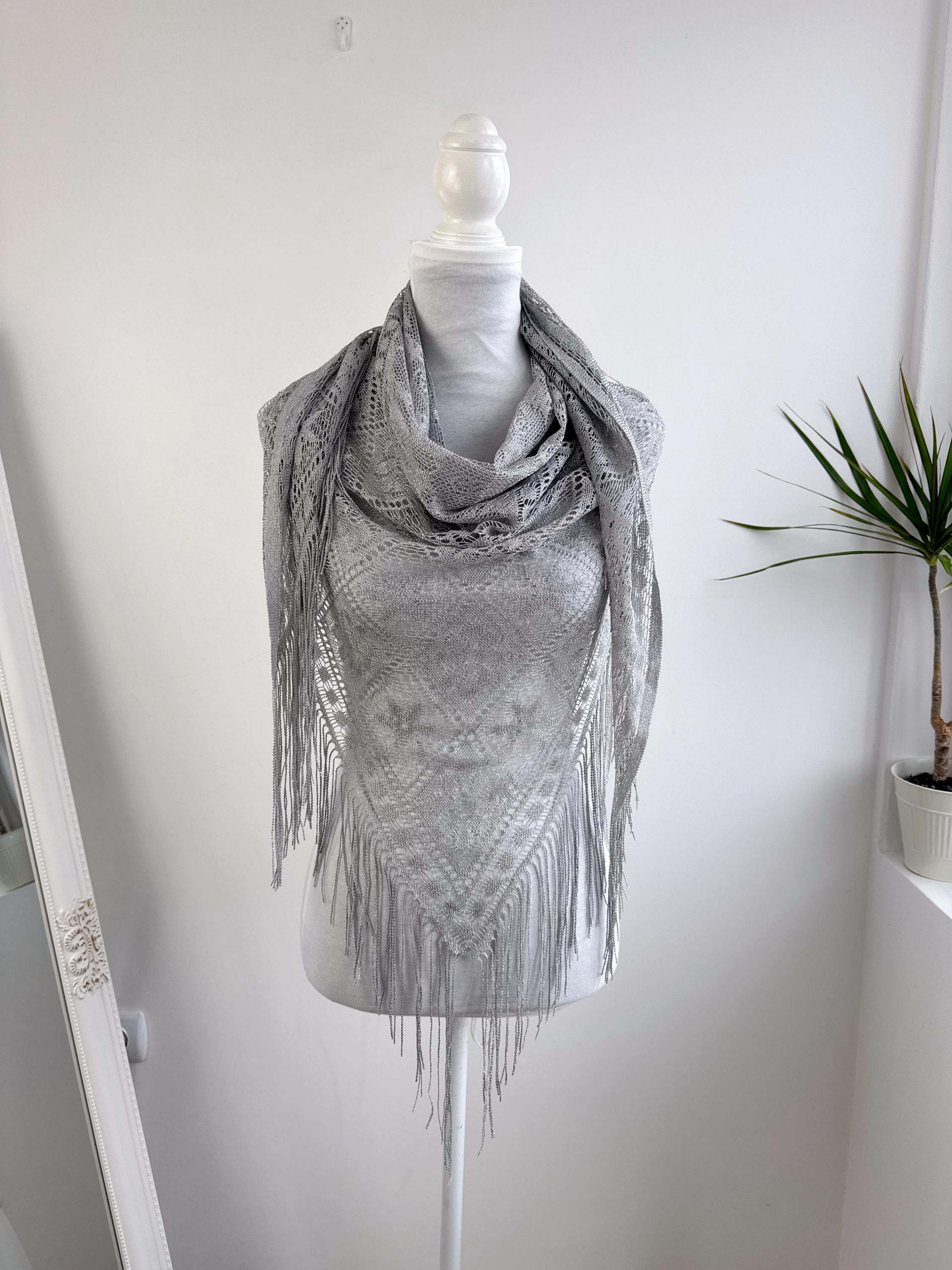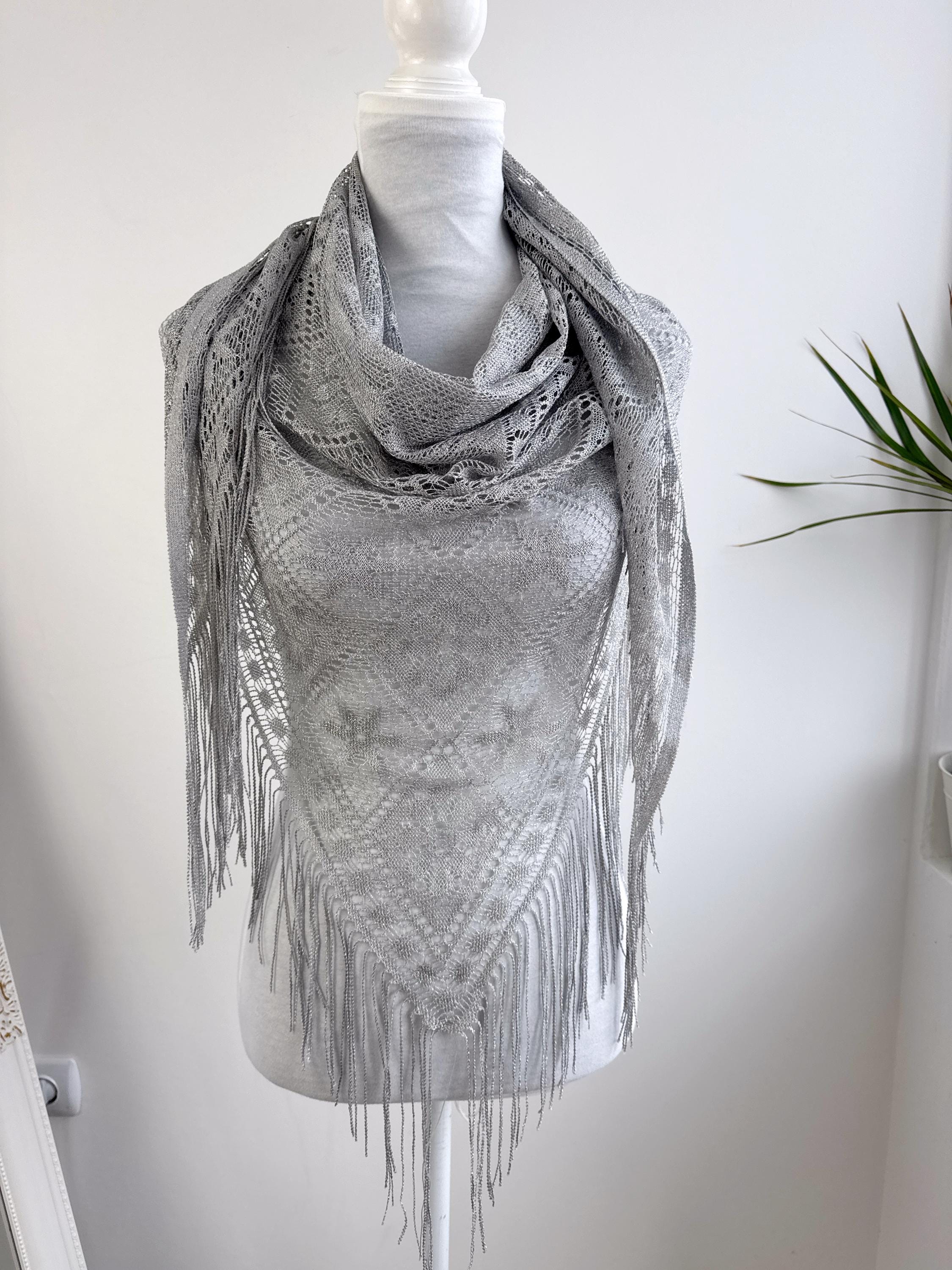 This is a vintage light silver grey bohemian lace shawl with silver lame and lovely floral geometric decoration and fringed detailing around the edges. This see through scarf has a triangular shape. It is very delicate and lightweight. Perfect to wear over a dress, a solid color blouse or turtleneck. This white lace shawl will add a pop a style to your outfit.