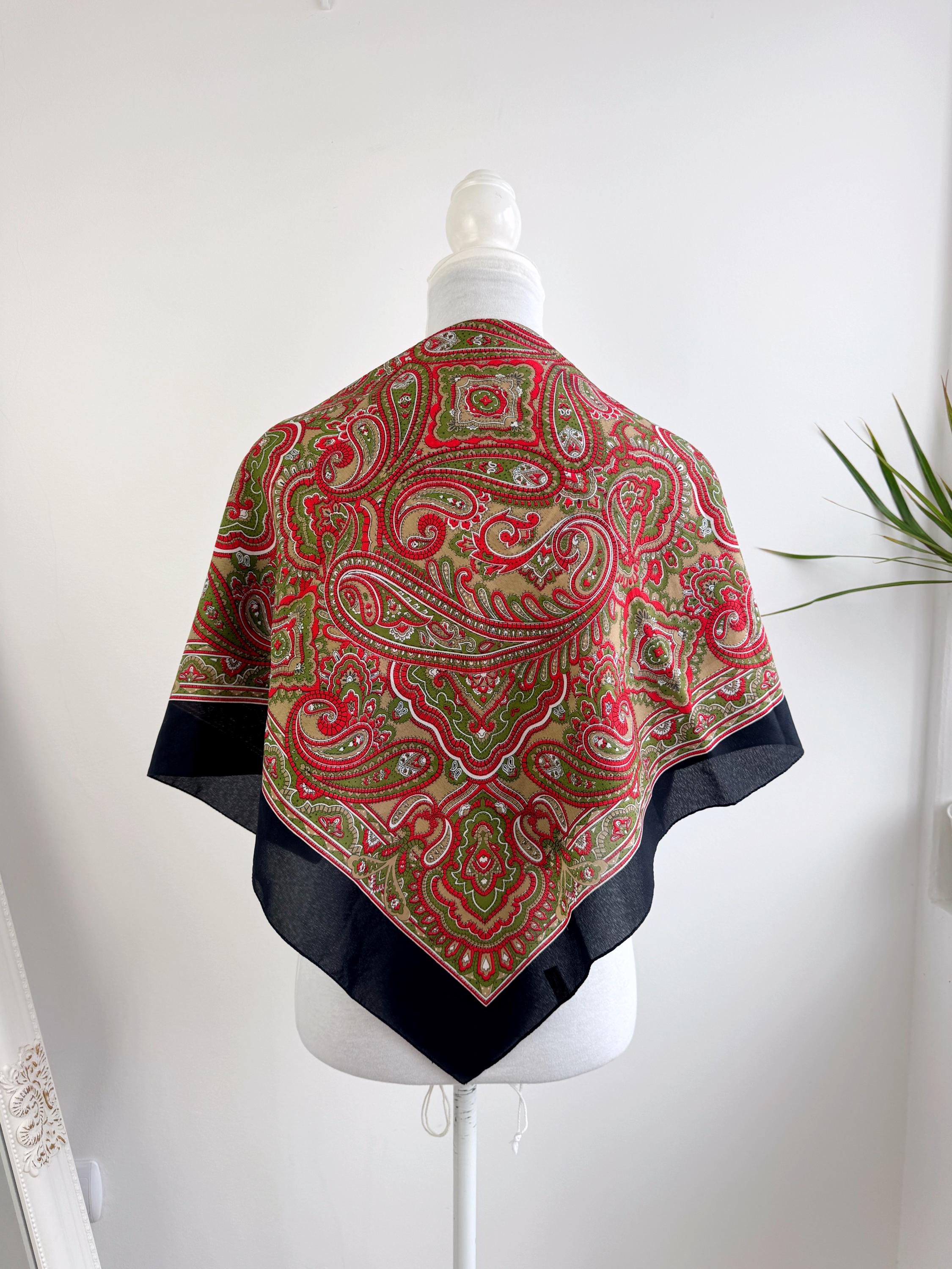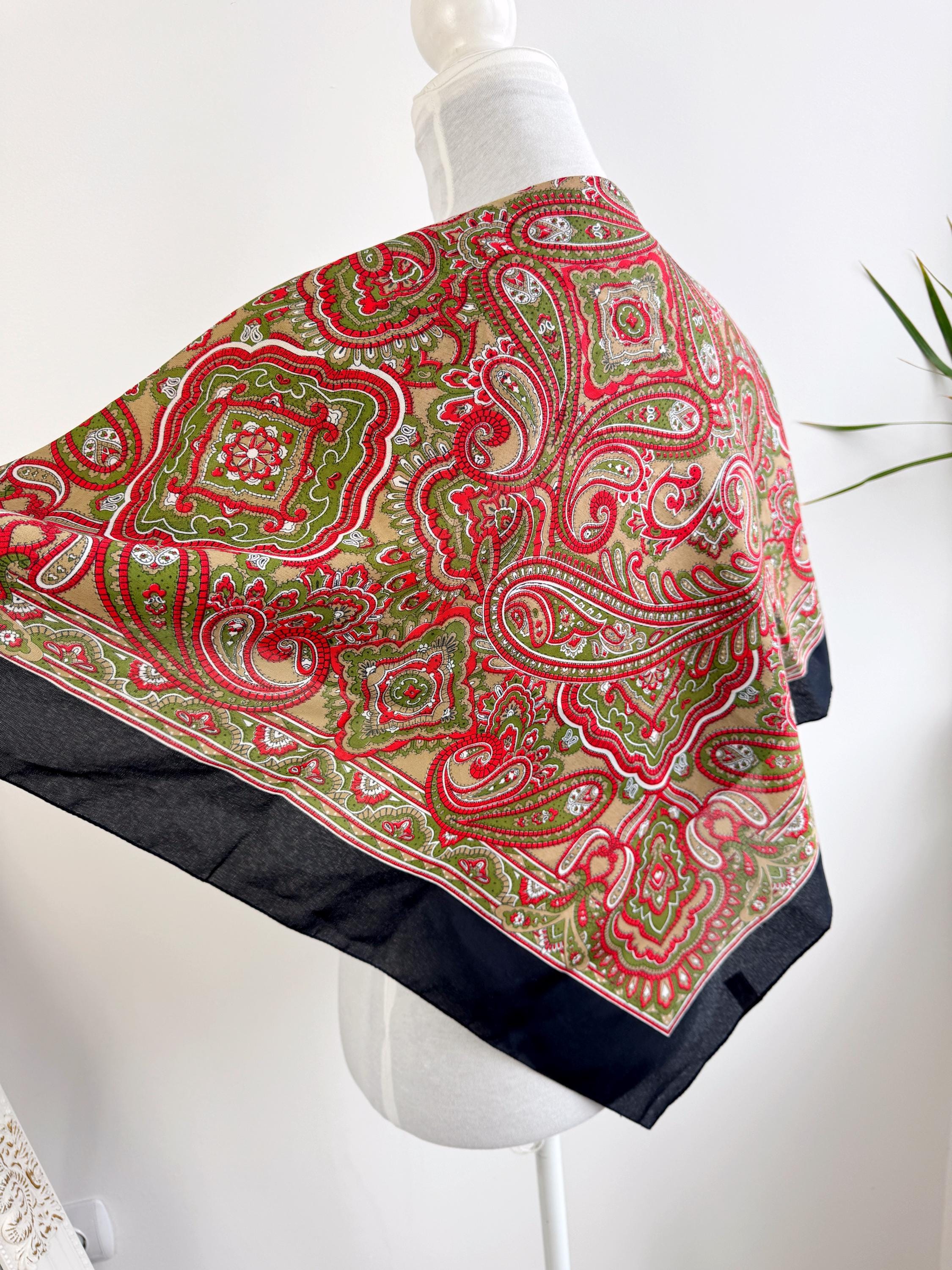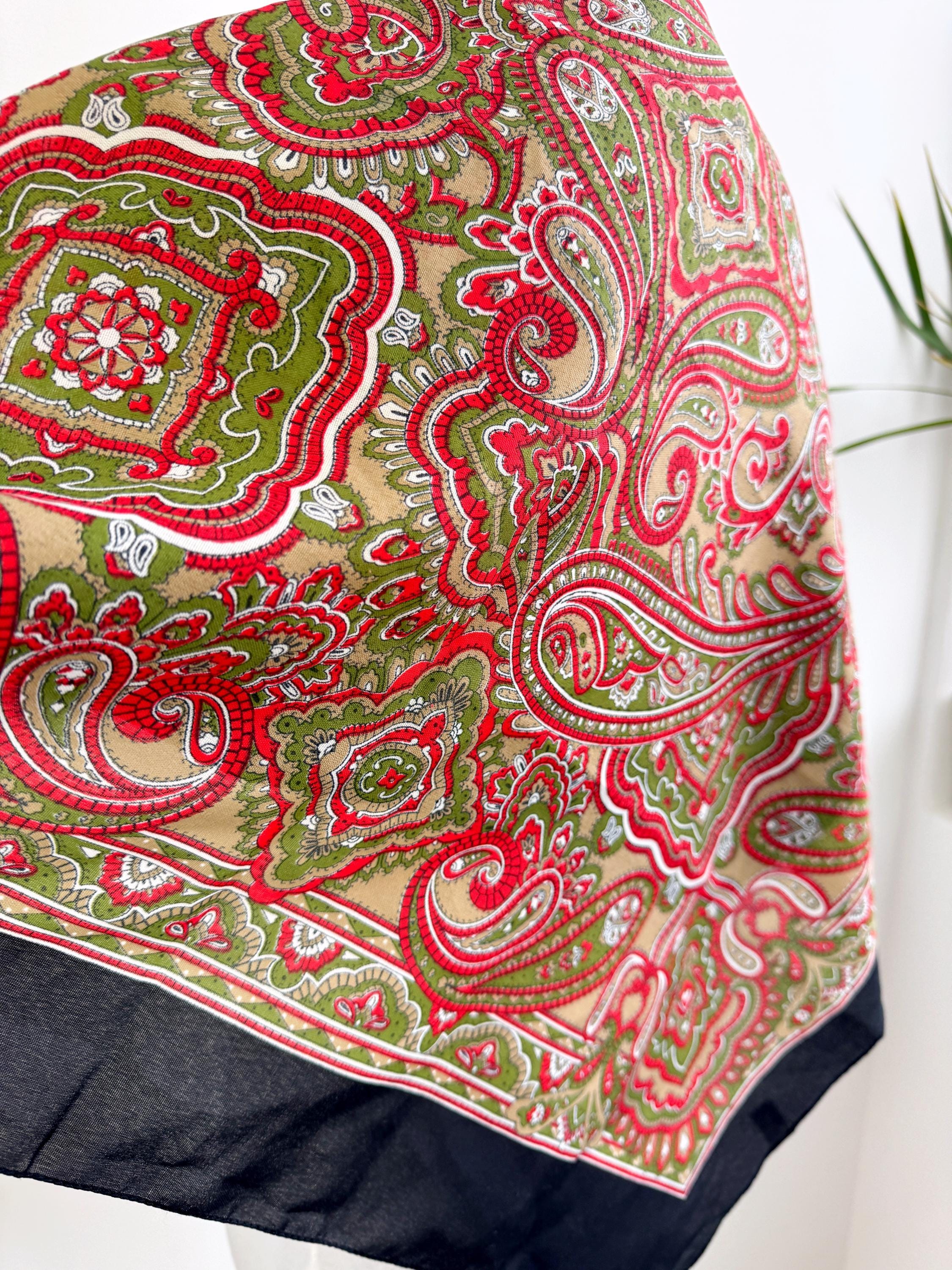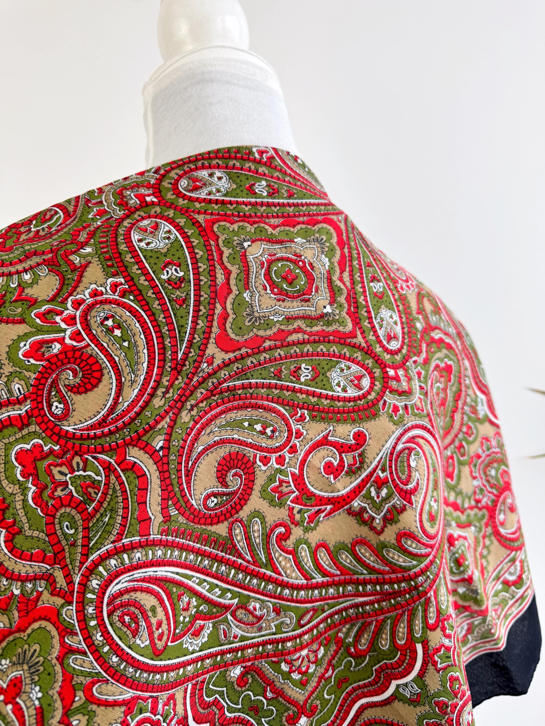 This stunning vintage paisley scarf will add a touch of timeless Italian sophistication to your wardrobe. Featuring a rich color palette of vibrant red, olive green, and earthy tan against a deep black border, this large square shawl is a versatile accessory for any season. The intricate, traditional paisley motifs create a bold bohemian look that elevates a simple coat or adds a retro vibe to your favorite outfit.