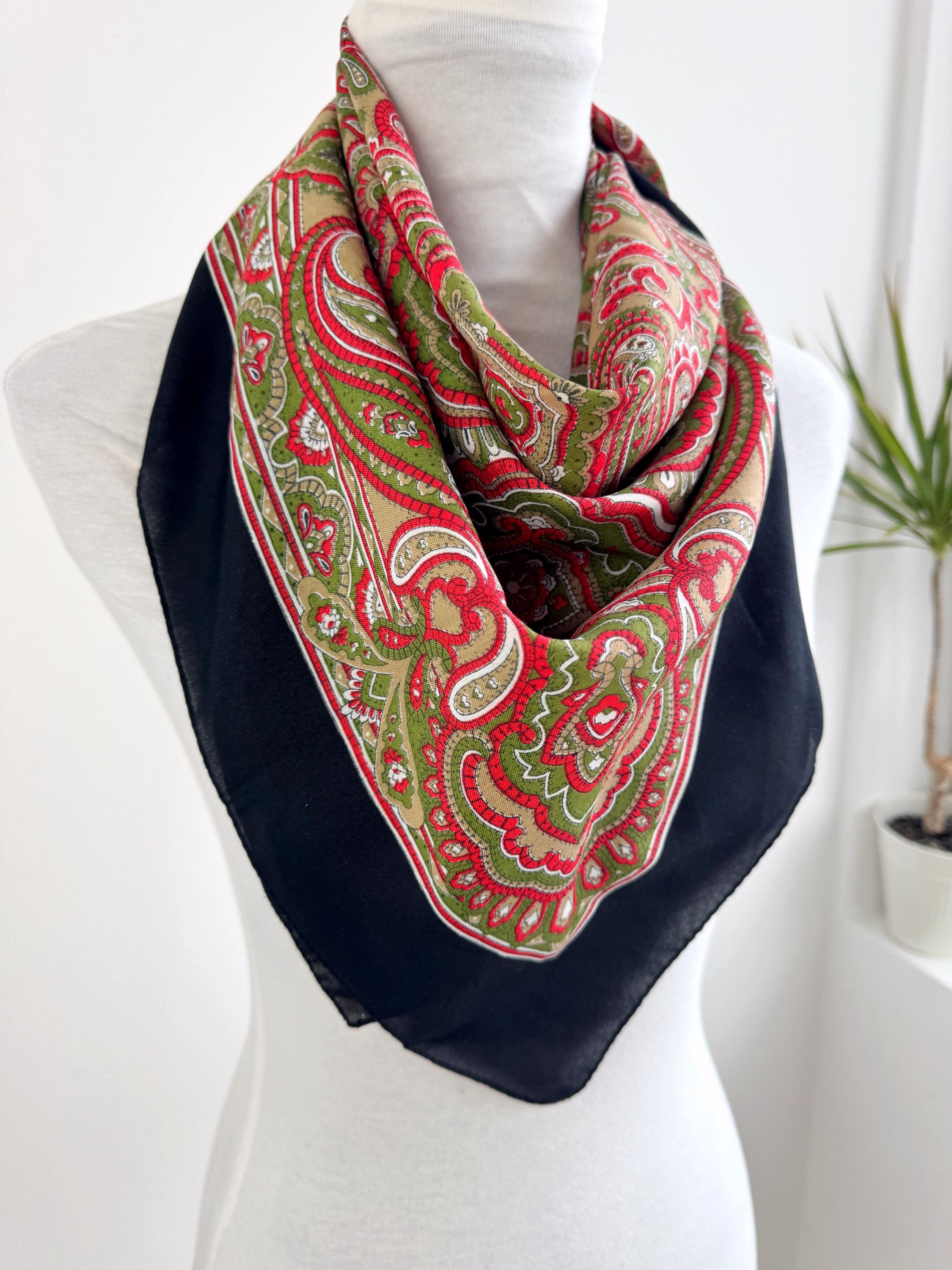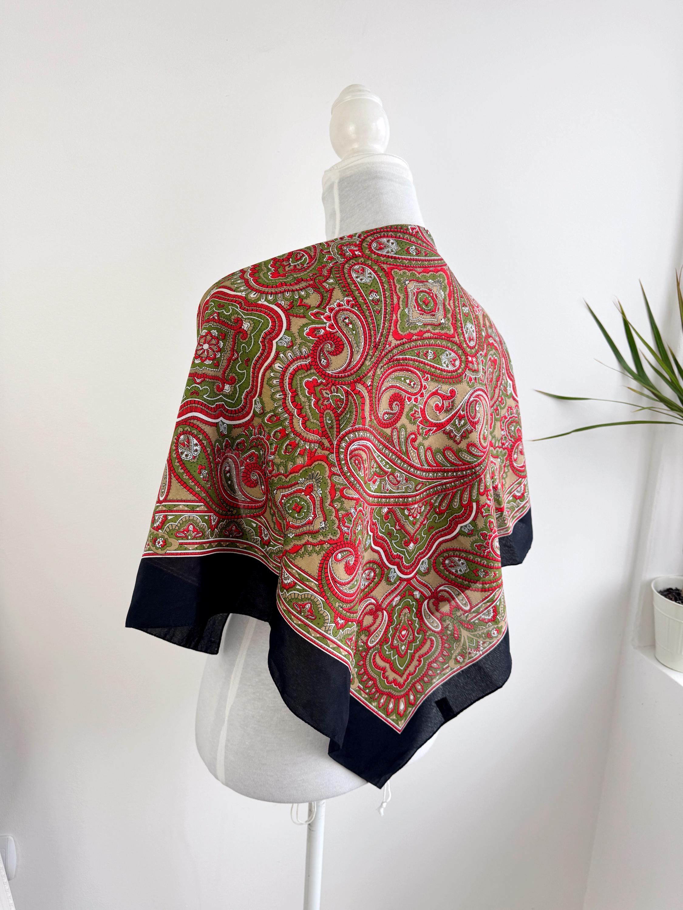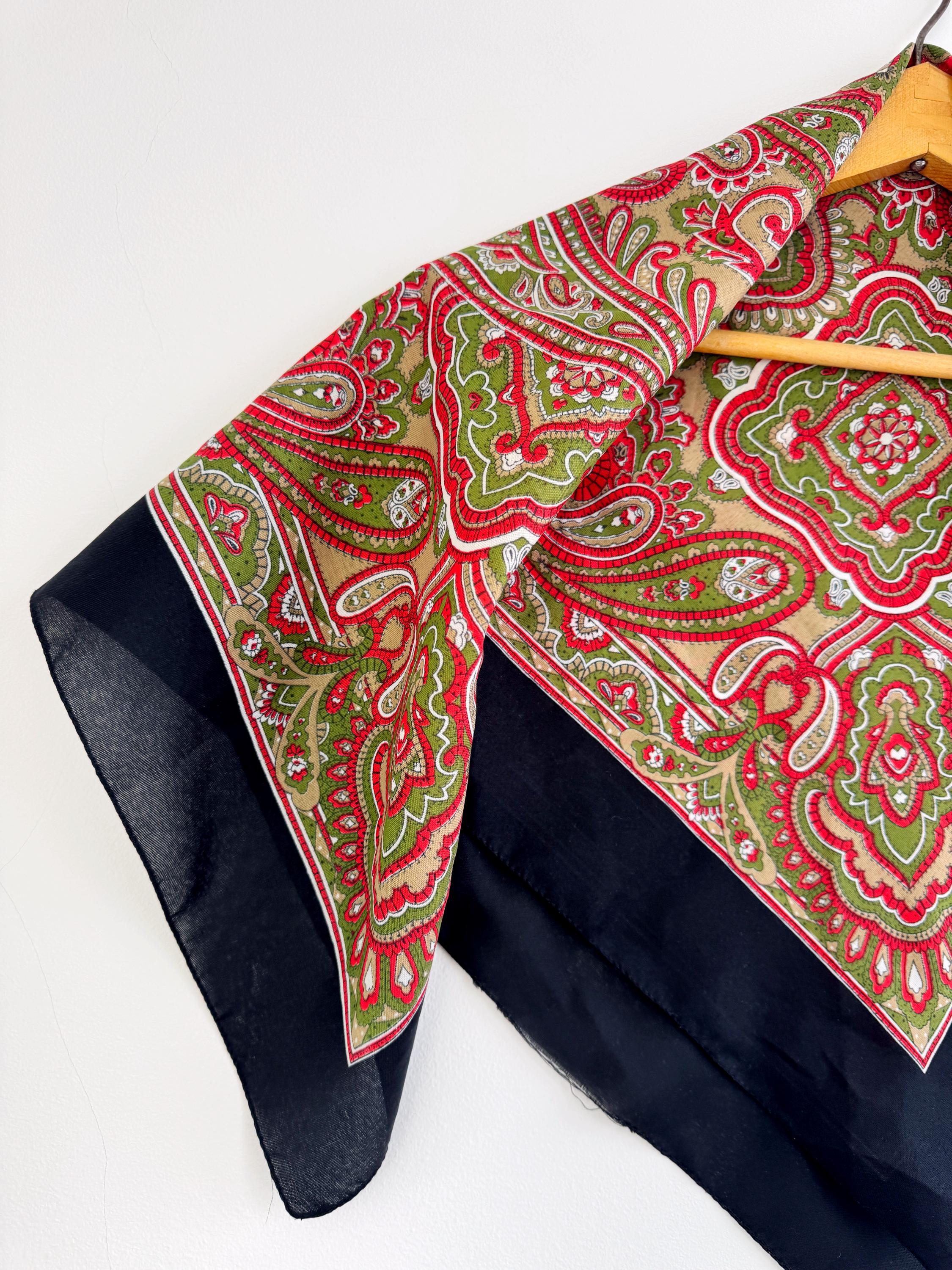 This stunning vintage paisley scarf will add a touch of timeless Italian sophistication to your wardrobe. Featuring a rich color palette of vibrant red, olive green, and earthy tan against a deep black border, this large square shawl is a versatile accessory for any season. The intricate, traditional paisley motifs create a bold bohemian look that elevates a simple coat or adds a retro vibe to your favorite outfit.