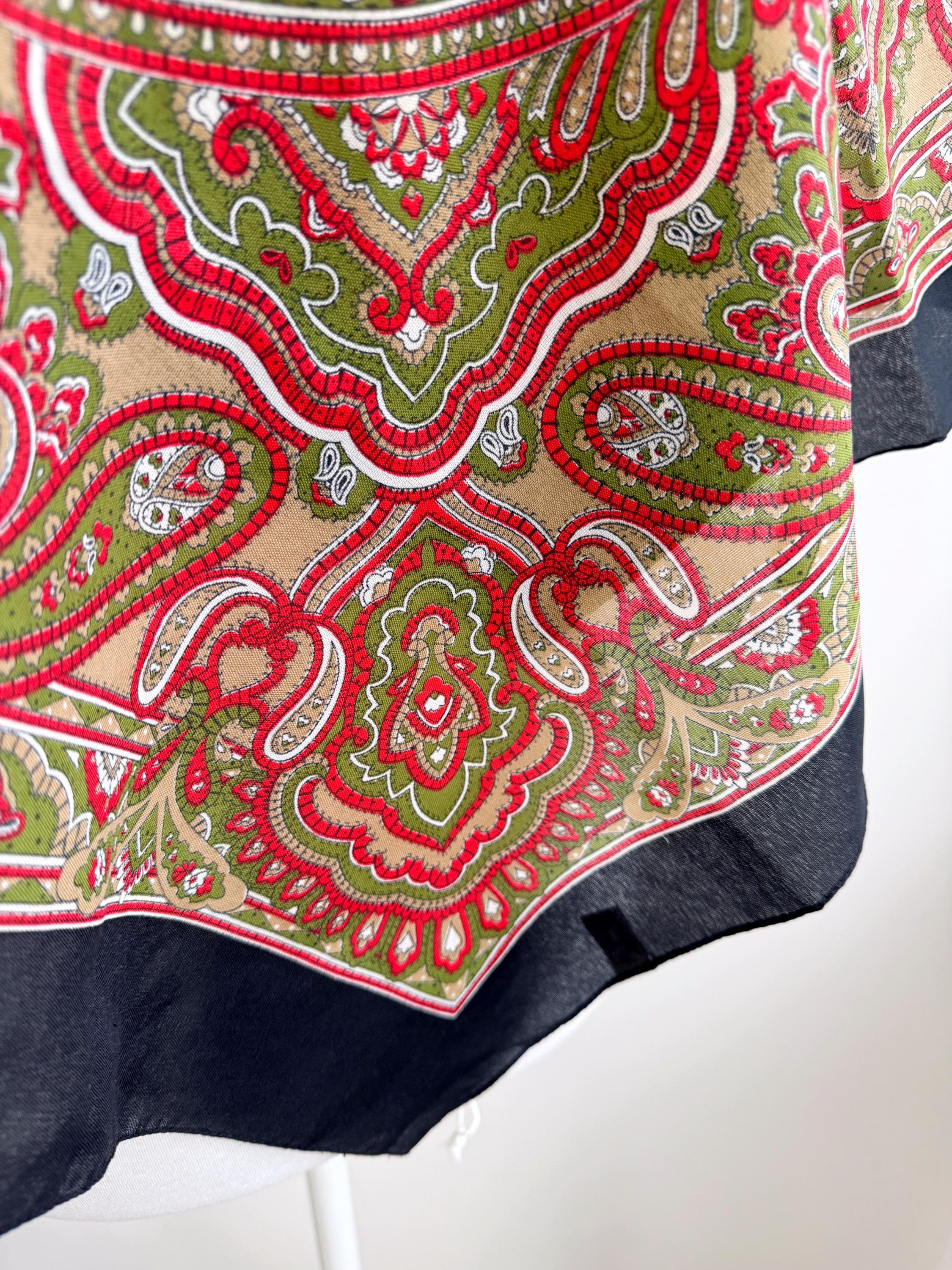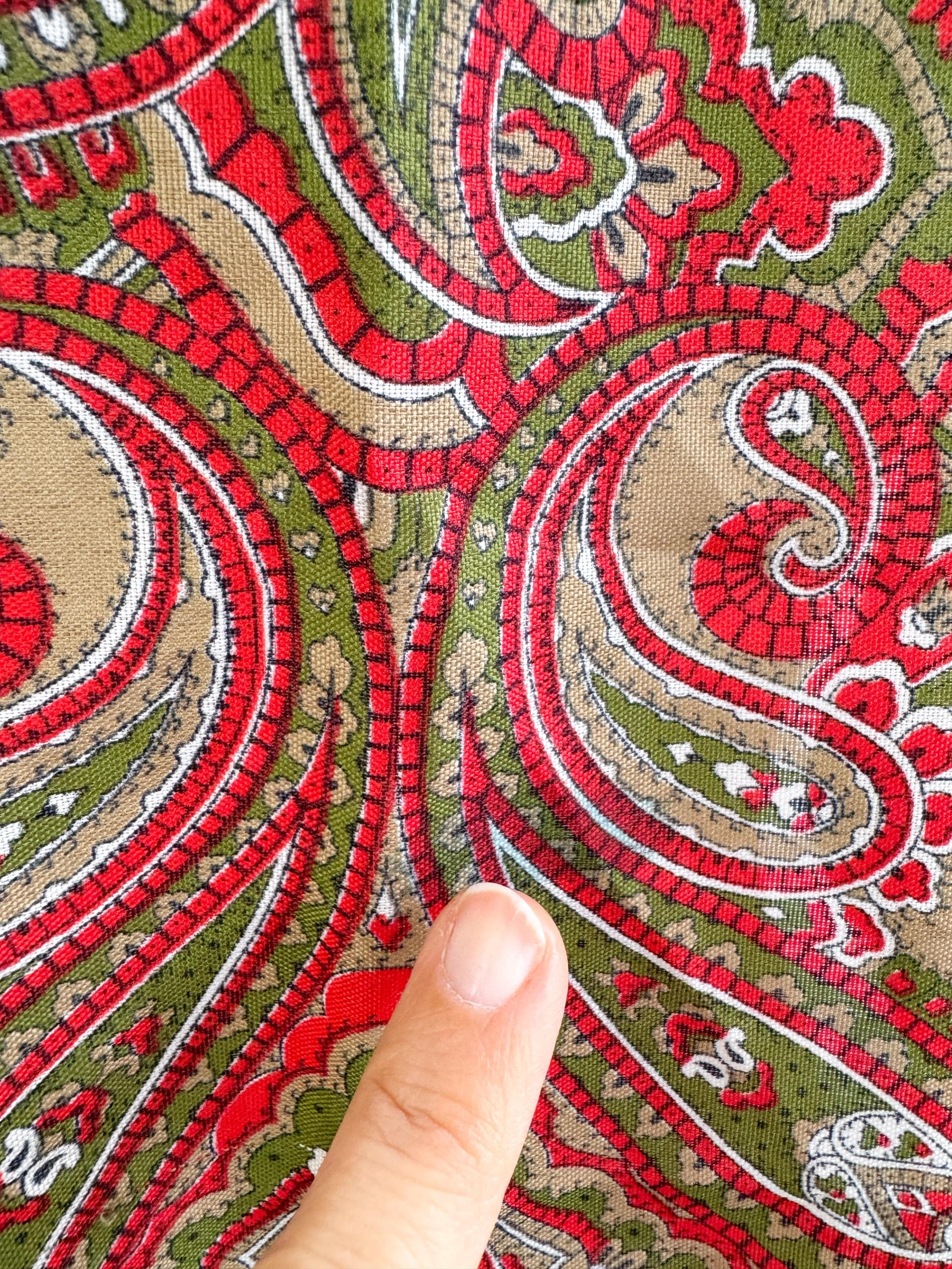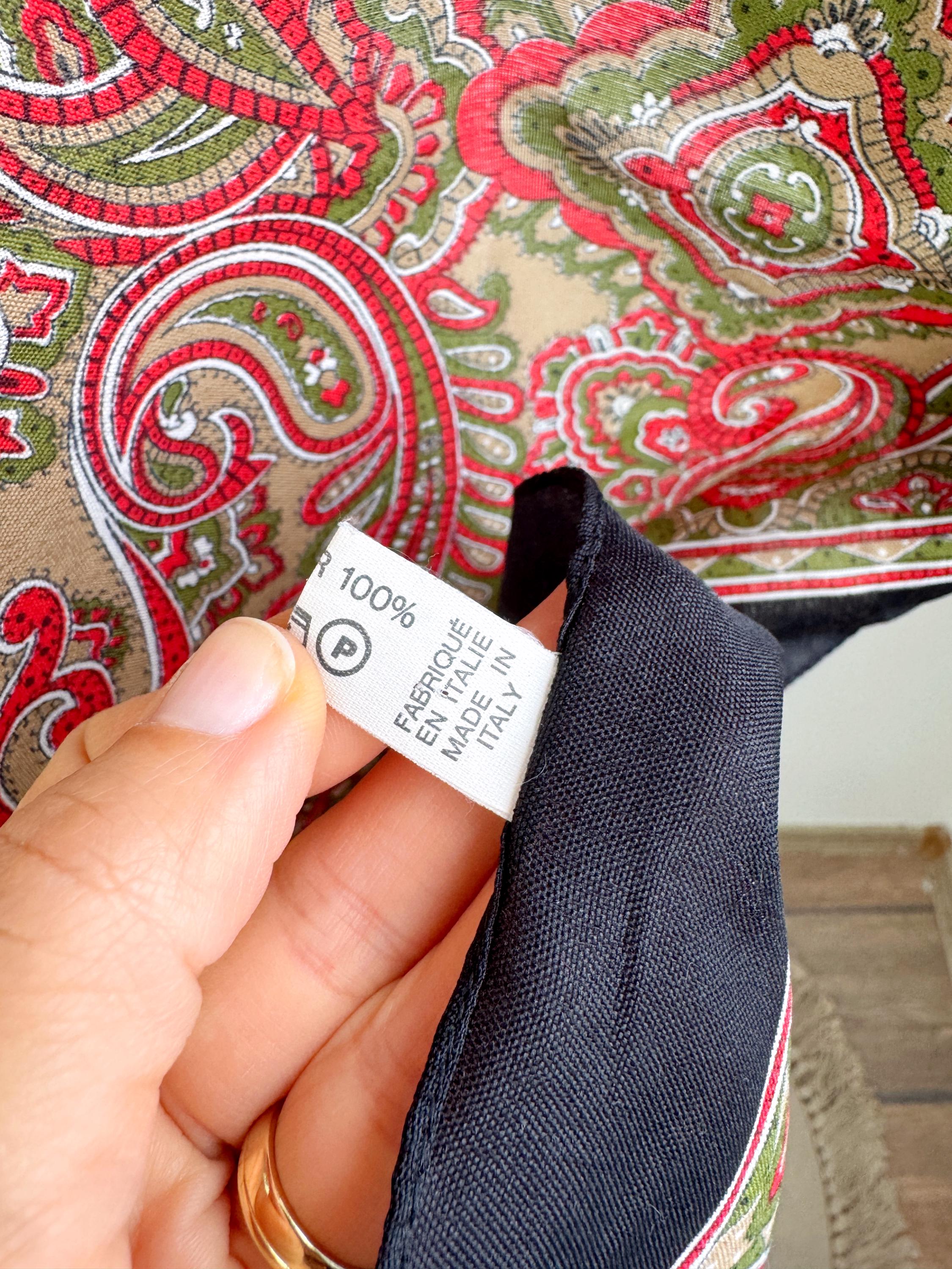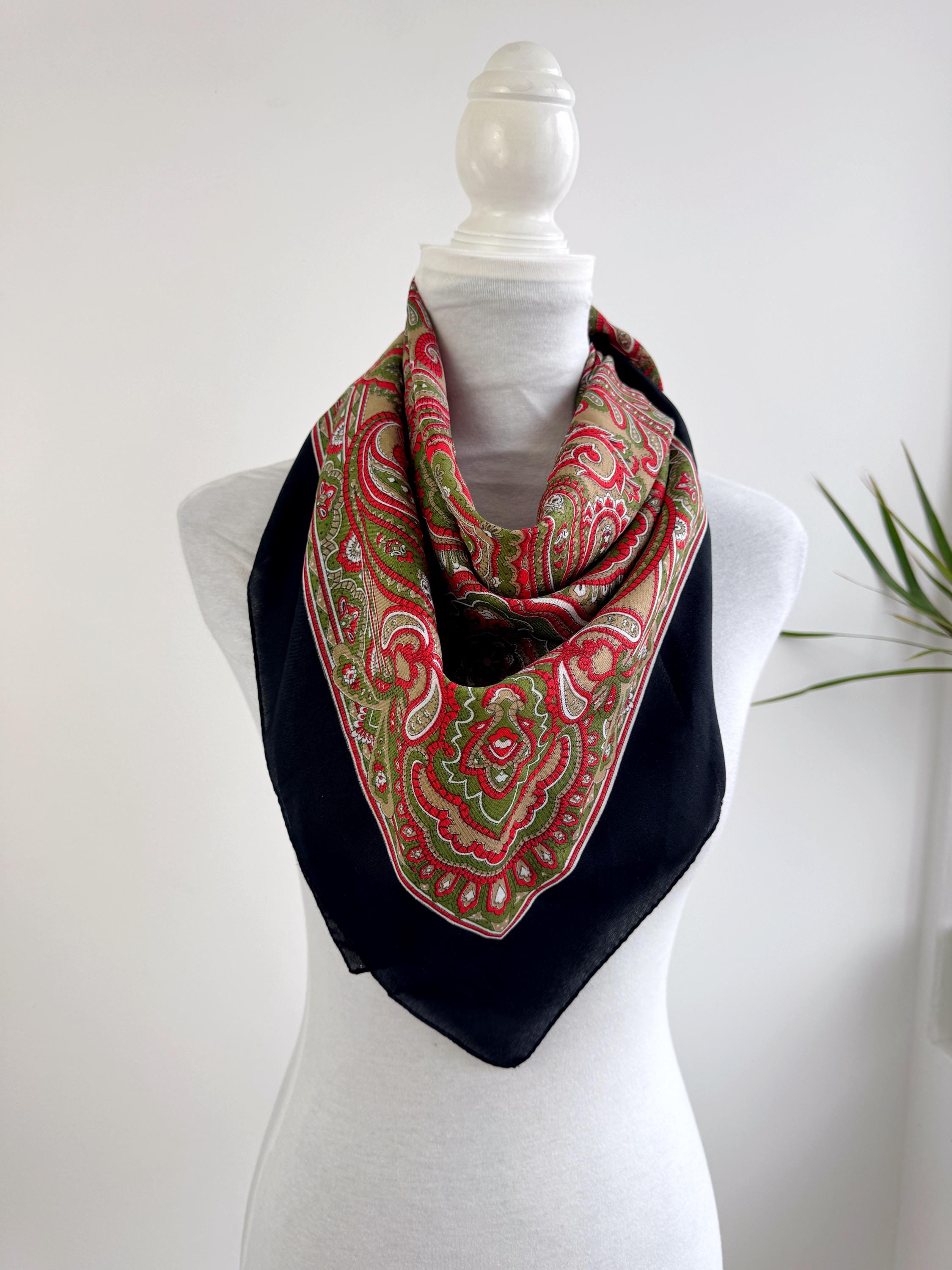 This stunning vintage paisley scarf will add a touch of timeless Italian sophistication to your wardrobe. Featuring a rich color palette of vibrant red, olive green, and earthy tan against a deep black border, this large square shawl is a versatile accessory for any season. The intricate, traditional paisley motifs create a bold bohemian look that elevates a simple coat or adds a retro vibe to your favorite outfit.