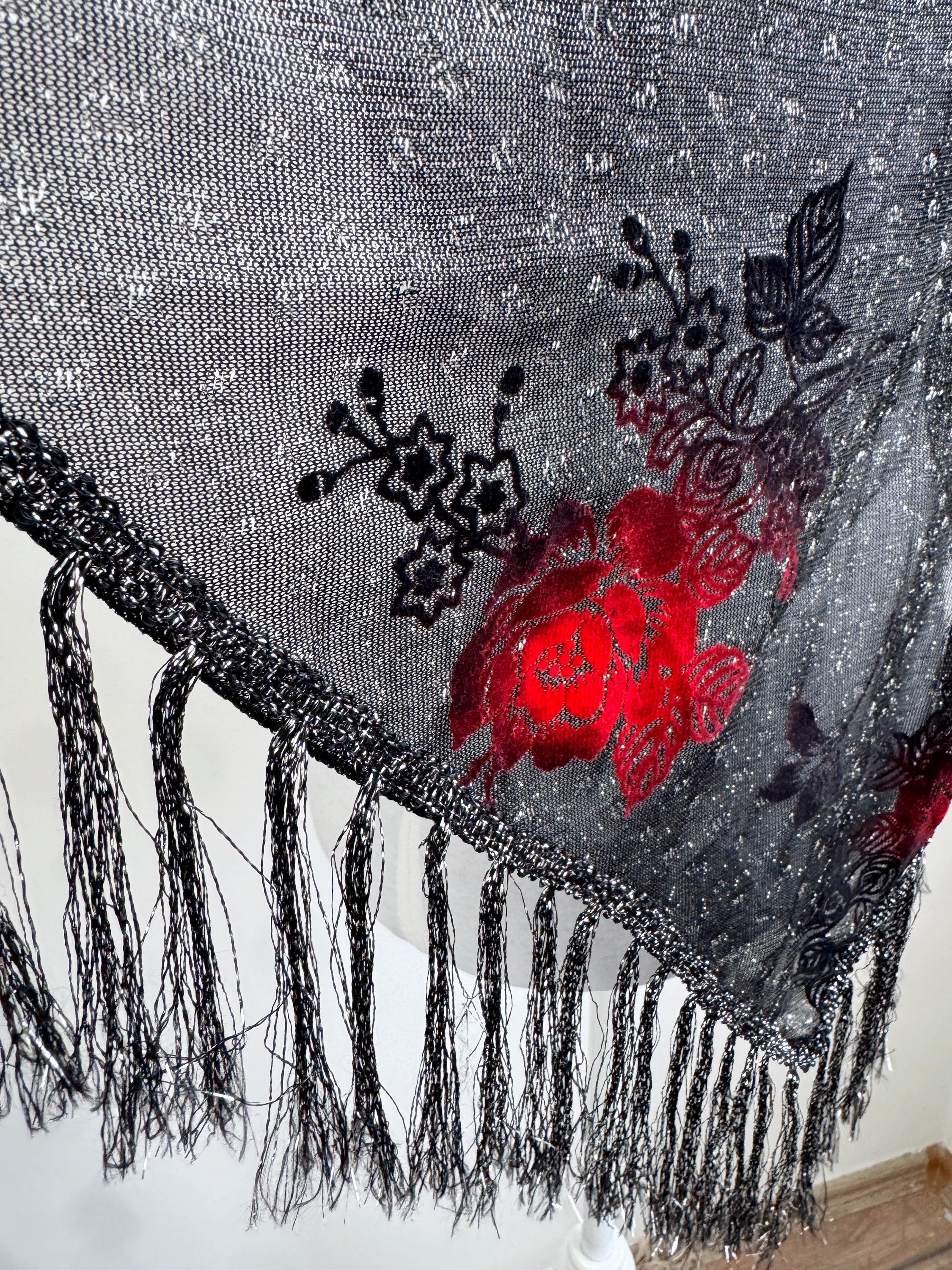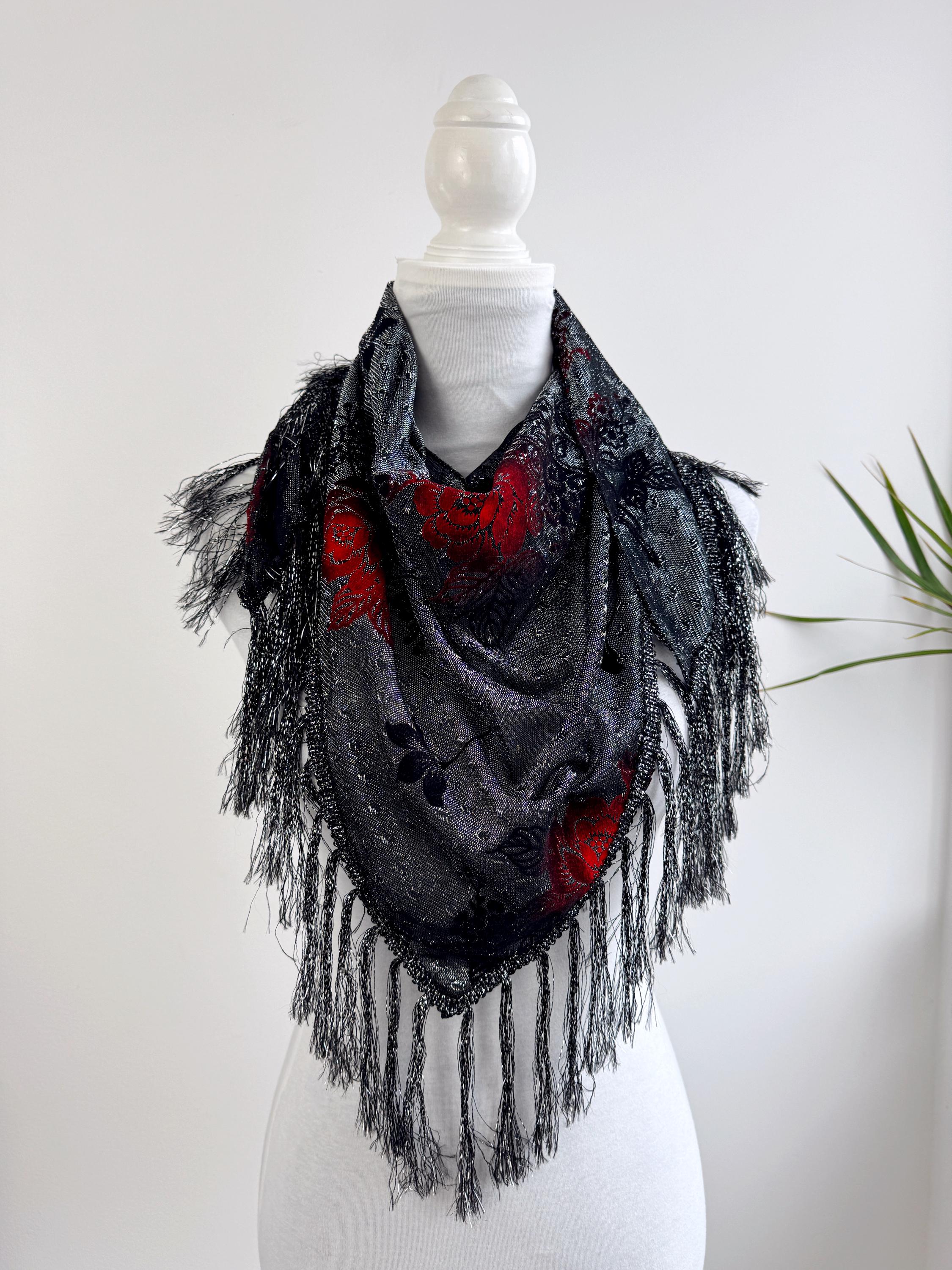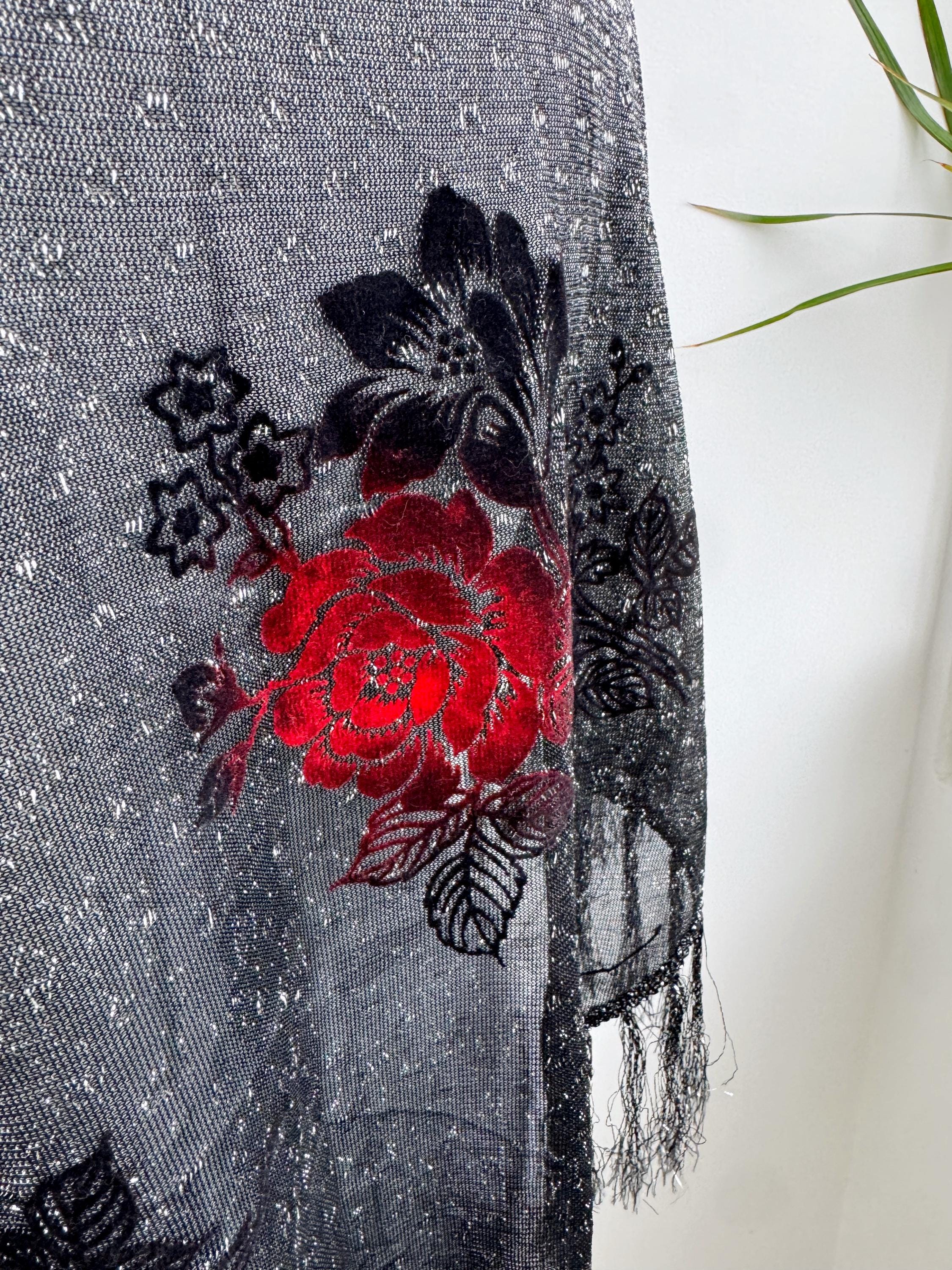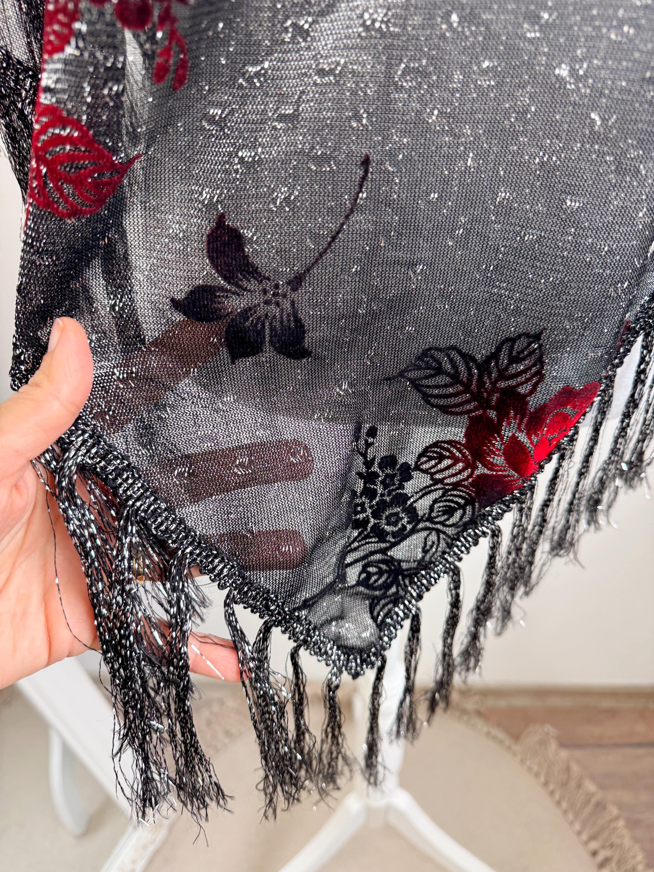 This is a beautiful vintage 80s filver black metallic evening scarf with burn out velvet red roses floral pattern and silver lame which shimmers beautifully when exposed to light. The delicate lightweight shiny triangle scarf has fringed detailing at the ends. It is made of 80% viscose and 20% lurex. This vintage see through evening wrap was made in Japan. This Gatsby style sheer mesh neck scarf is the perfect accessory for any cocktail party. It is stylish and it shimmers beautifully when exposed to light. Wonderful luxury vintage gift for her.