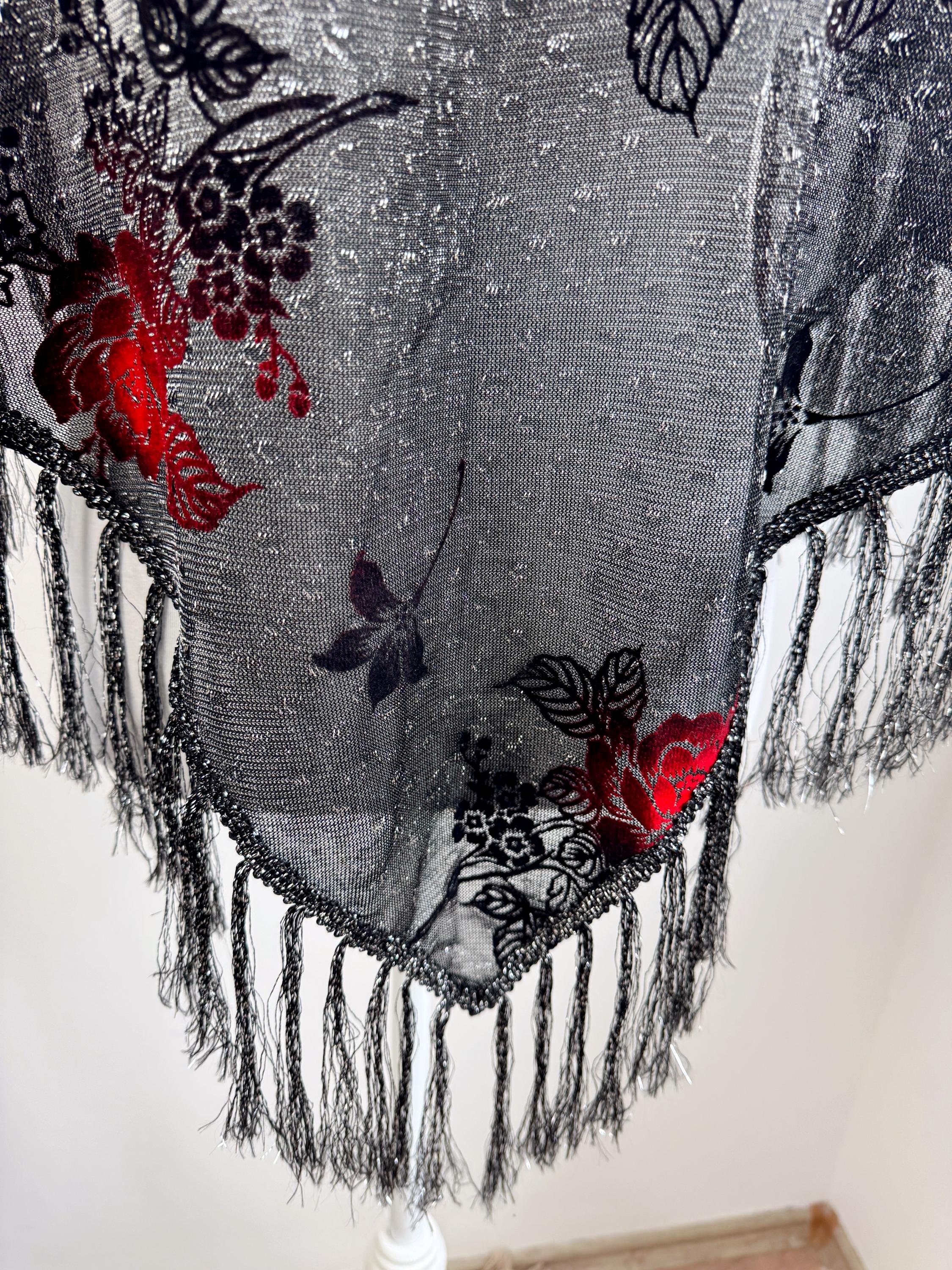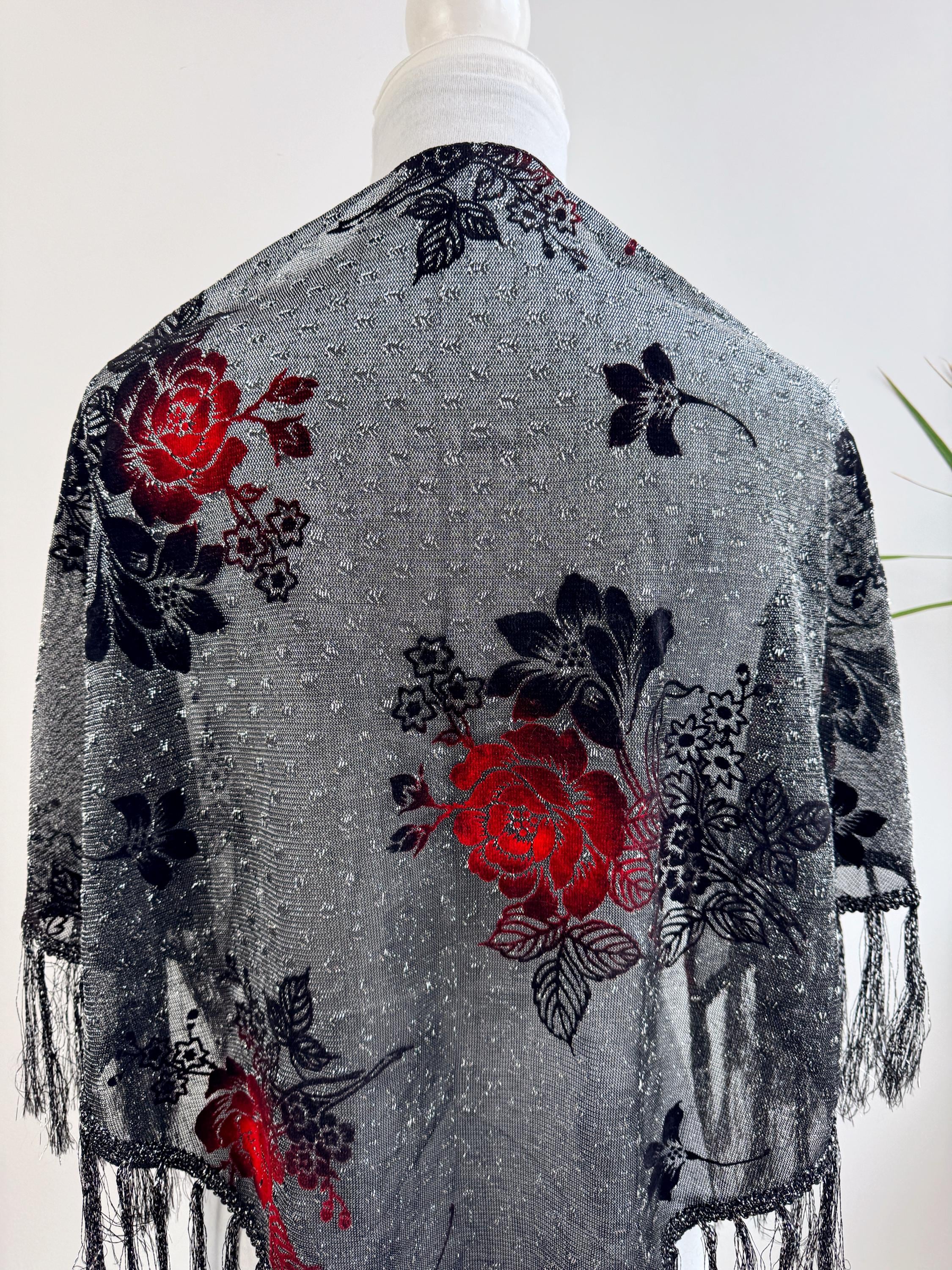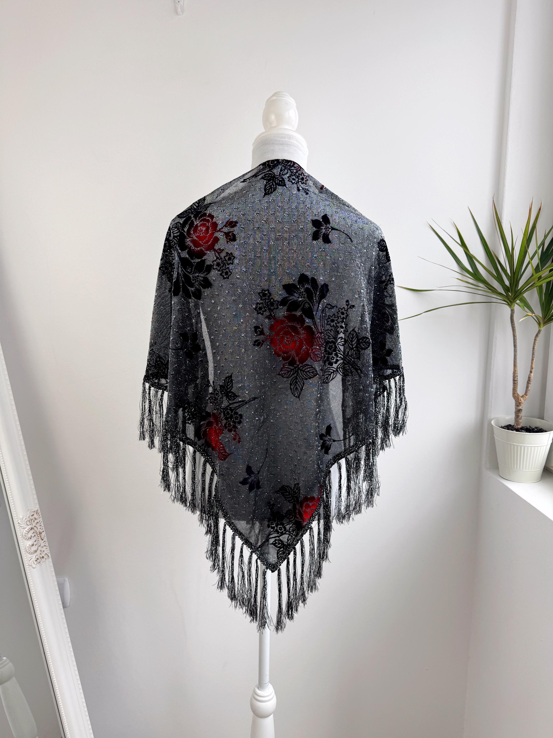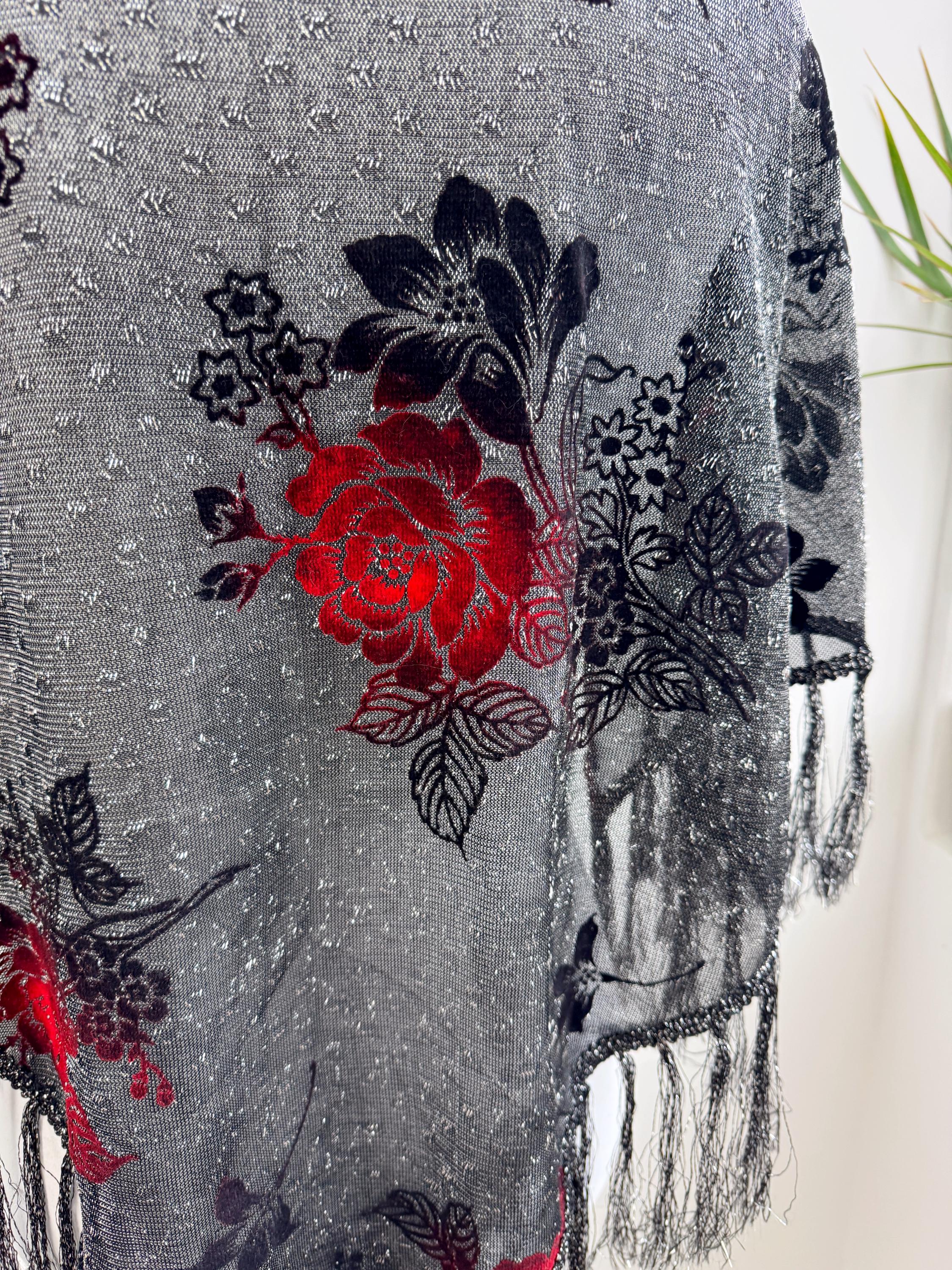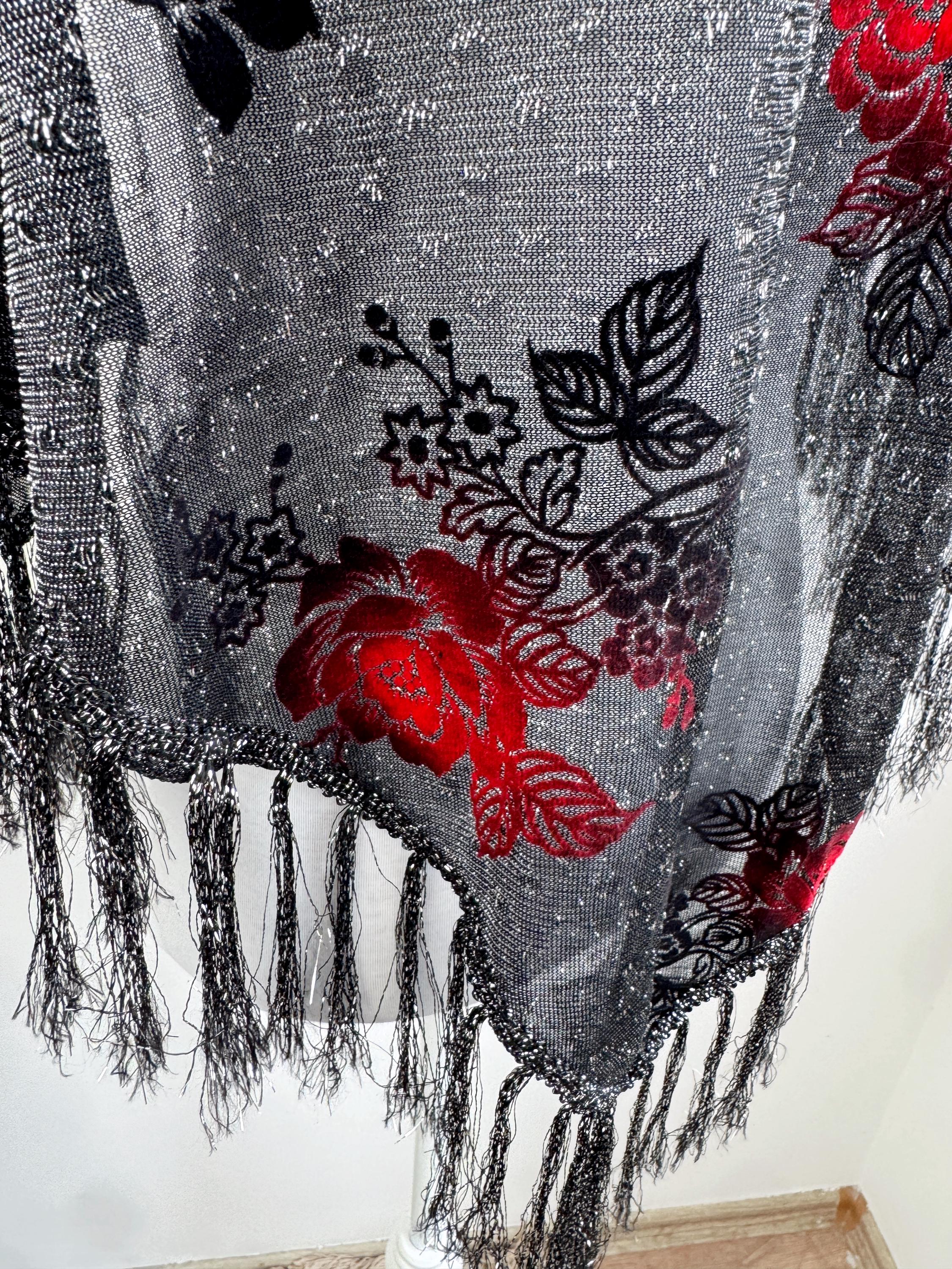 This is a beautiful vintage 80s filver black metallic evening scarf with burn out velvet red roses floral pattern and silver lame which shimmers beautifully when exposed to light. The delicate lightweight shiny triangle scarf has fringed detailing at the ends. It is made of 80% viscose and 20% lurex. This vintage see through evening wrap was made in Japan. This Gatsby style sheer mesh neck scarf is the perfect accessory for any cocktail party. It is stylish and it shimmers beautifully when exposed to light. Wonderful luxury vintage gift for her.