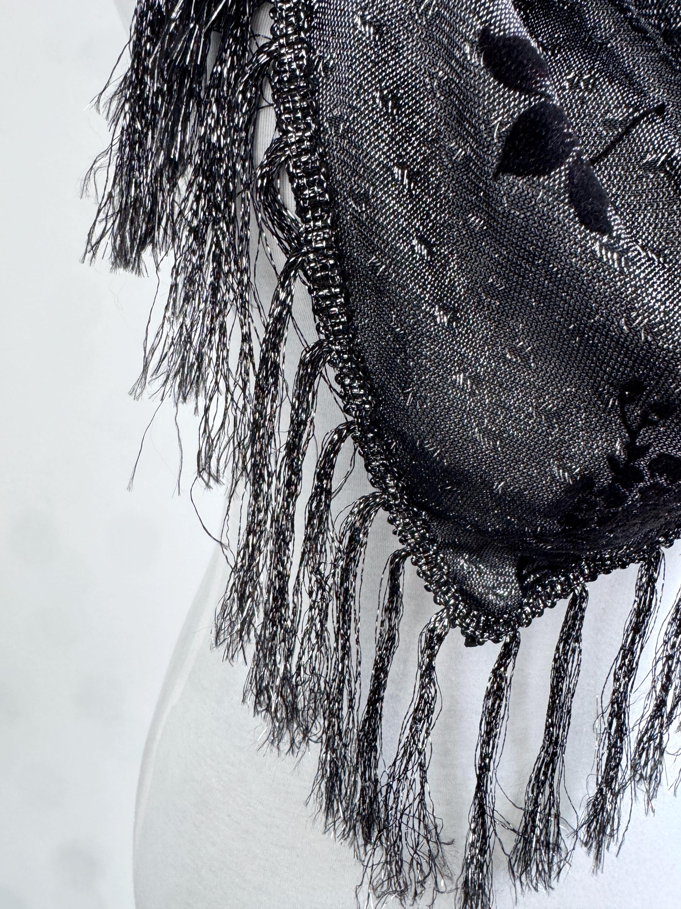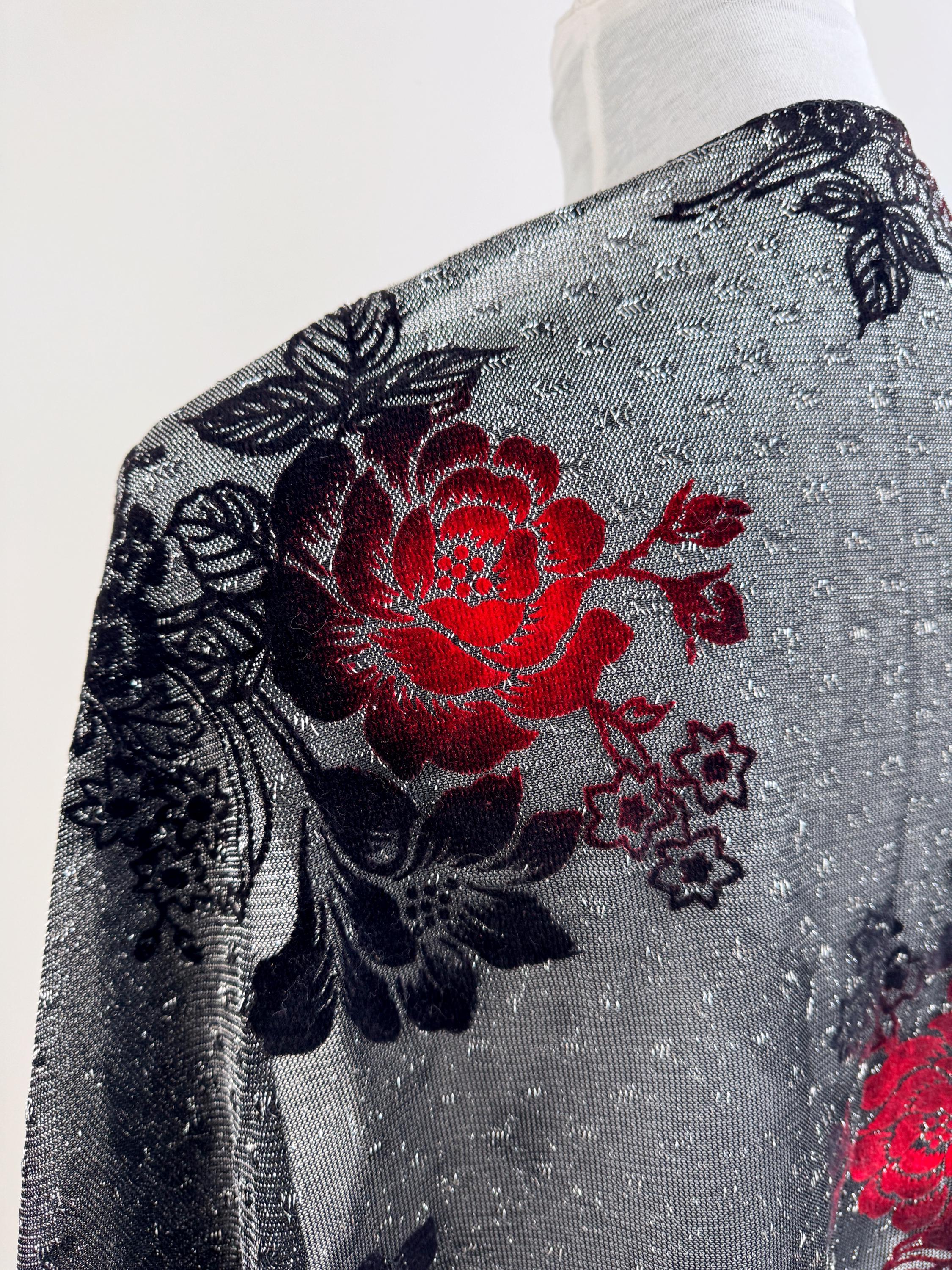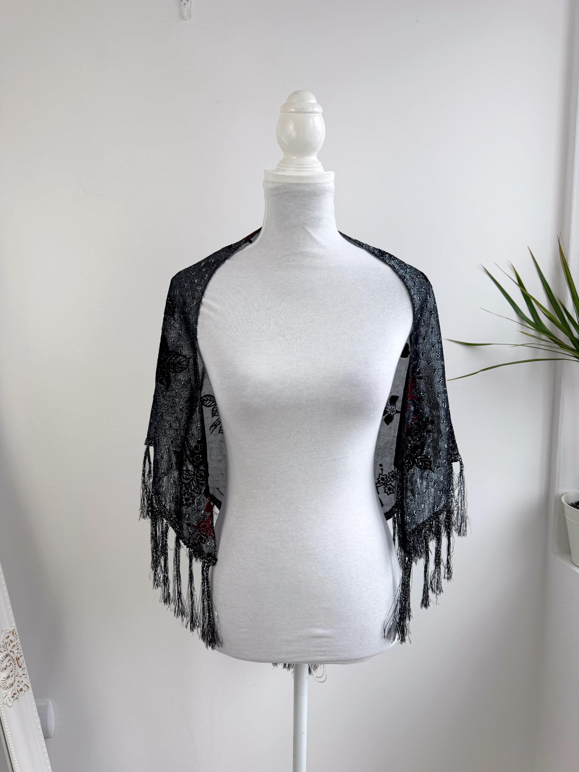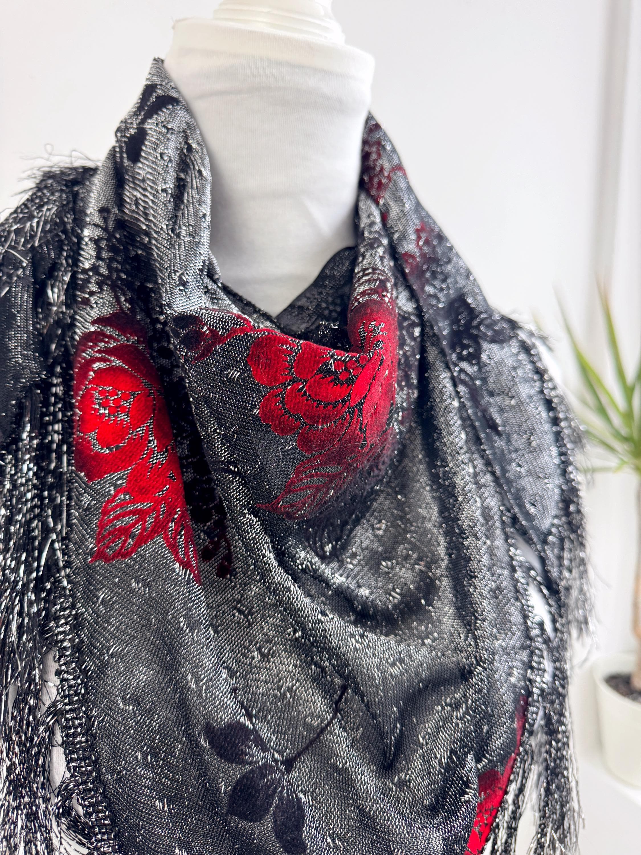 This is a beautiful vintage 80s filver black metallic evening scarf with burn out velvet red roses floral pattern and silver lame which shimmers beautifully when exposed to light. The delicate lightweight shiny triangle scarf has fringed detailing at the ends. It is made of 80% viscose and 20% lurex. This vintage see through evening wrap was made in Japan. This Gatsby style sheer mesh neck scarf is the perfect accessory for any cocktail party. It is stylish and it shimmers beautifully when exposed to light. Wonderful luxury vintage gift for her.