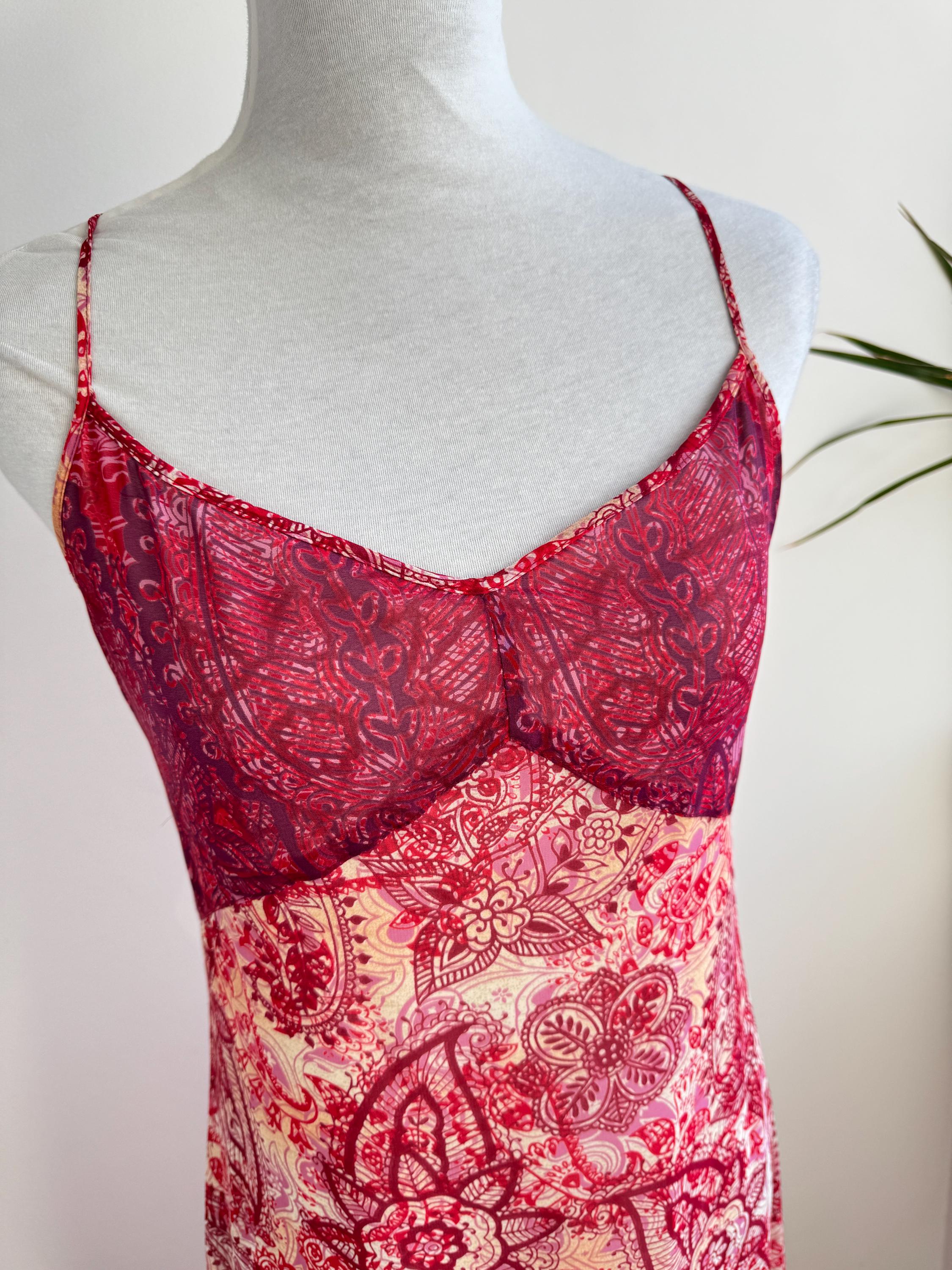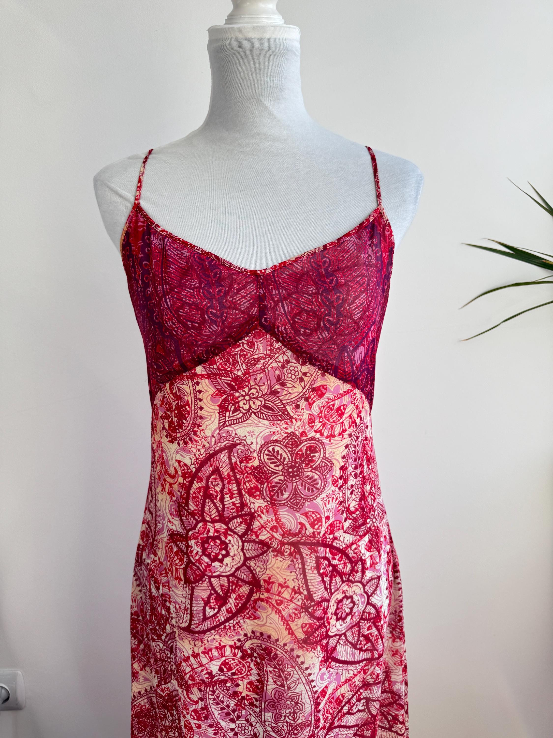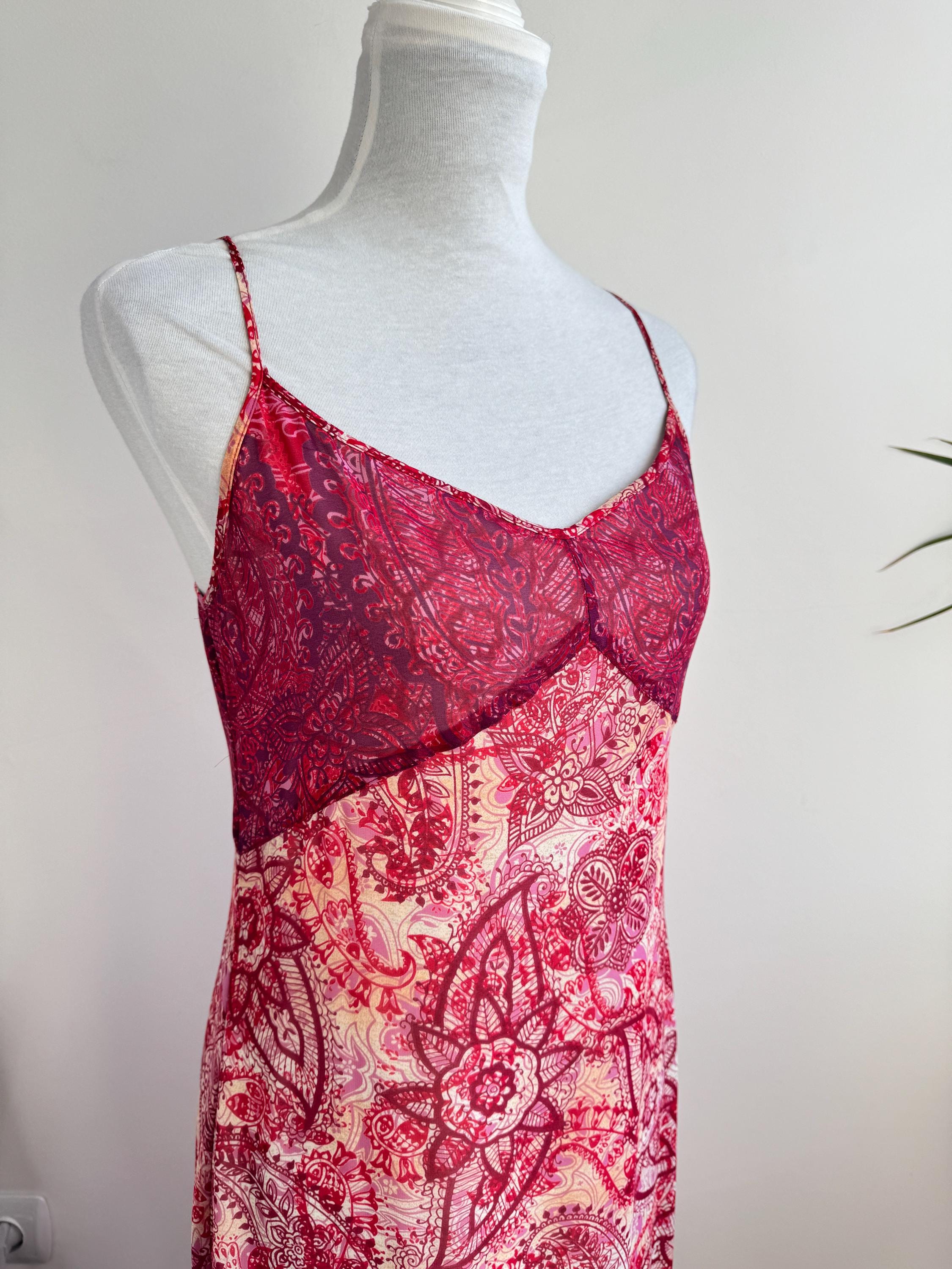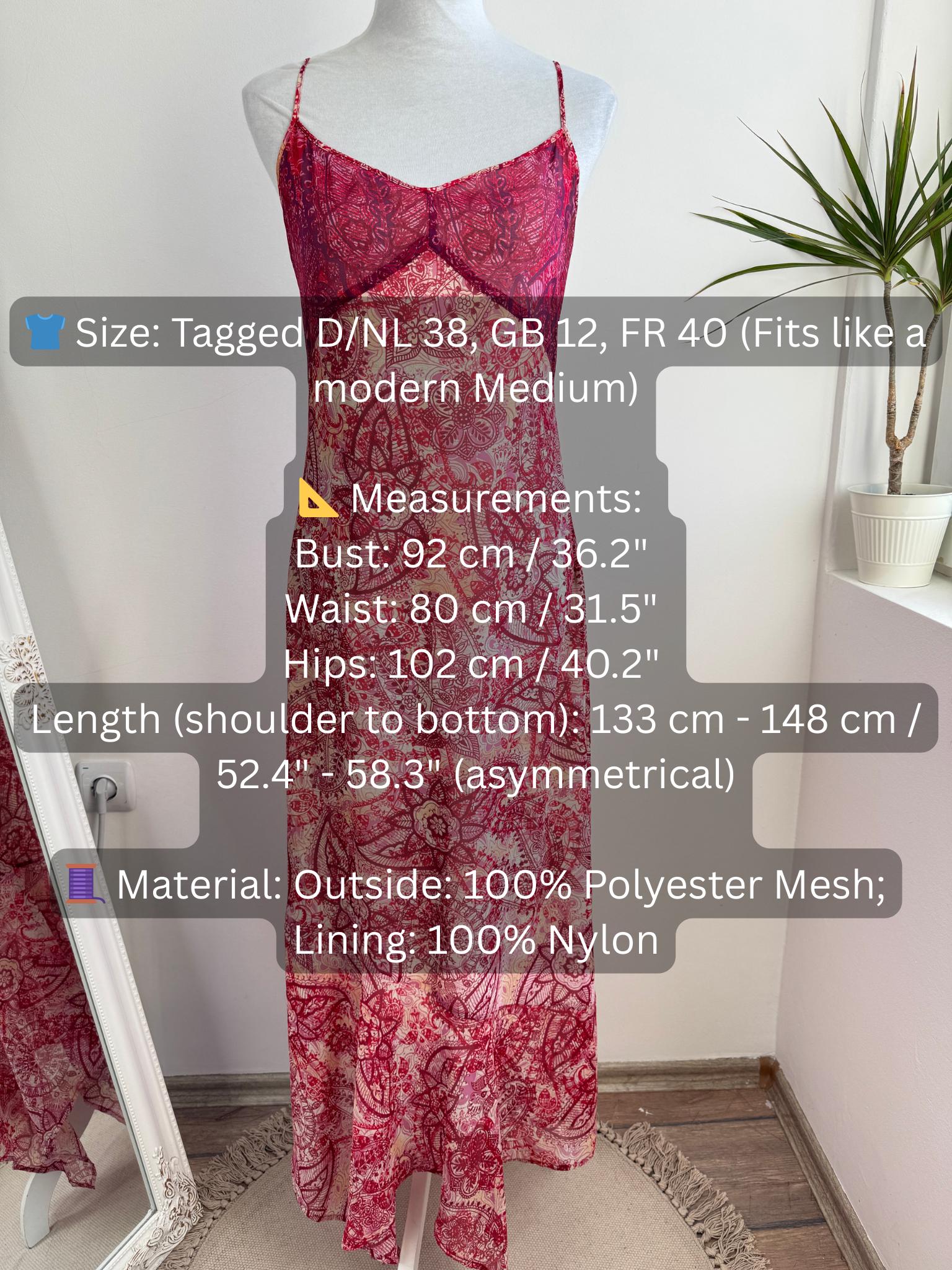 This is a stunning vintage Y2K Mexx maxi dress in size EUR 38 M. This sheer asymmetrical dress features a captivating red and pink paisley mandala print with a delicate mesh overlay that creates a beautiful depth. The slip-style silhouette of this maxo slip dress is elevated by a flattering V-neckline, adjustable spaghetti straps, and a whimsical asymmetrical hemline that moves gracefully as you walk. A hidden side zip closure allows a perfect fit.